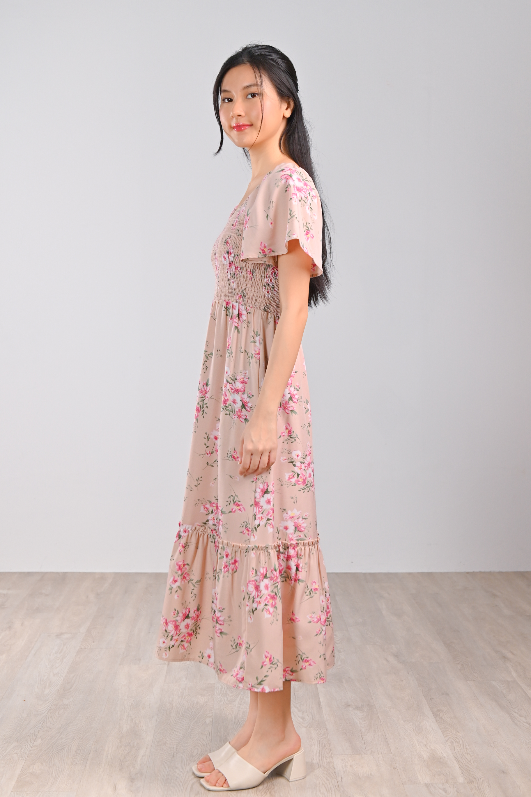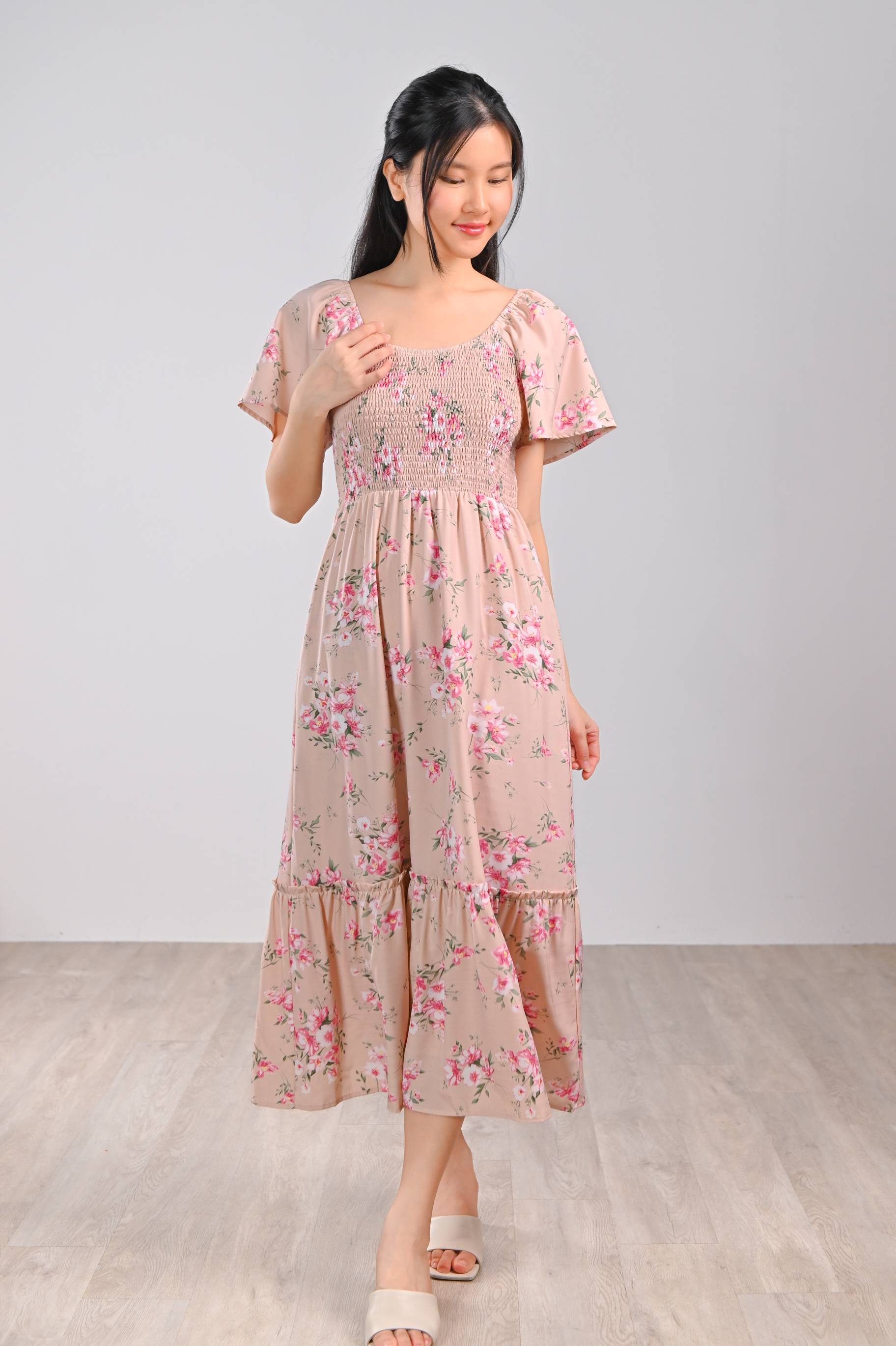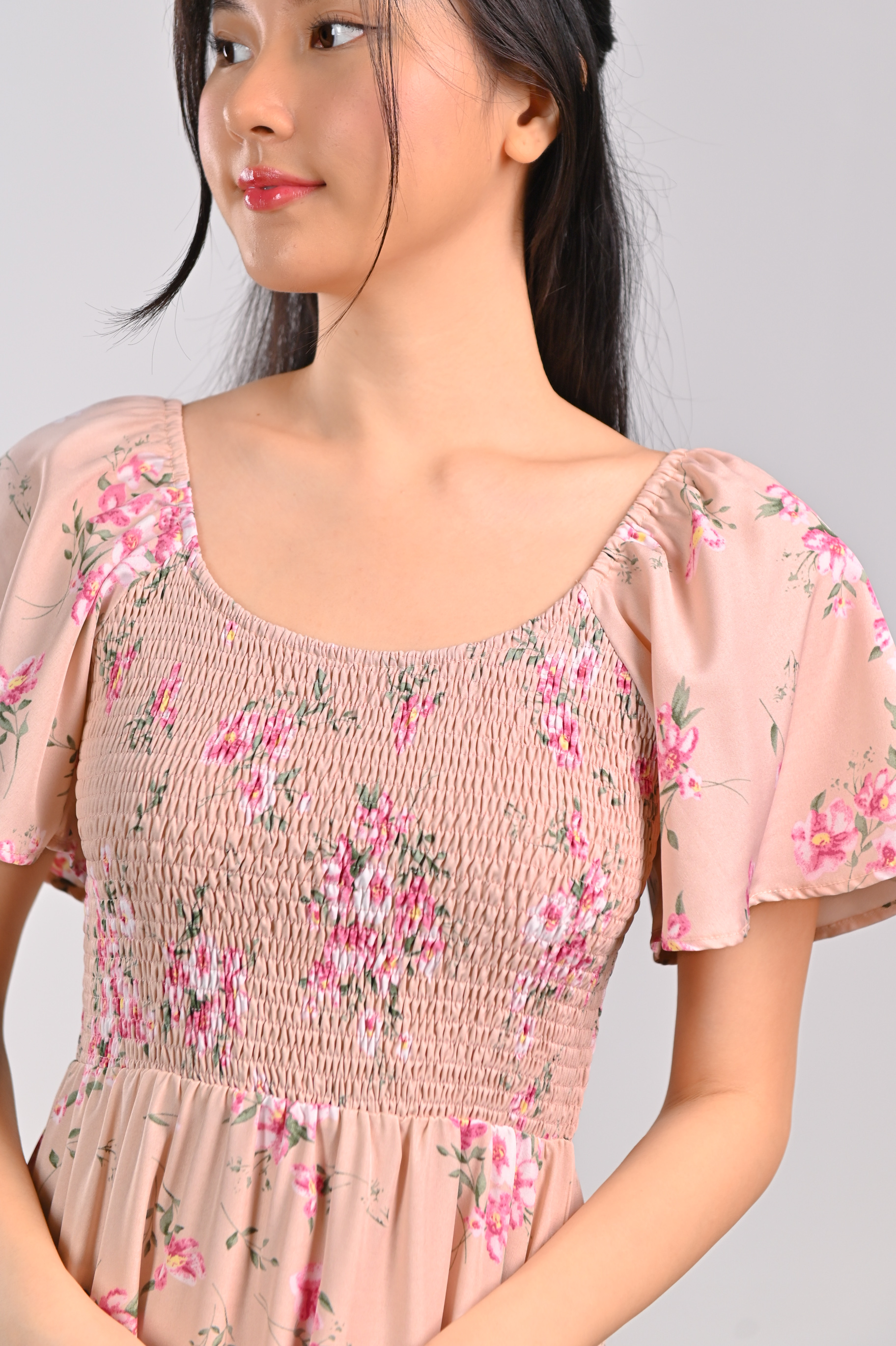 GLINDA PINK FLORAL SMOCKED MIDI DRESS