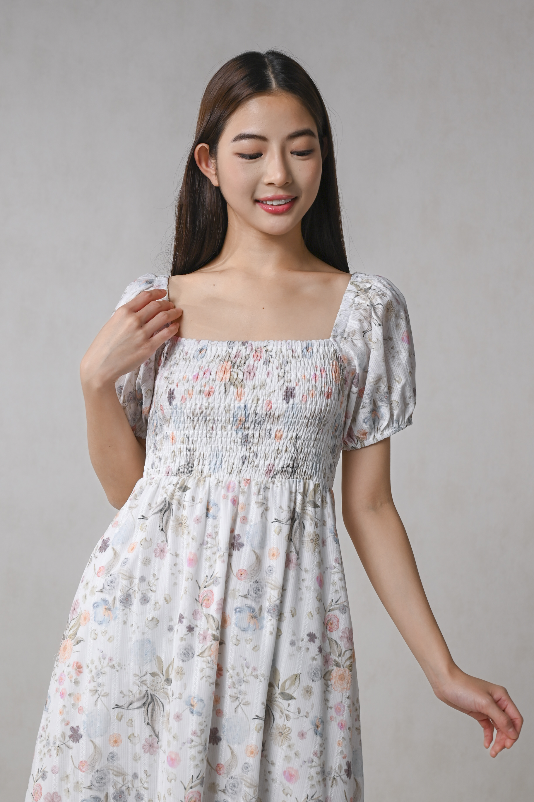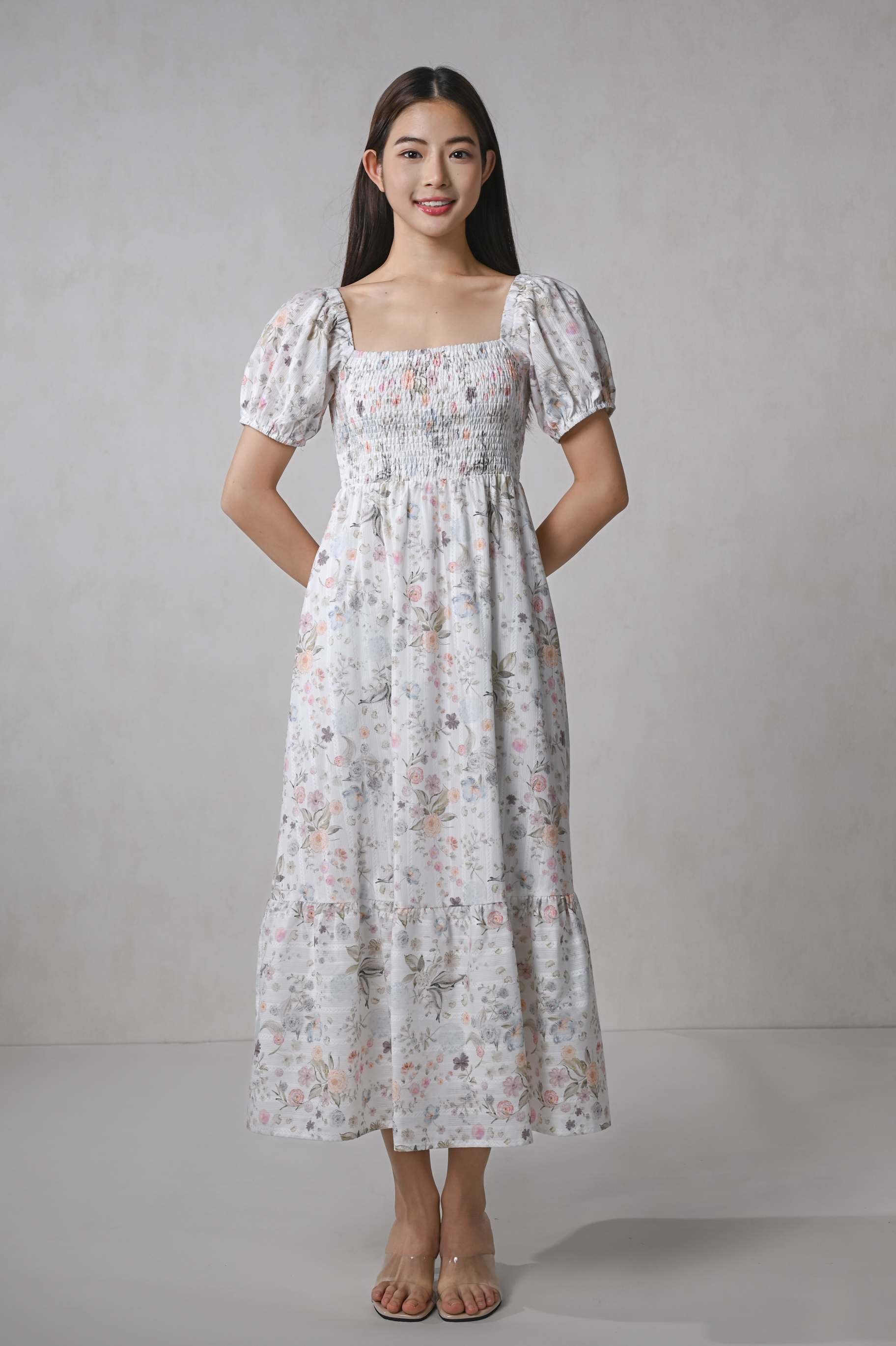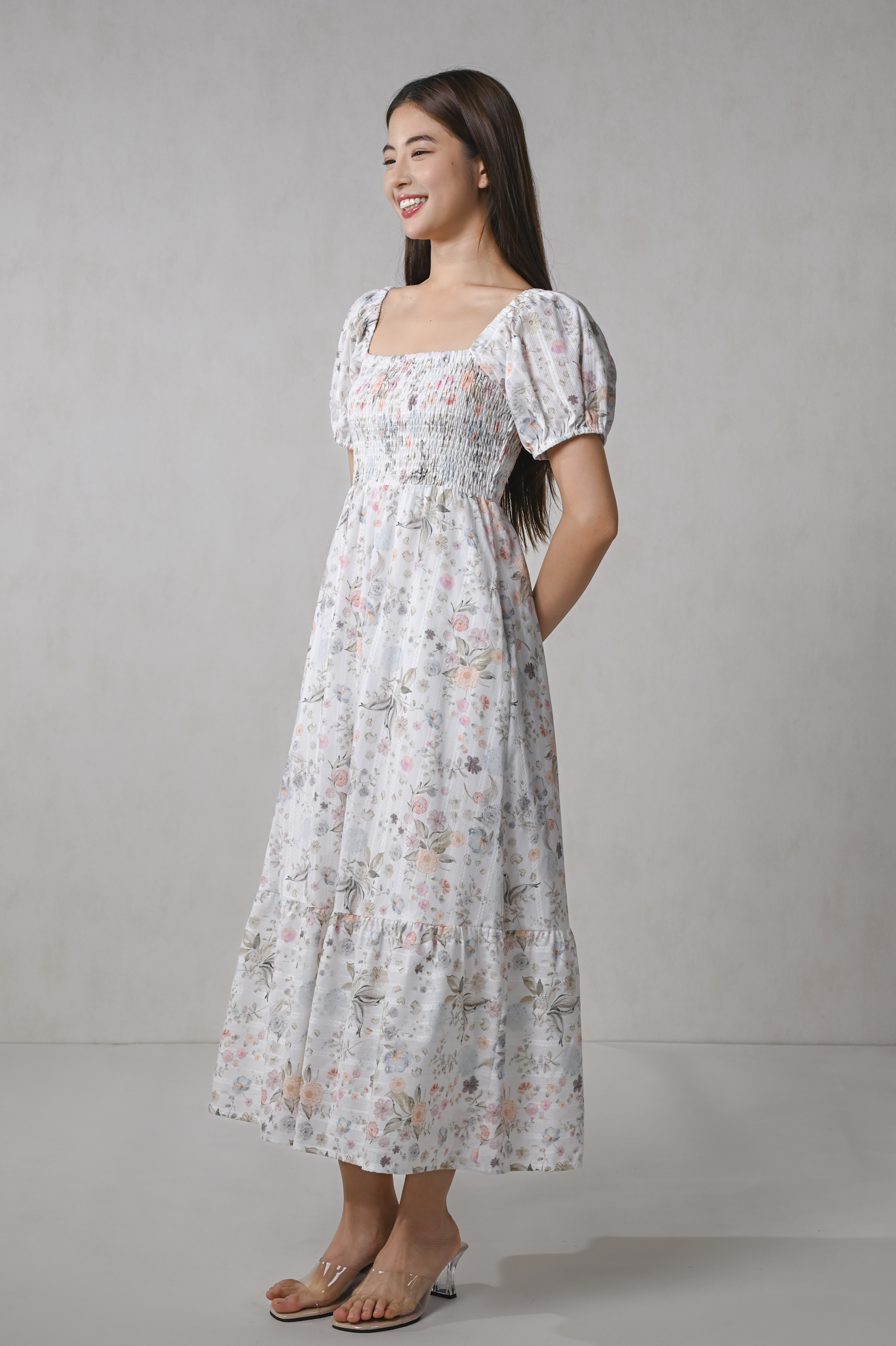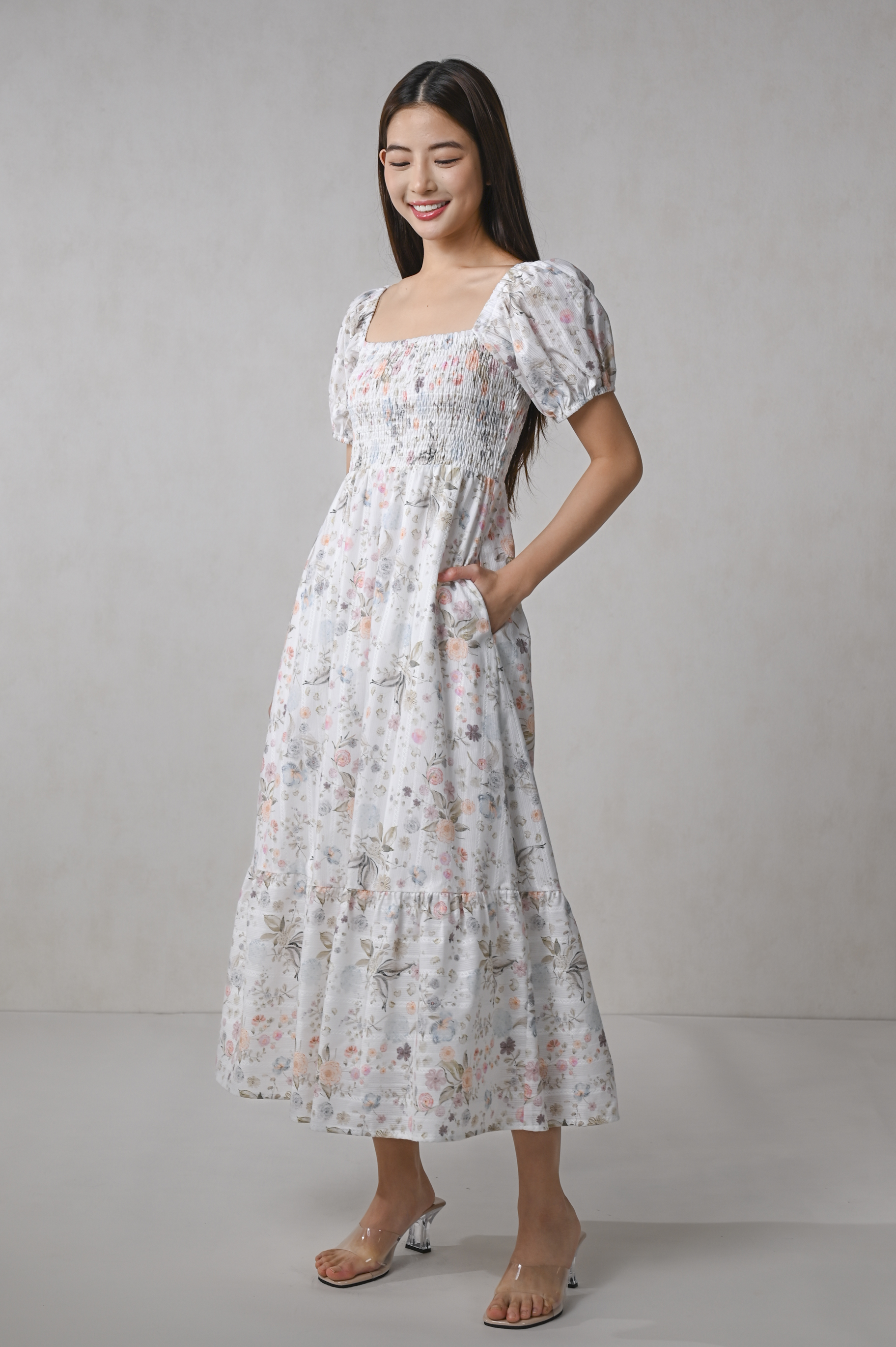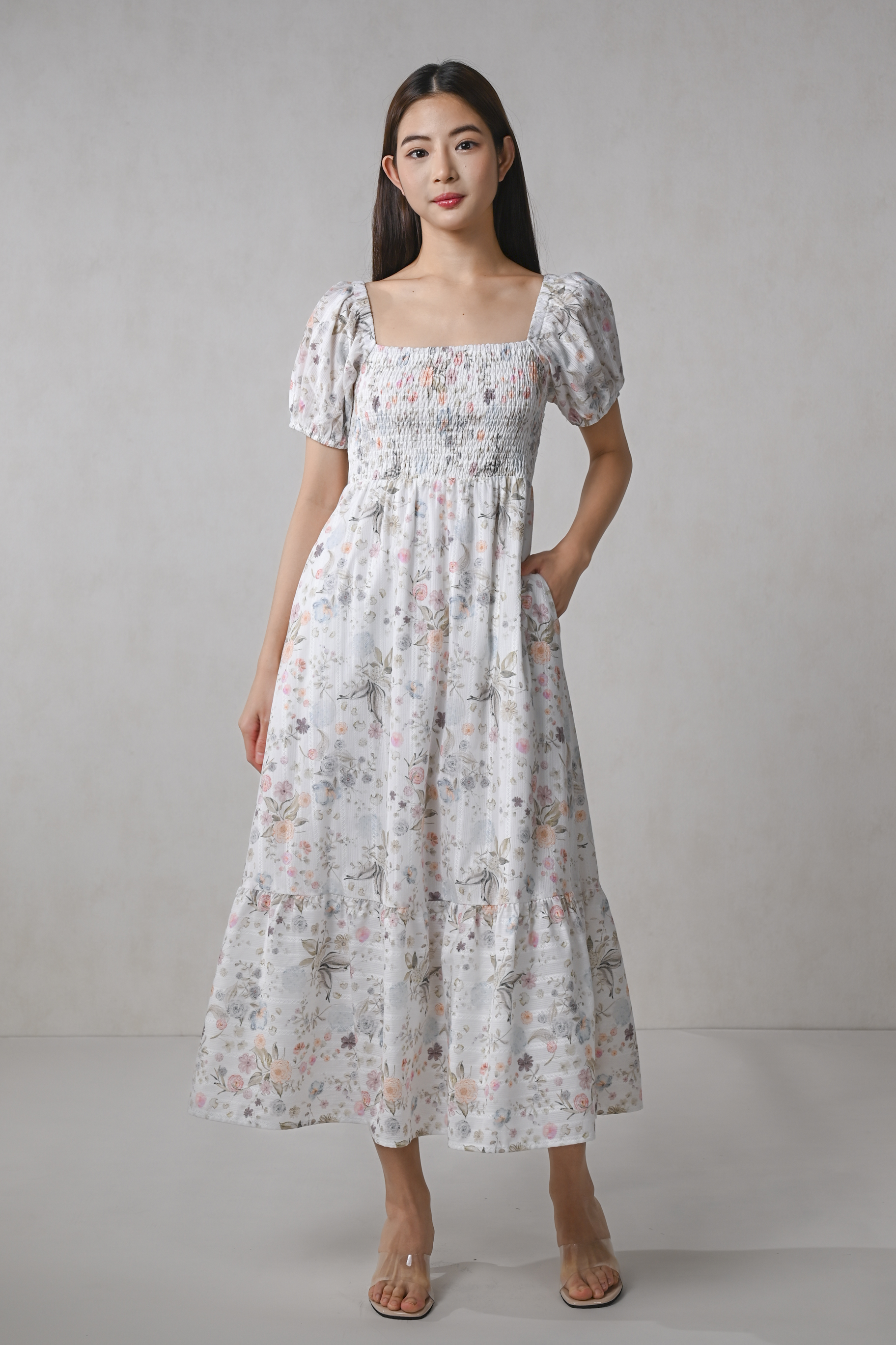 GOLDIE WHITE FLORAL SMOCKED MIDAXI DRESS