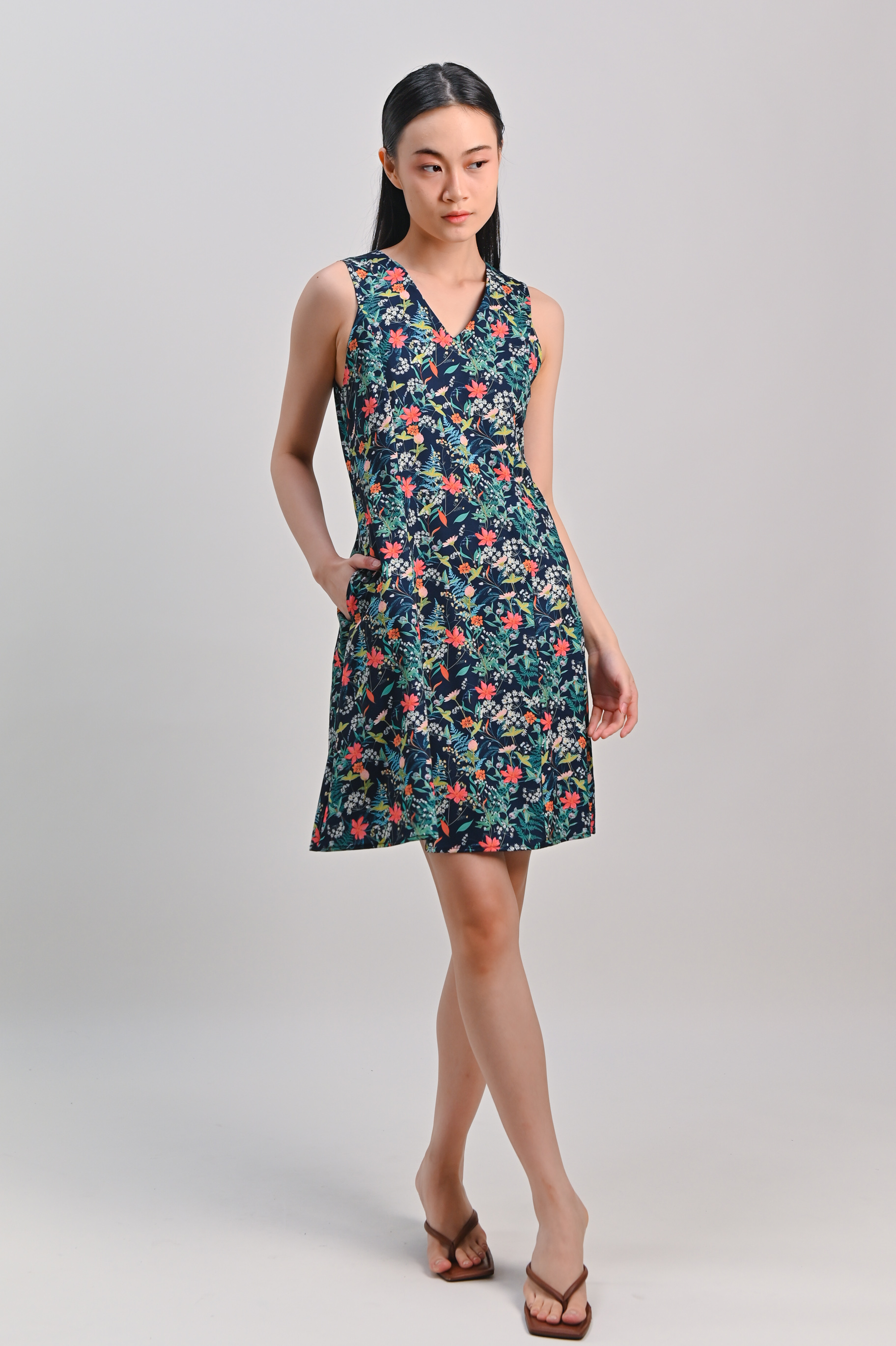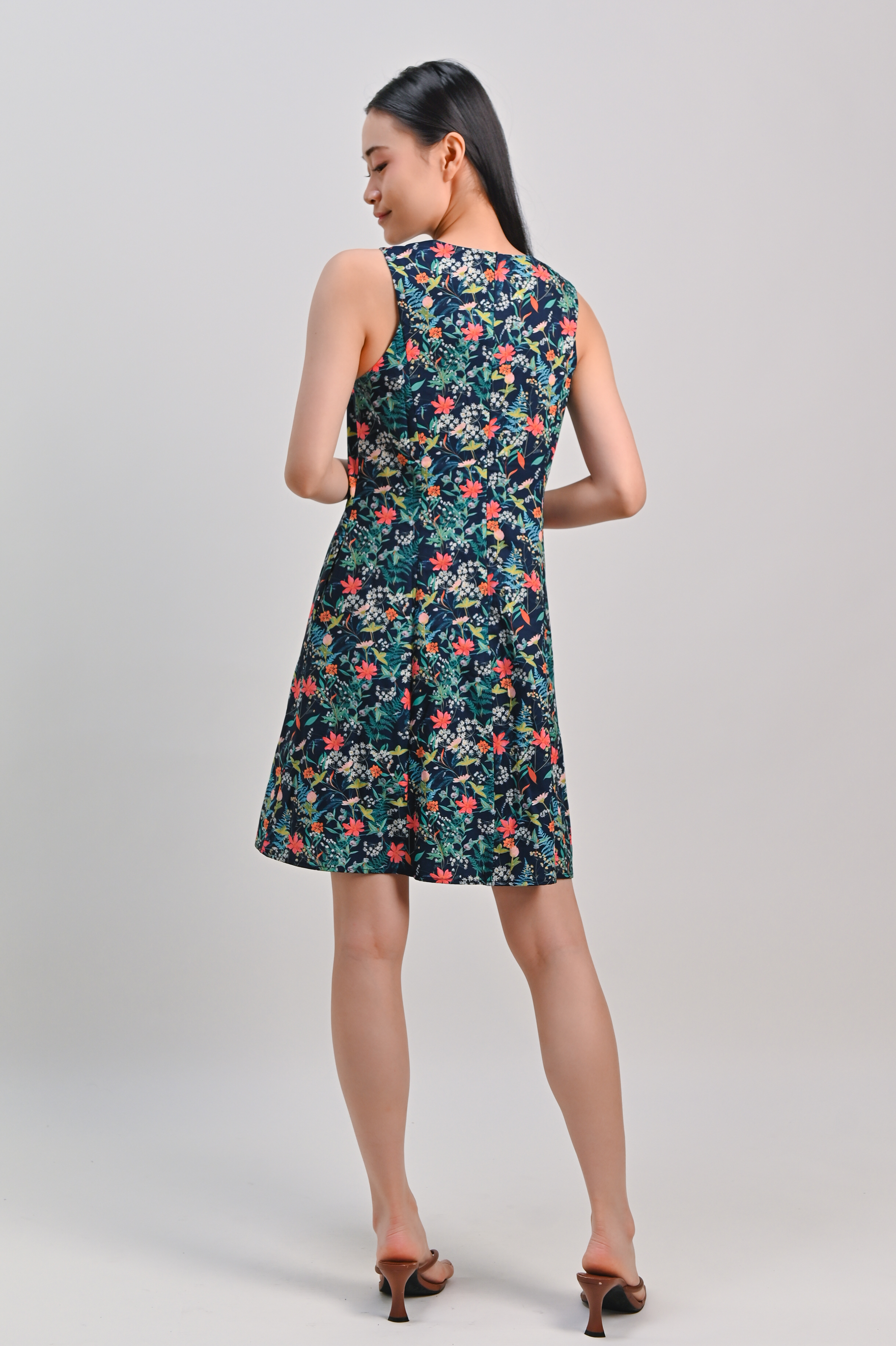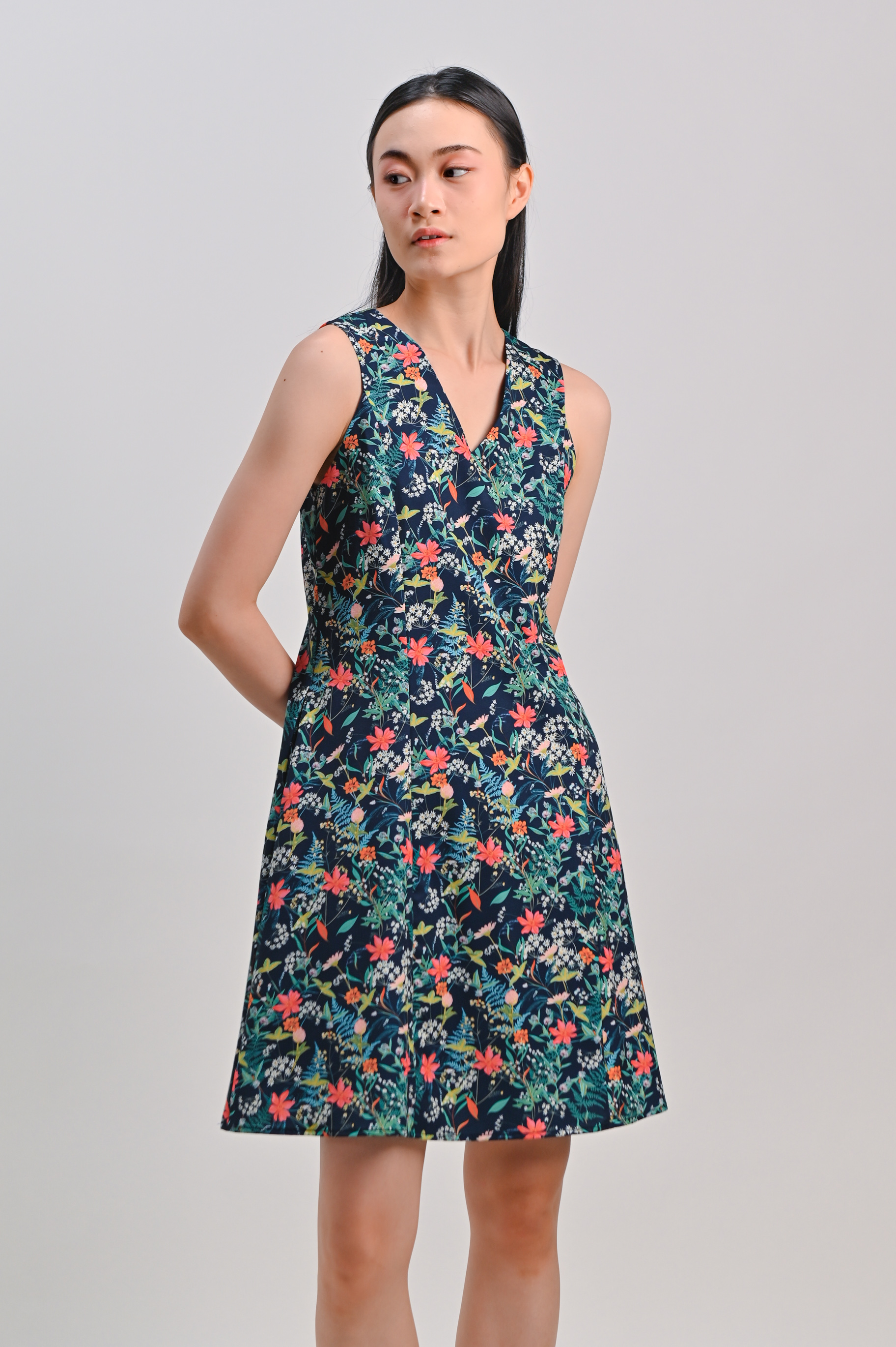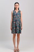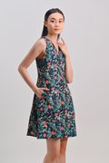 HALSTON NAVY FLORAL SLEEVELESS PANELLED DRESS