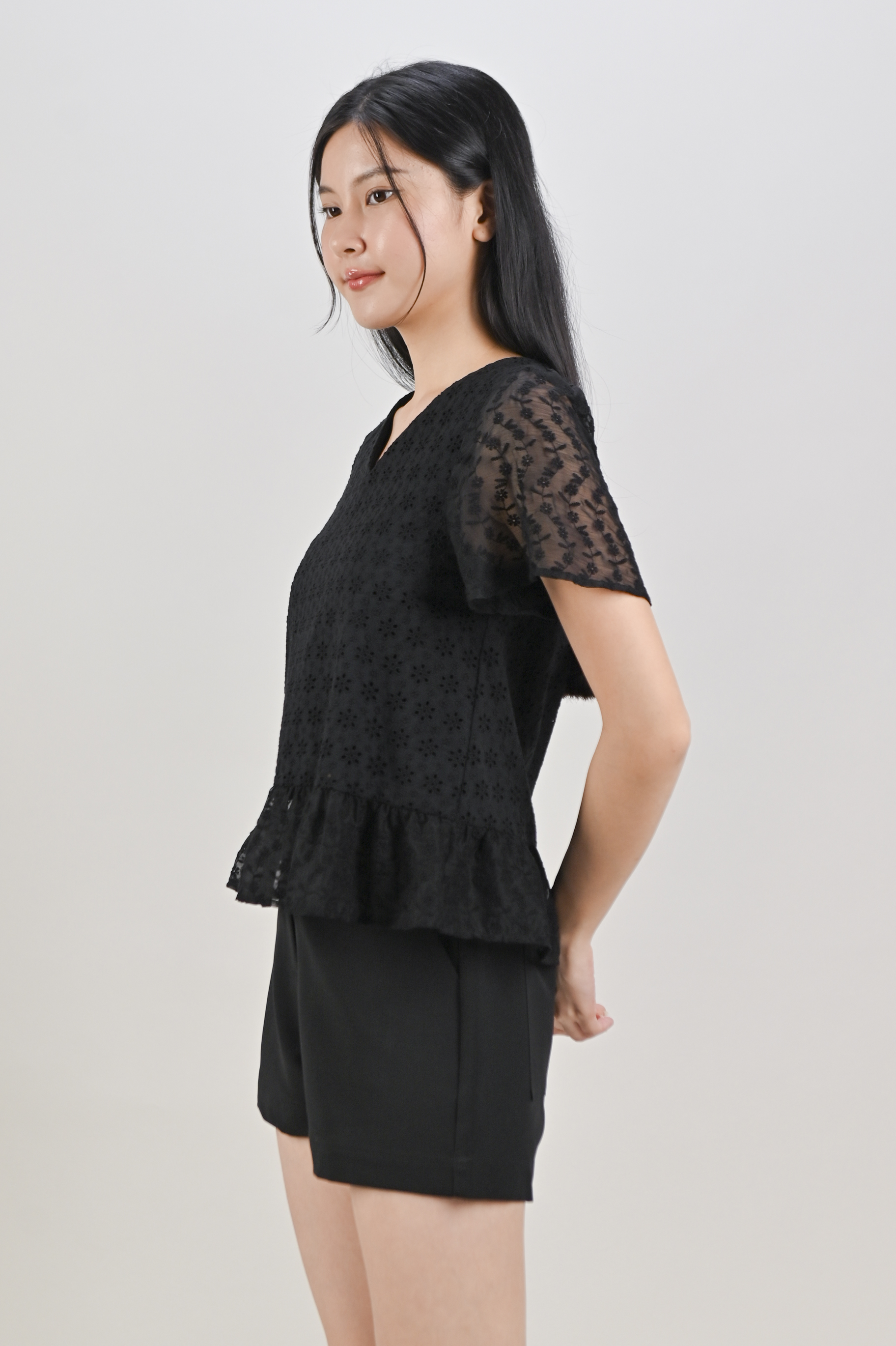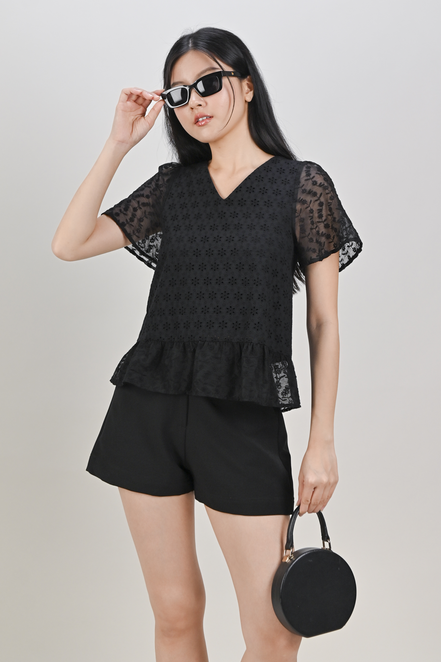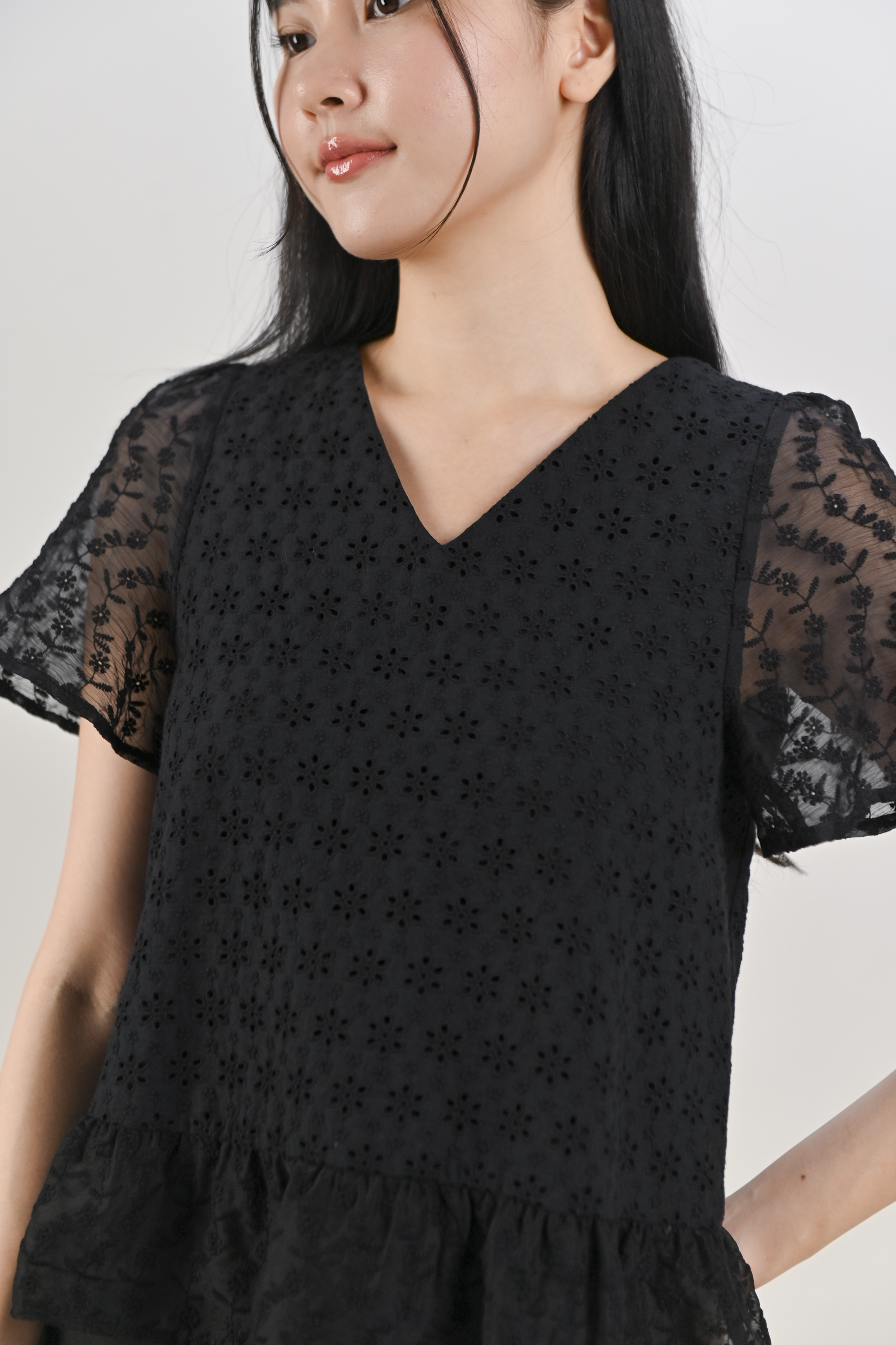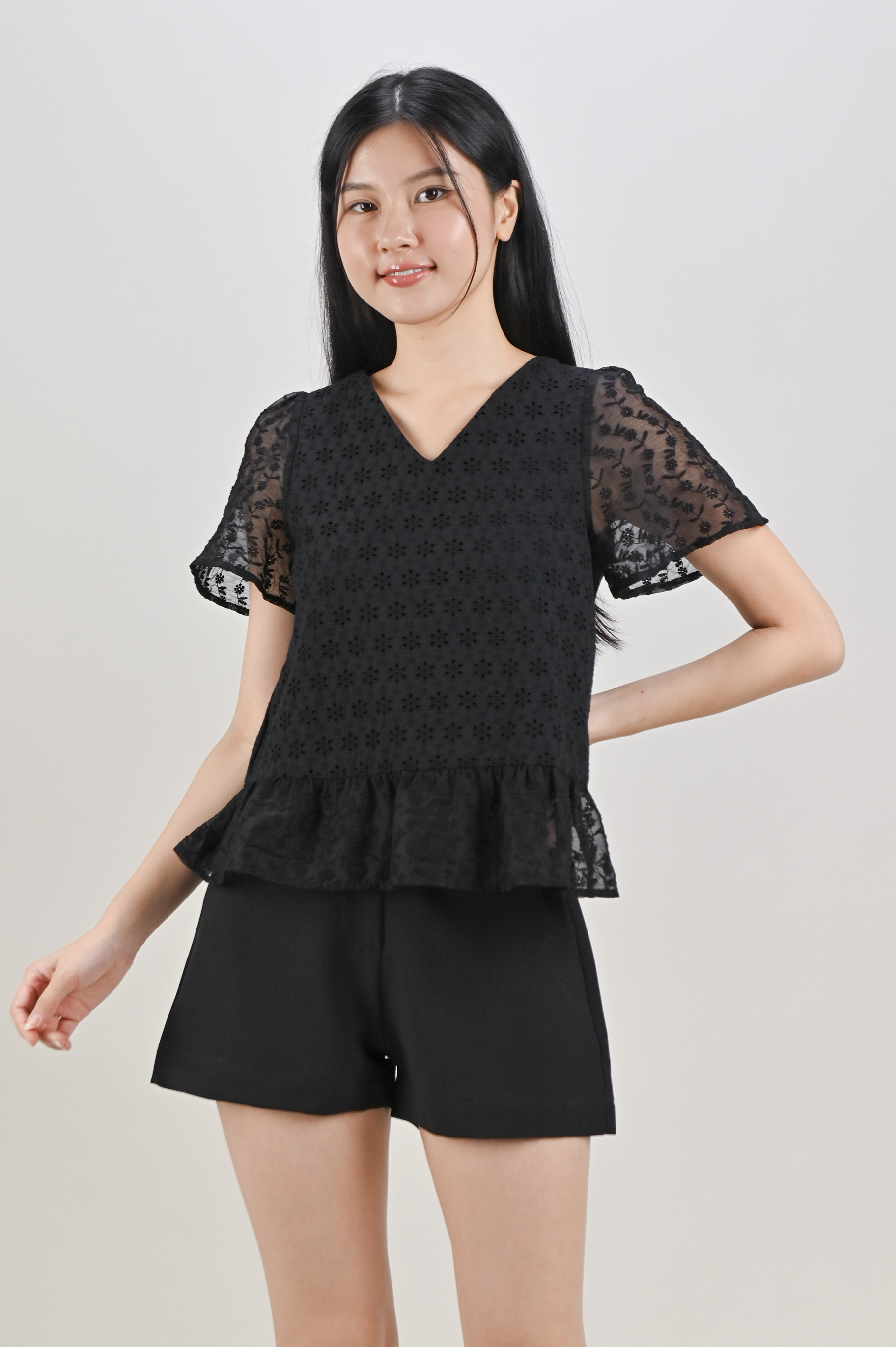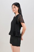 HOLLIS EYELET SLEEVED TOP IN BLACK