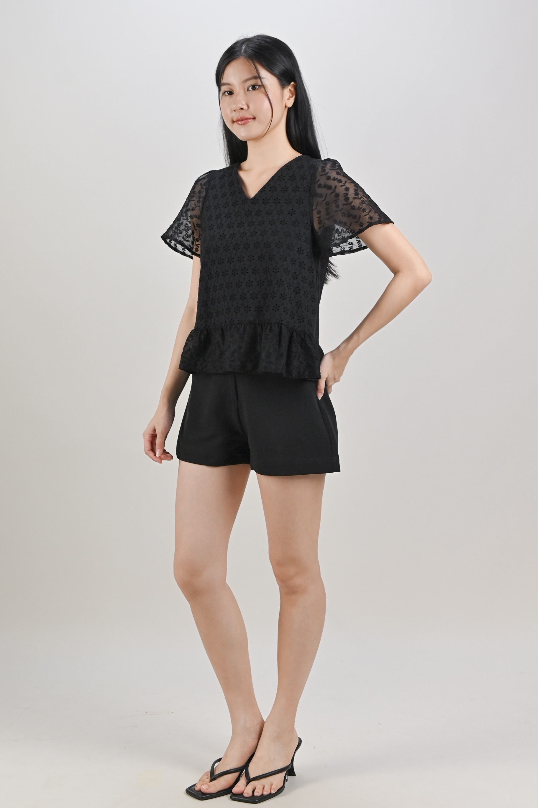 Actual stocks may varyđź–¤ Your new love: our Hollis Top with sheer sleeves and a flounce made to shine!