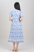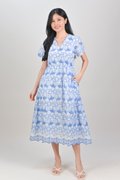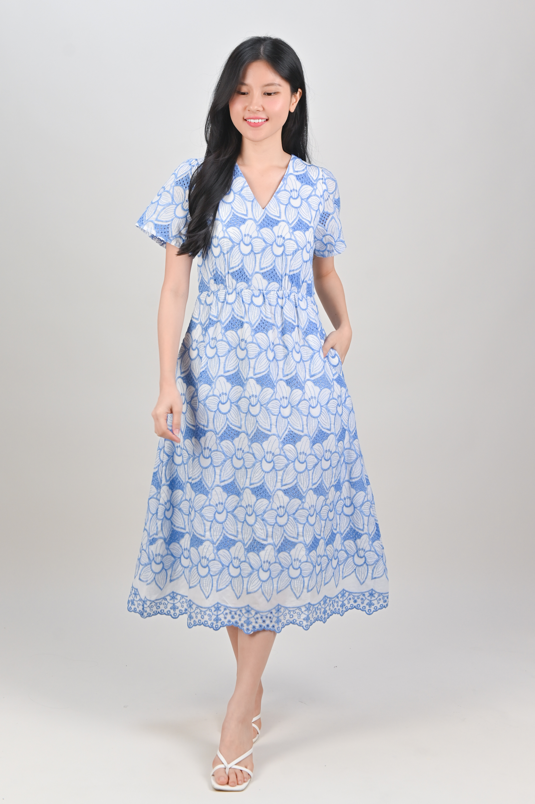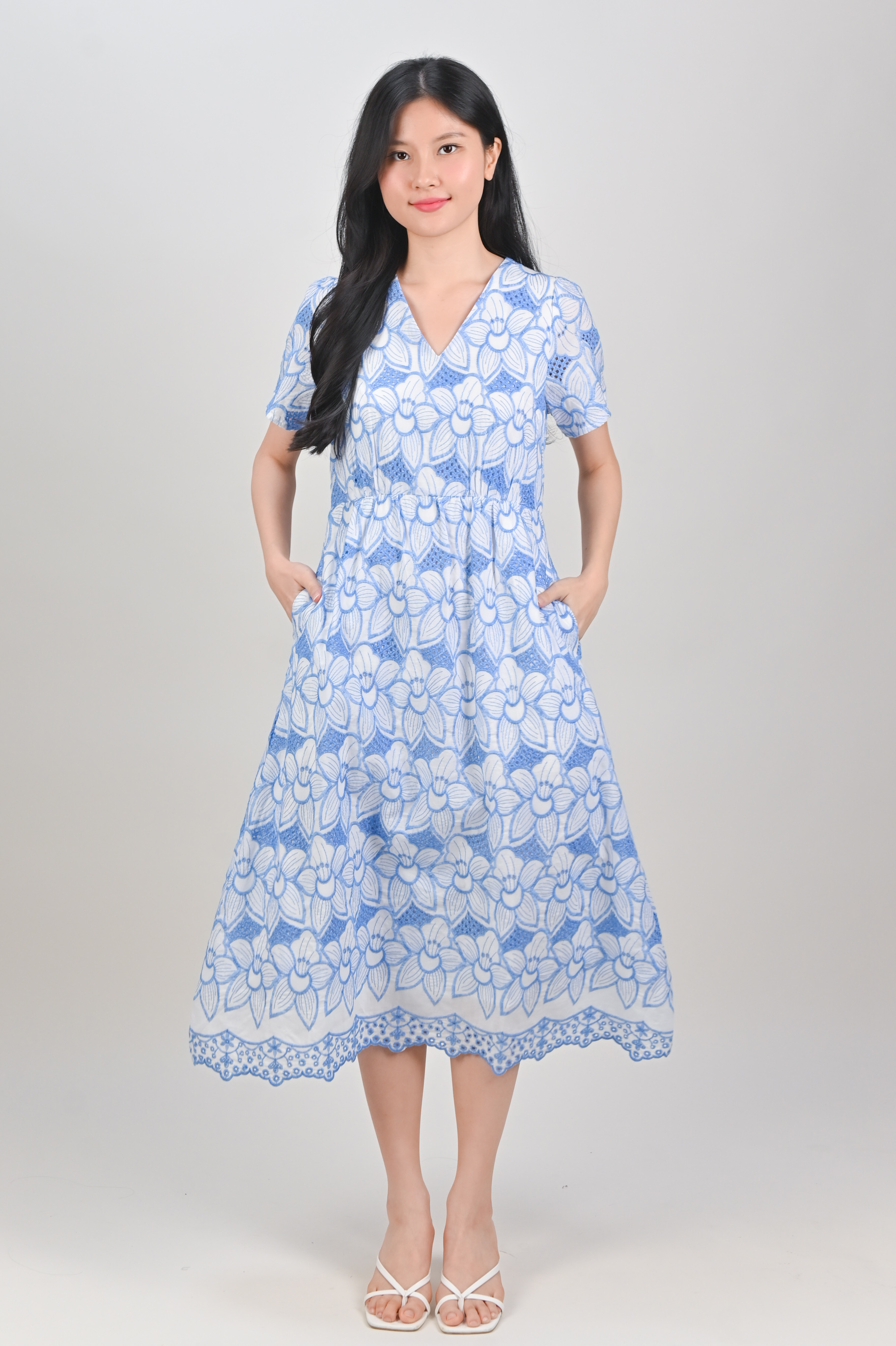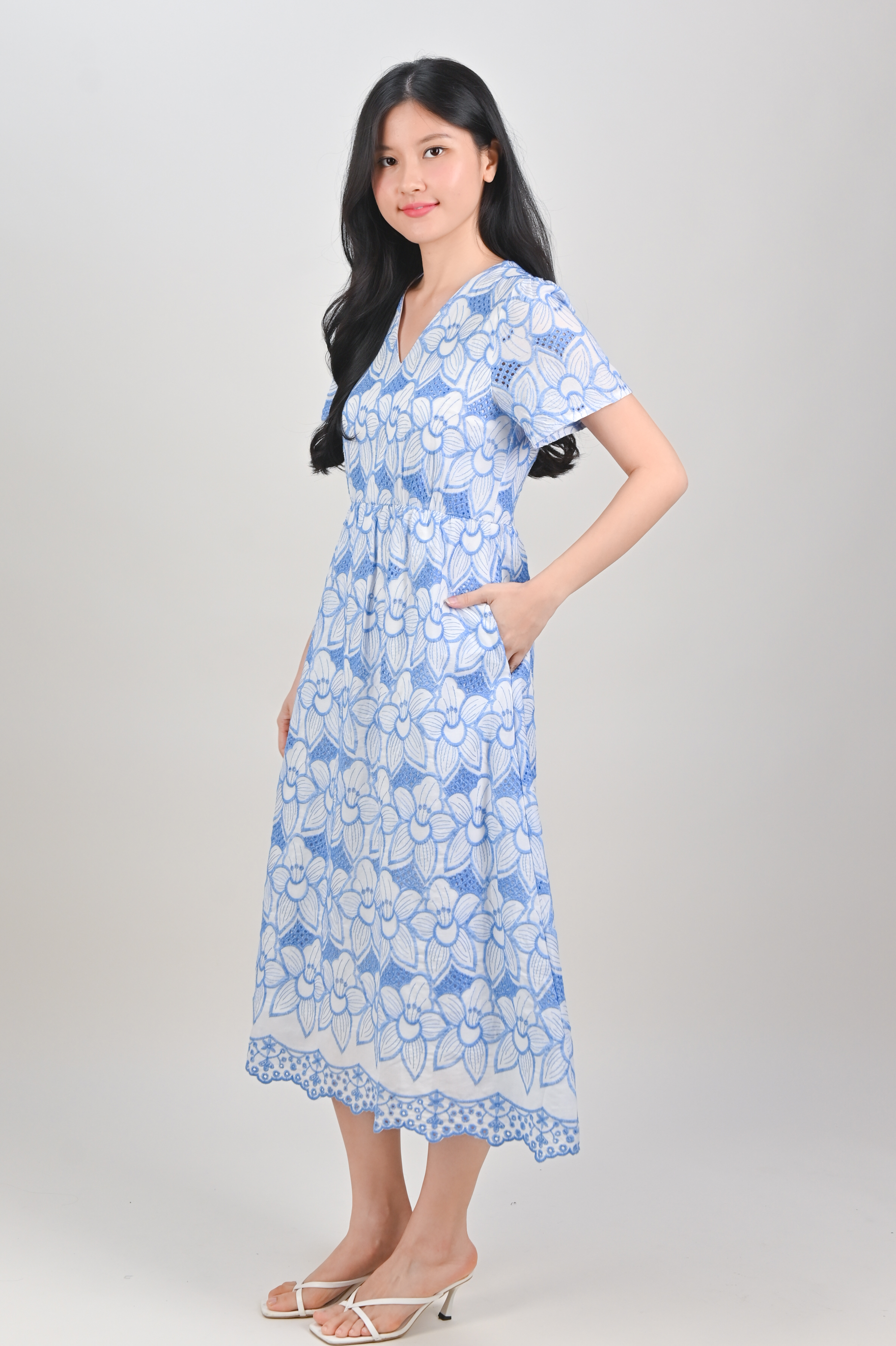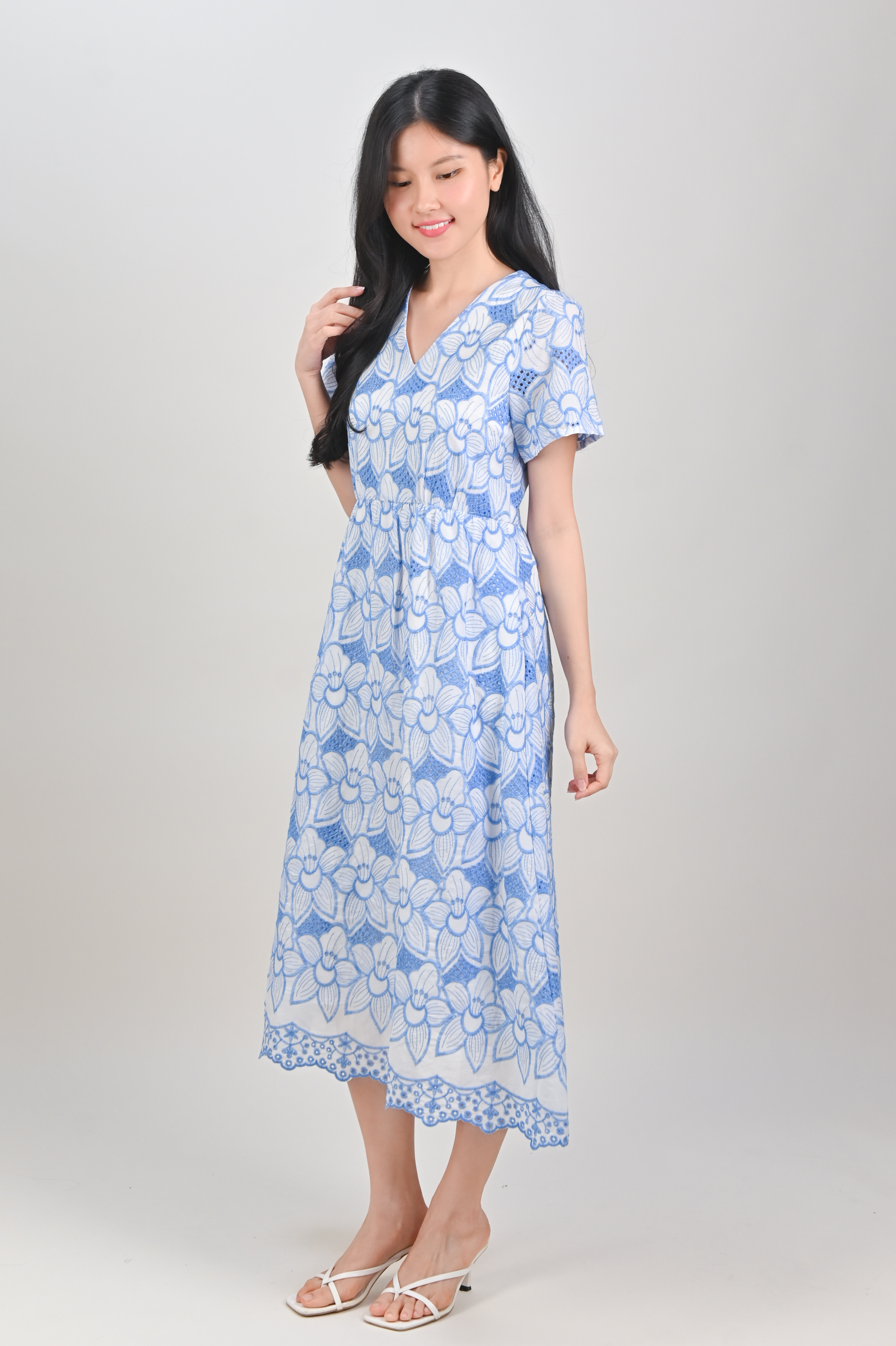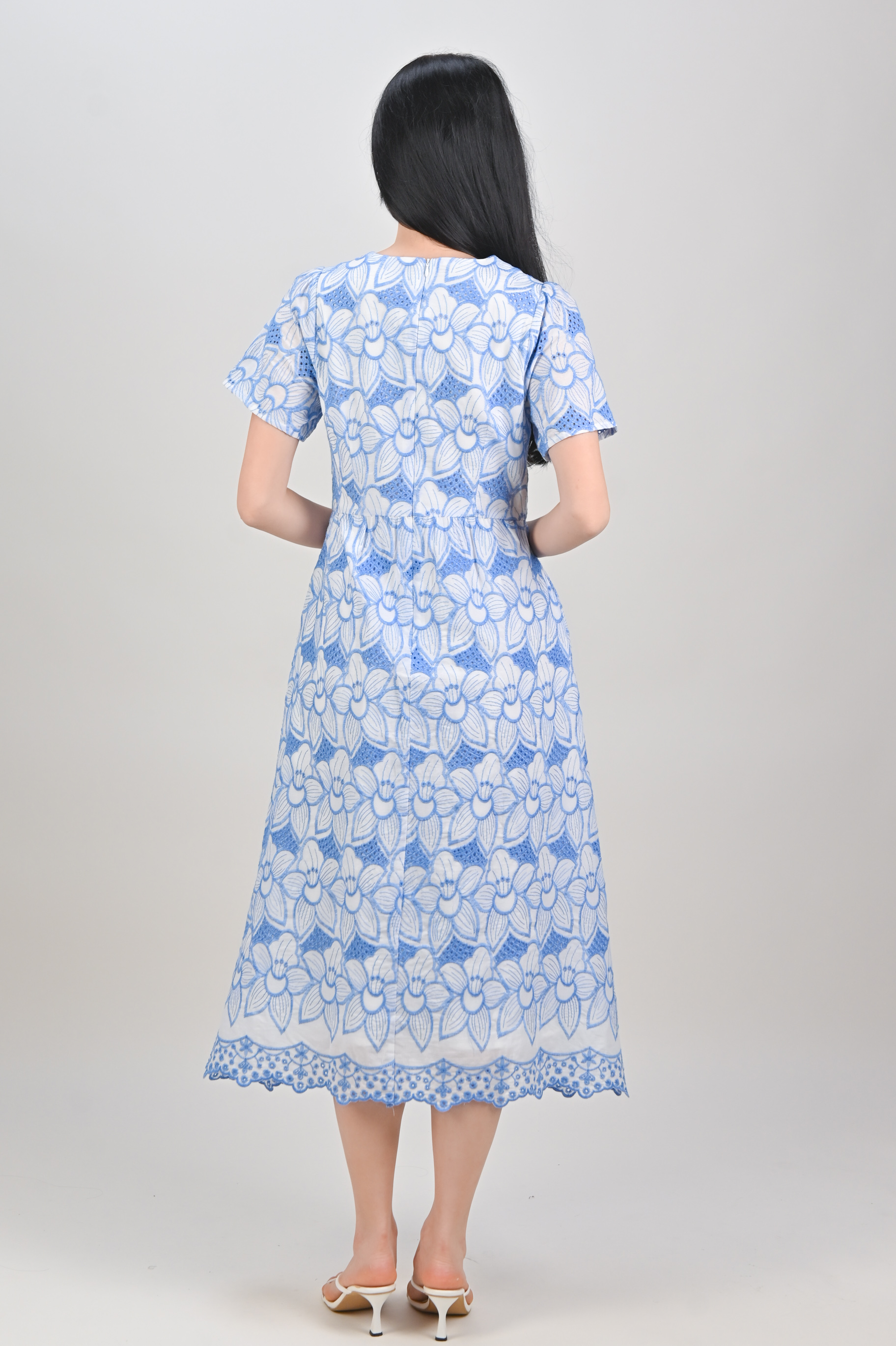 HOSHI BLUE EMBROIDERED V-NECK SLEEVED MIDI DRESS