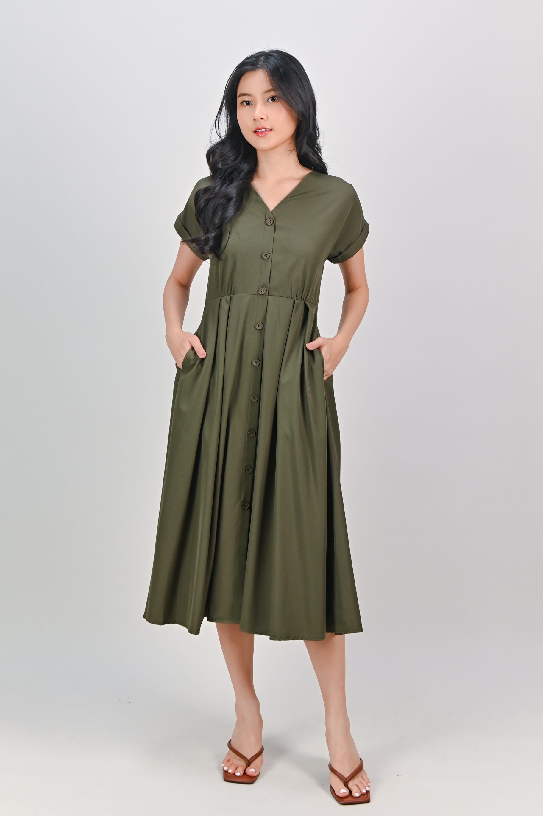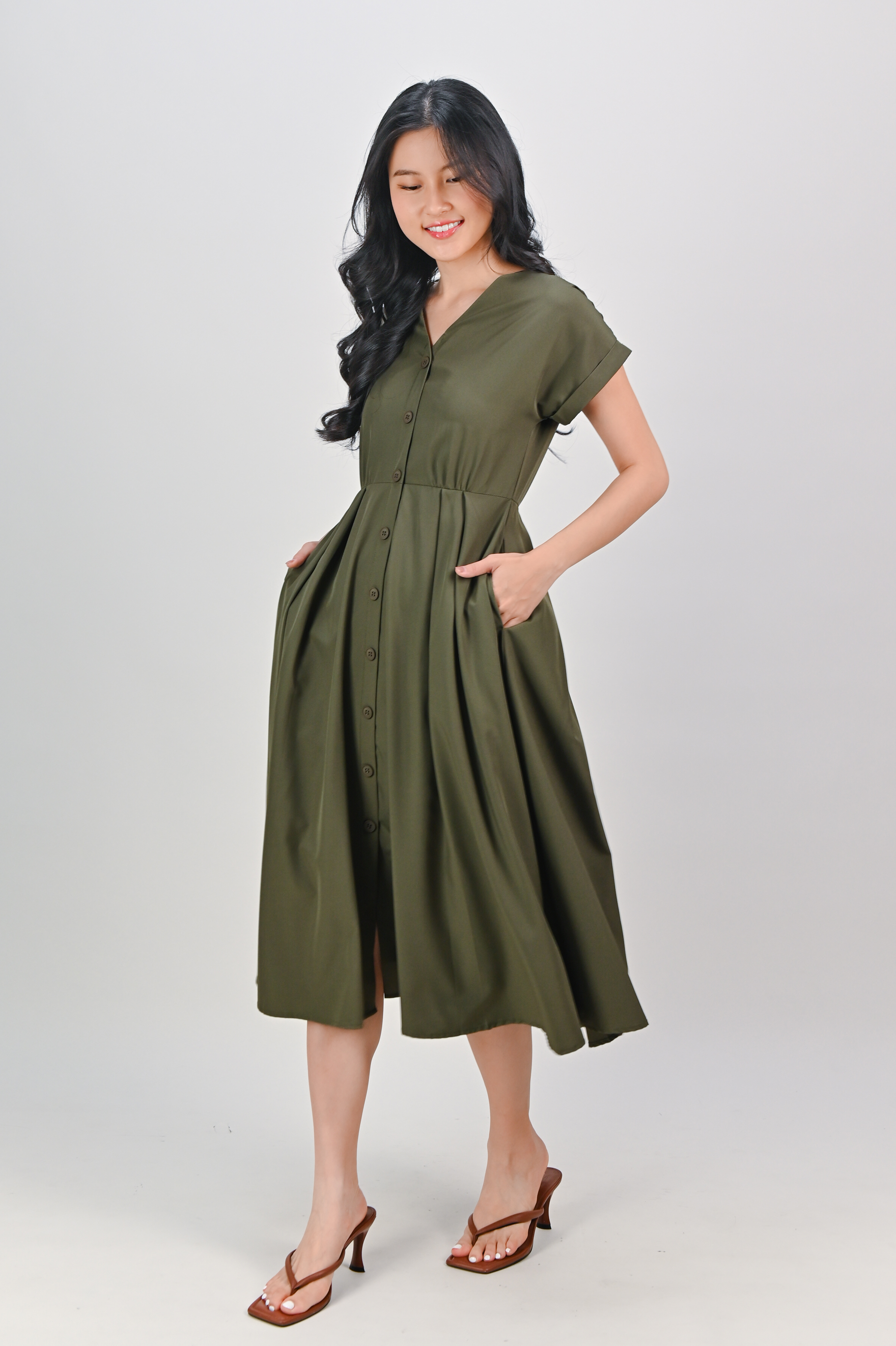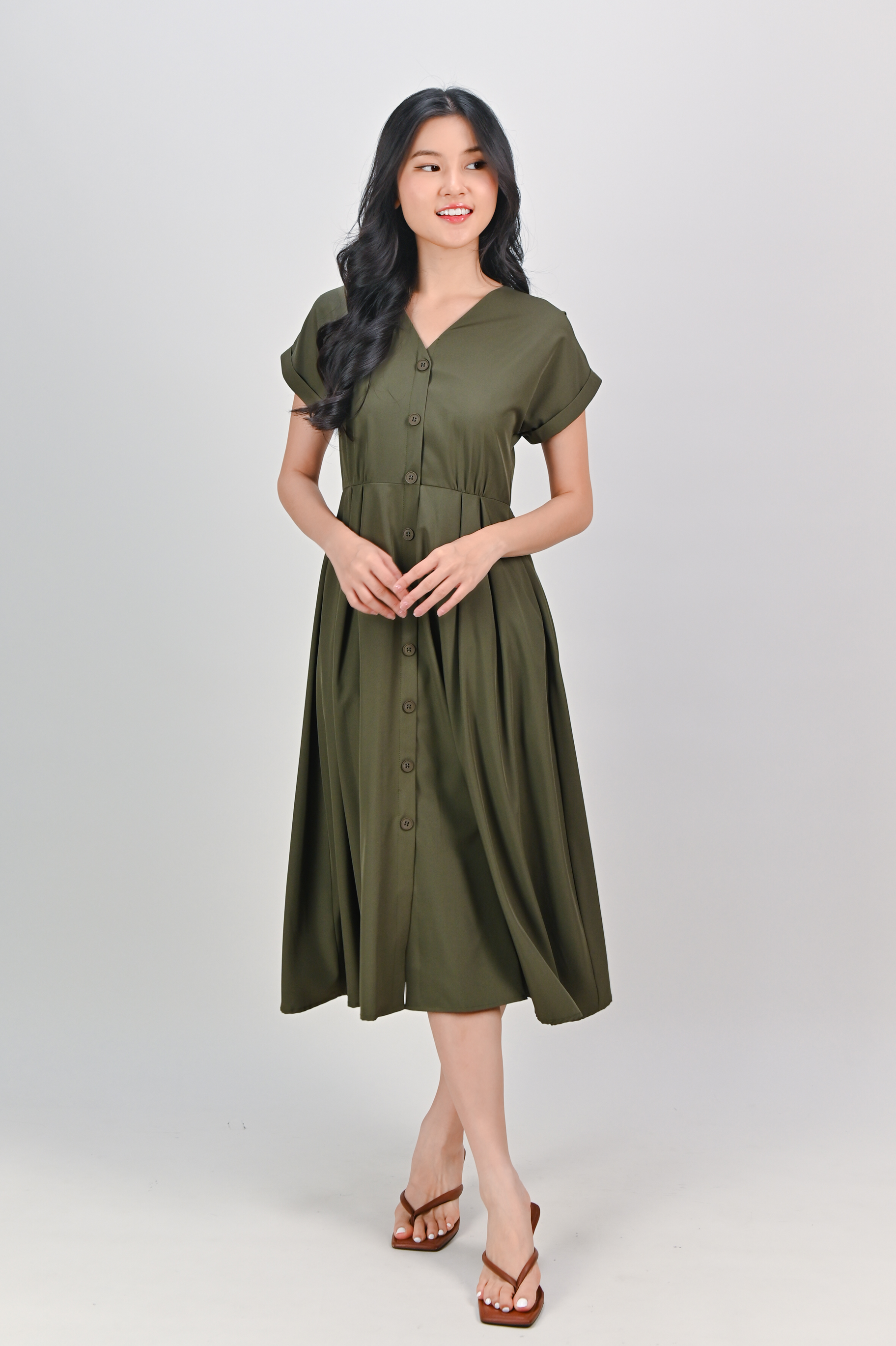 HUDGENS SLEEVED BUTTON DRESS IN OLIVE