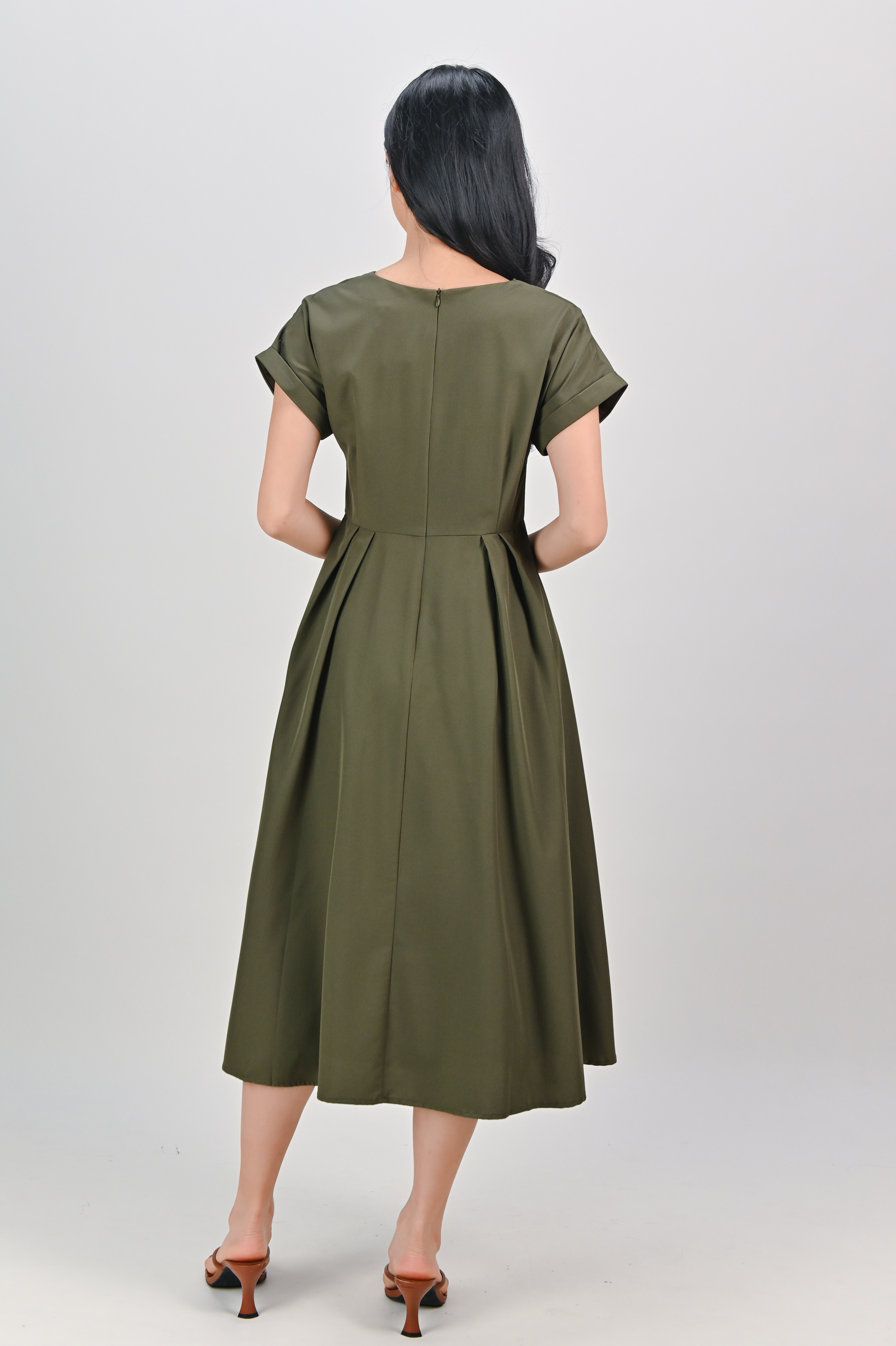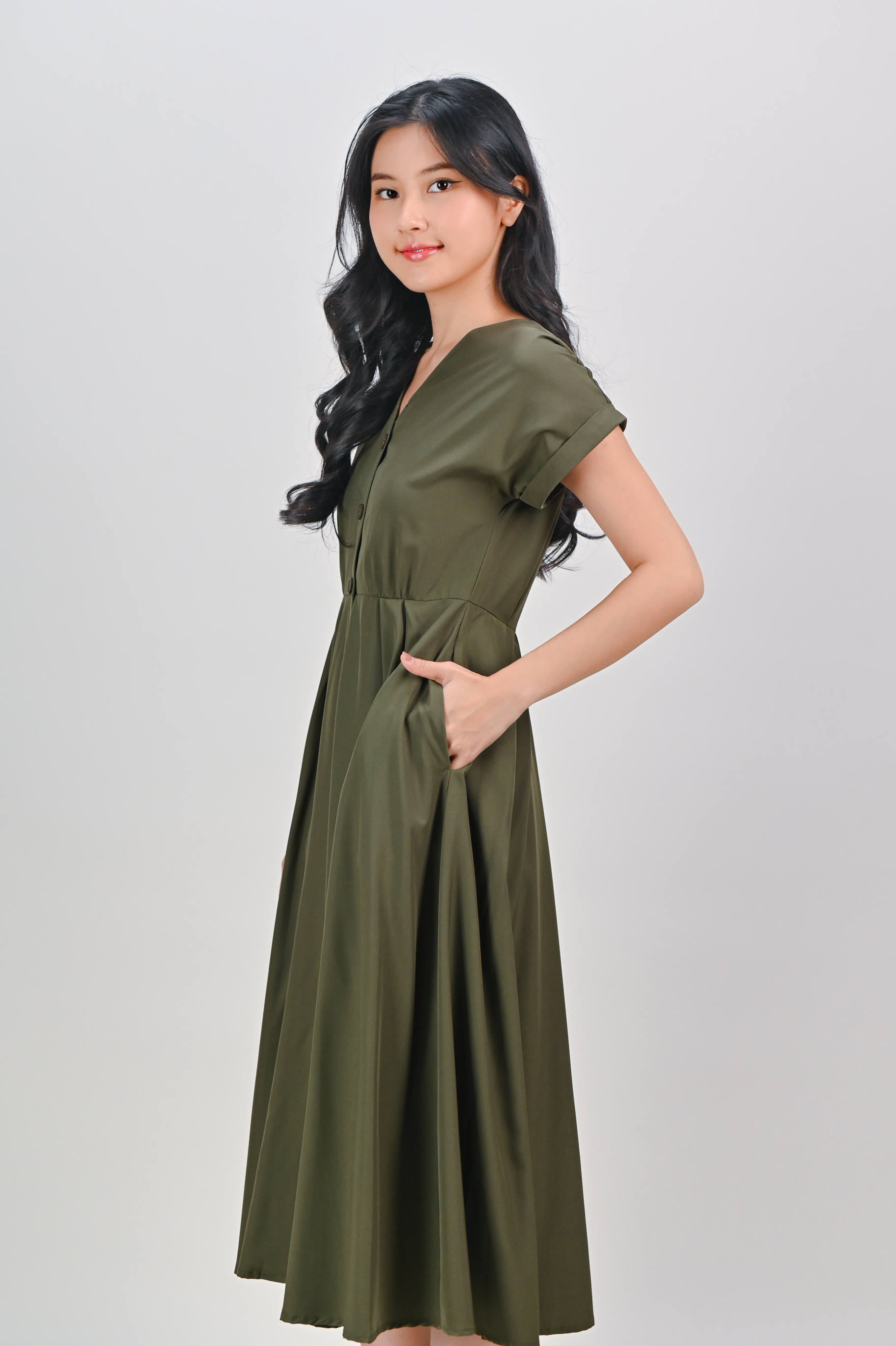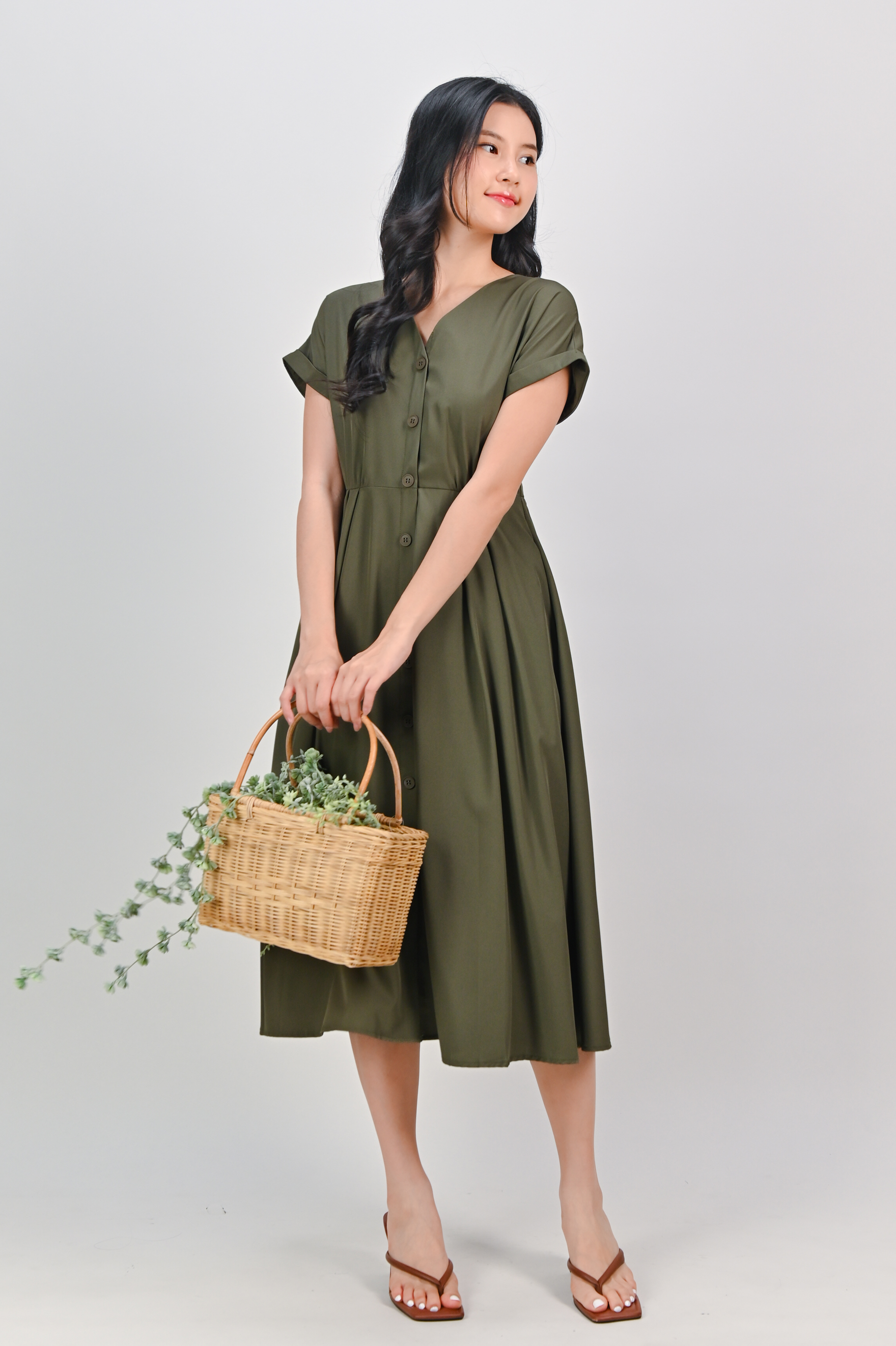 HUDGENS SLEEVED BUTTON DRESS IN OLIVE