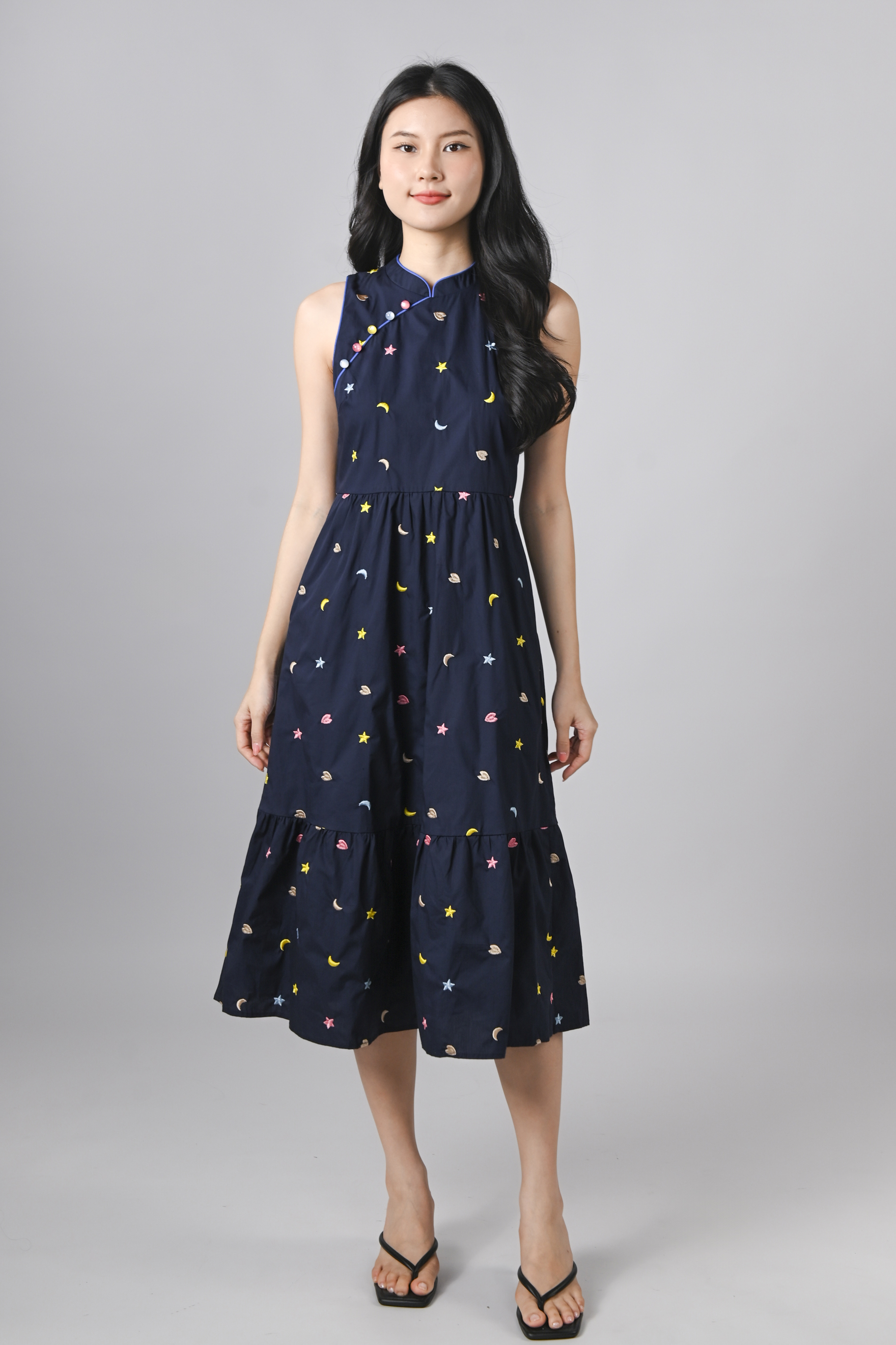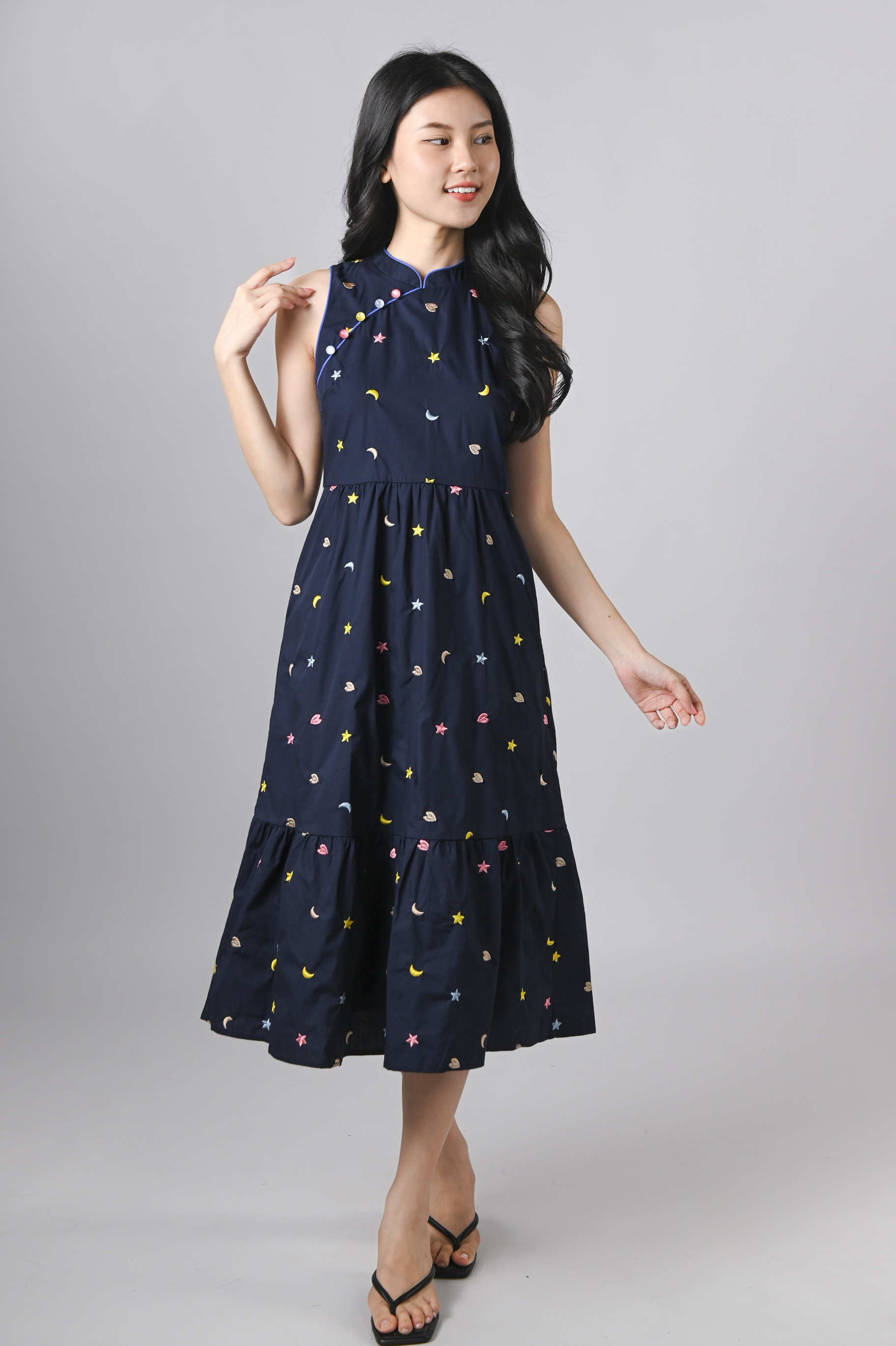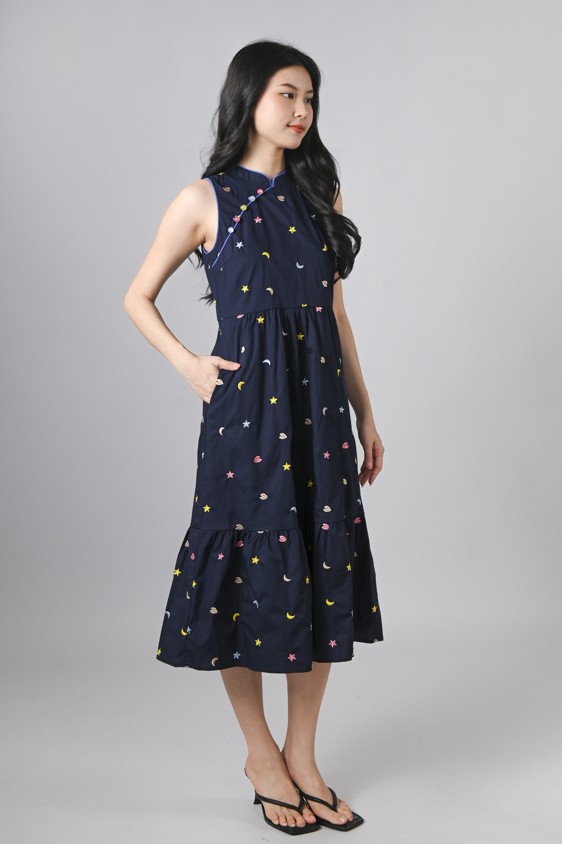 HUIWEN NAVY STARRY EMB. SLEEVELESS CHEONGSAM DRESS