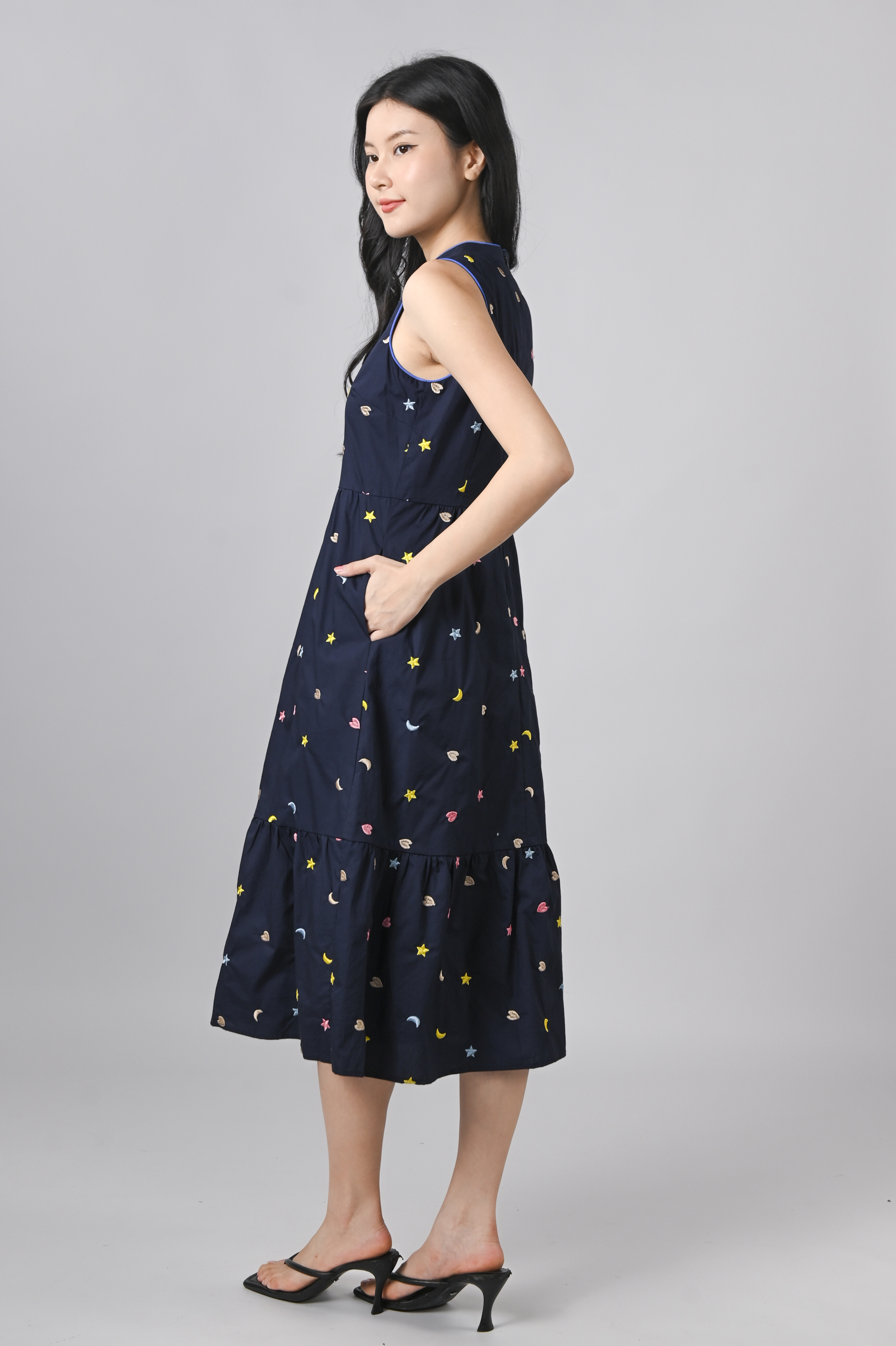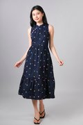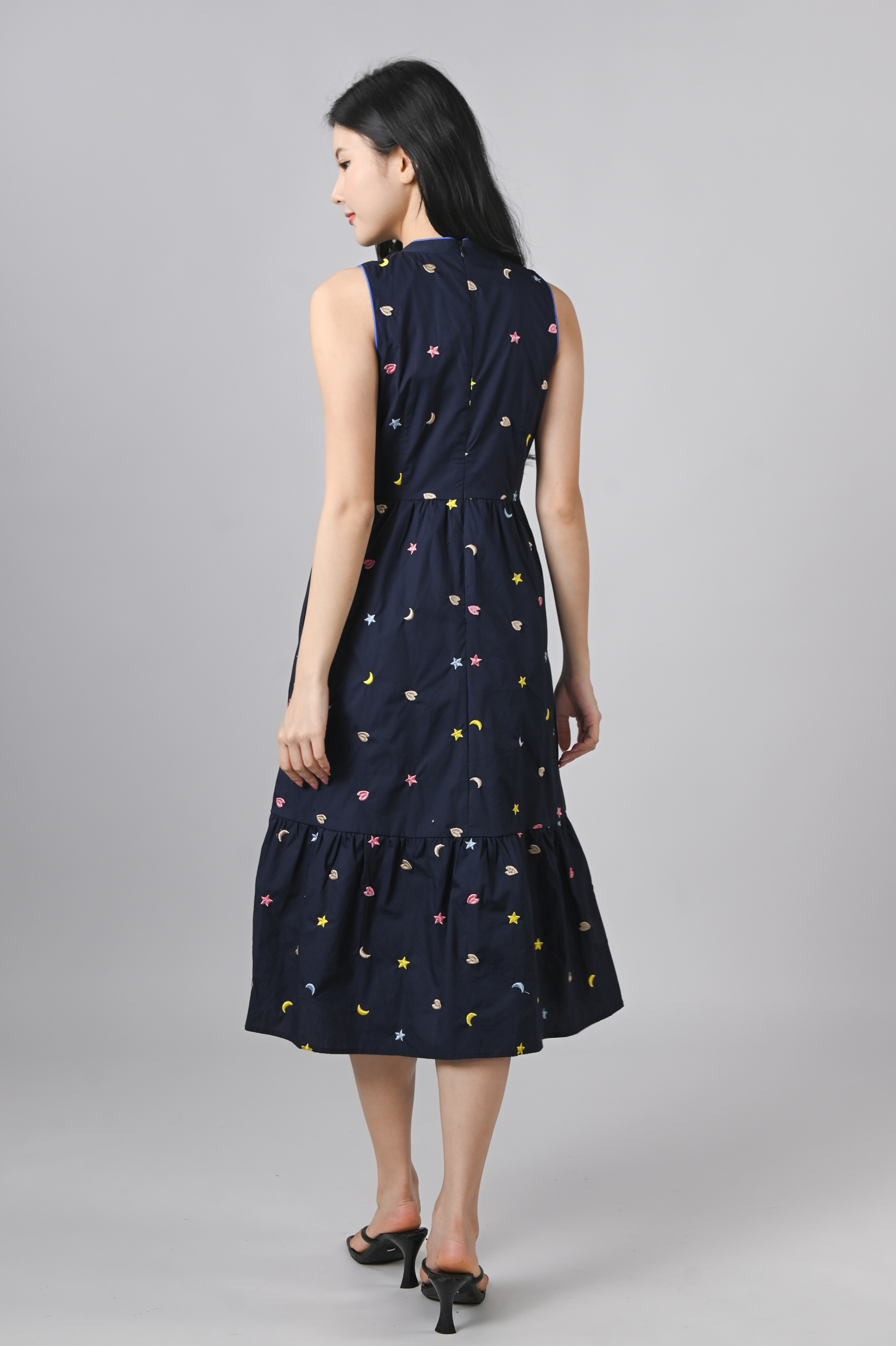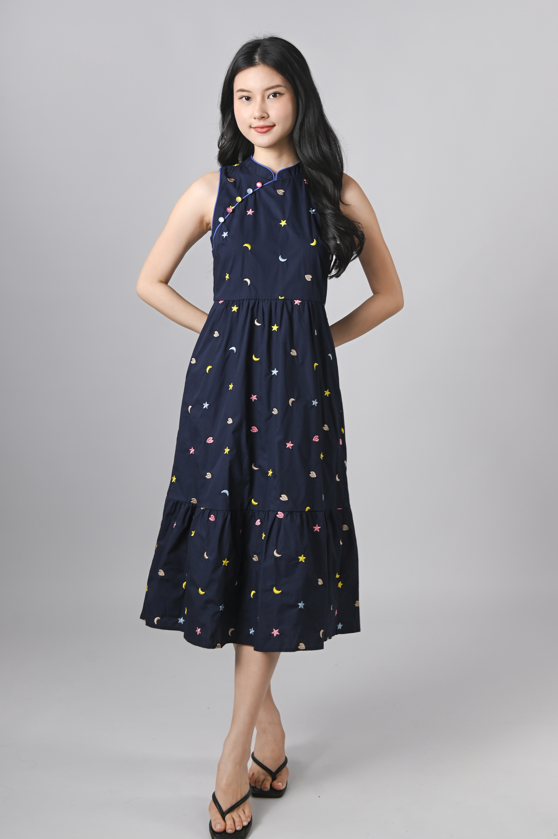 HUIWEN NAVY STARRY EMB. SLEEVELESS CHEONGSAM DRESS