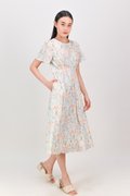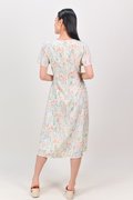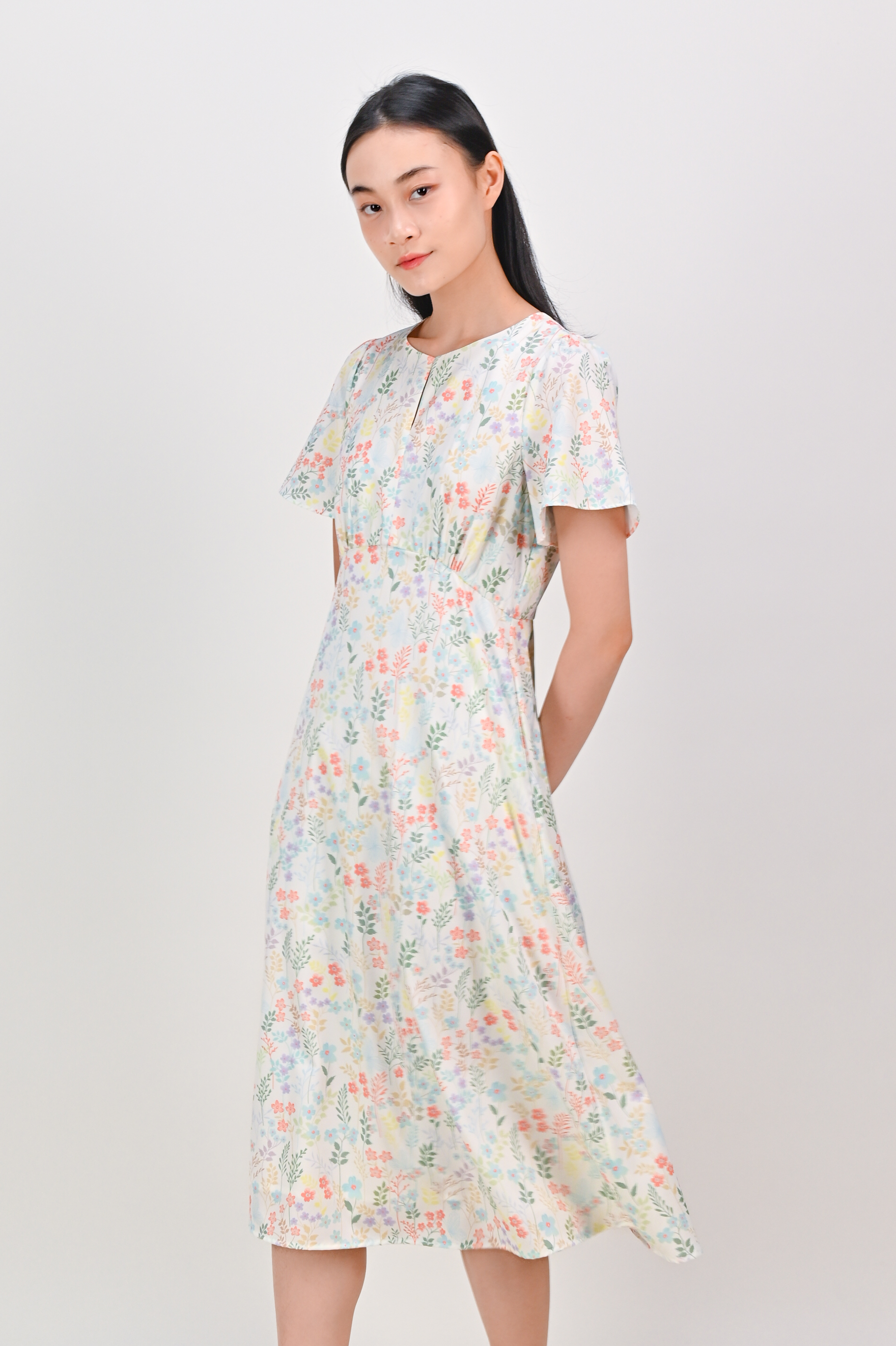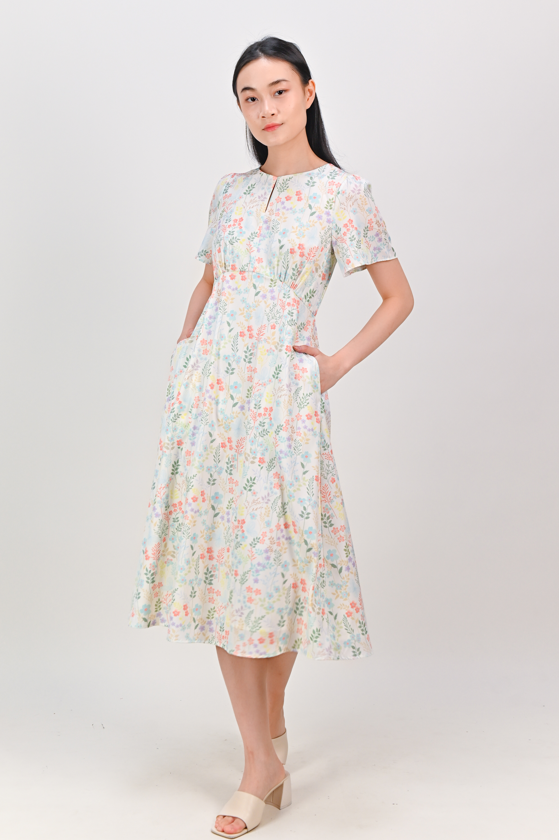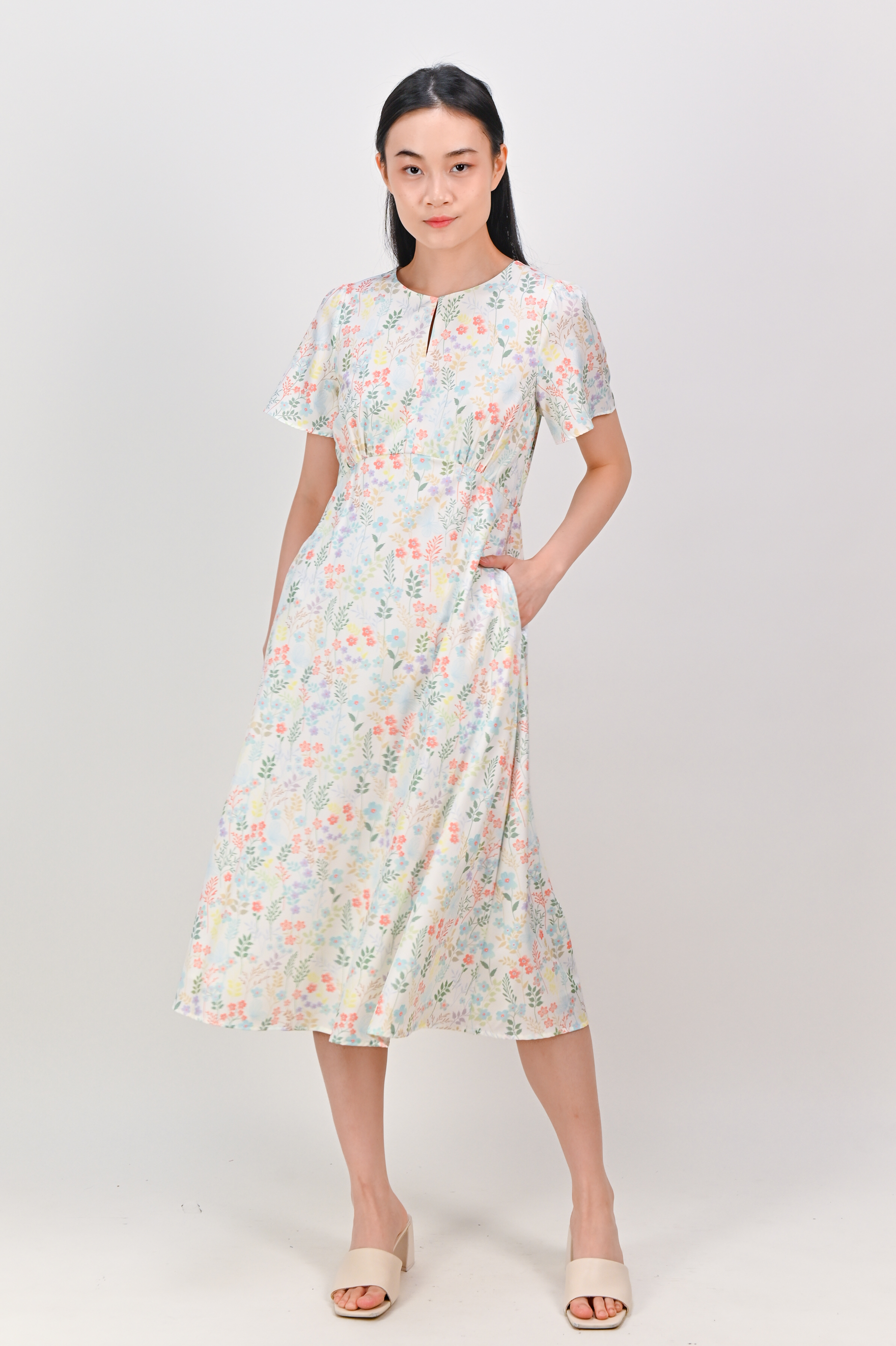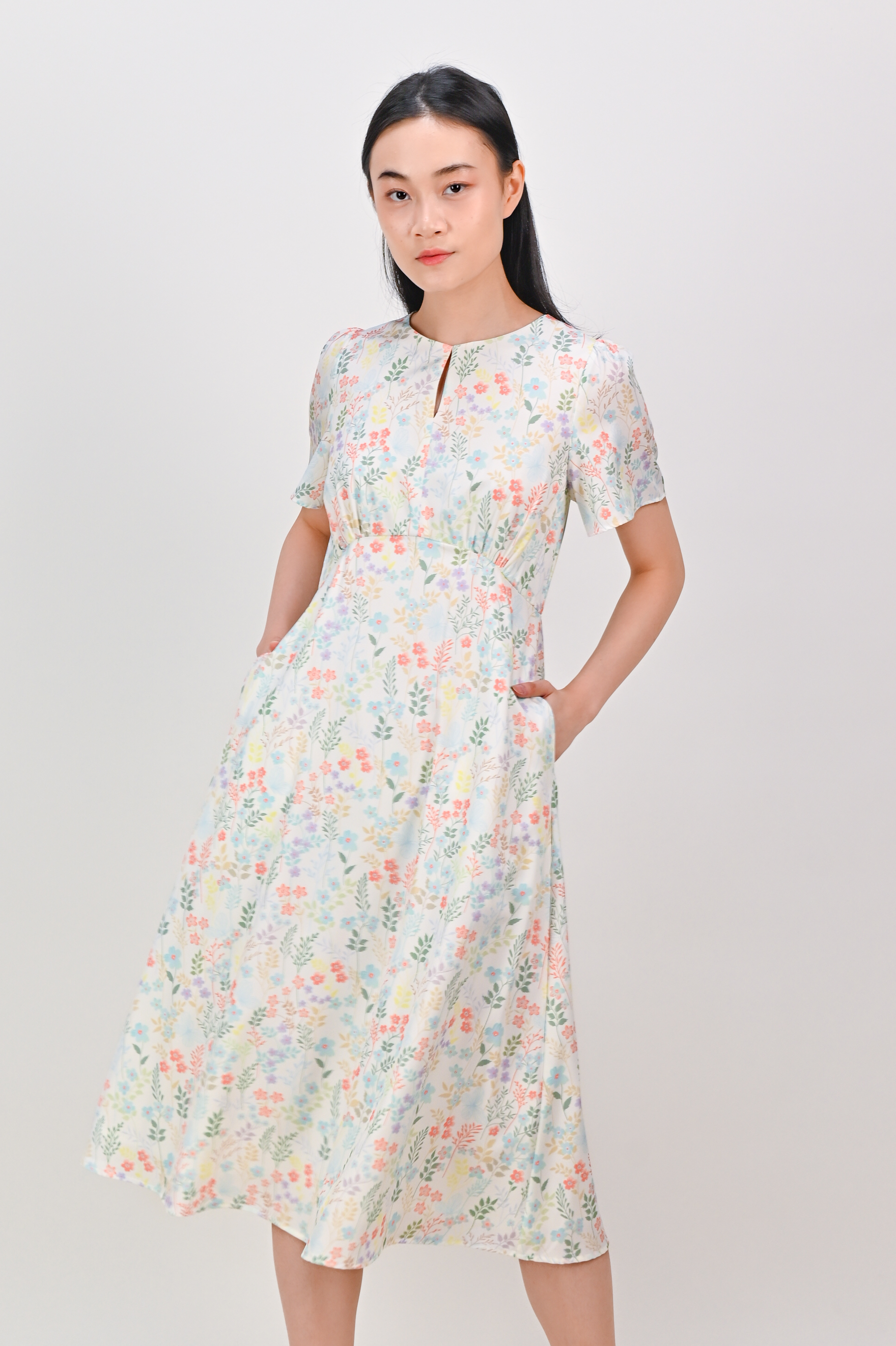 HYUN WHITE FLORAL KEYHOLE SLEEVED MIDI DRESS