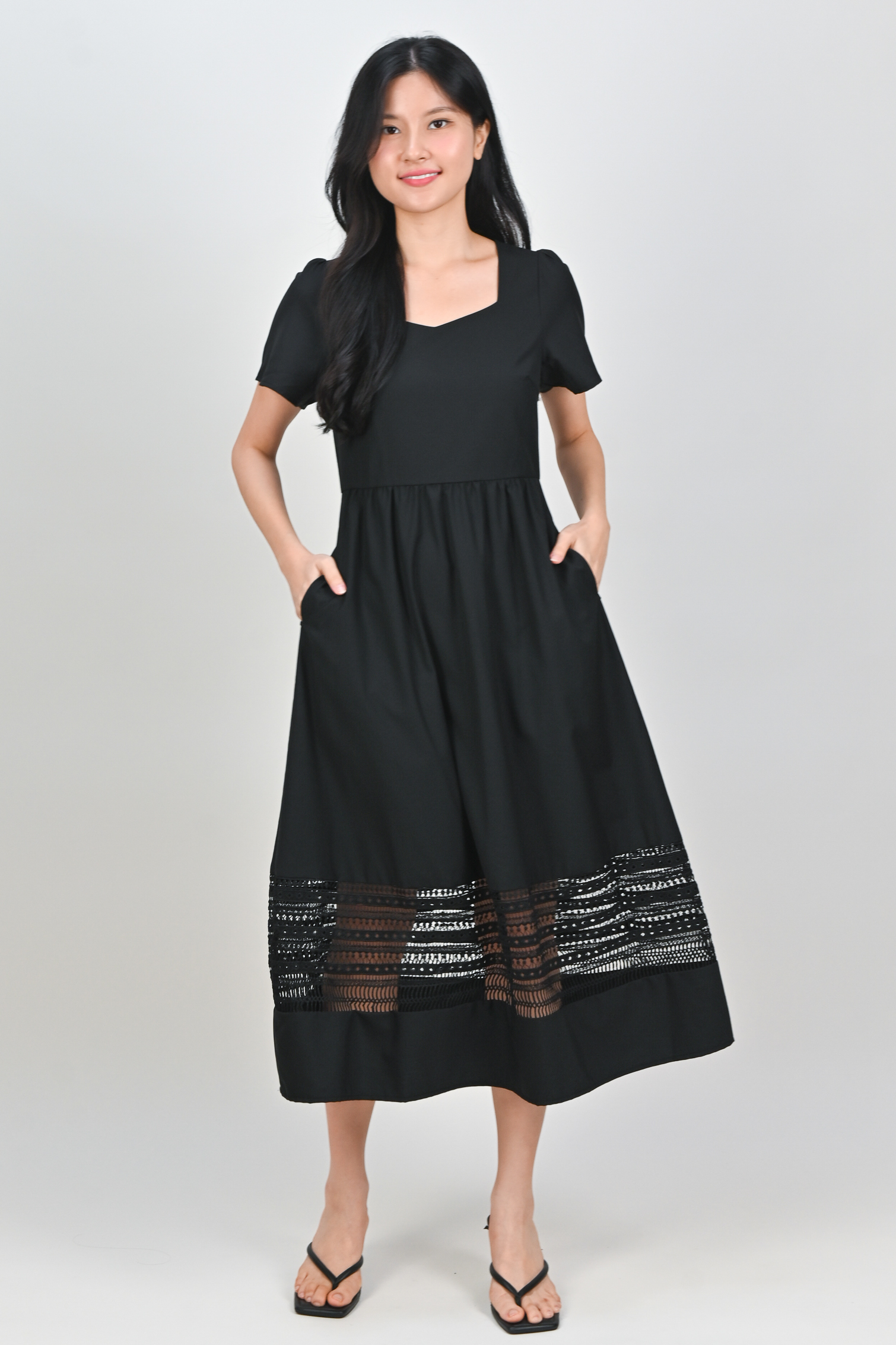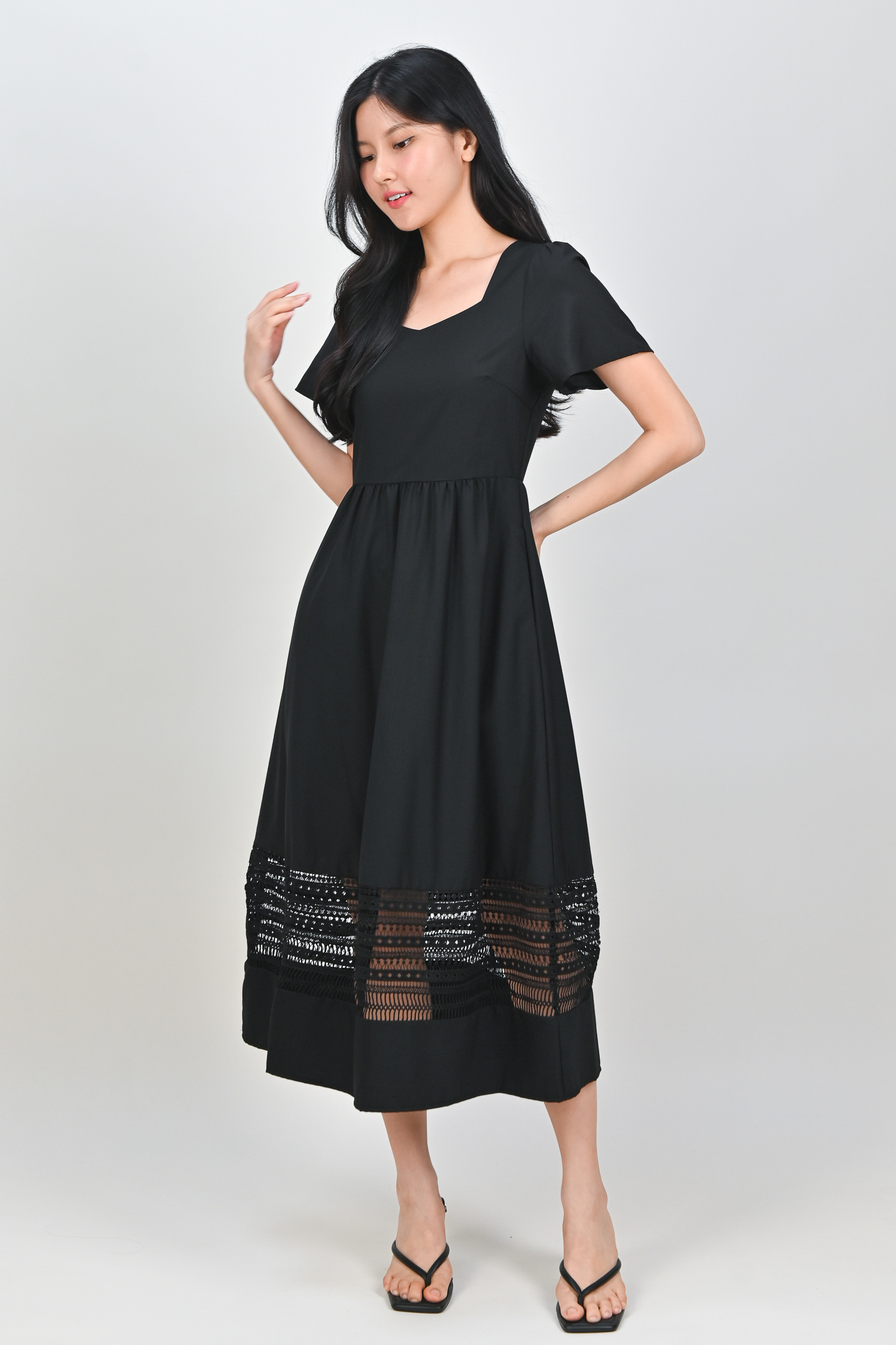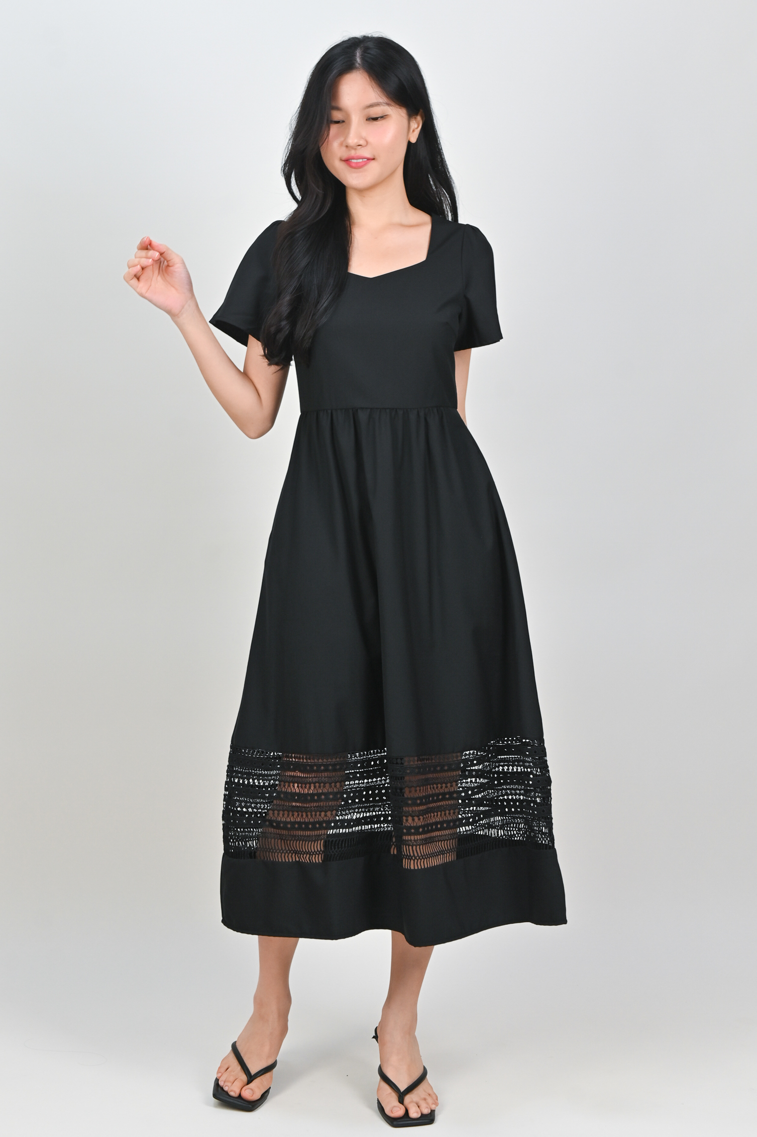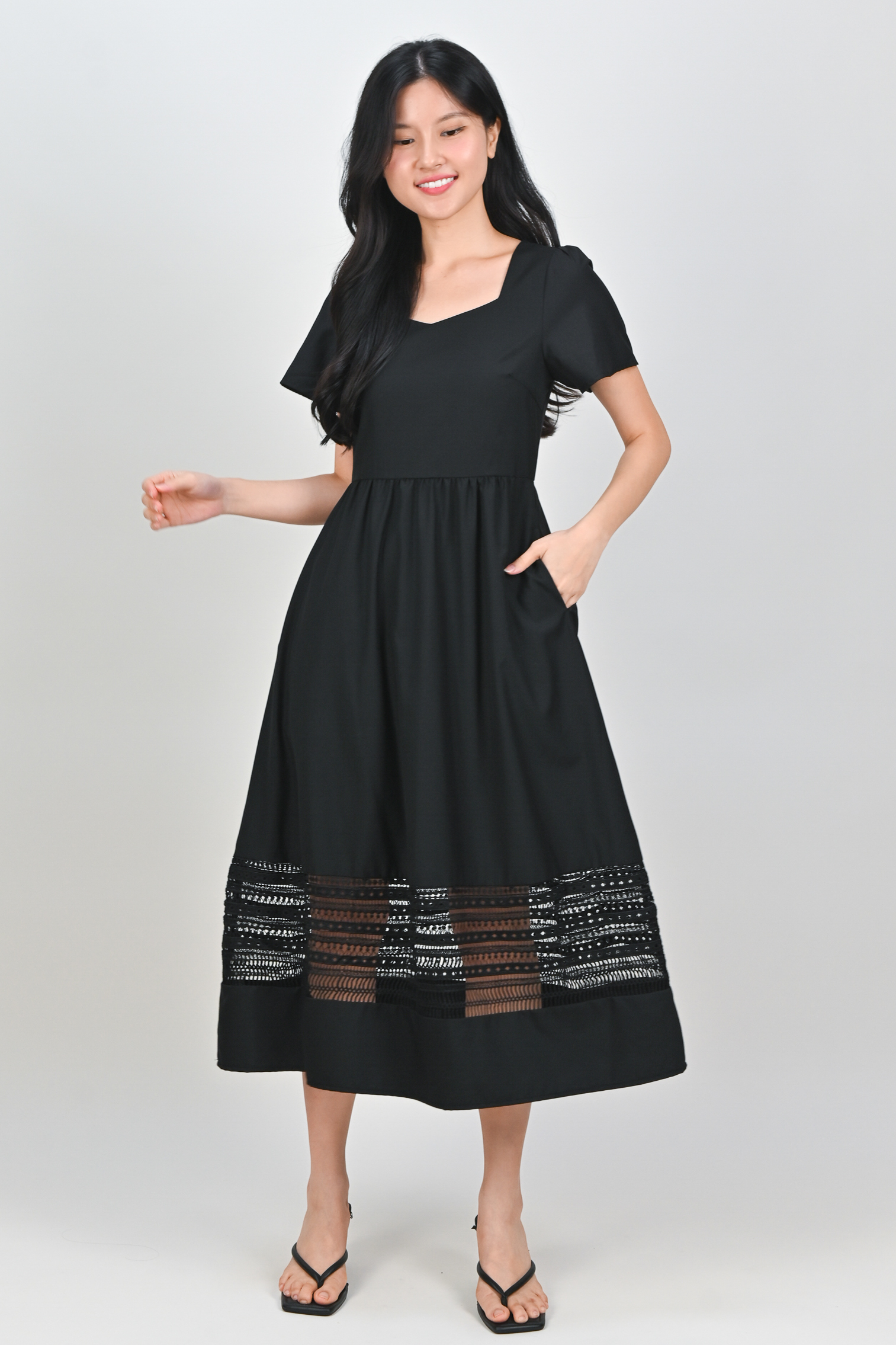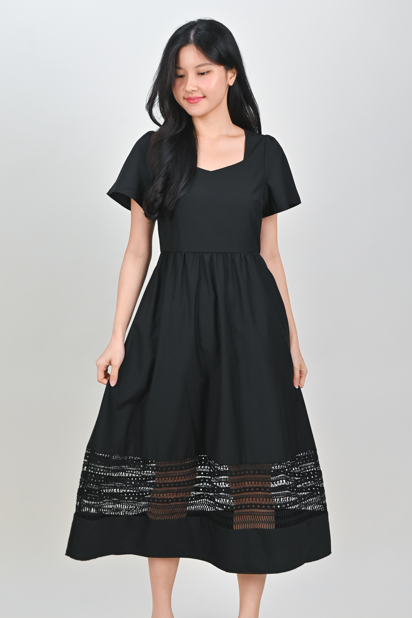 Actual stocks may varyA little lace, a lot of charm 🖤 Our Inez Lace-Insert Midi Dress is here to turn heads and steal hearts! 💃