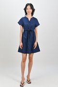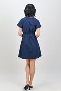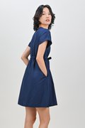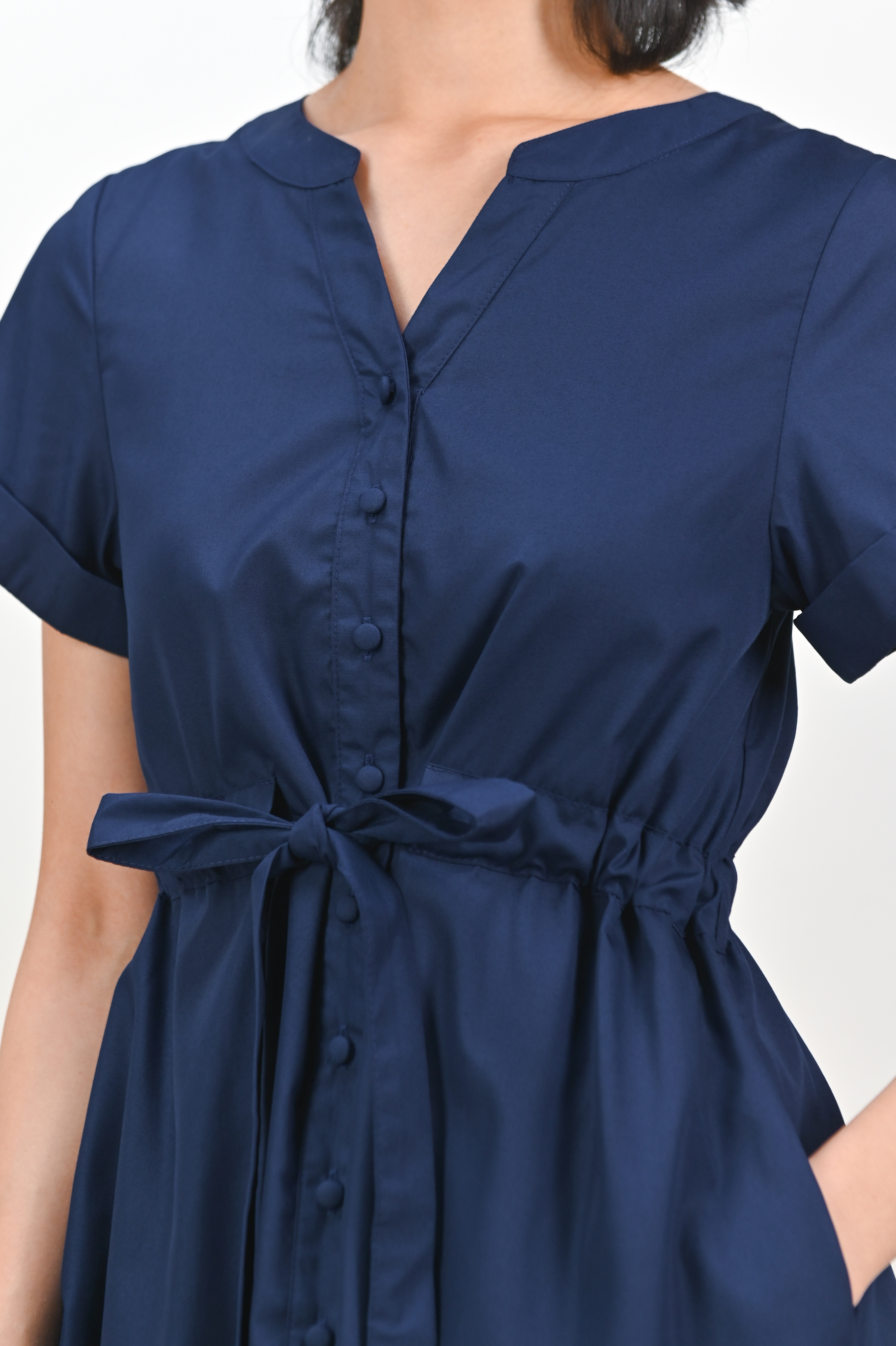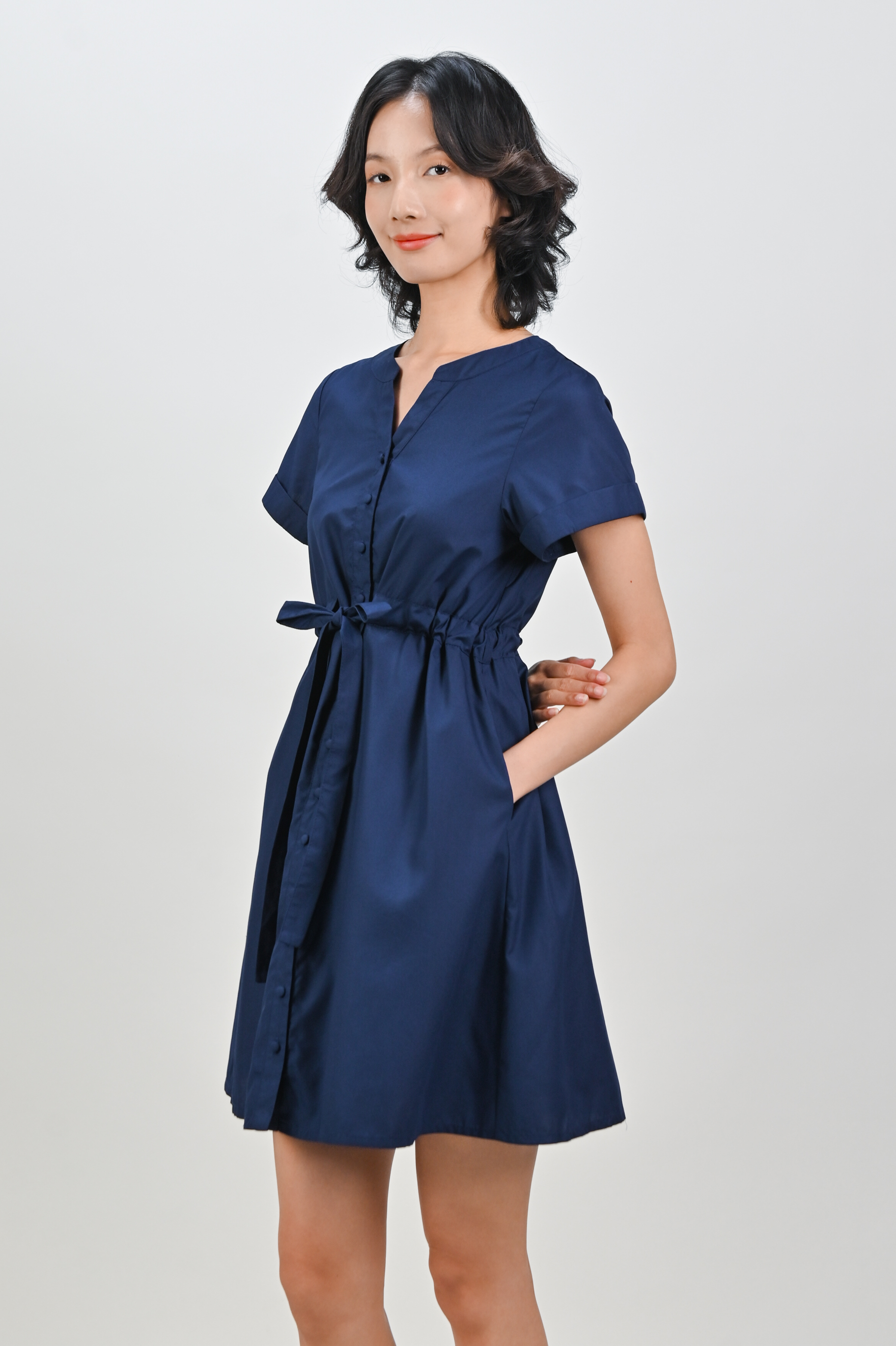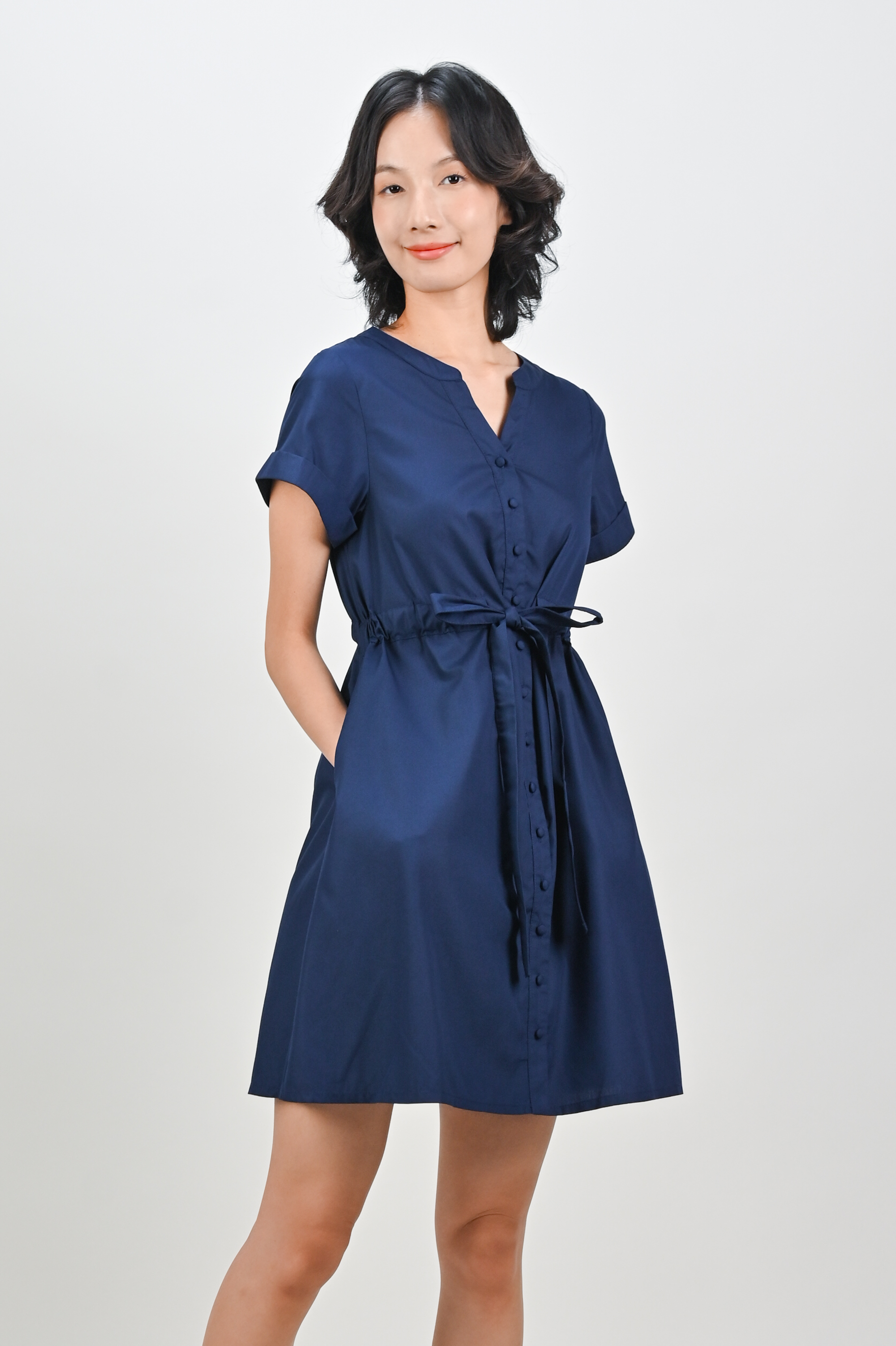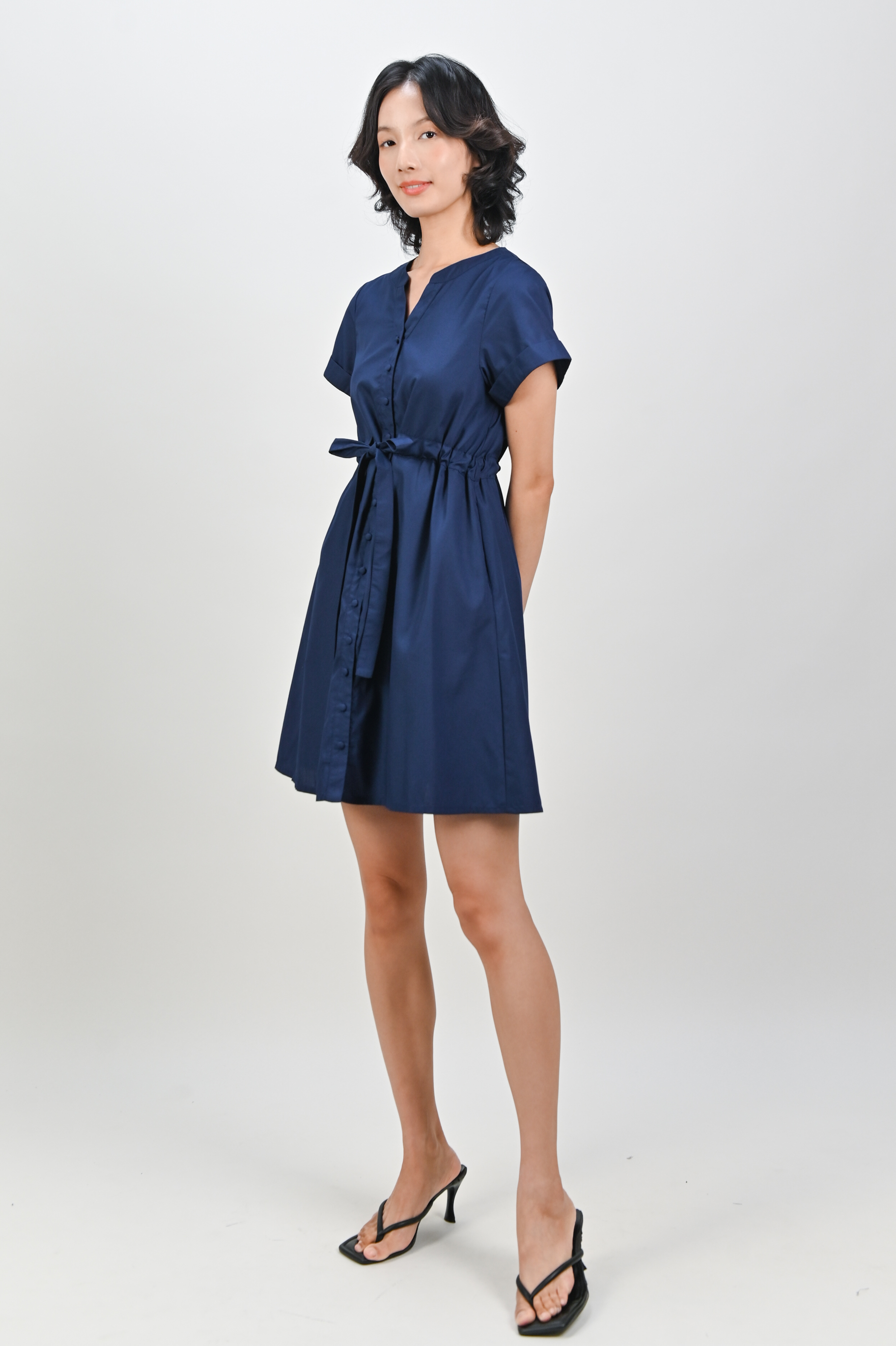 JUNO SLEEVED DRAWSTRING-WAIST SHIRT-DRESS IN NAVY