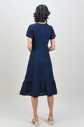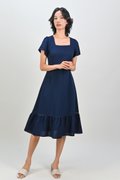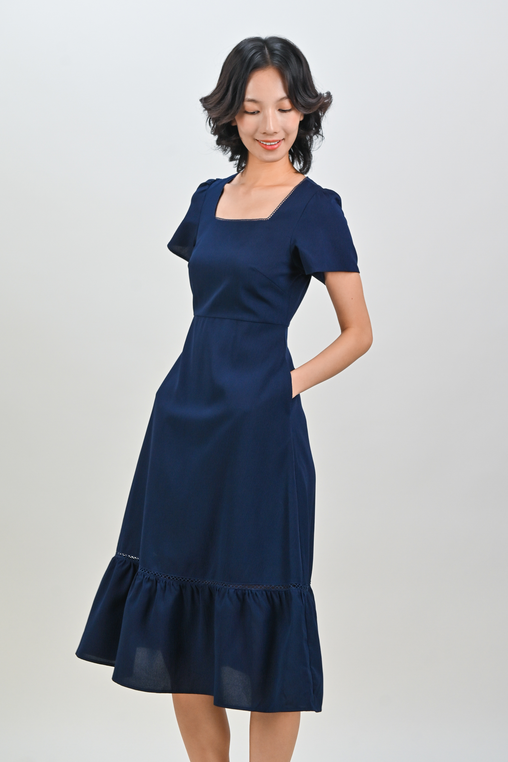 JYNDAL SQUARE-NECK LACE-TRIM DRESS IN NAVY