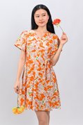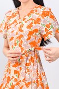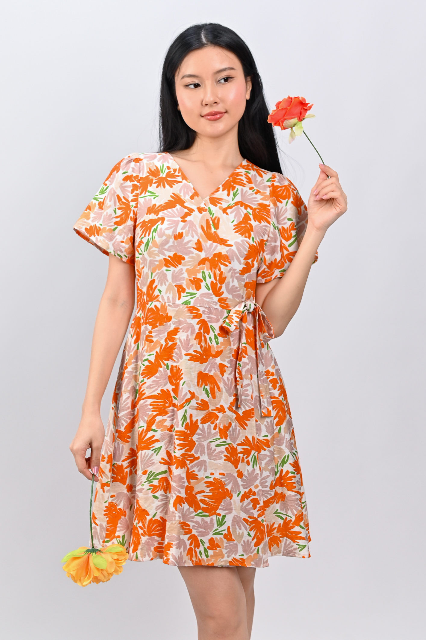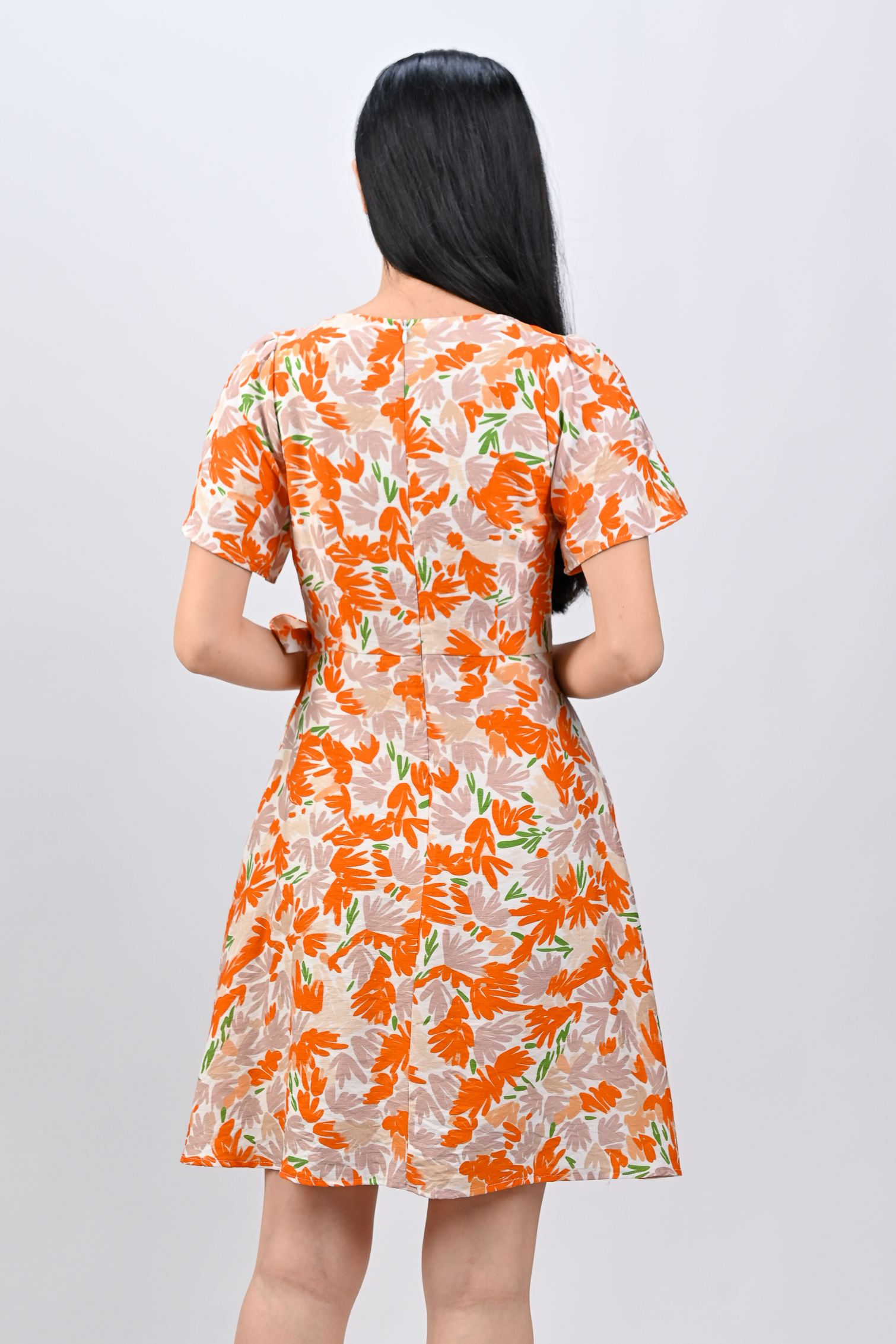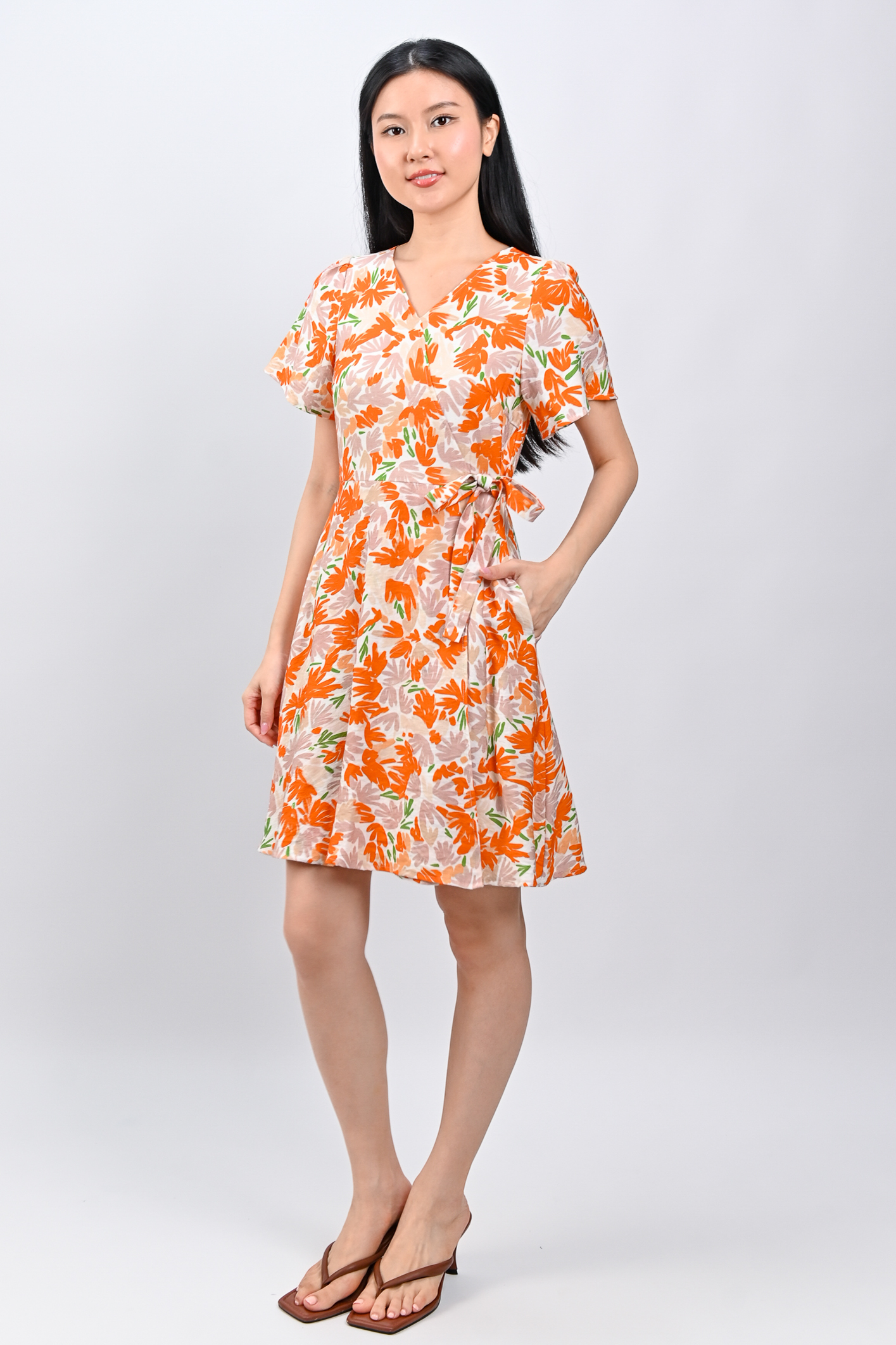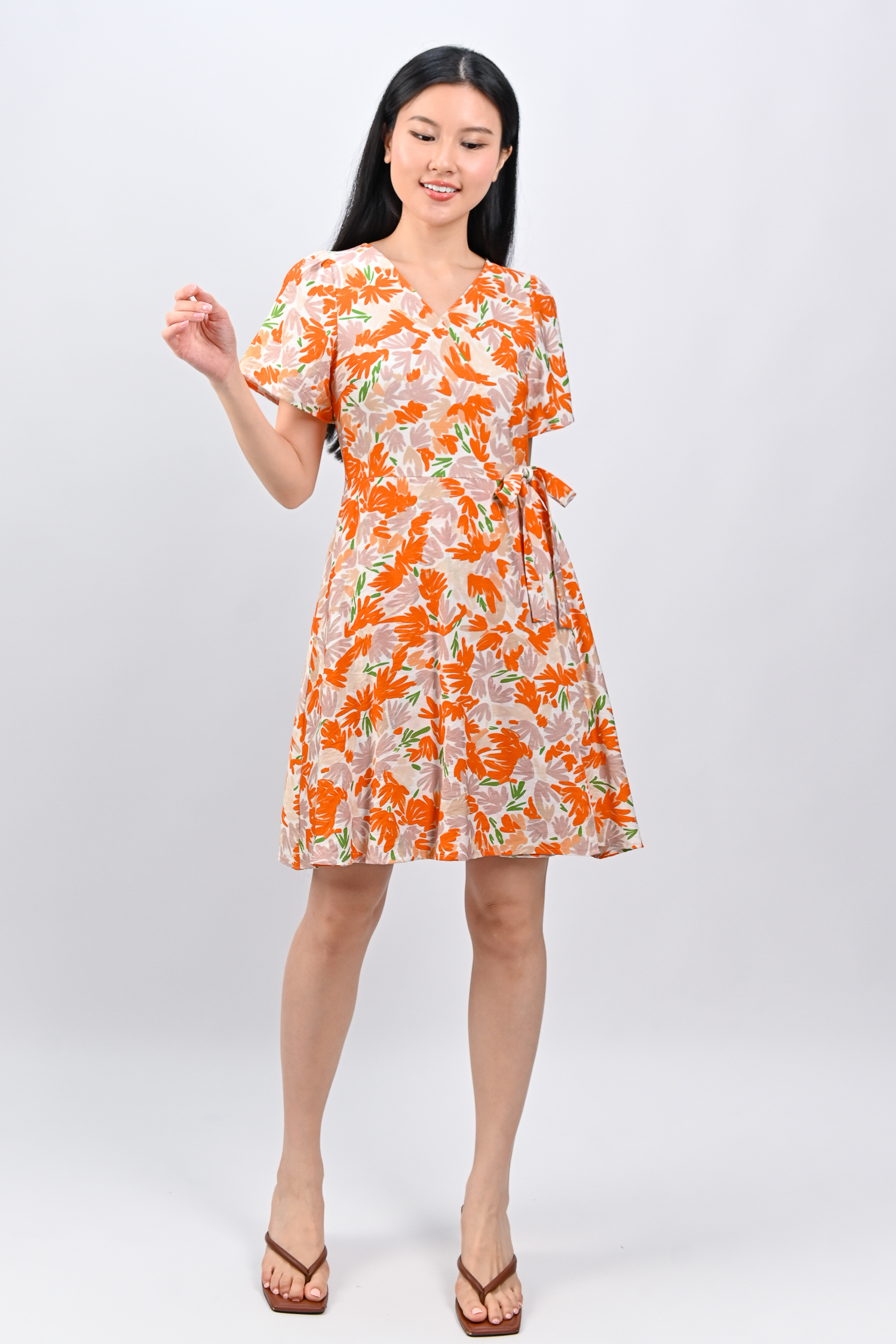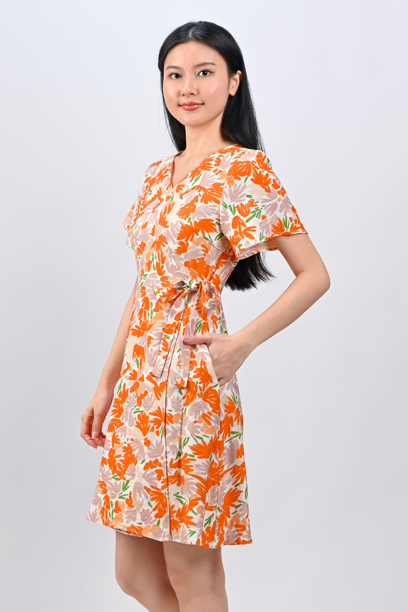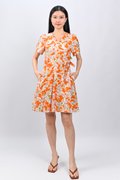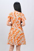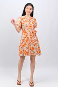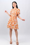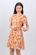 KALYRA FAUX-WRAP SLEEVED DRESS IN ORANGE