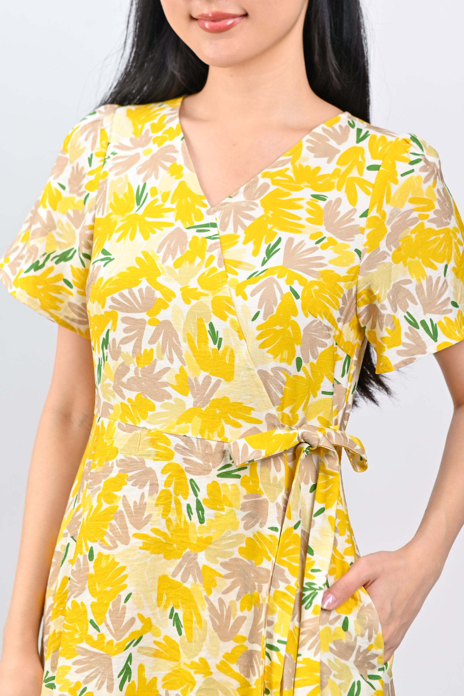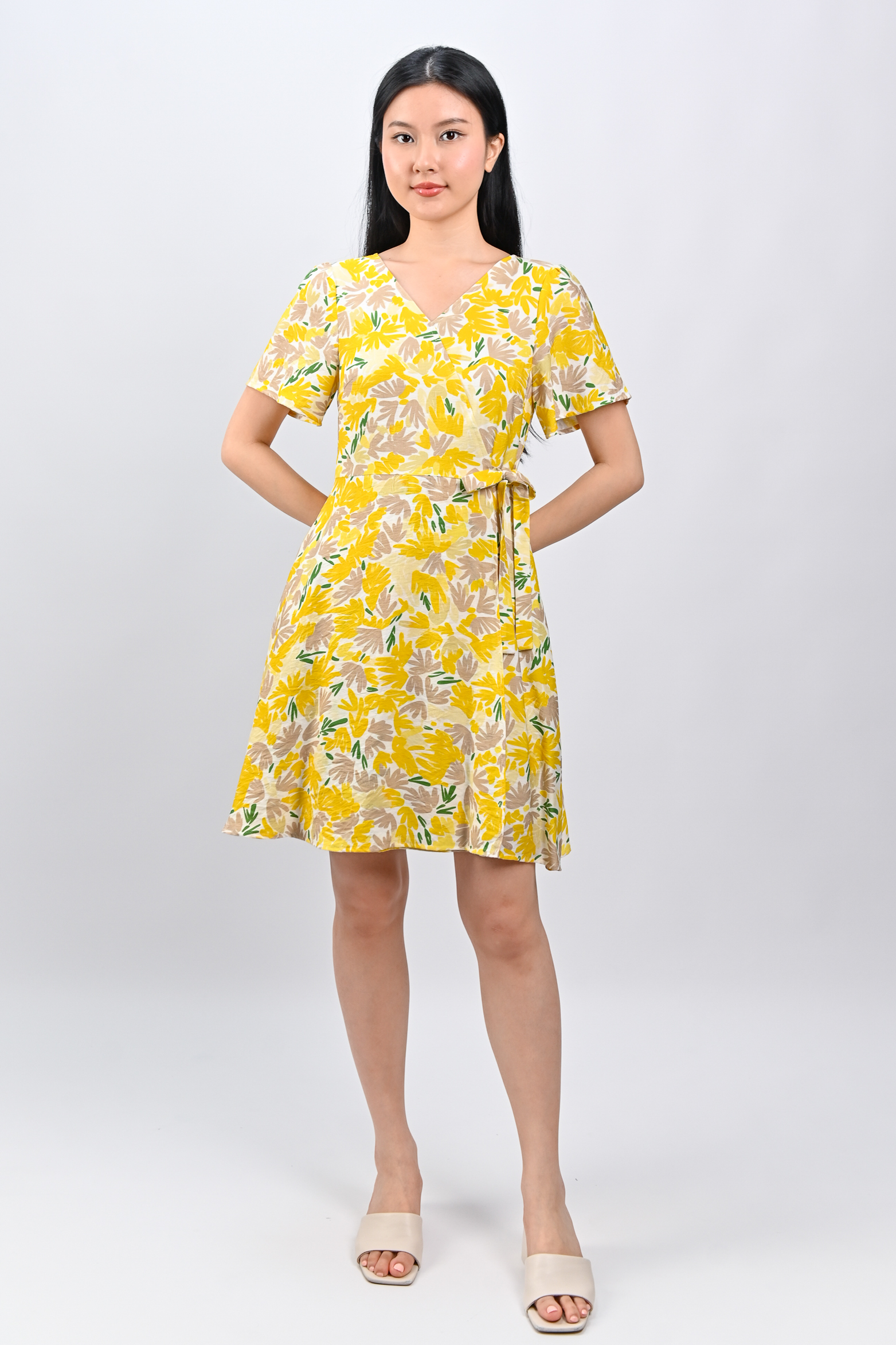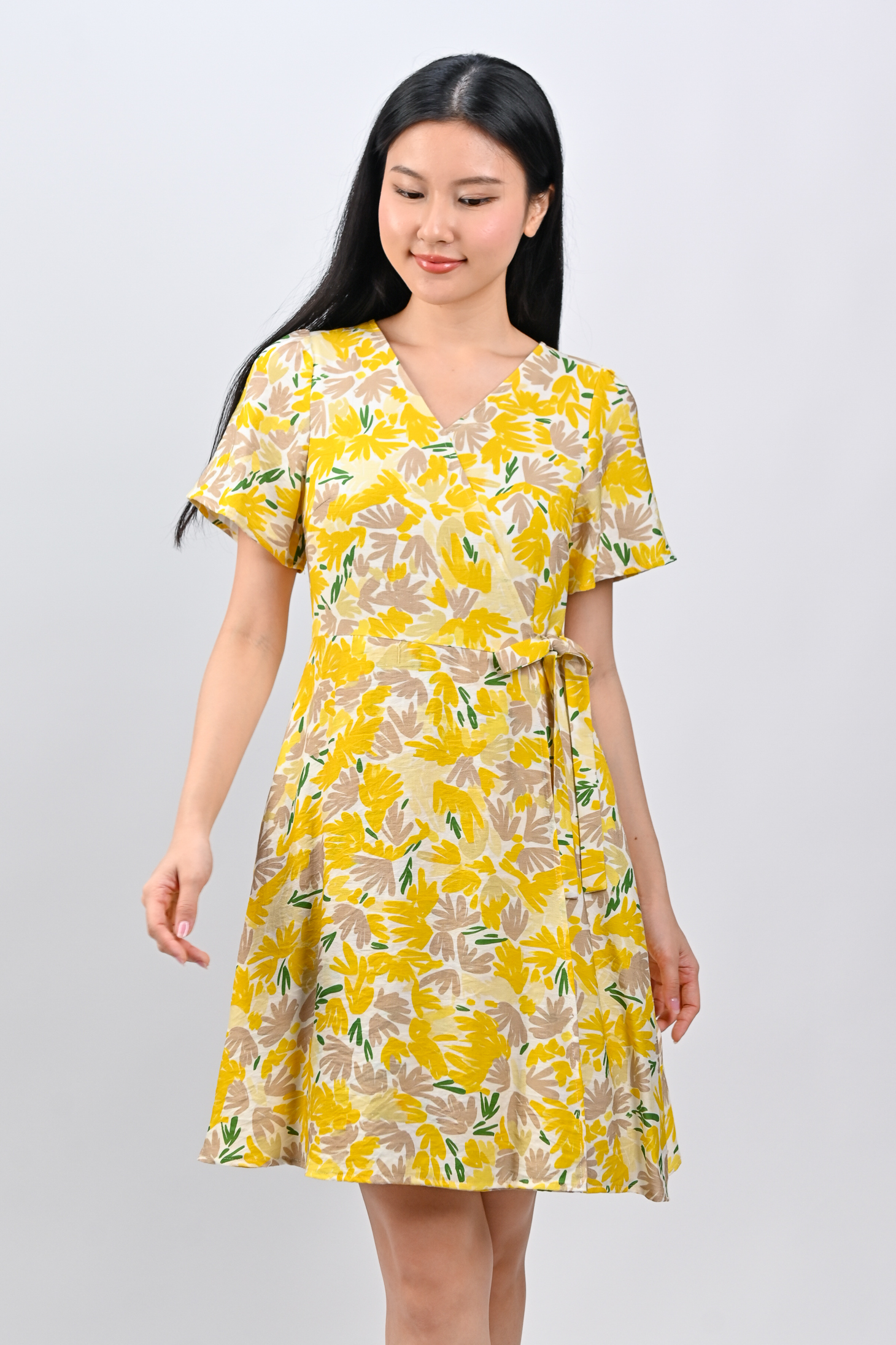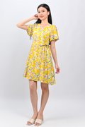 KALYRA FAUX-WRAP SLEEVED DRESS IN YELLOW