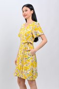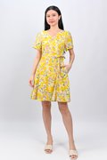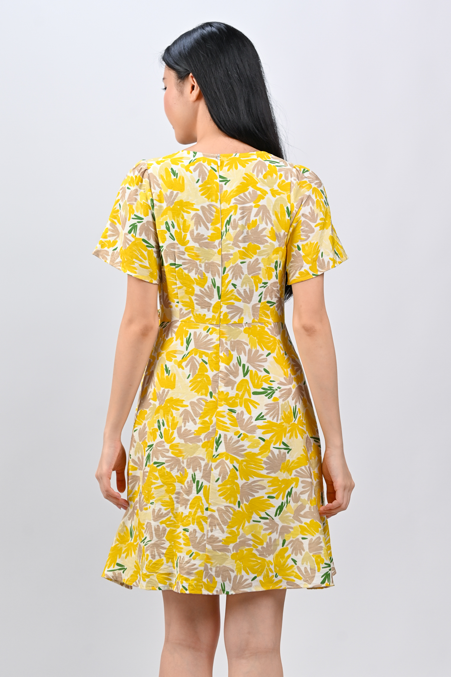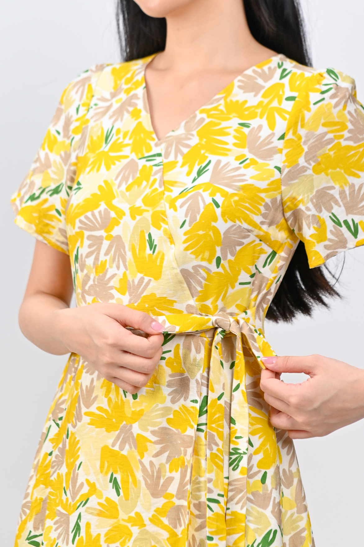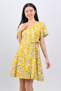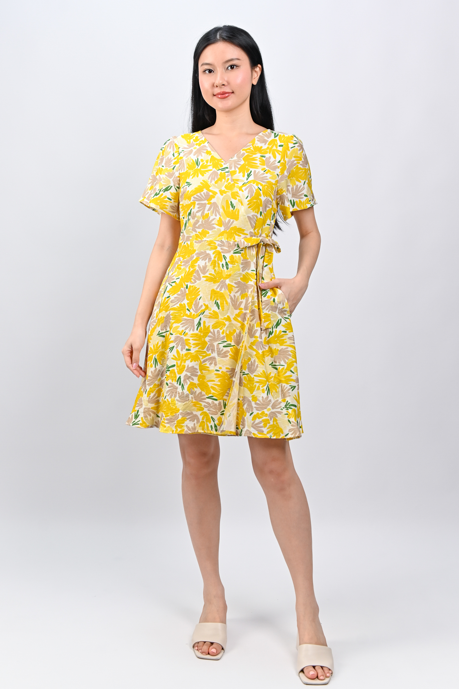 KALYRA FAUX-WRAP SLEEVED DRESS IN YELLOW