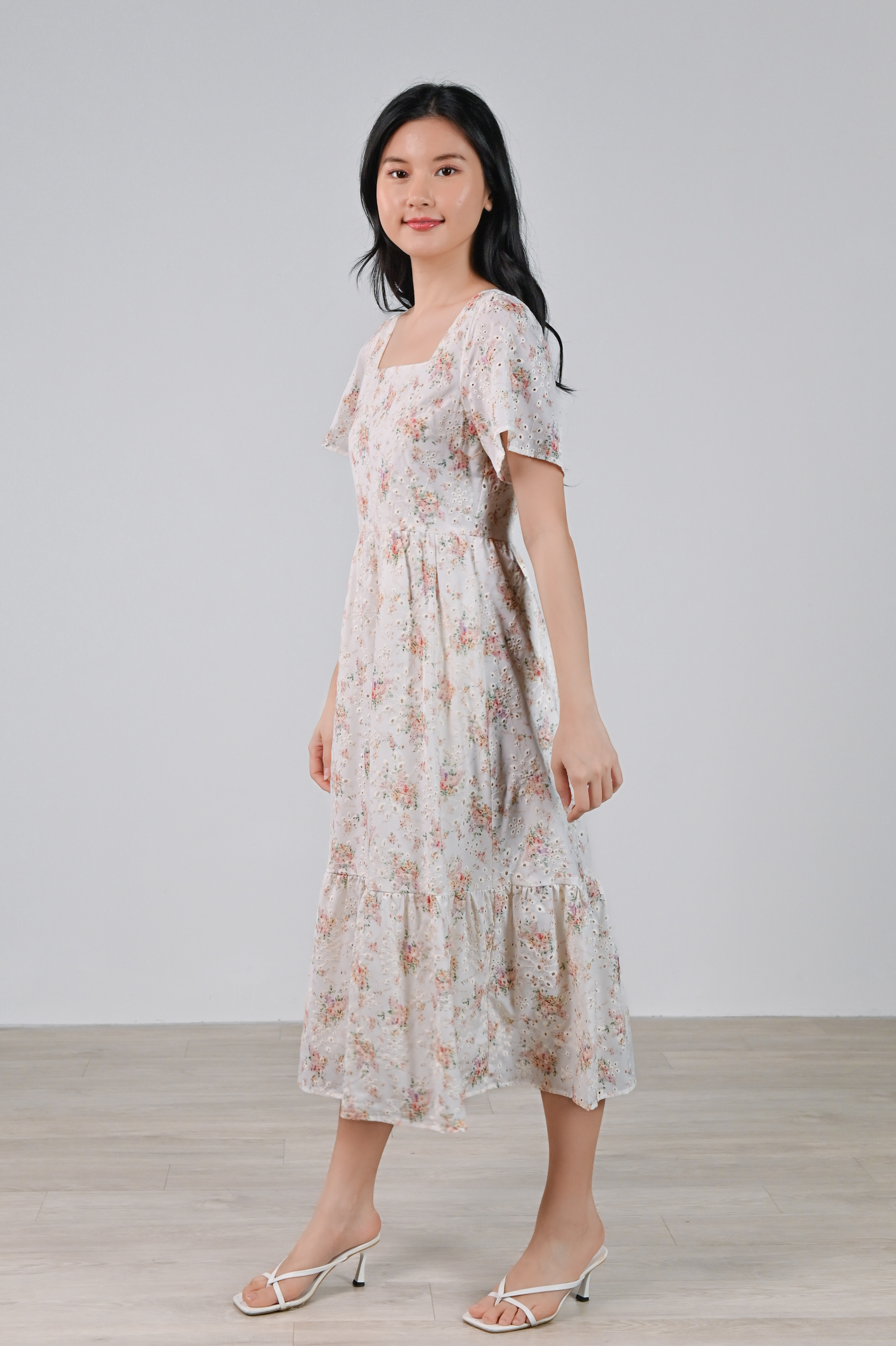 KENIE EYELET FLORAL SQUARE-NECK SLEEVED DRESS