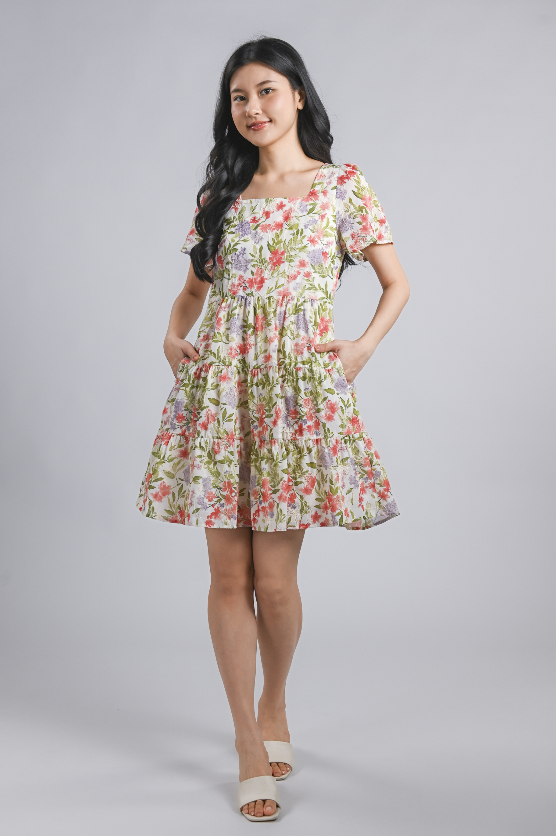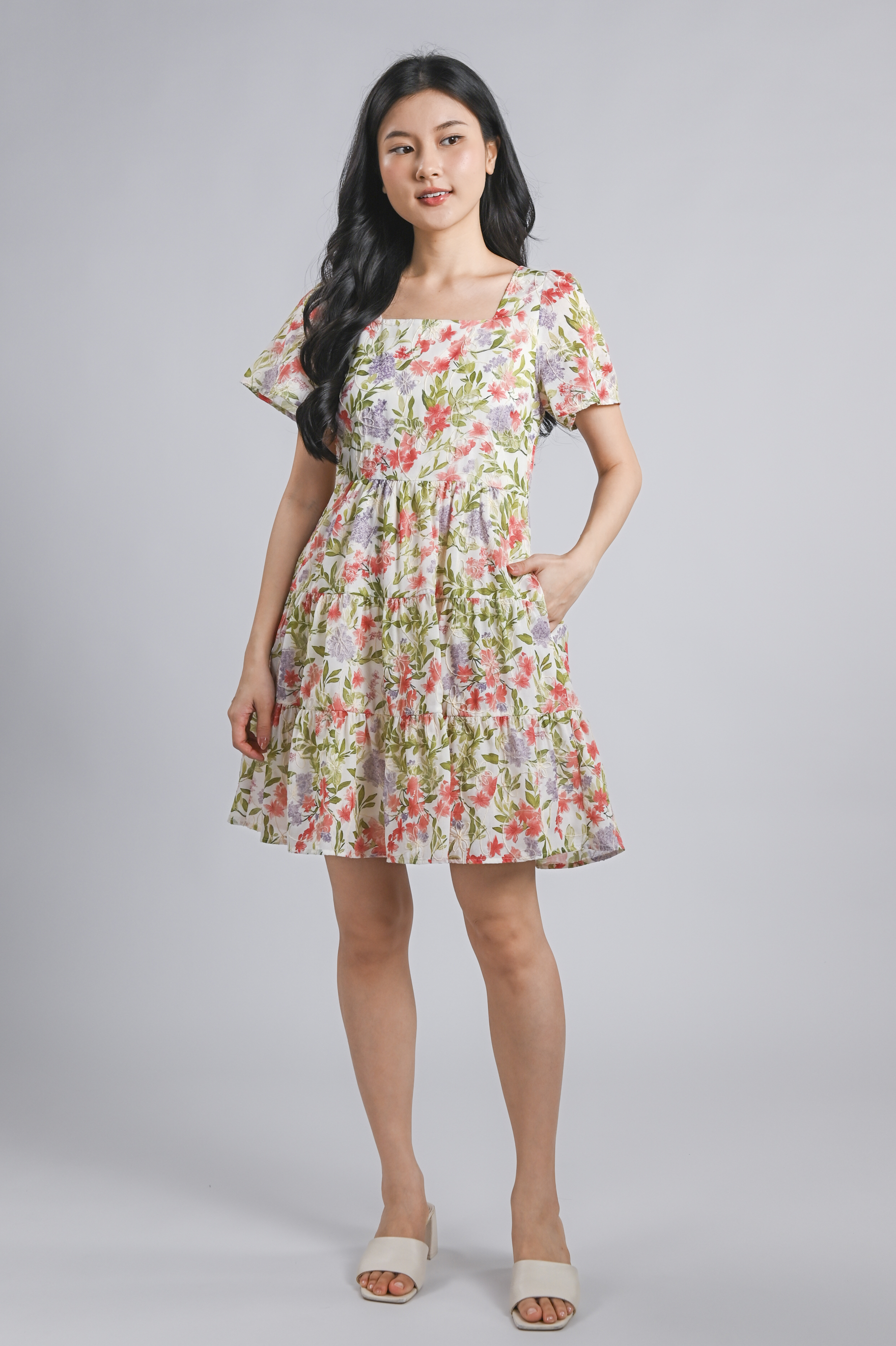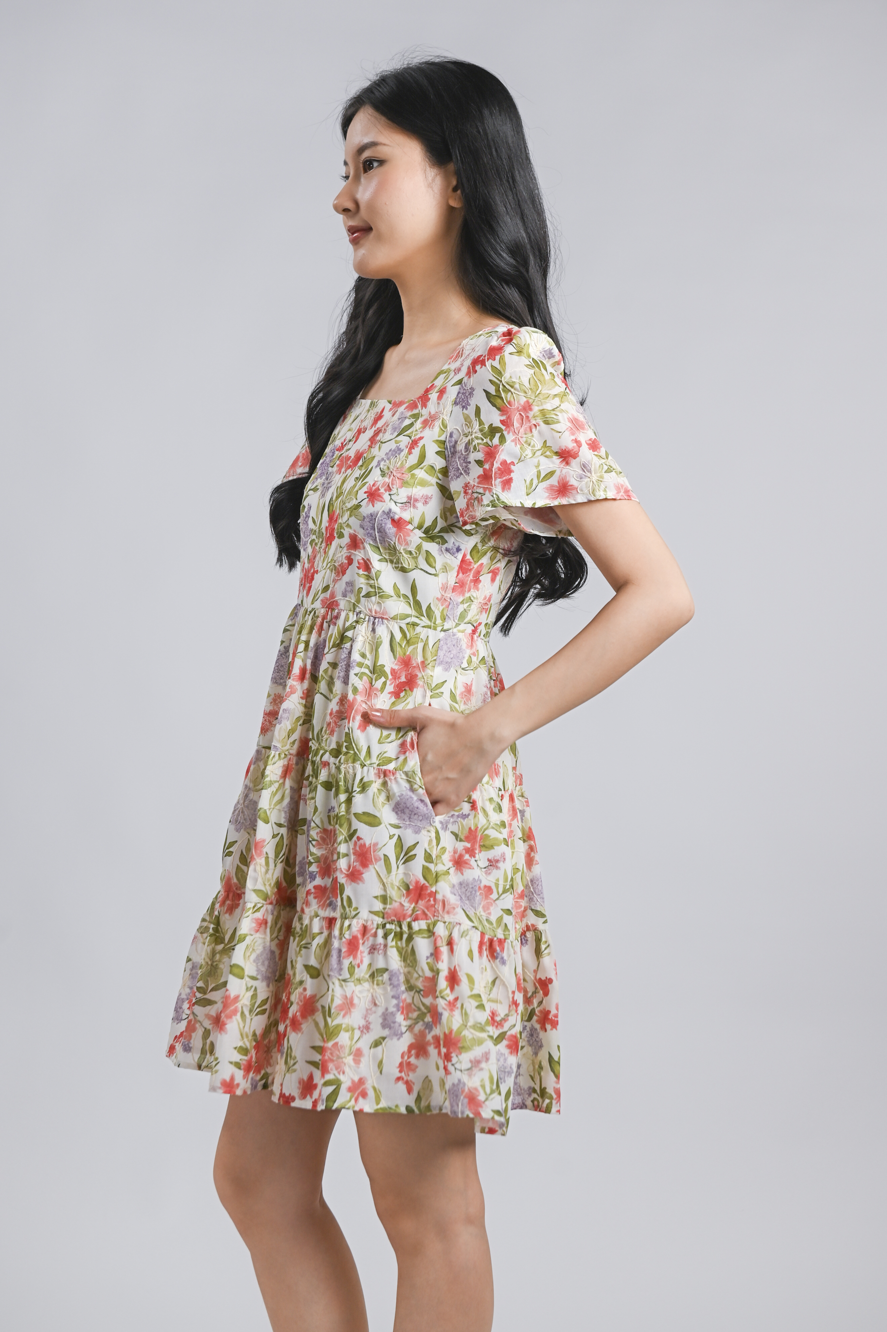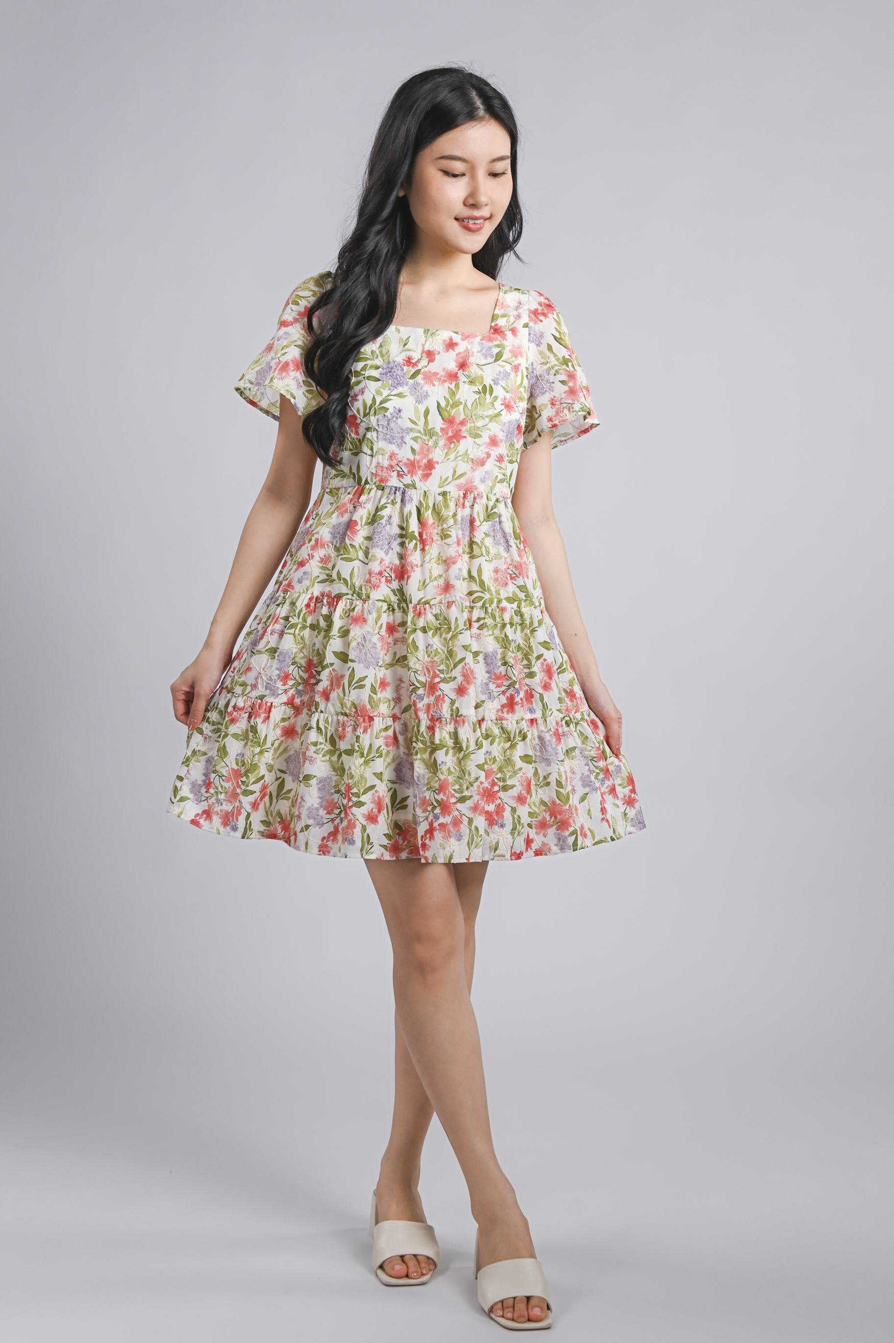 KERU RED FLORAL SQUARE-NECK BABYDOLL DRESS