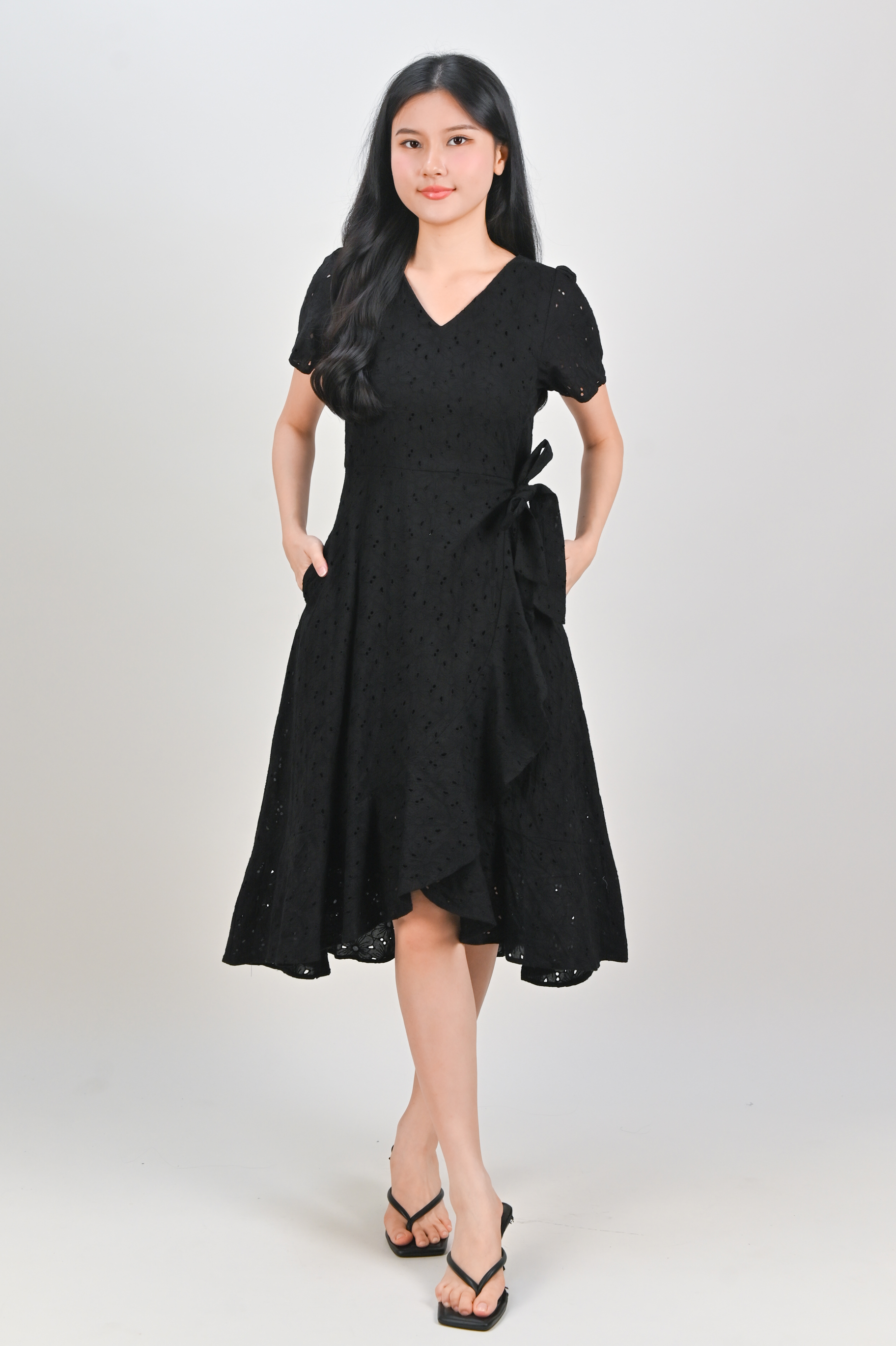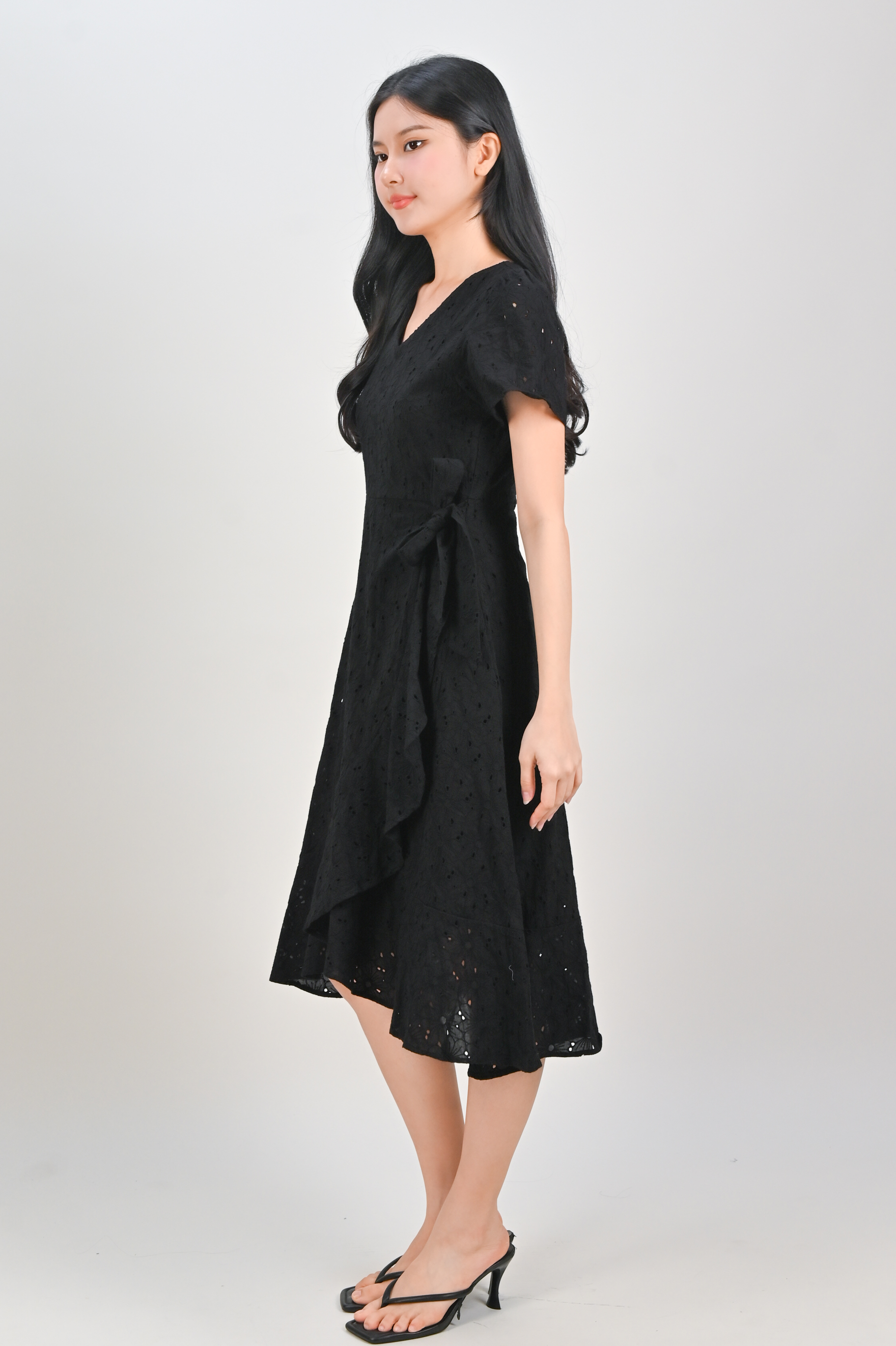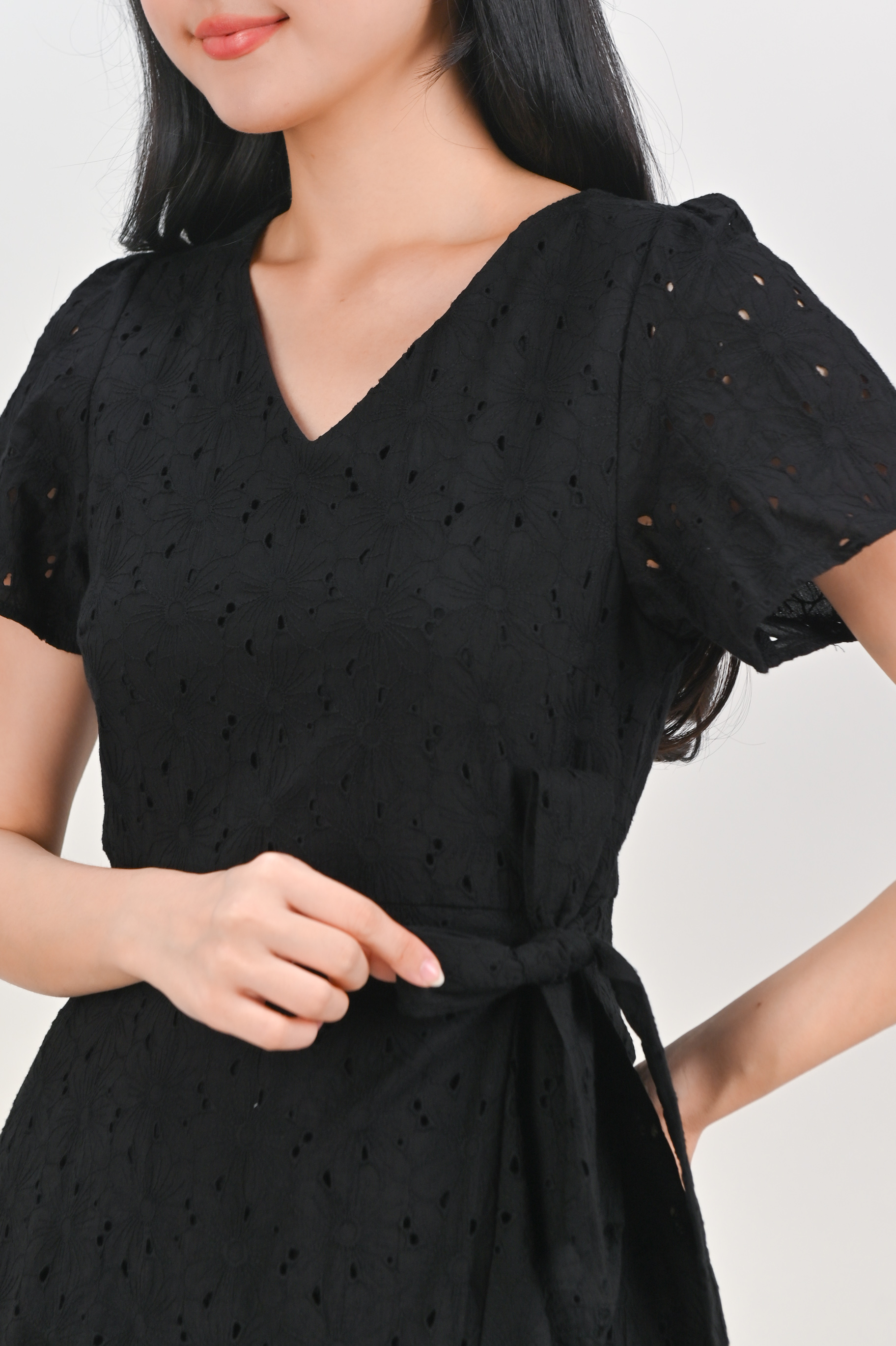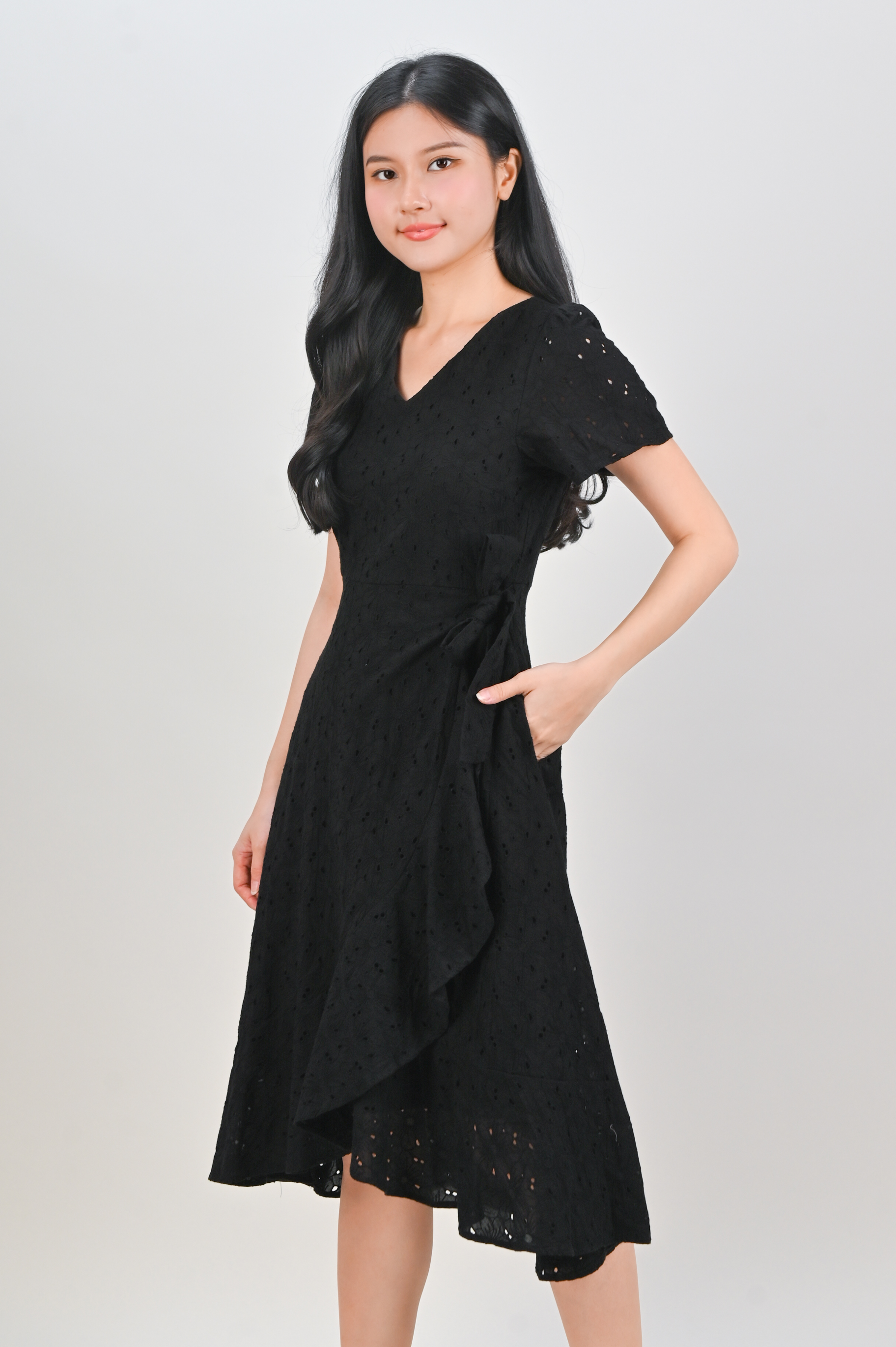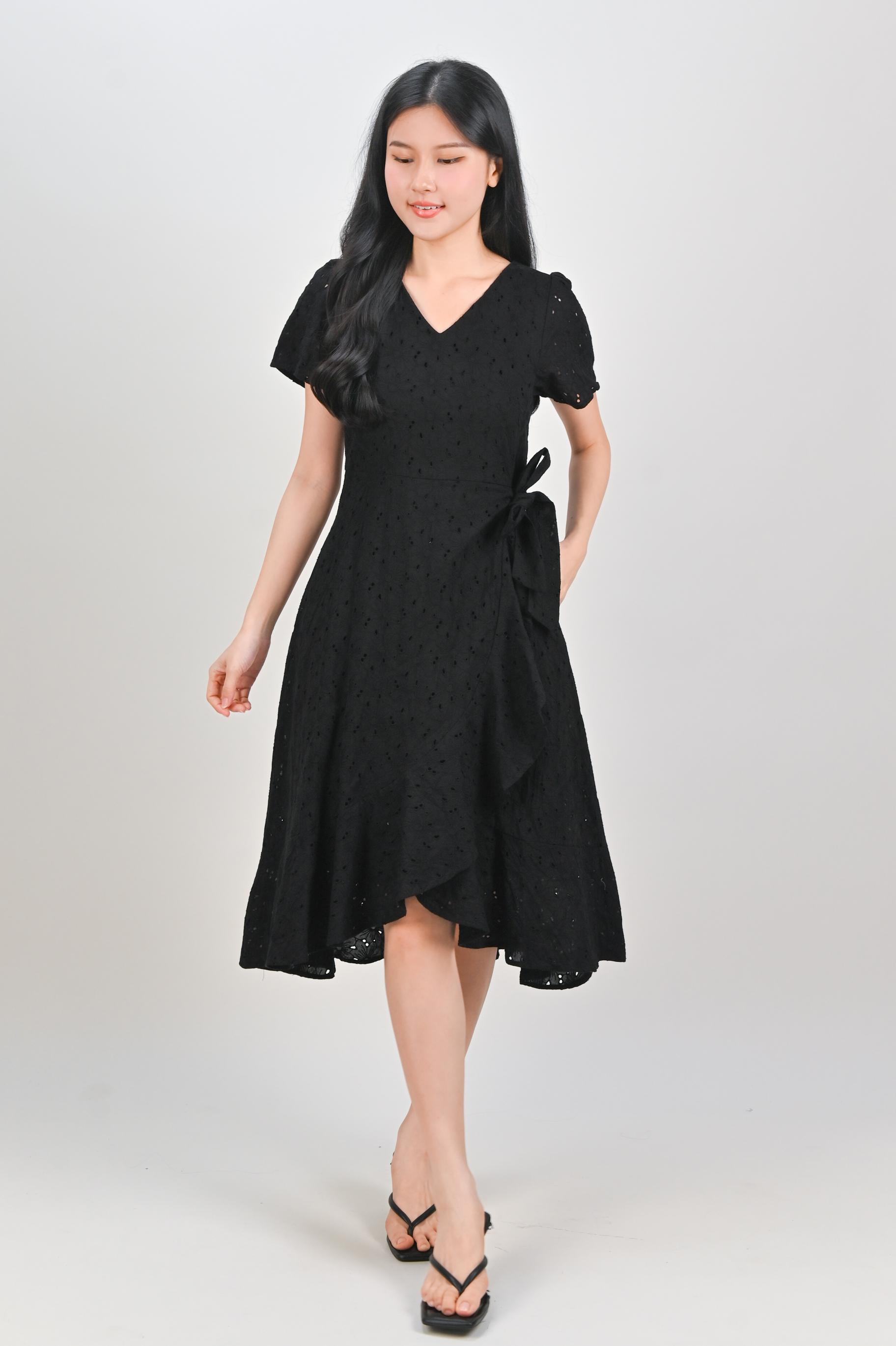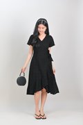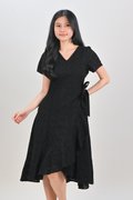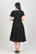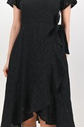 KIRRA EYELET SLEEVED RUFFLE DRESS IN BLACK