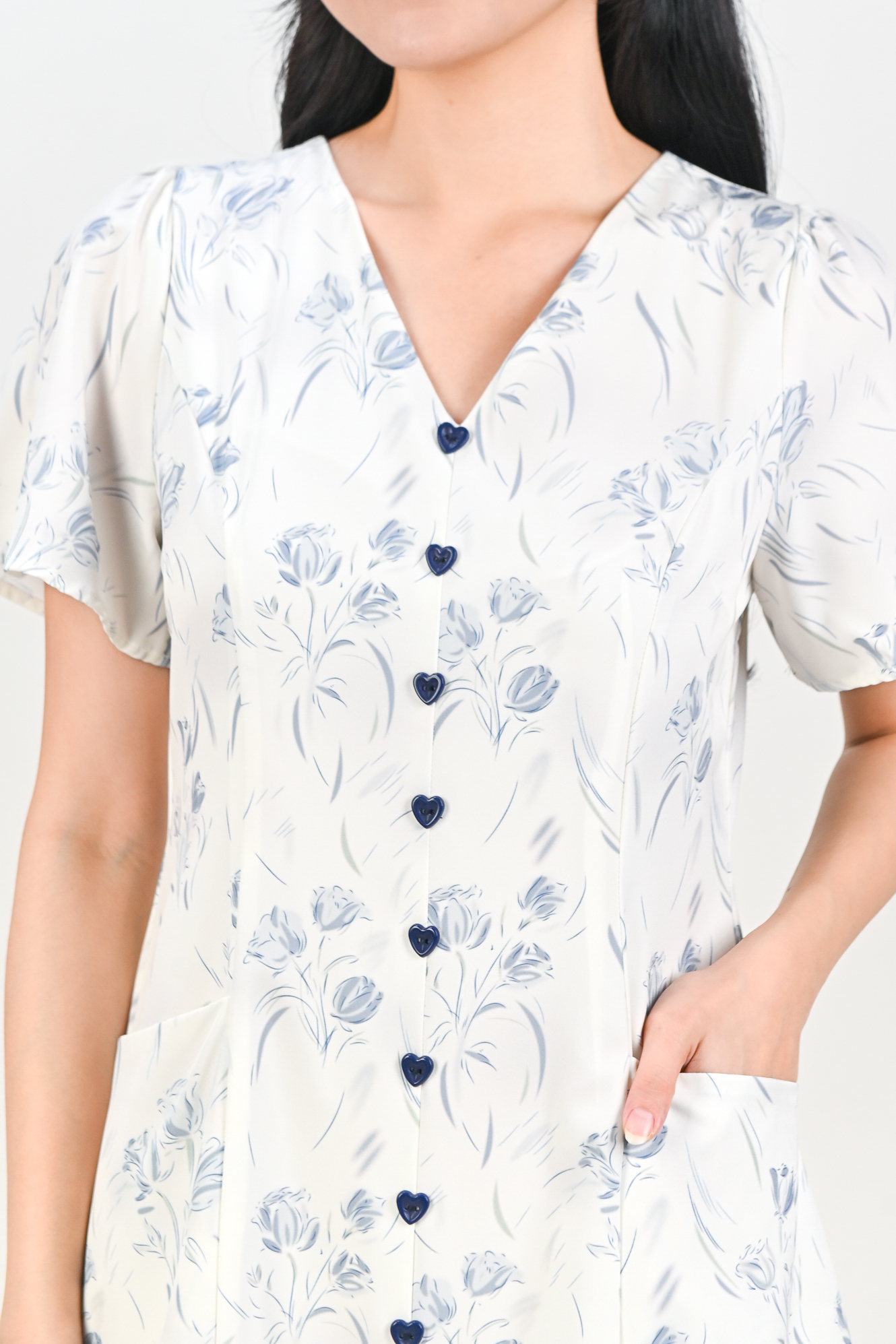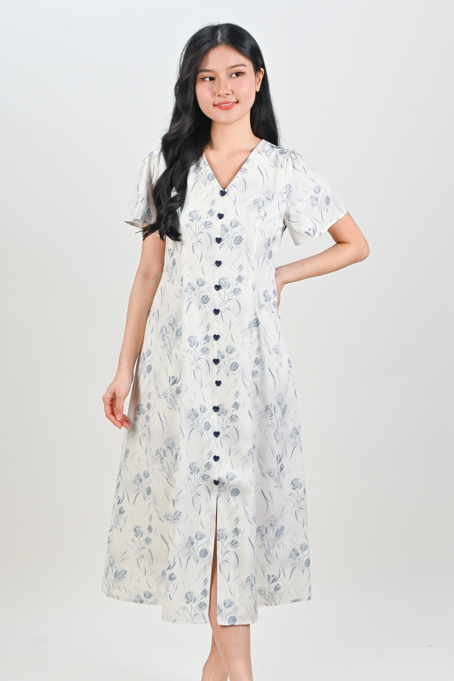 Actual stocks may varyTiny heart buttons, soft abstract print and a flattering midi shape 💗🌸