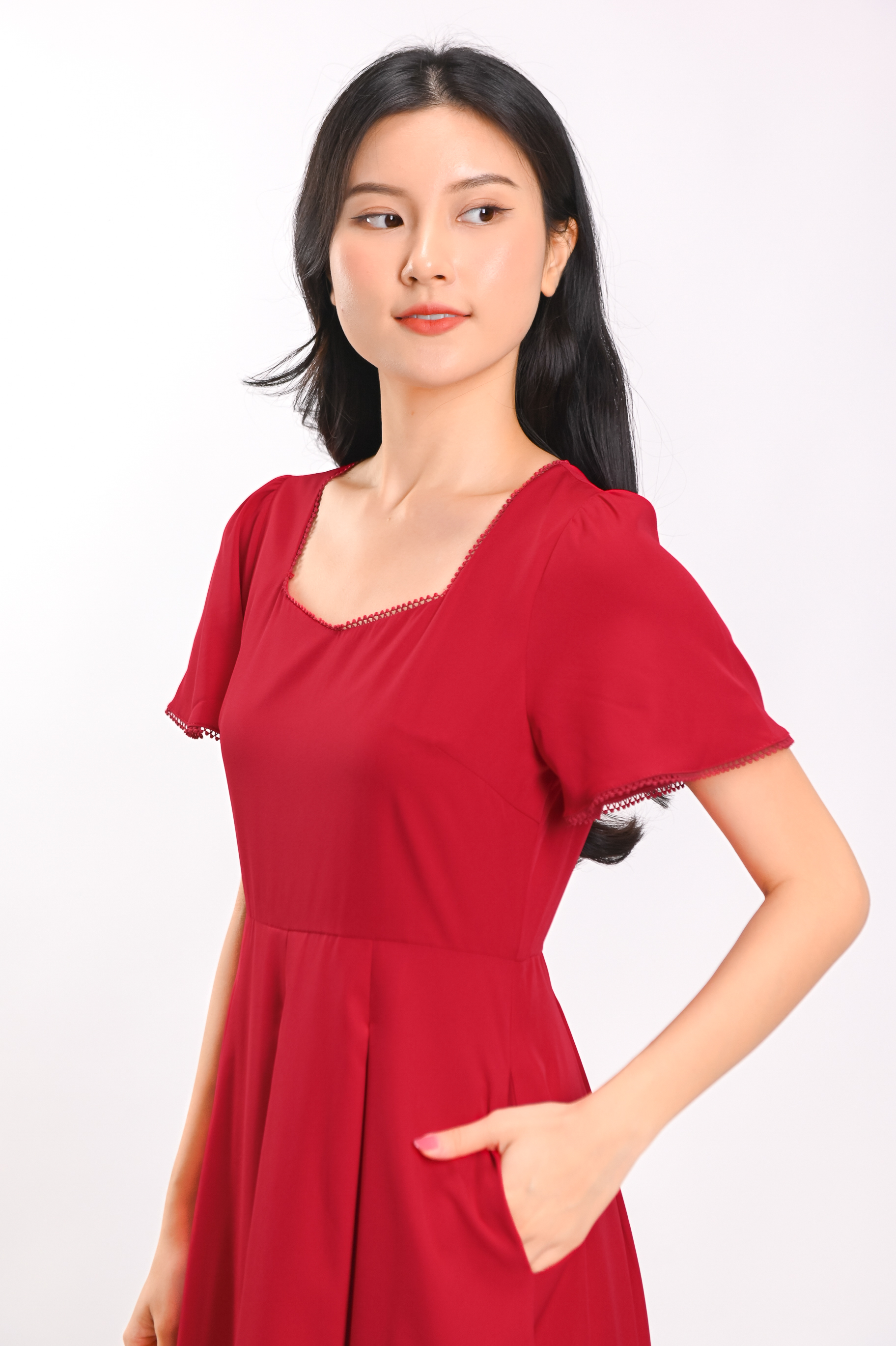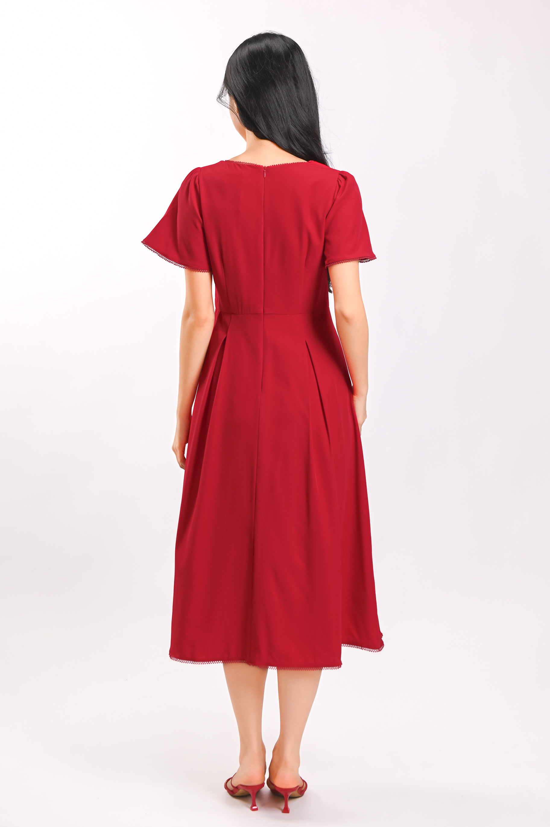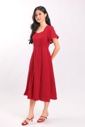 LAUREN TRIMMING SLEEVED MIDI DRESS IN RED