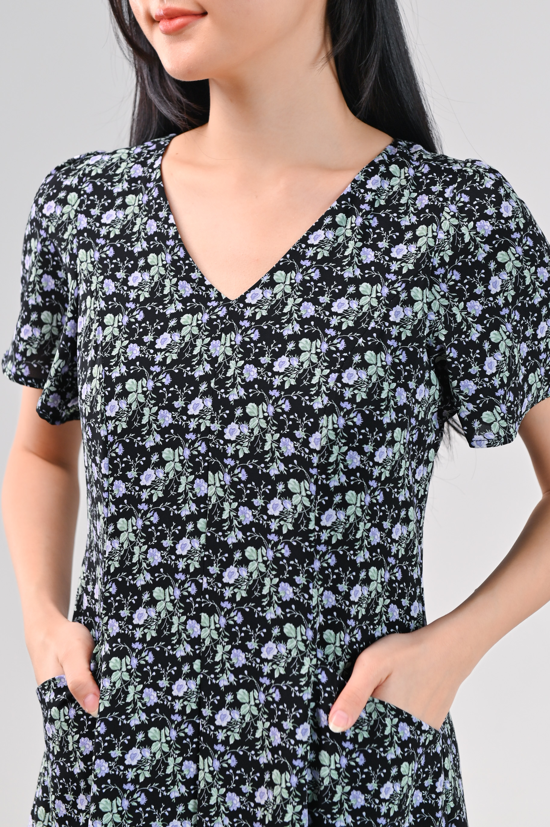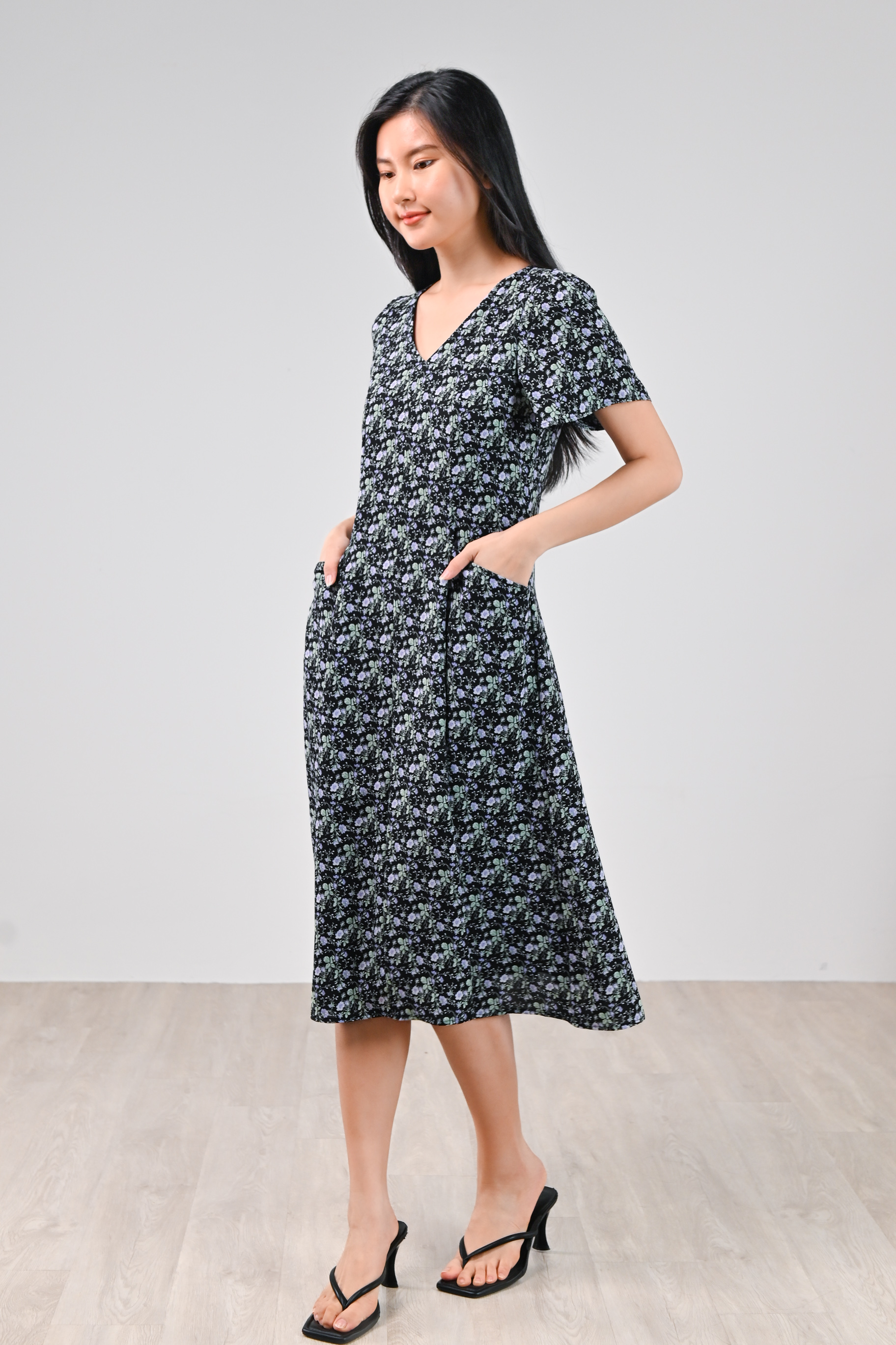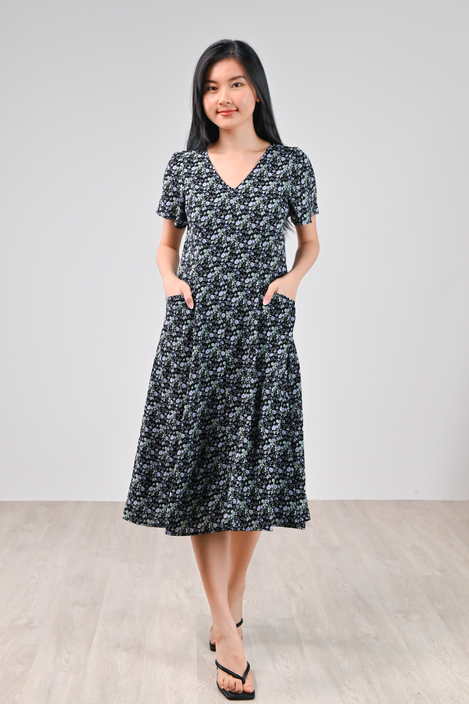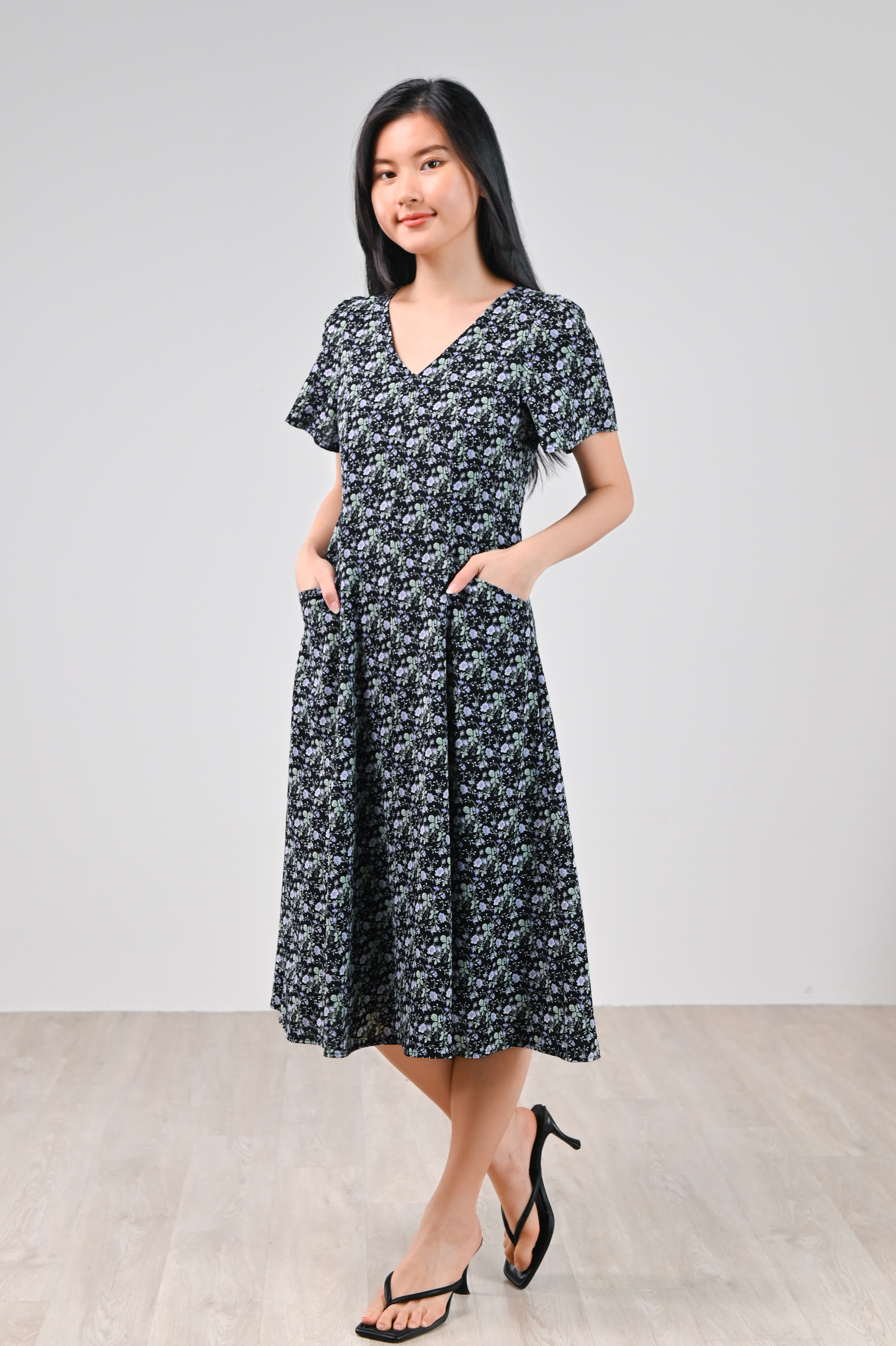 LAVENIA BLACK FLORAL PANEL POCKET MIDI DRESS