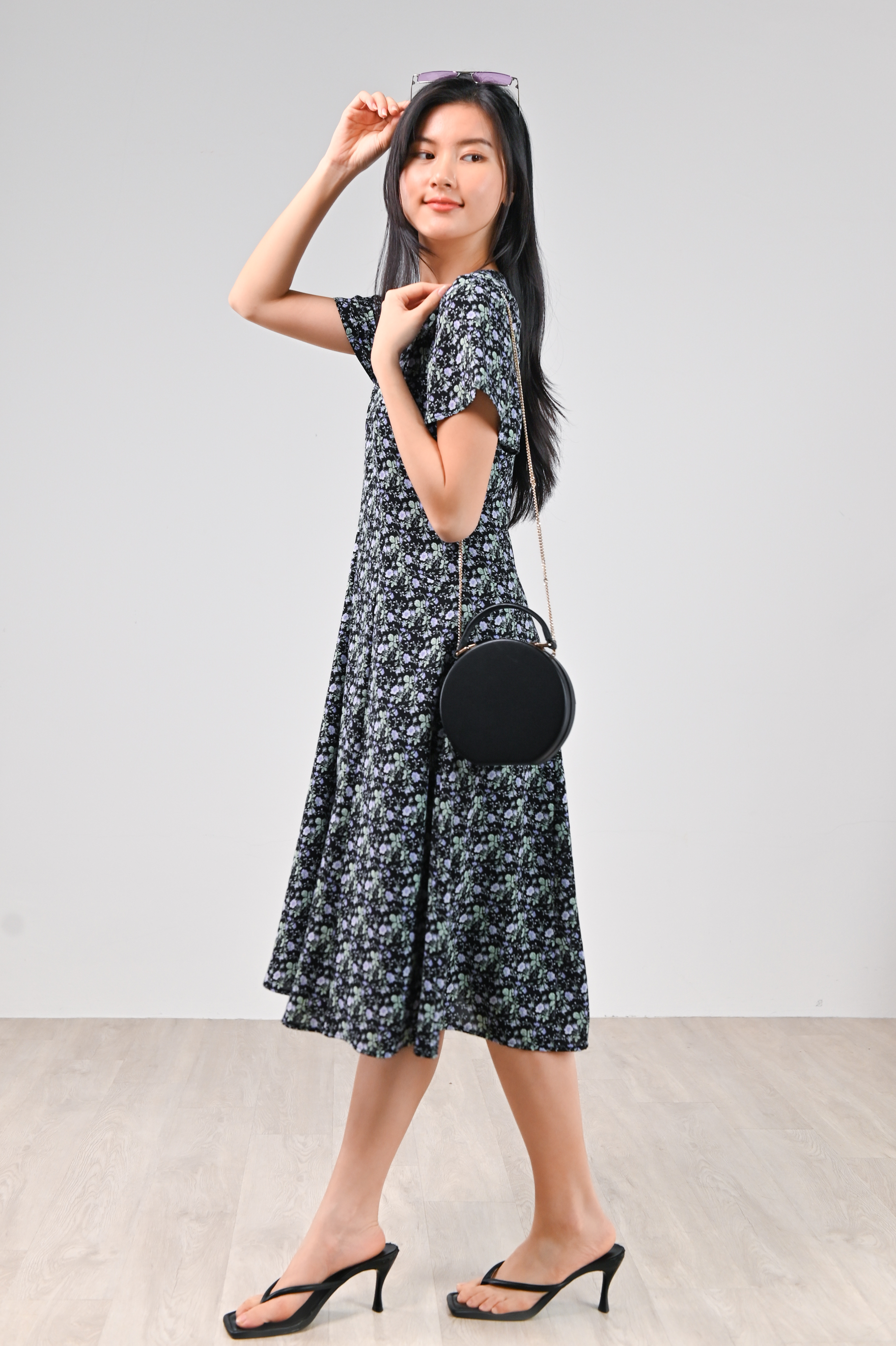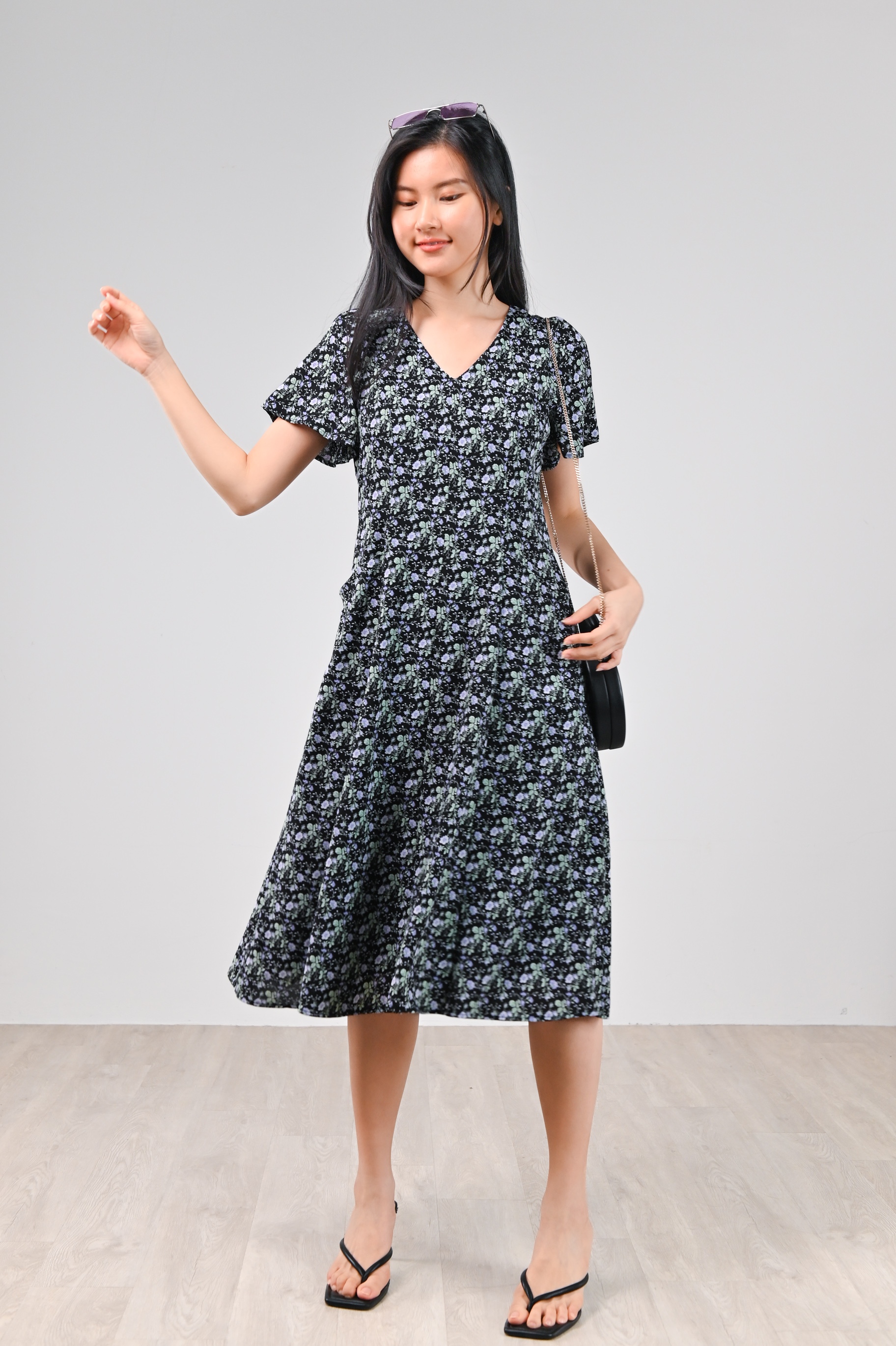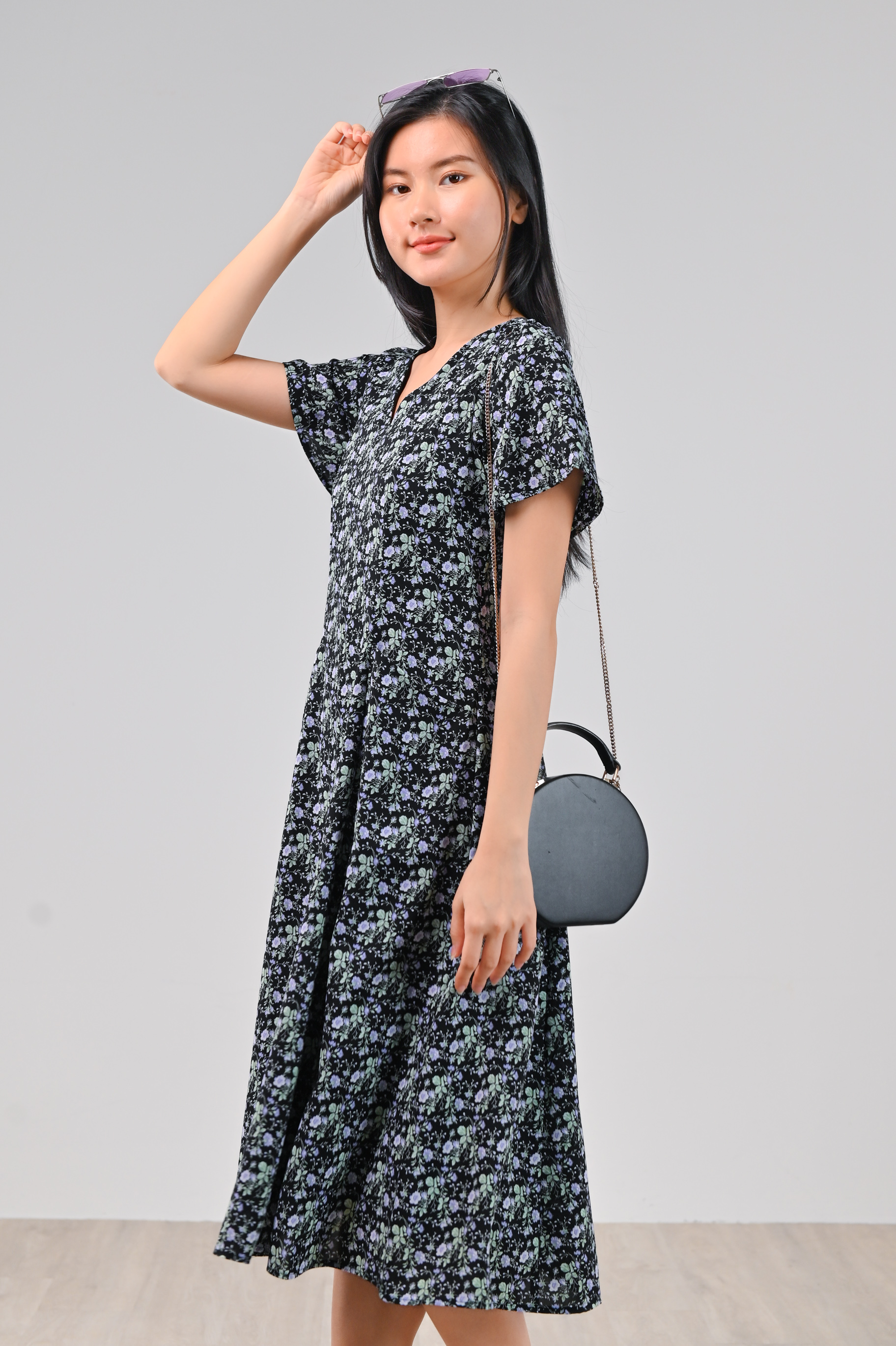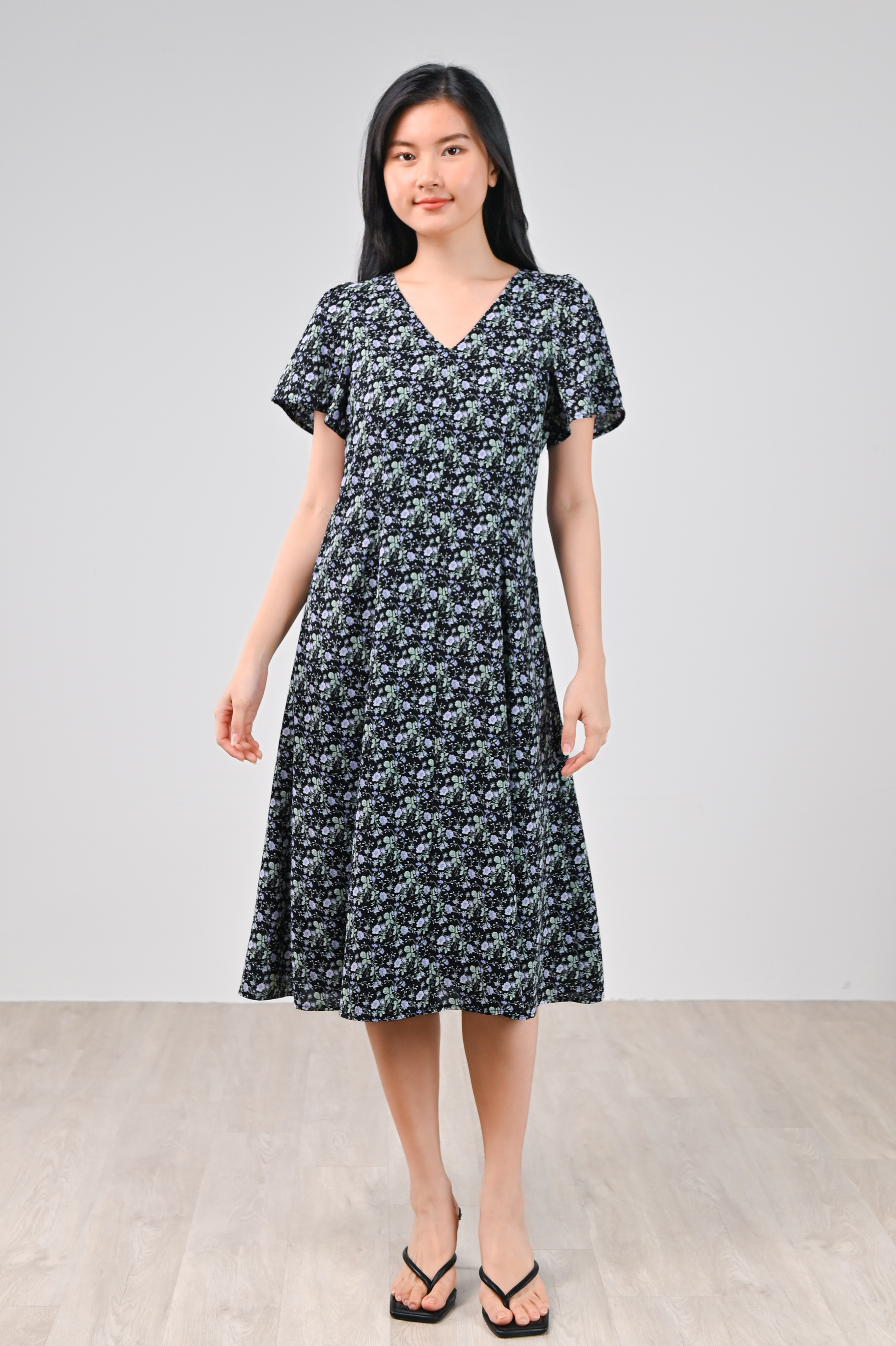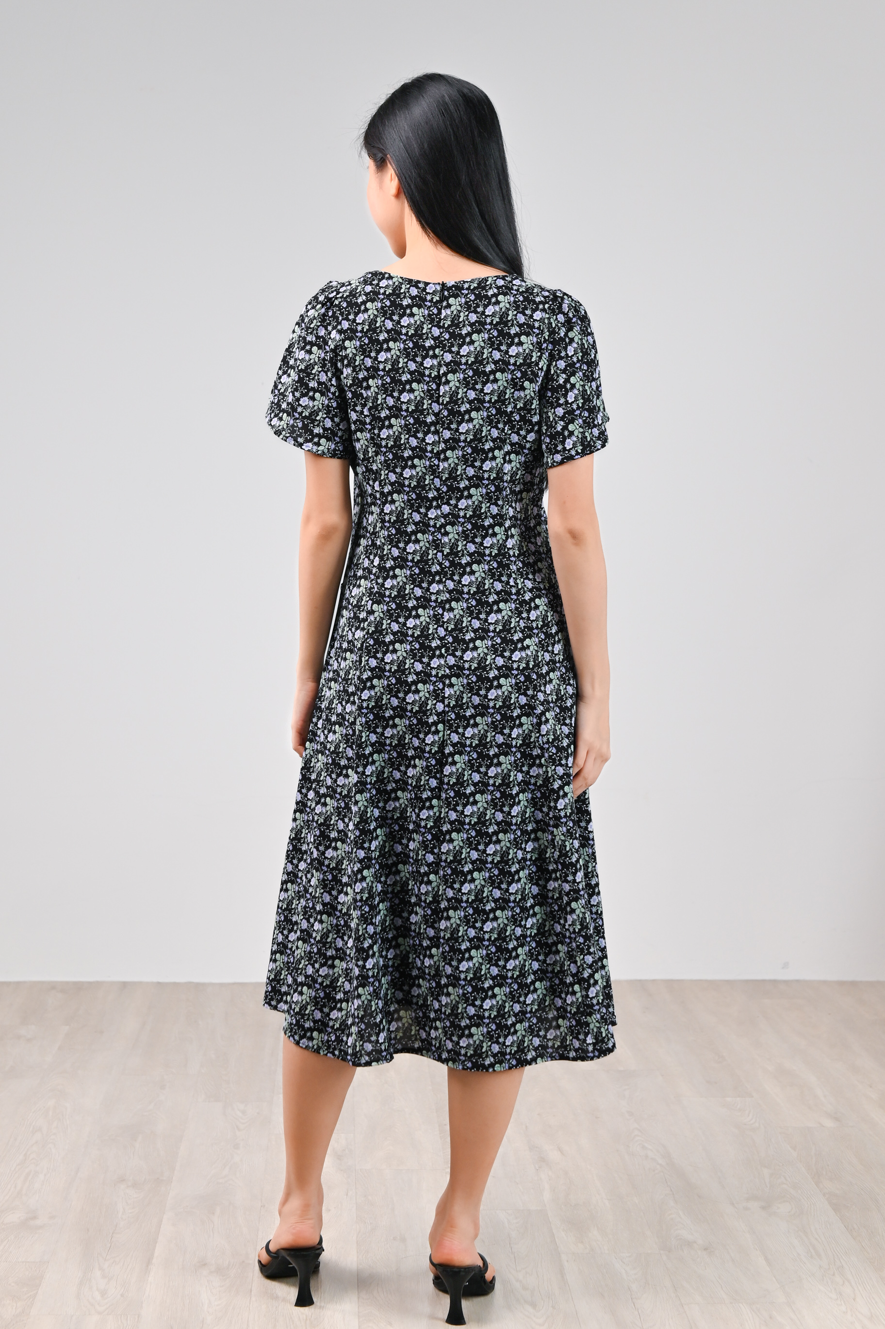 LAVENIA BLACK FLORAL PANEL POCKET MIDI DRESS