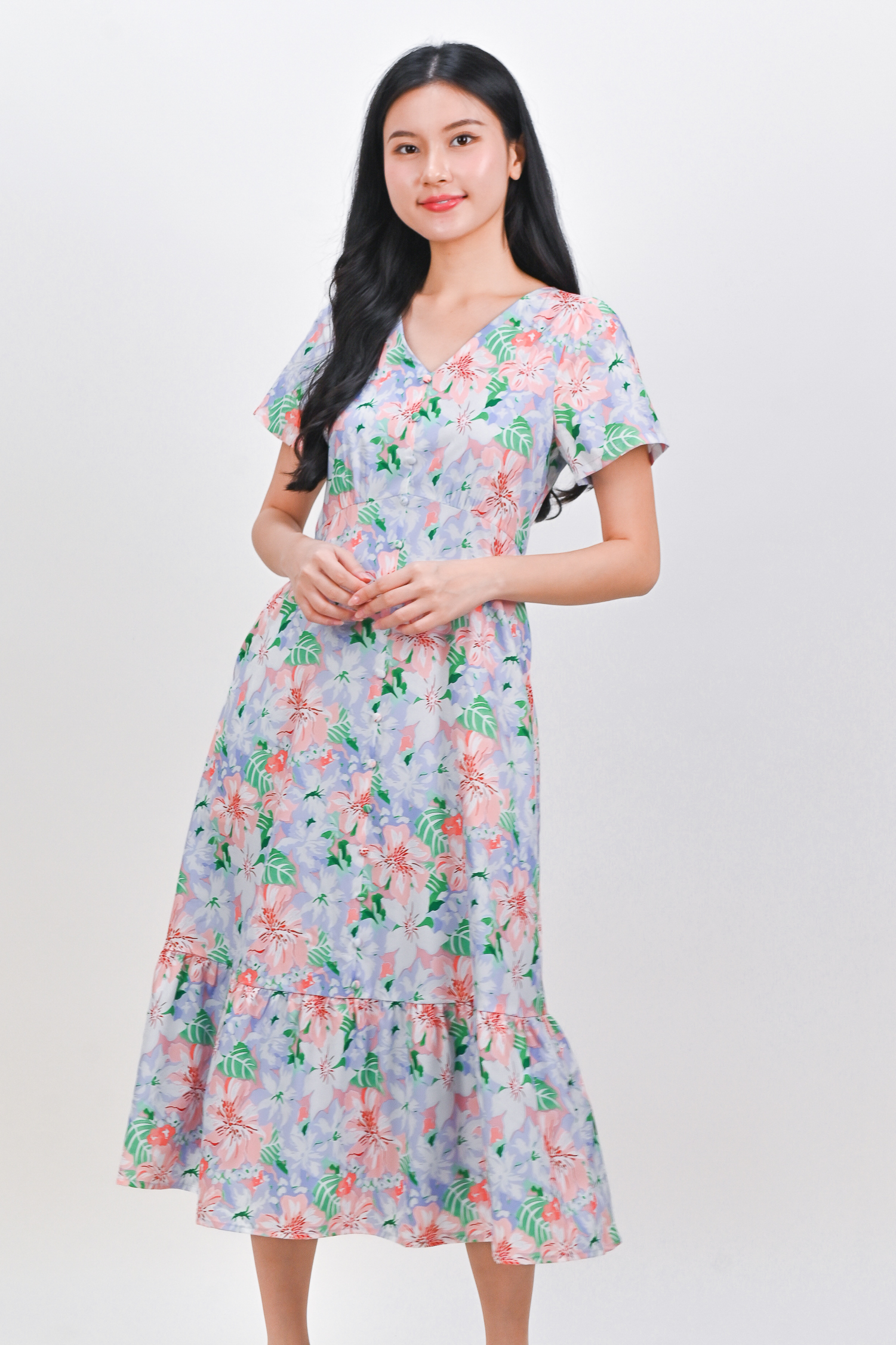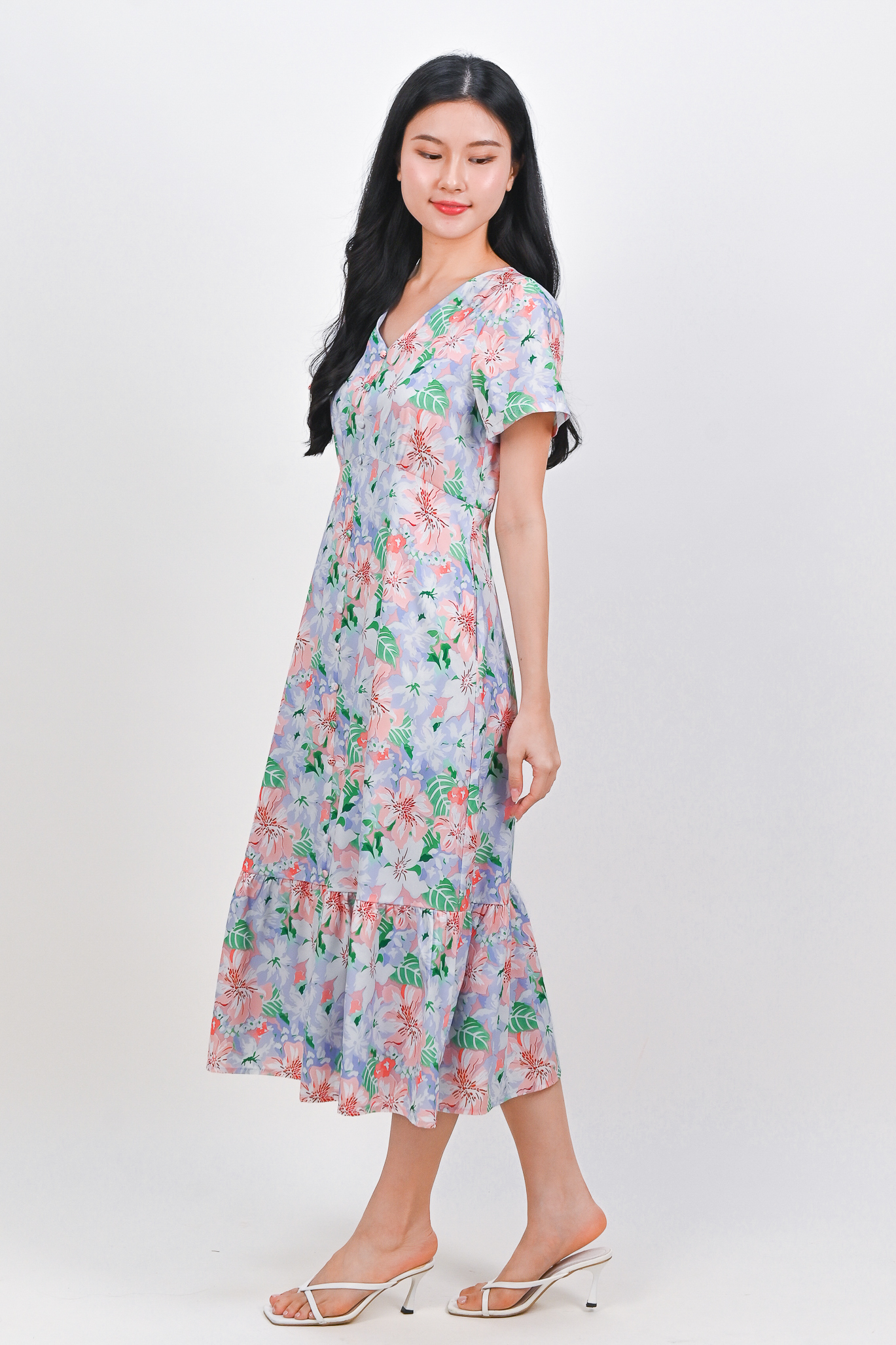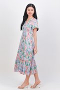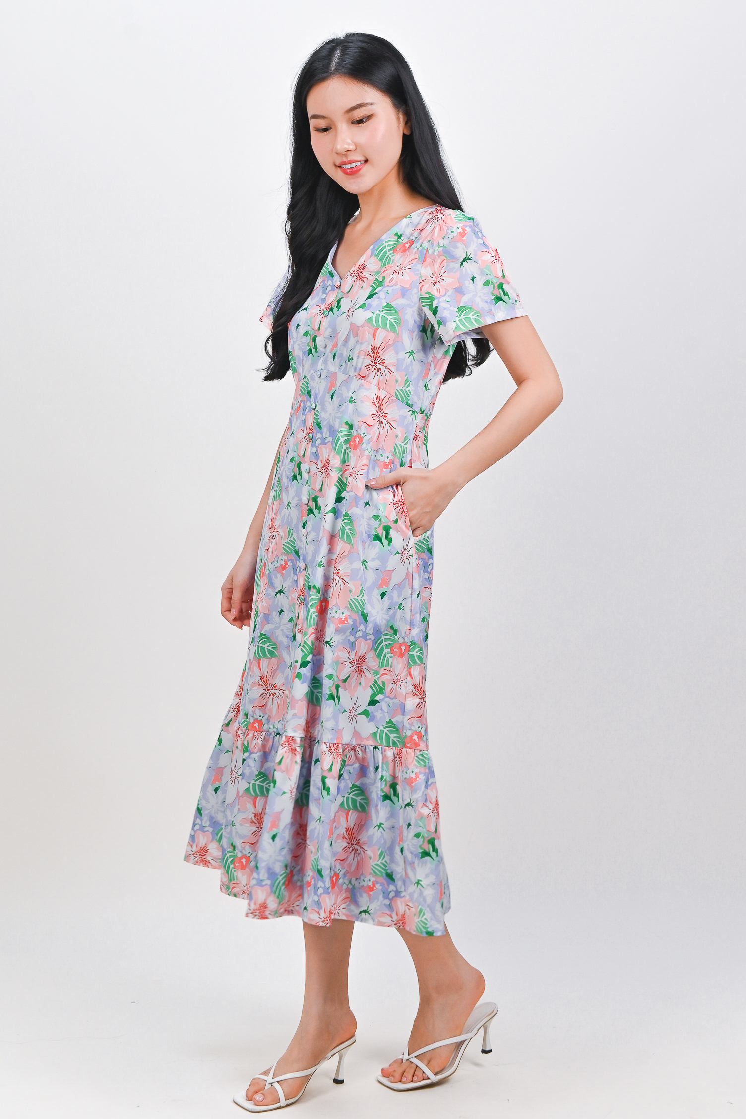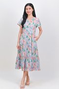 LEOCADIA SLEEVED BUTTON MIDI DRESS IN LILAC FLORAL