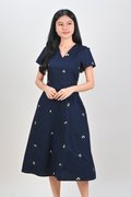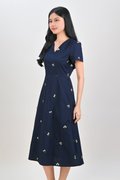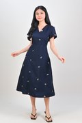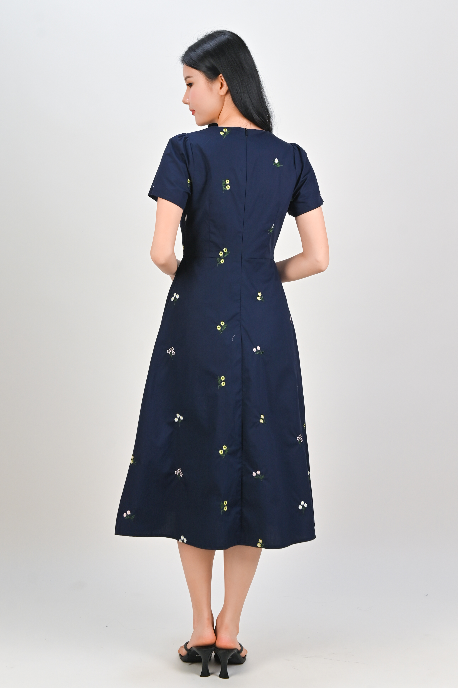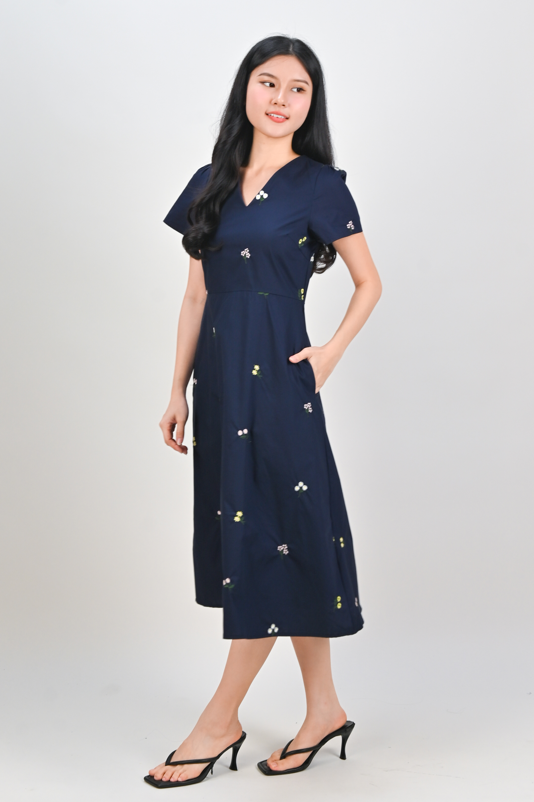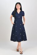 LINARA NAVY EMBROIDERED SLEEVED MIDI DRESS