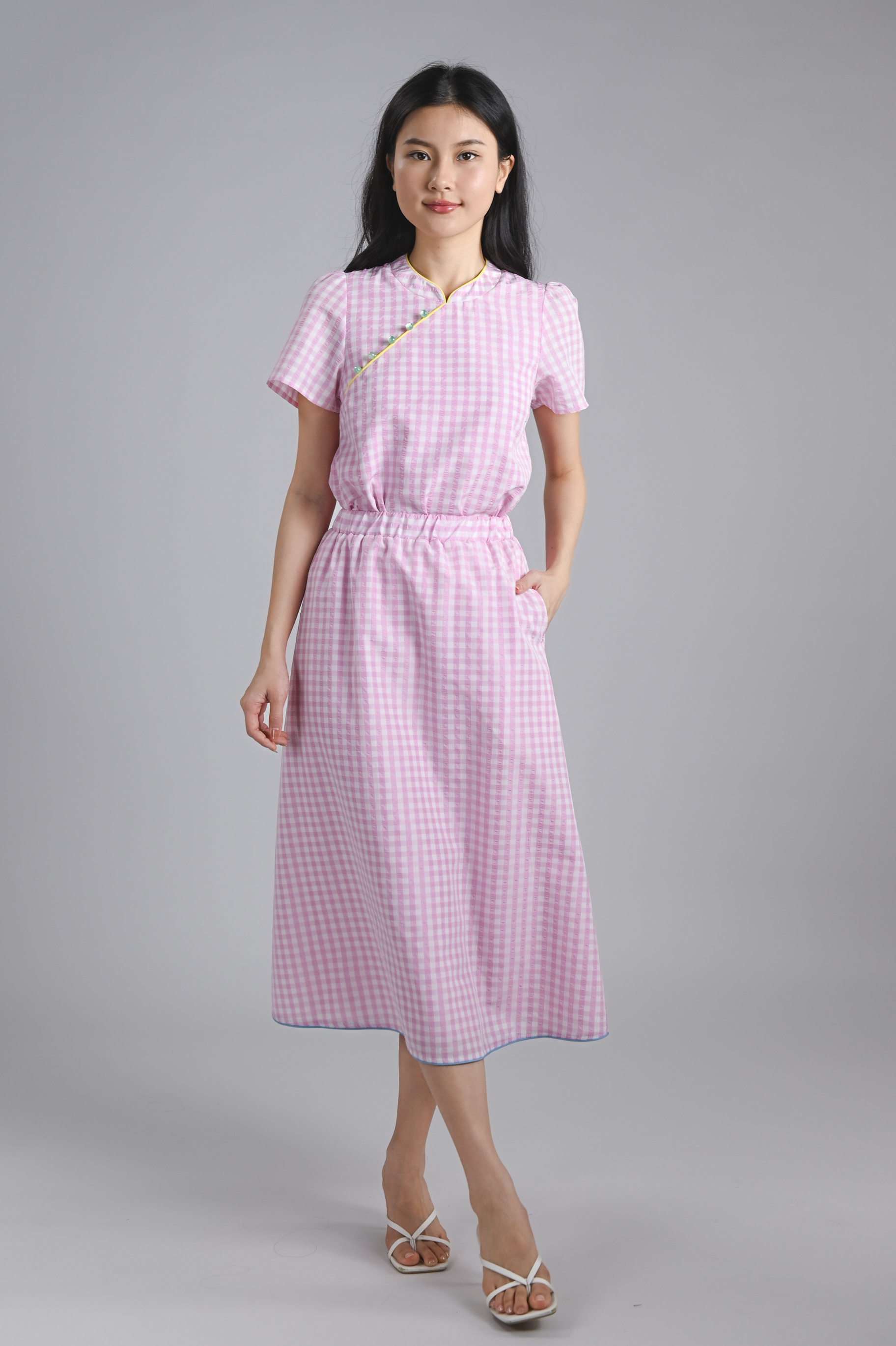 - PLEASE NOTE: THE GINGHAM TOP FEATURED IN SOME PHOTOS HERE IS NOT OUR FINAL HATTIE GINGHAM CHEONGSAM TOP - THE COLOURS OF THE PIPING AND BUTTONS ARE DIFFERENT FROM OUR HATTIE TOP.