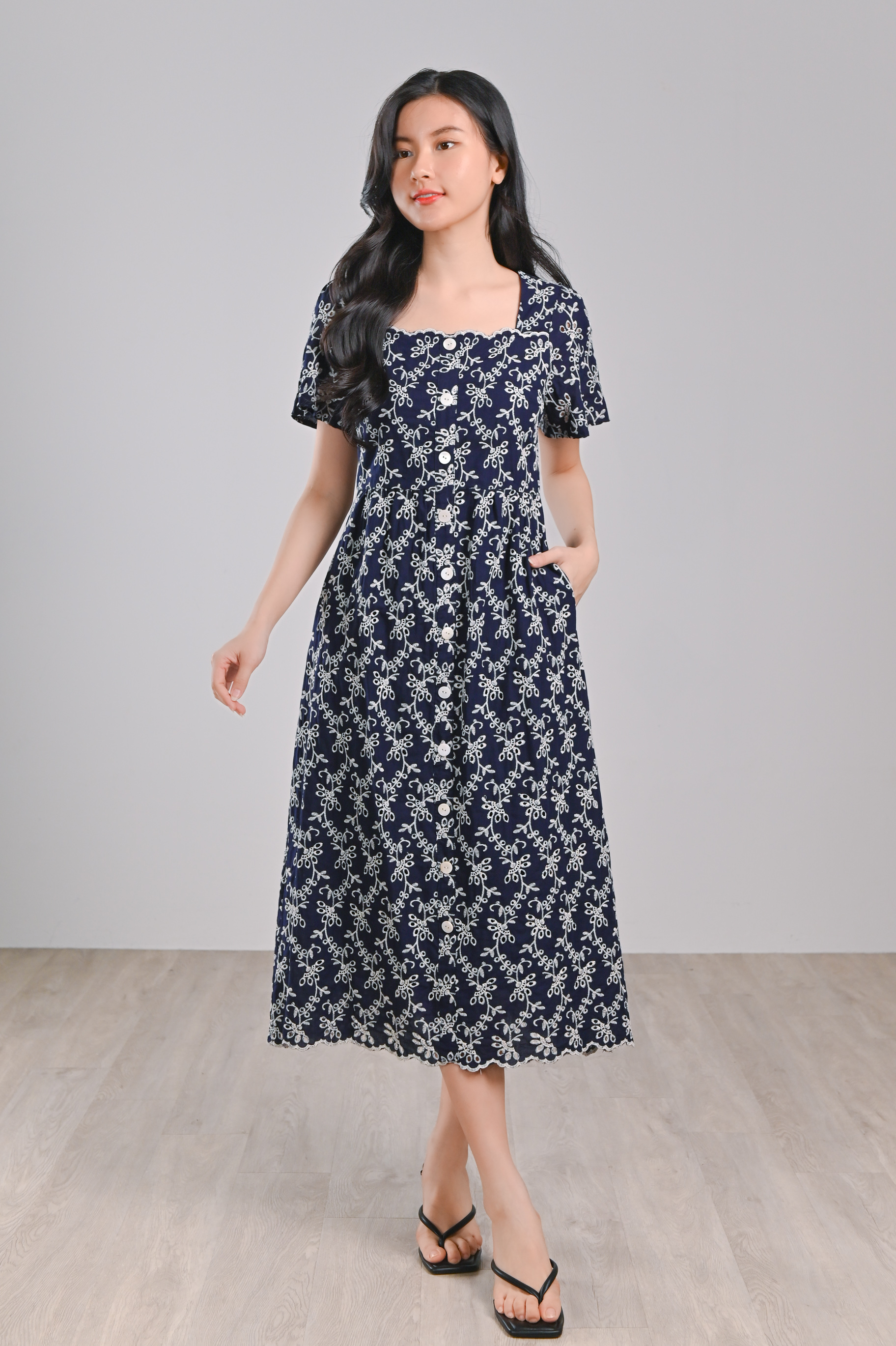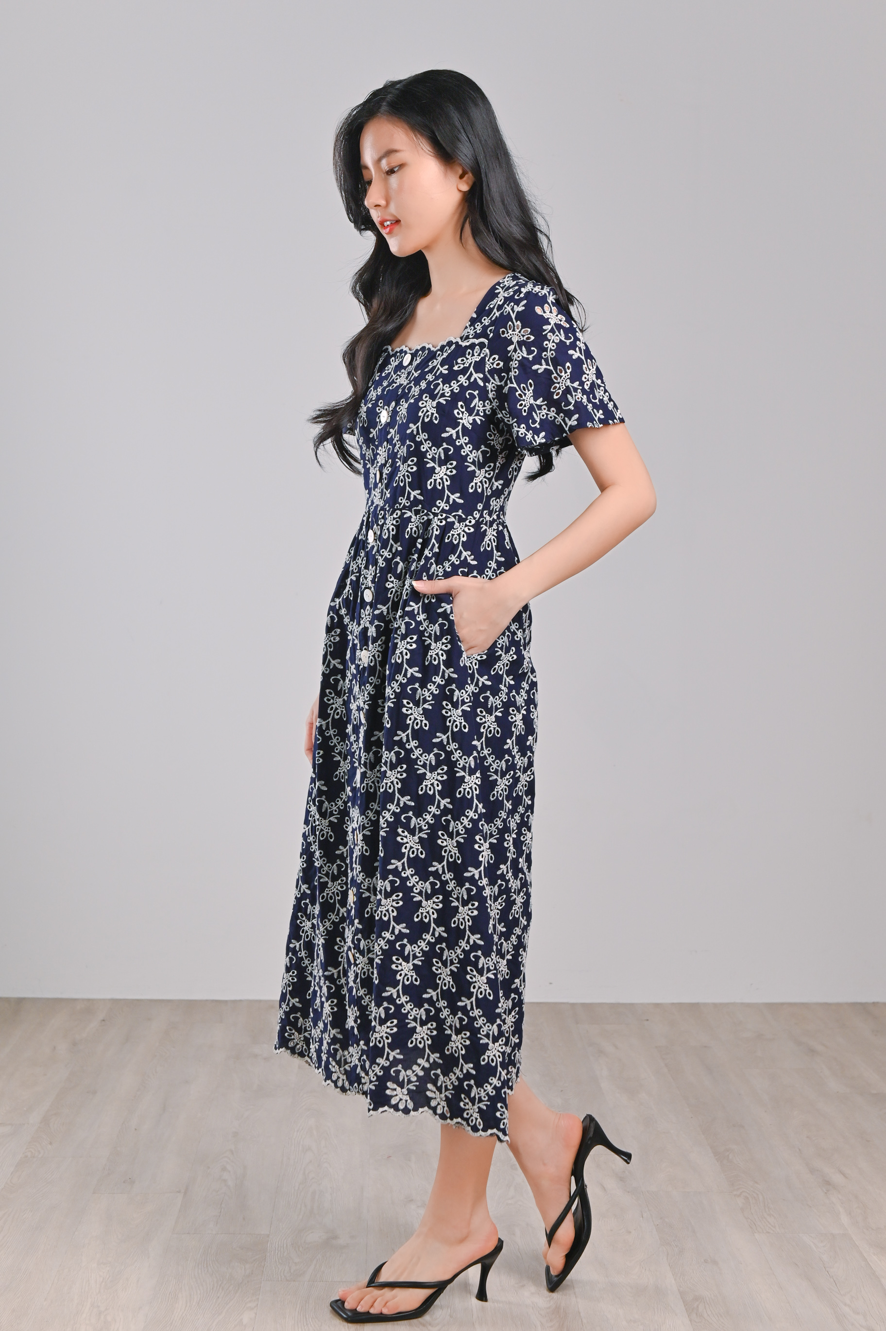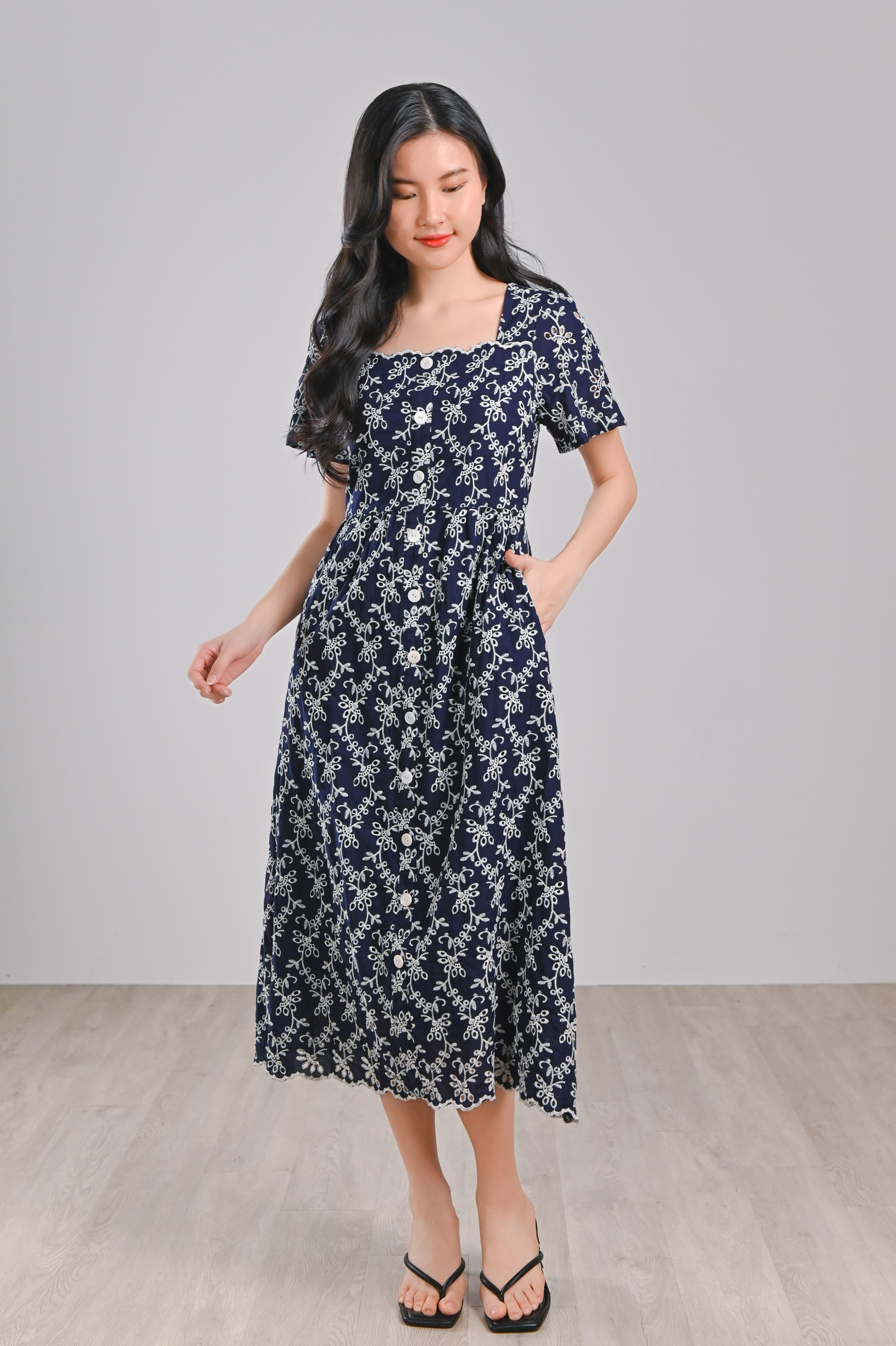 LOVYSE NAVY EYELET MIDI DRESS