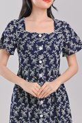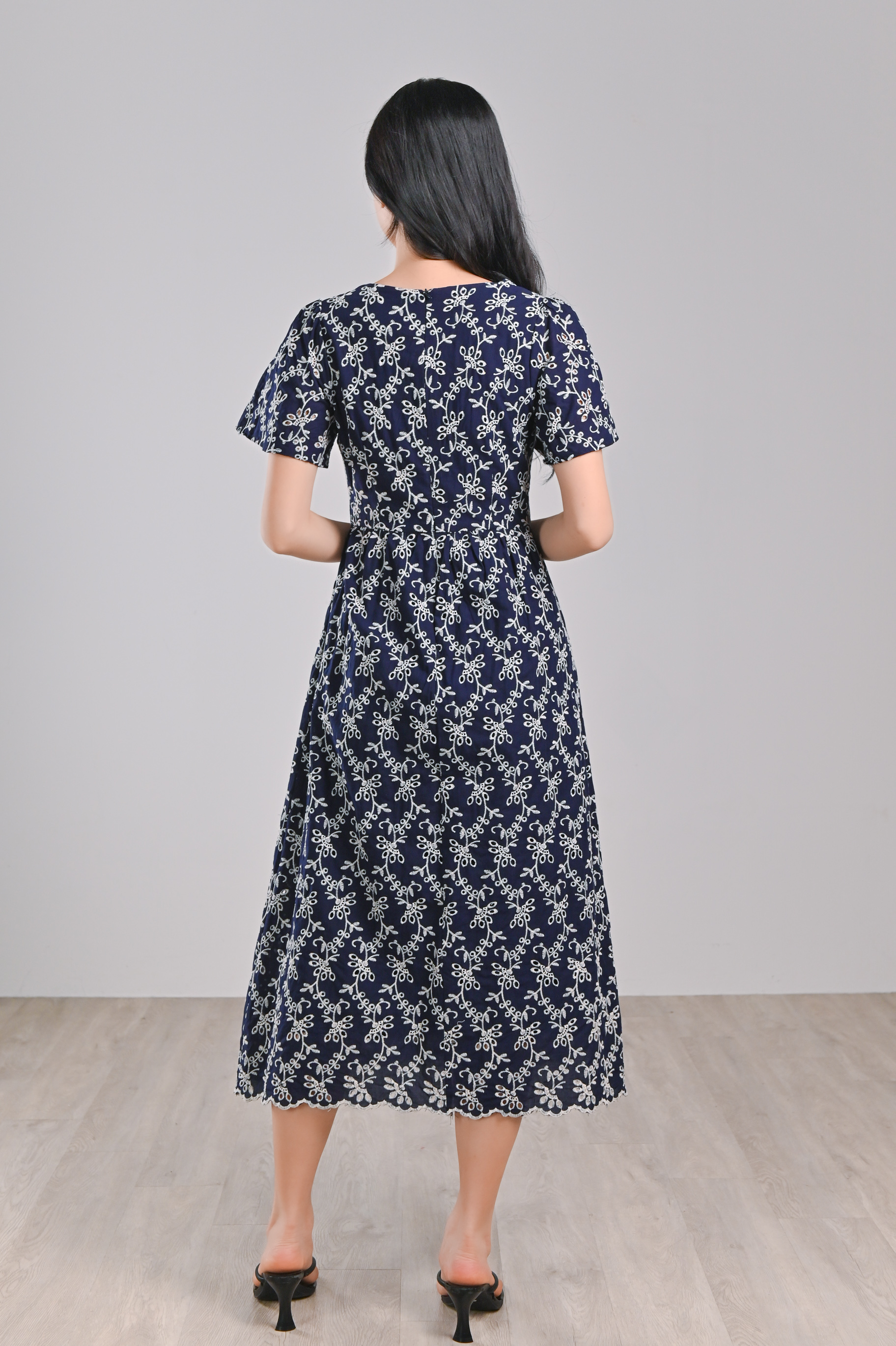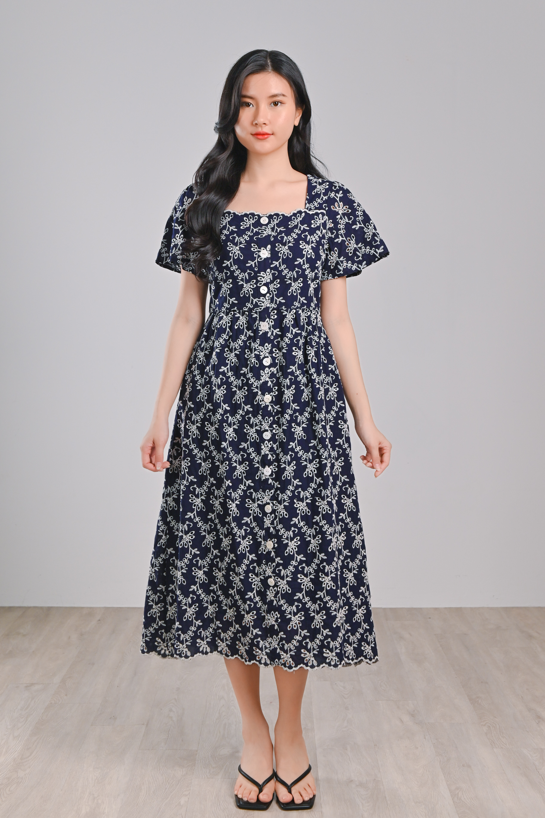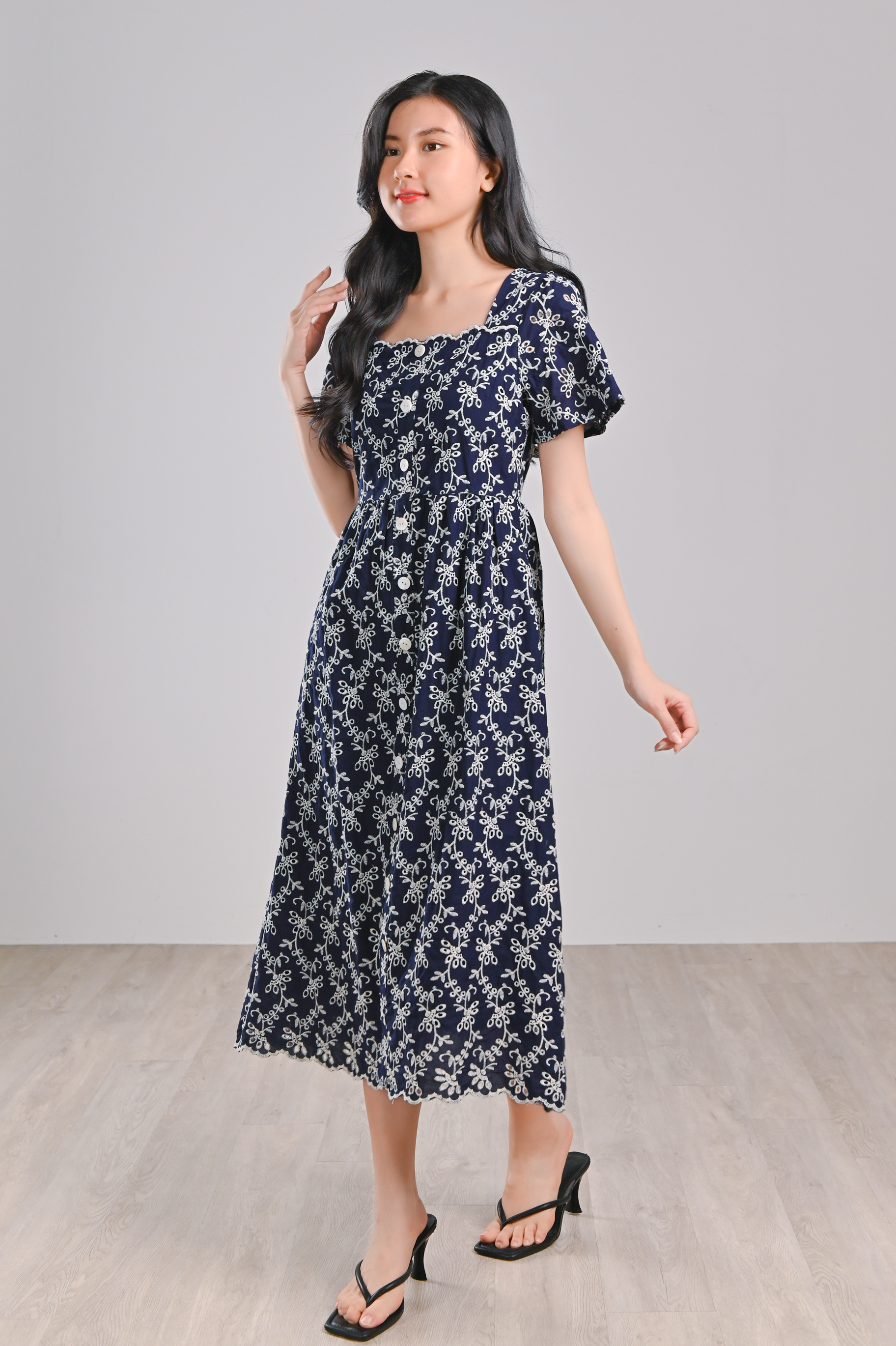 LOVYSE NAVY EYELET MIDI DRESS