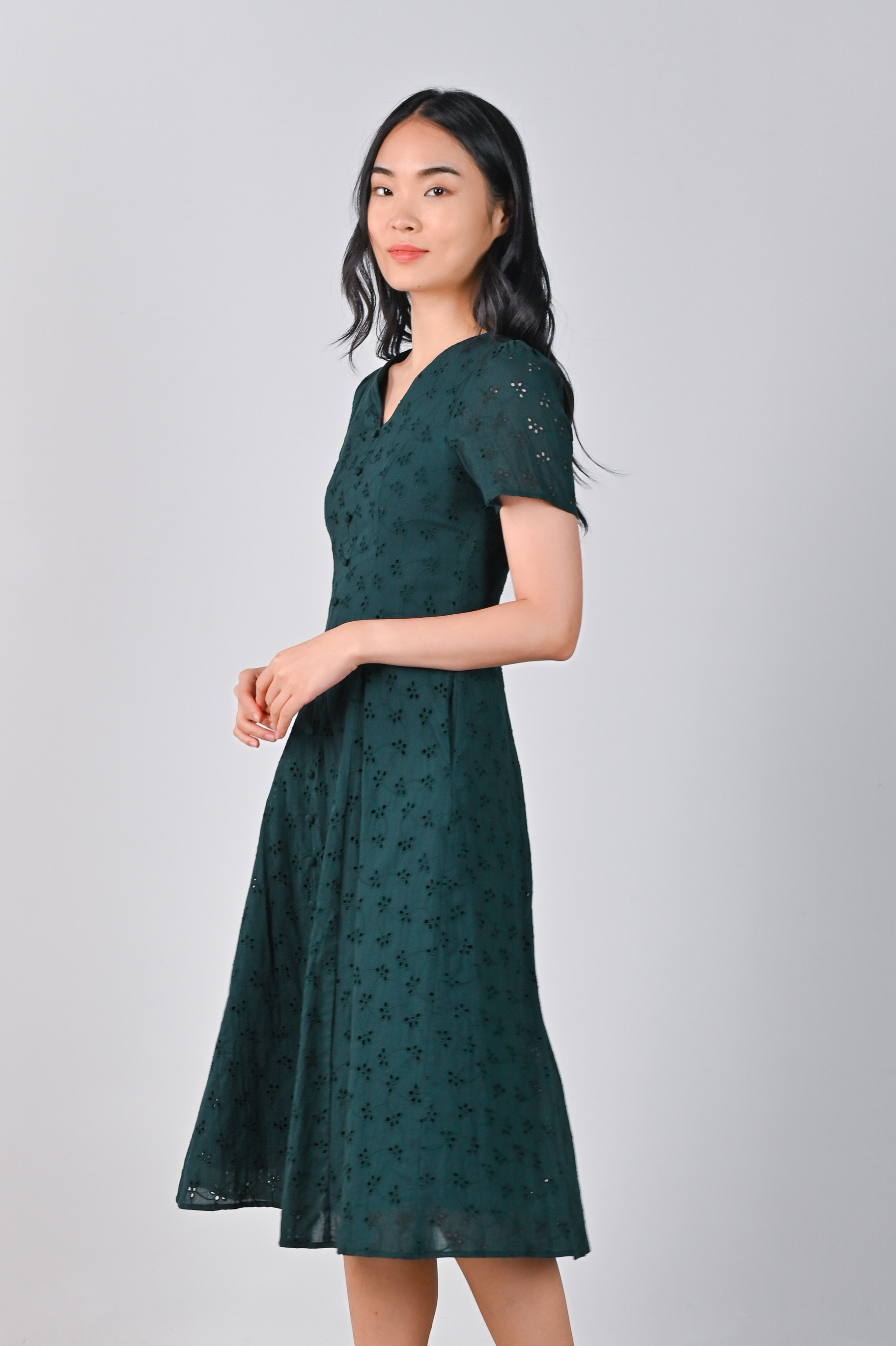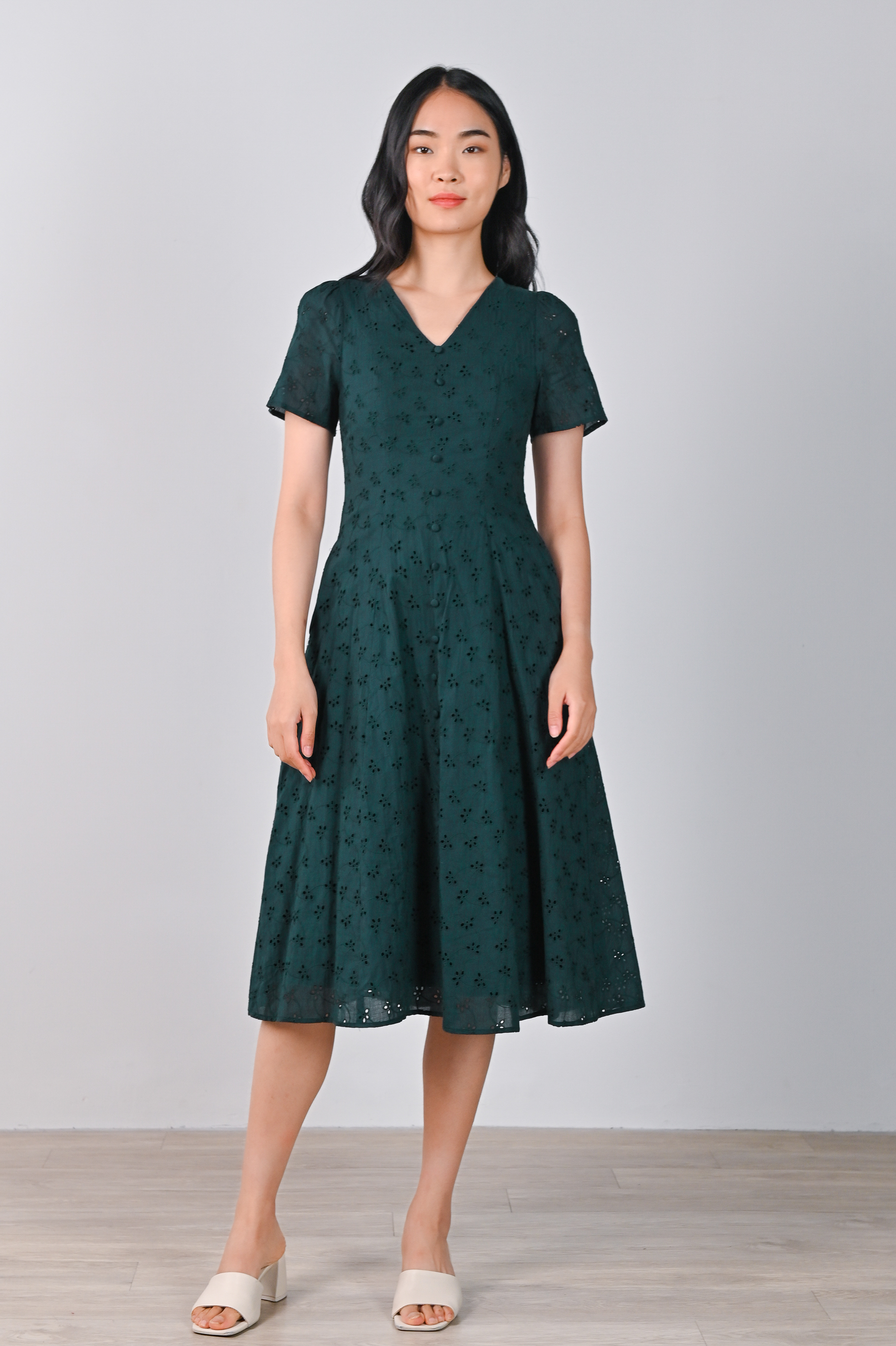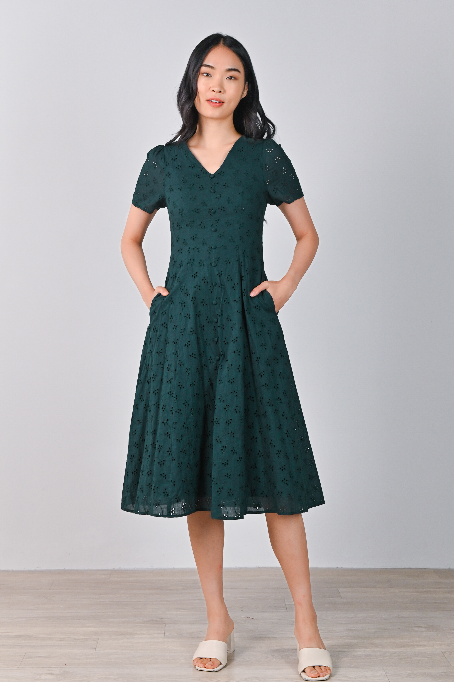 LUNARIA EYELET SLEEVED BUTTON DRESS IN FOREST