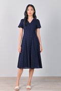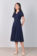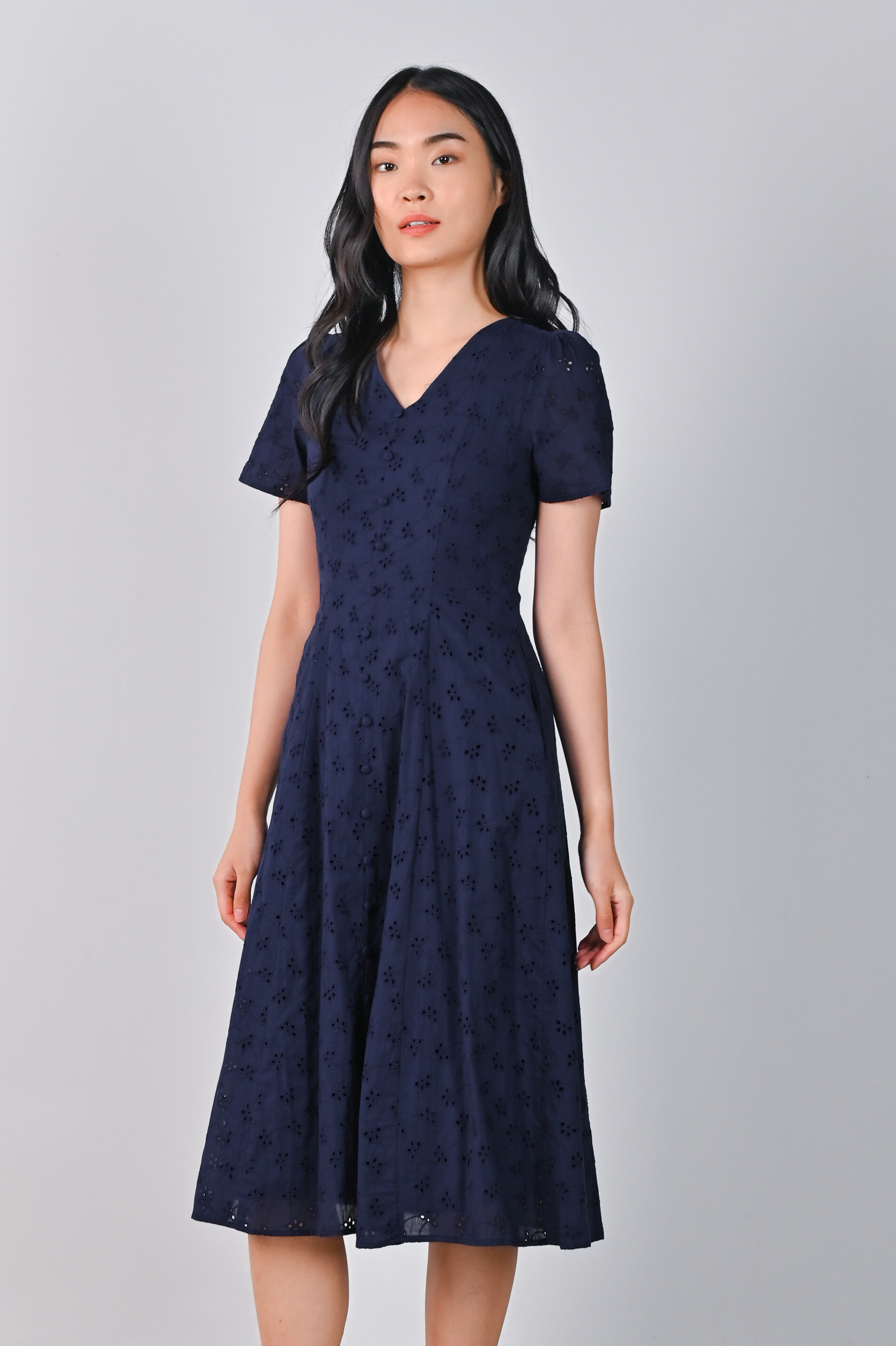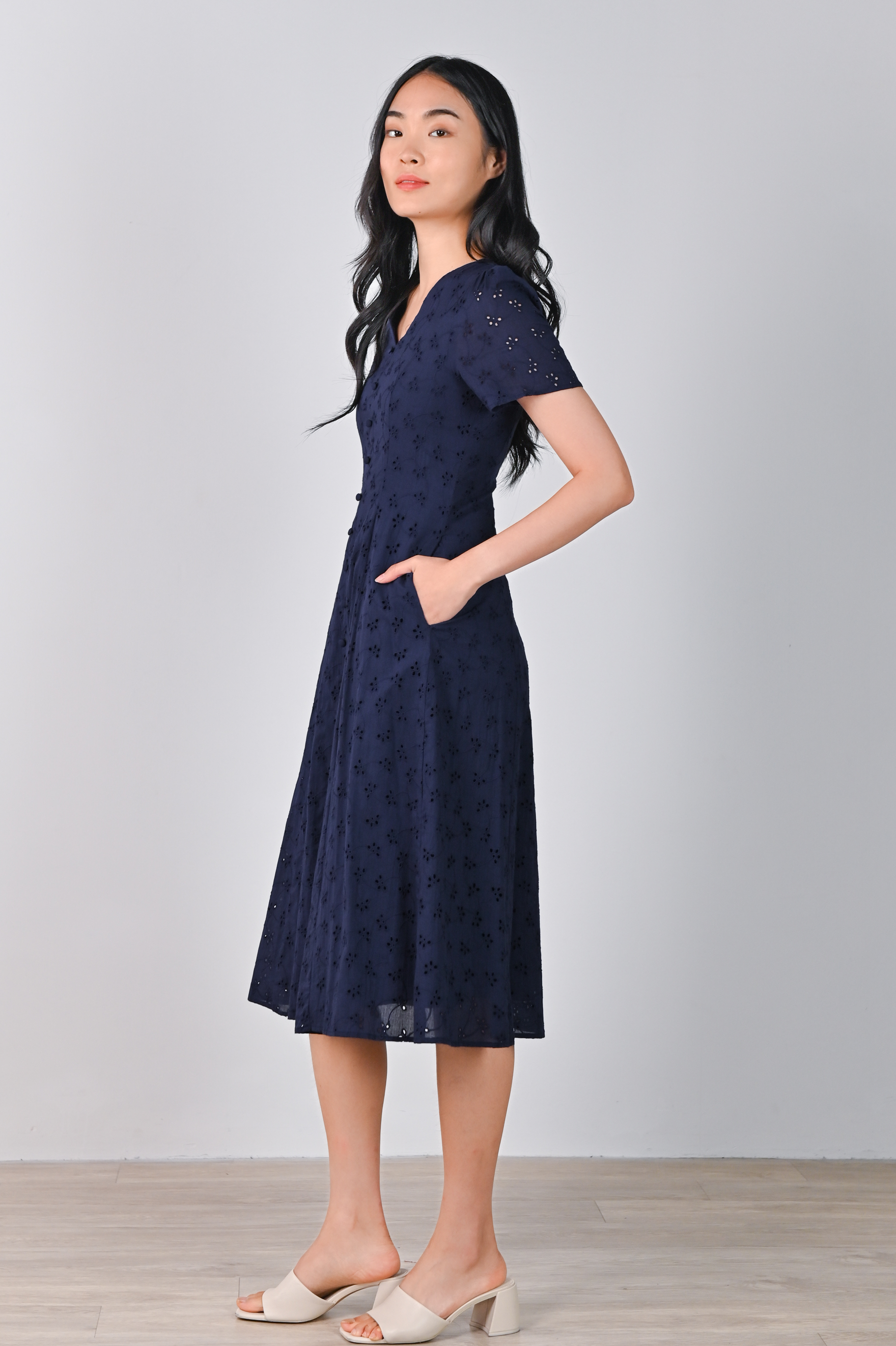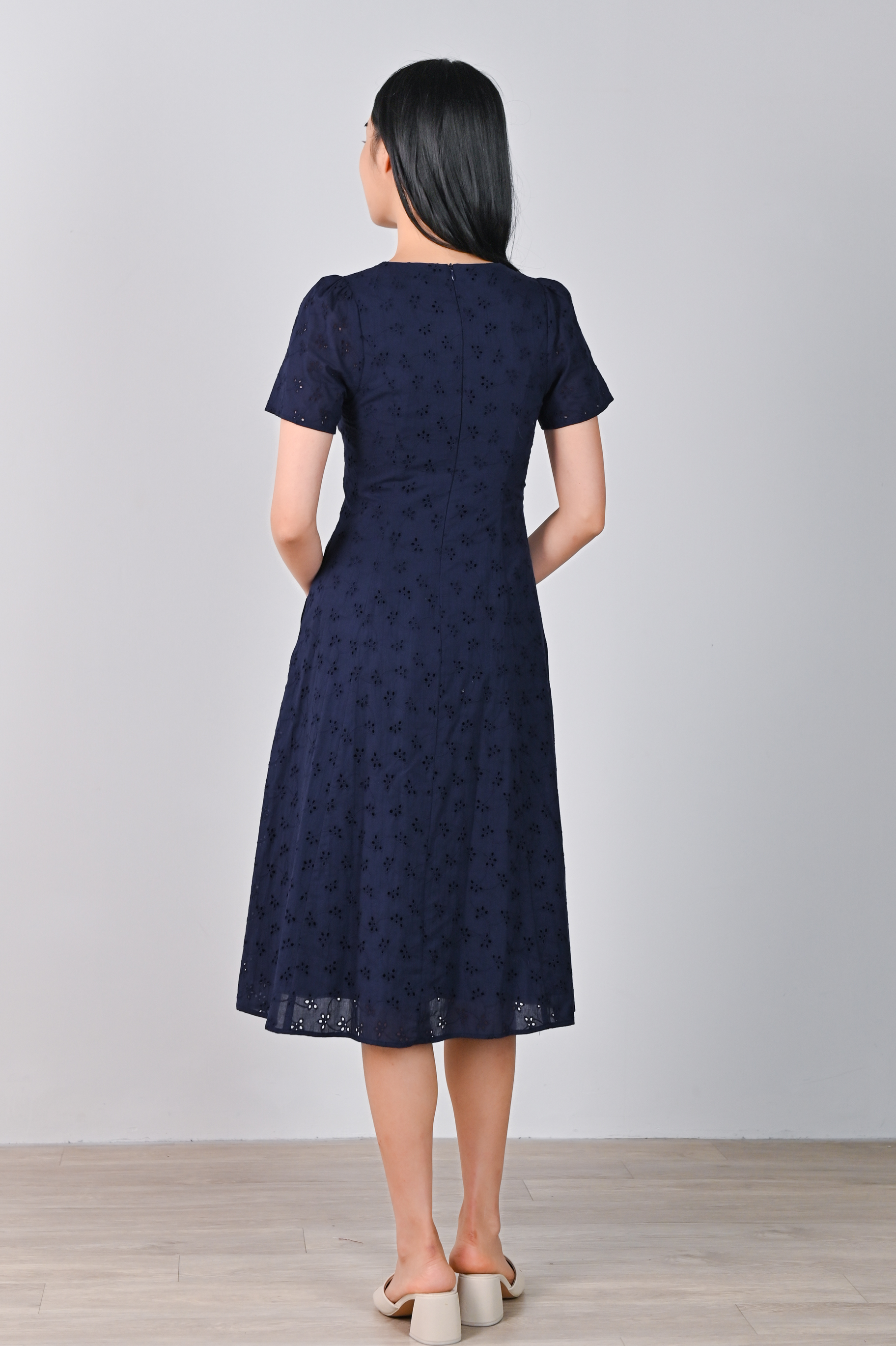 LUNARIA EYELET SLEEVED BUTTON DRESS IN NAVY