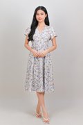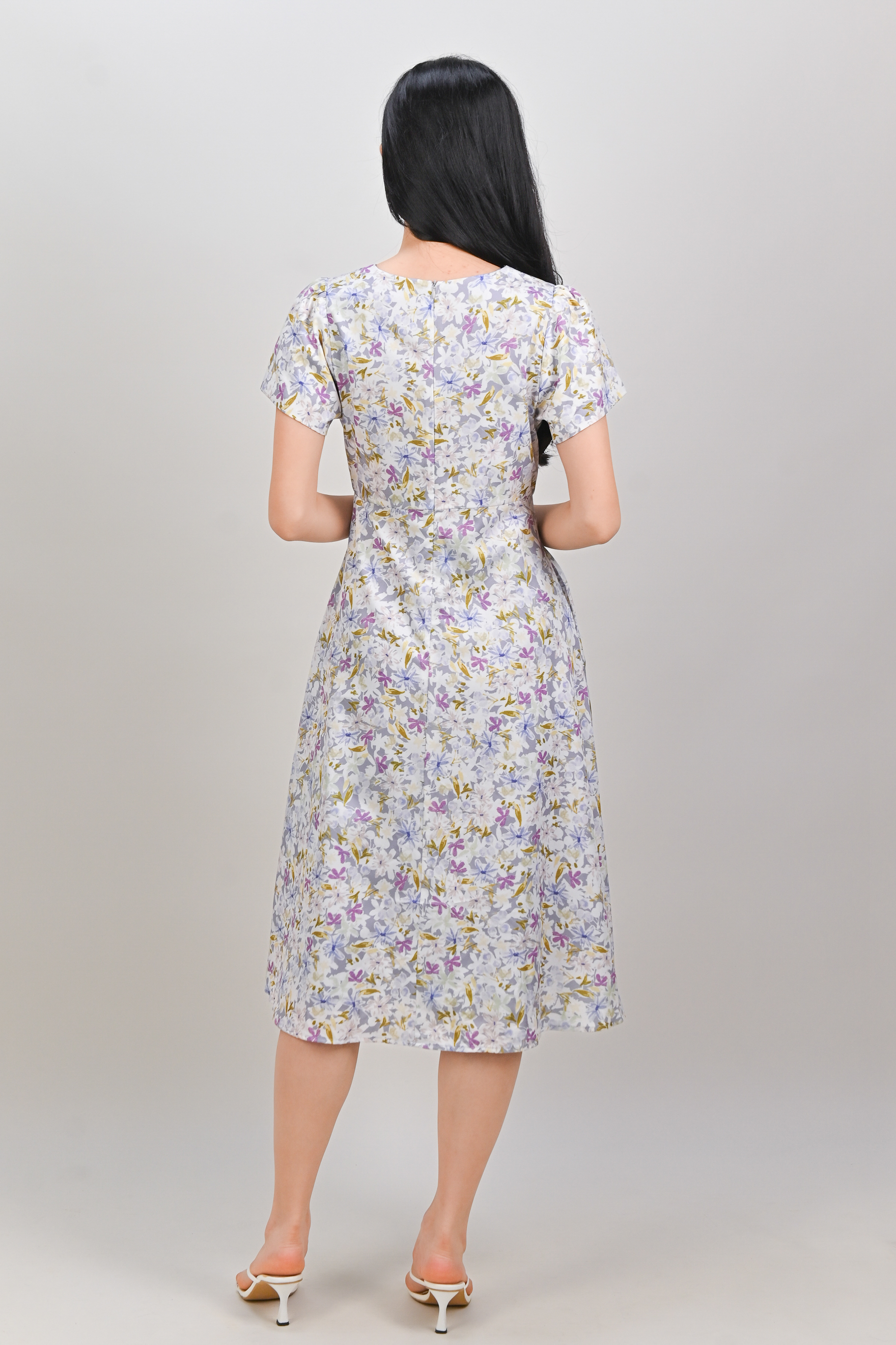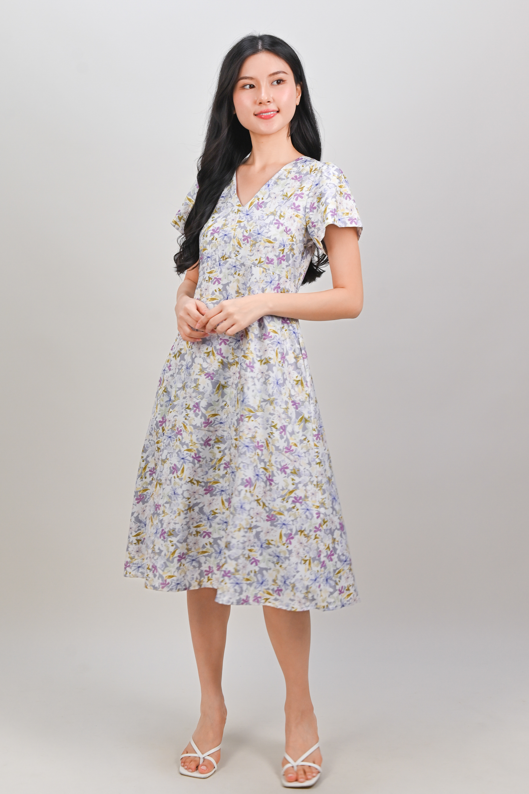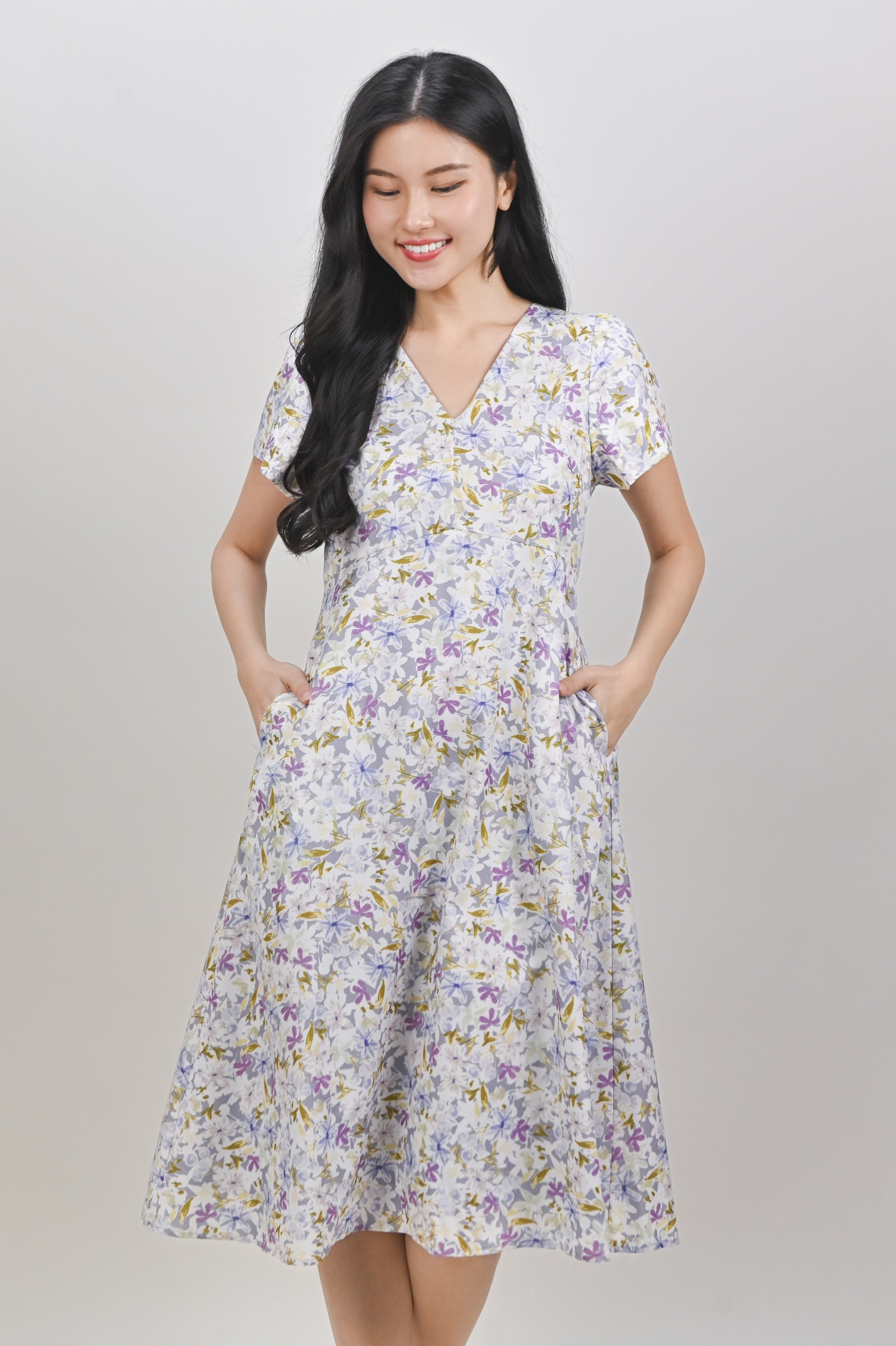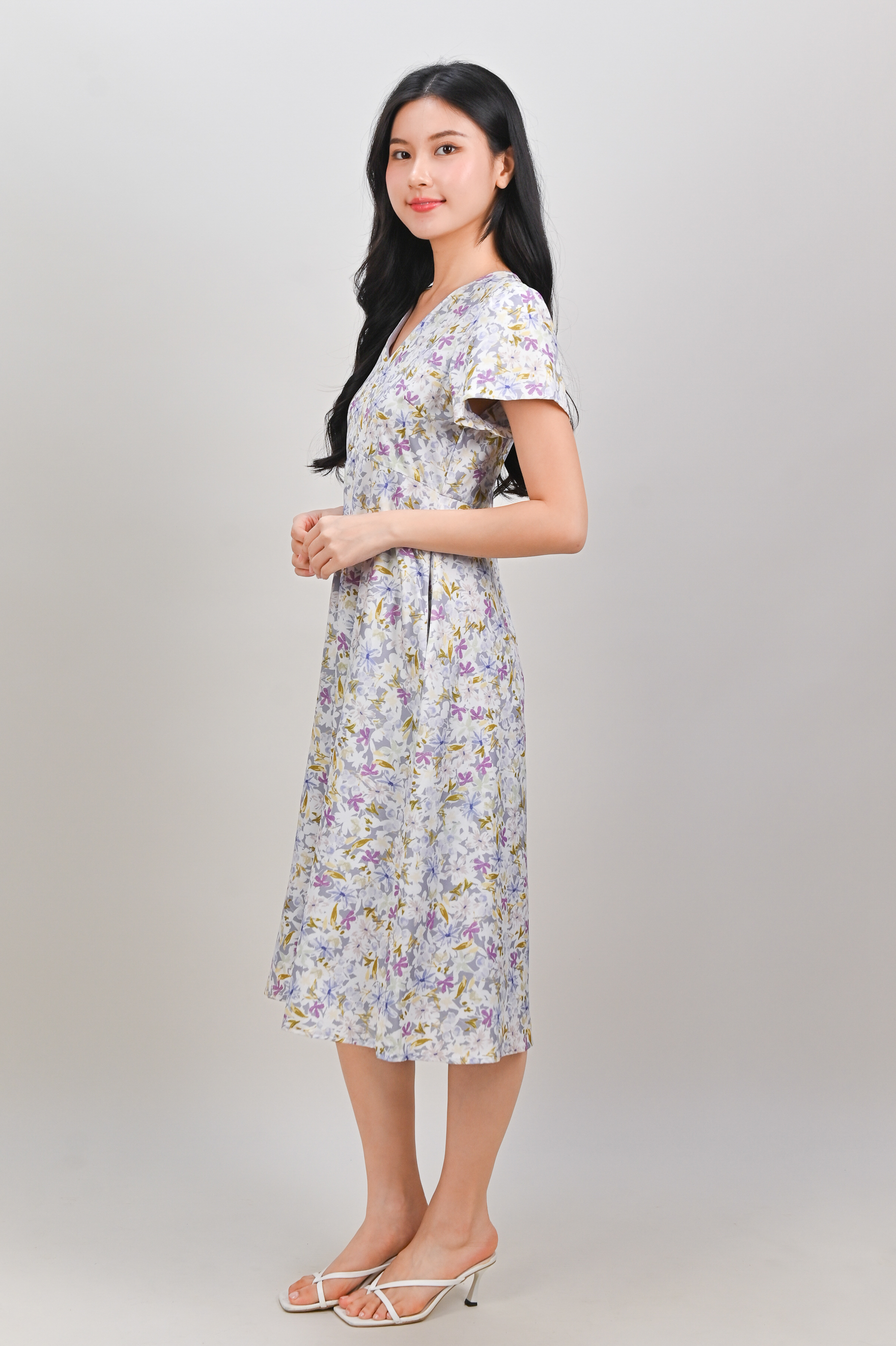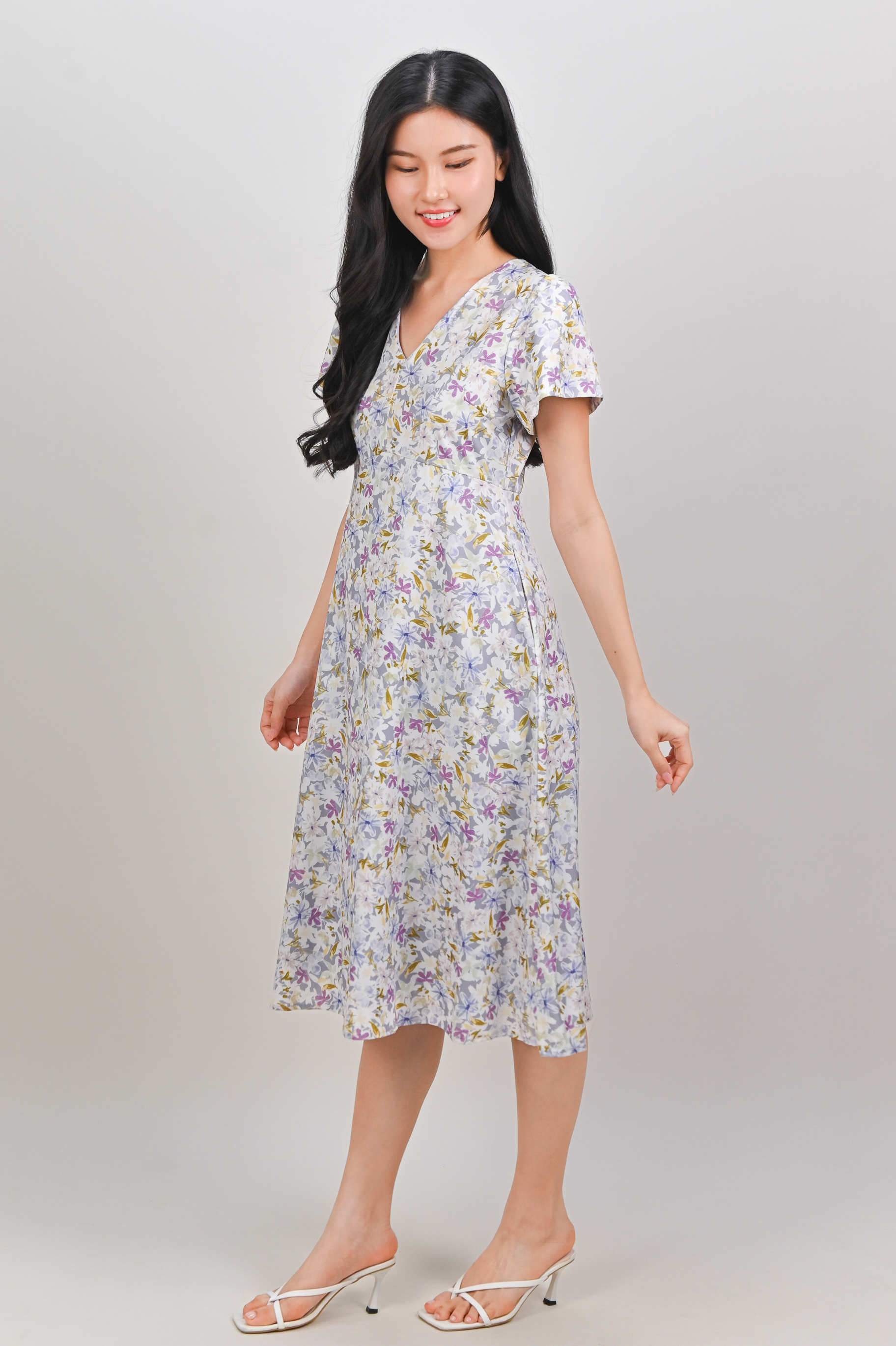 MABEL LAVENDER FLORAL V-NECK SLEEVED MIDI DRESS