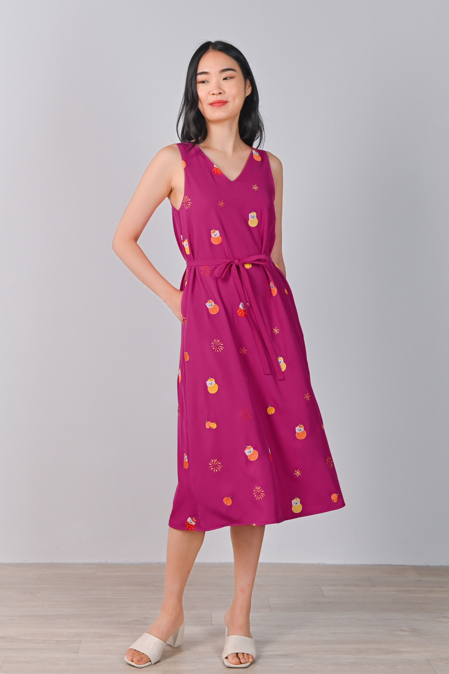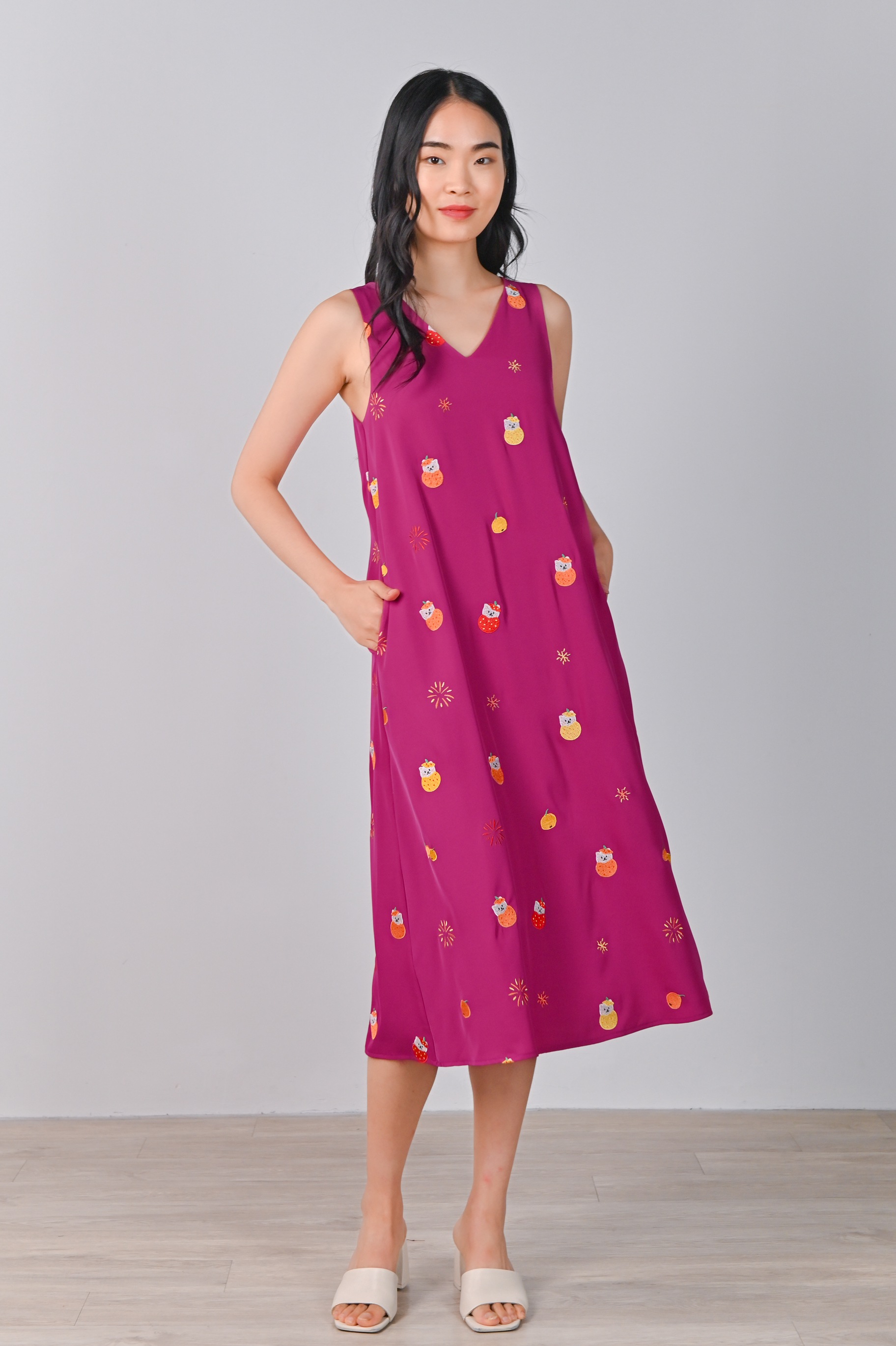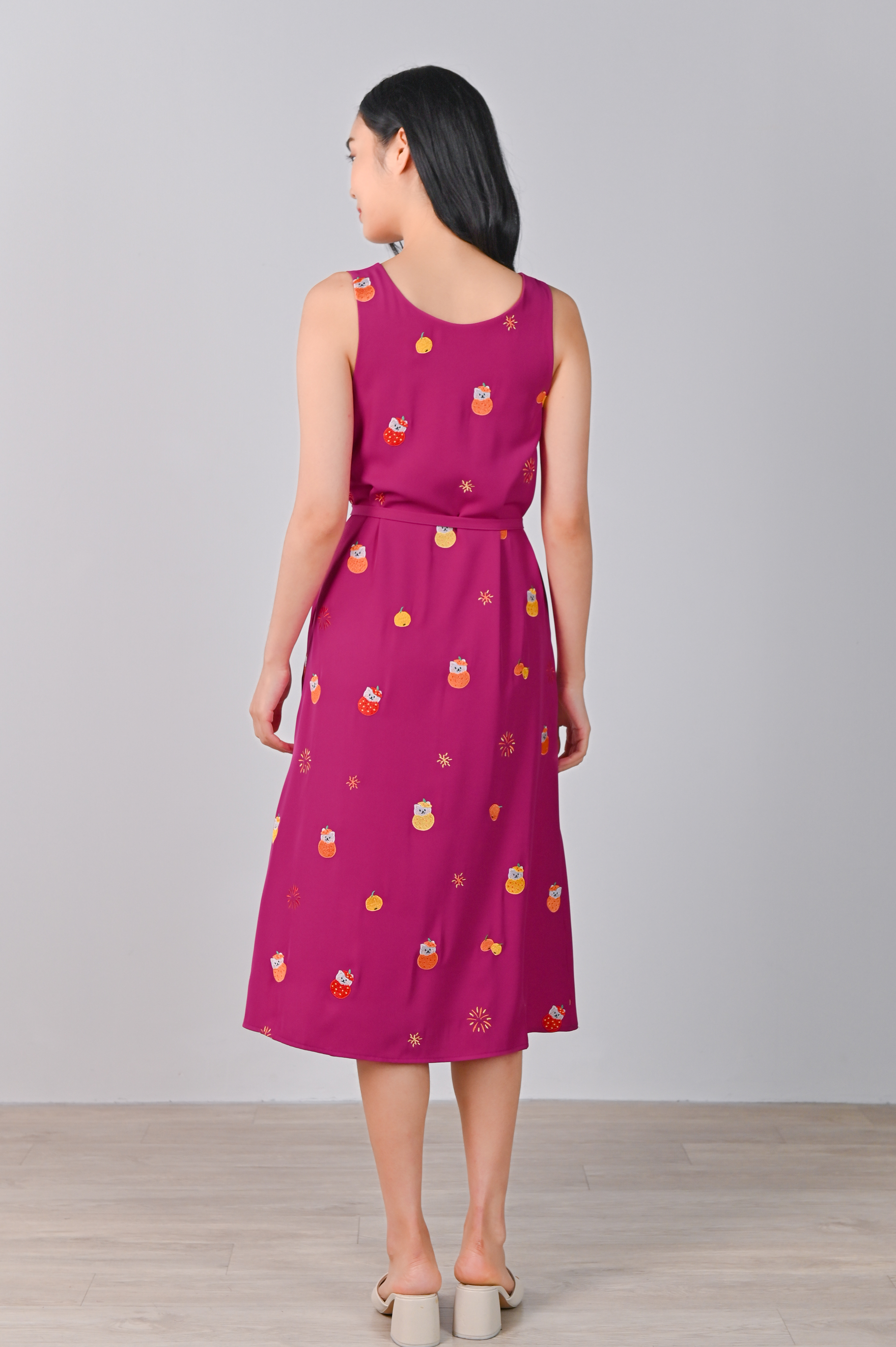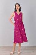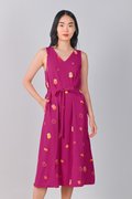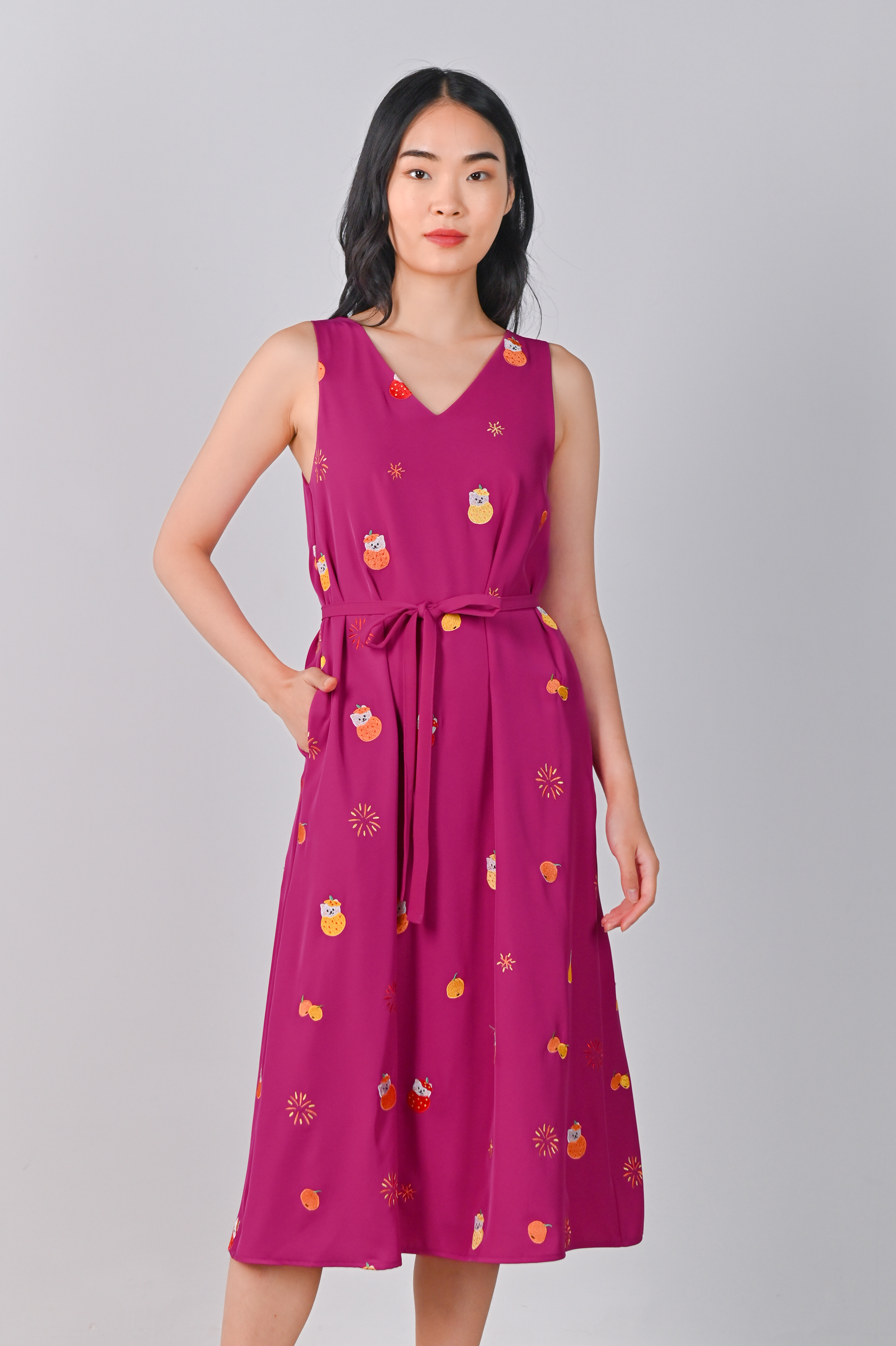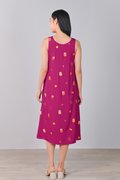 MAGENTA FORTUNE CAT EMB. TWO-WAY MIDI DRESS