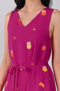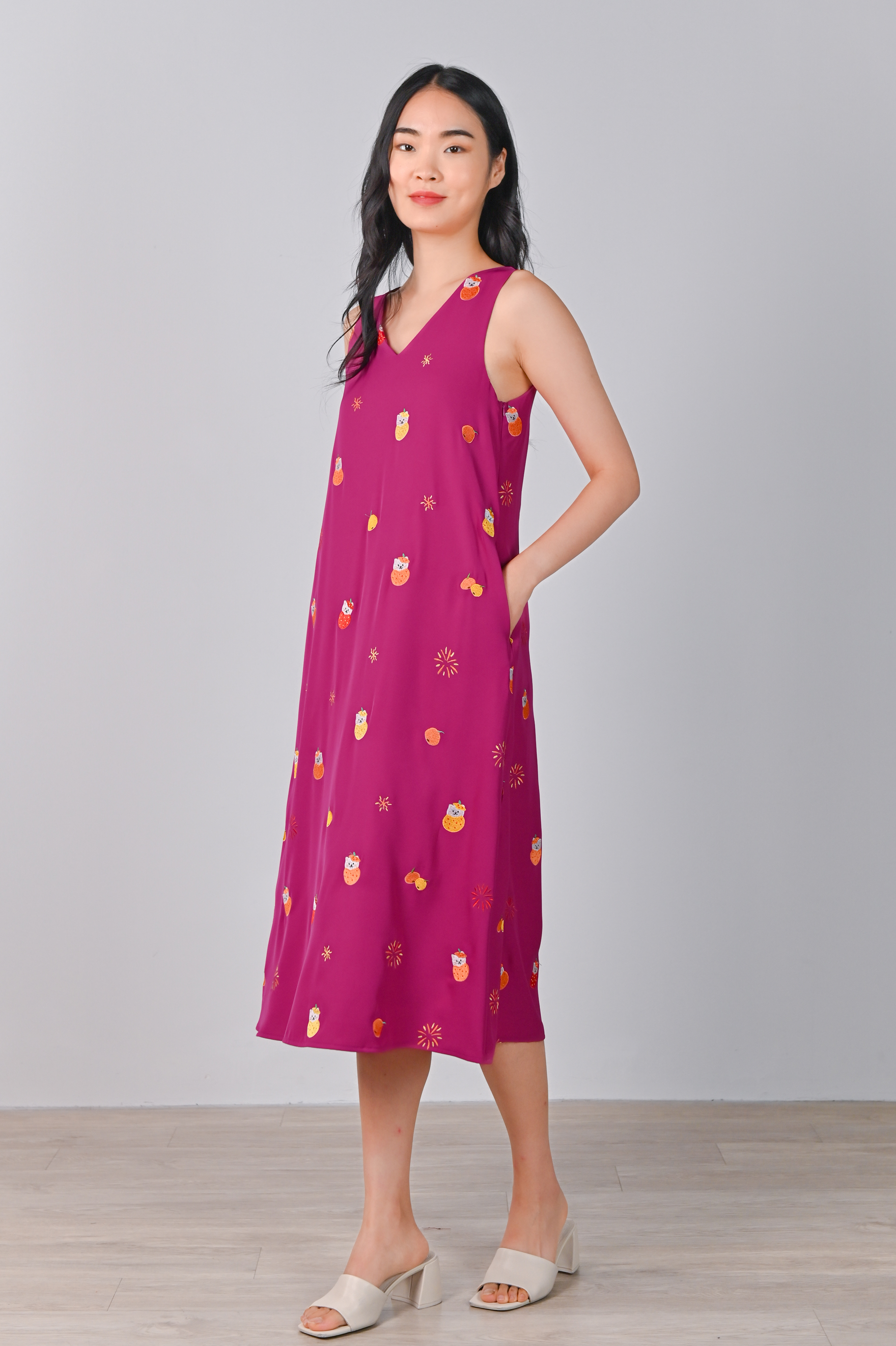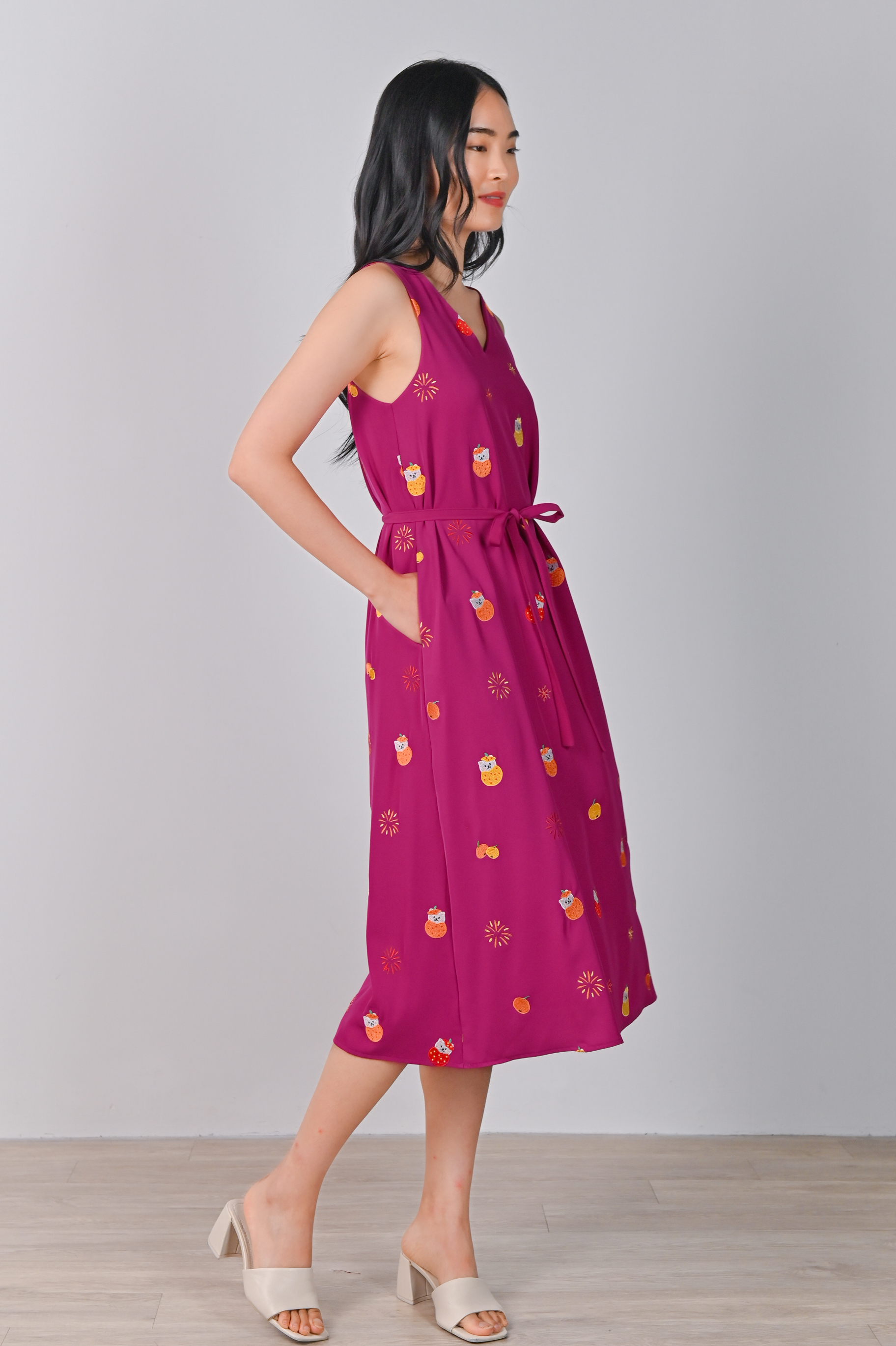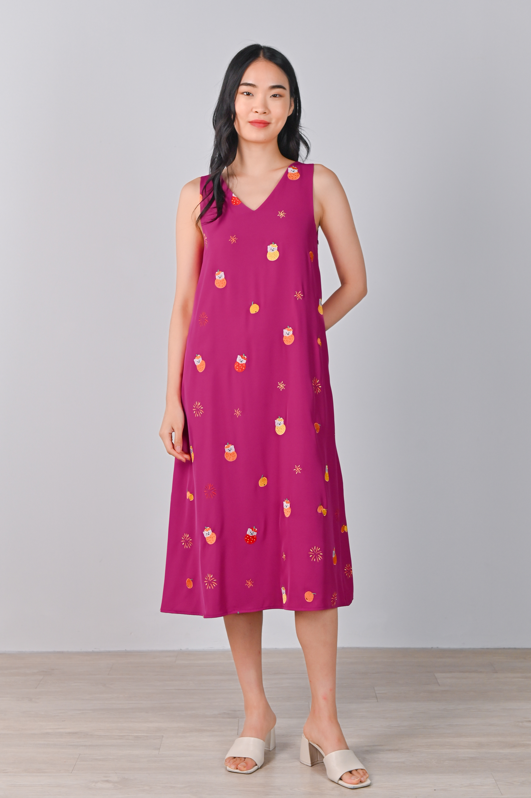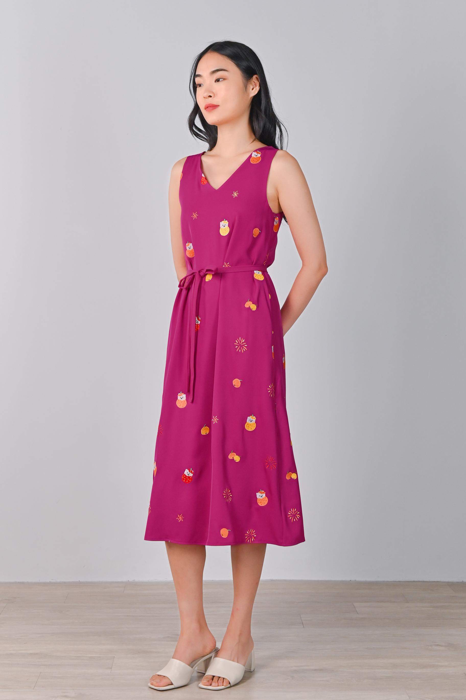 MAGENTA FORTUNE CAT EMB. TWO-WAY MIDI DRESS