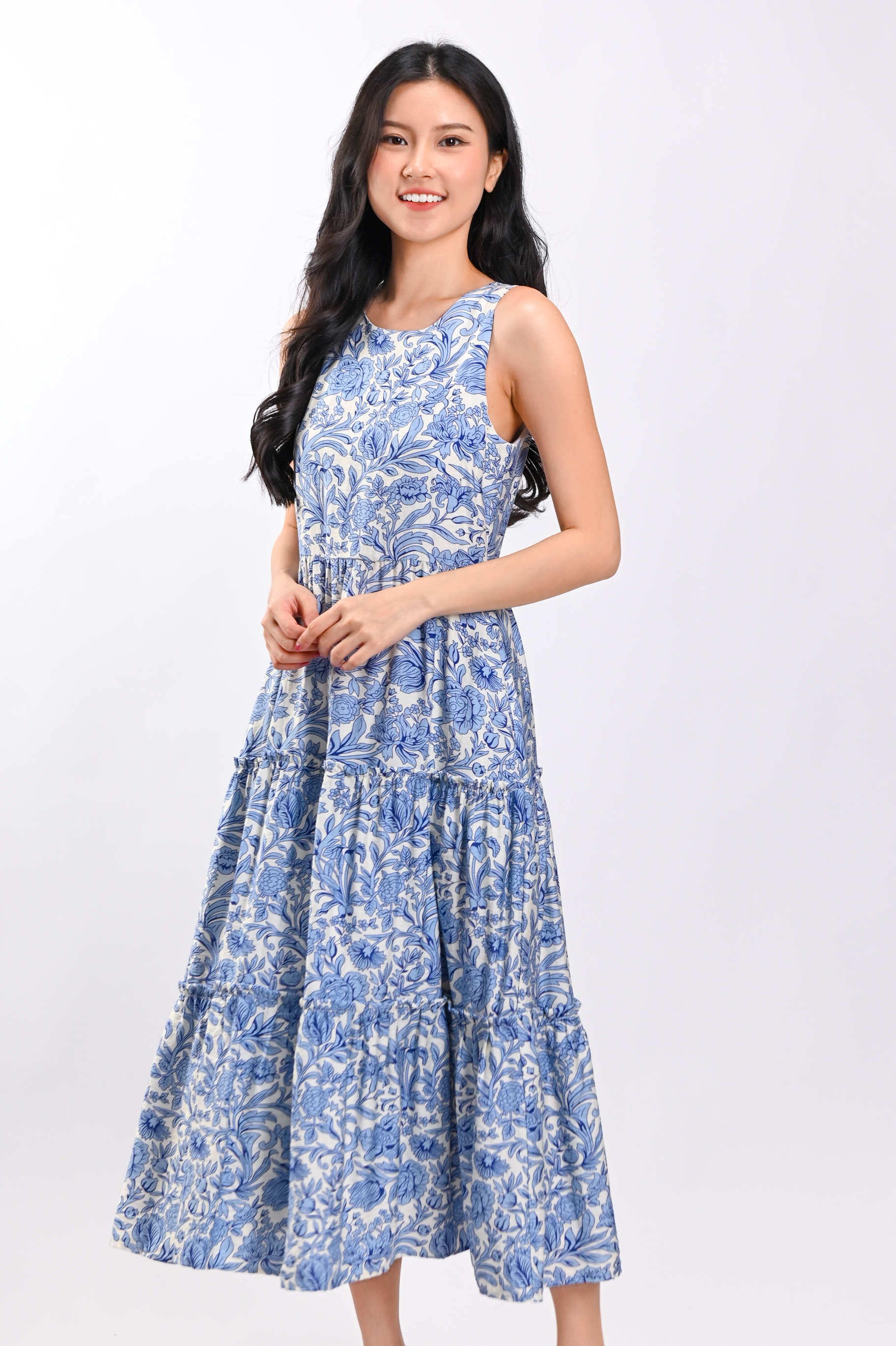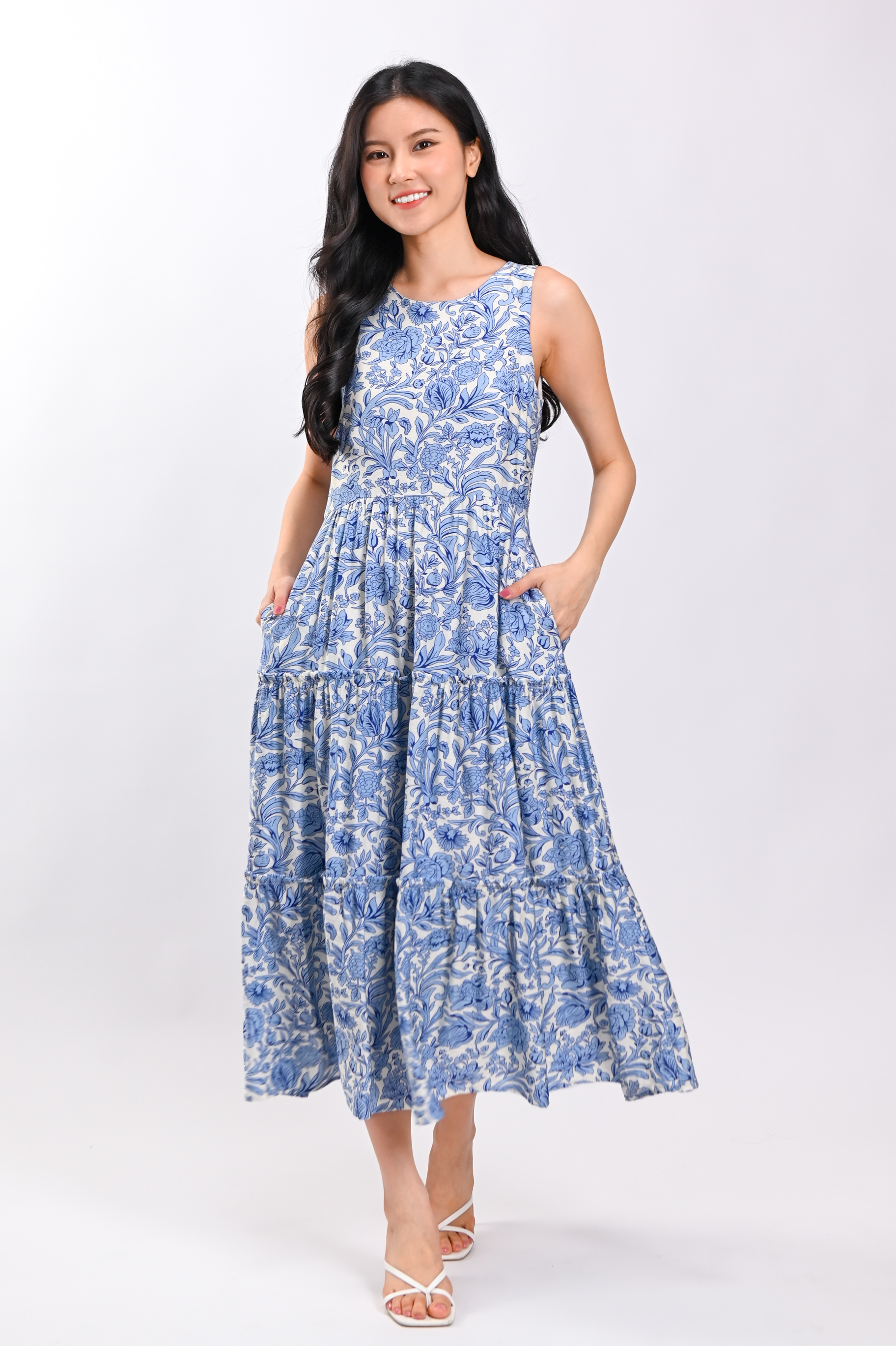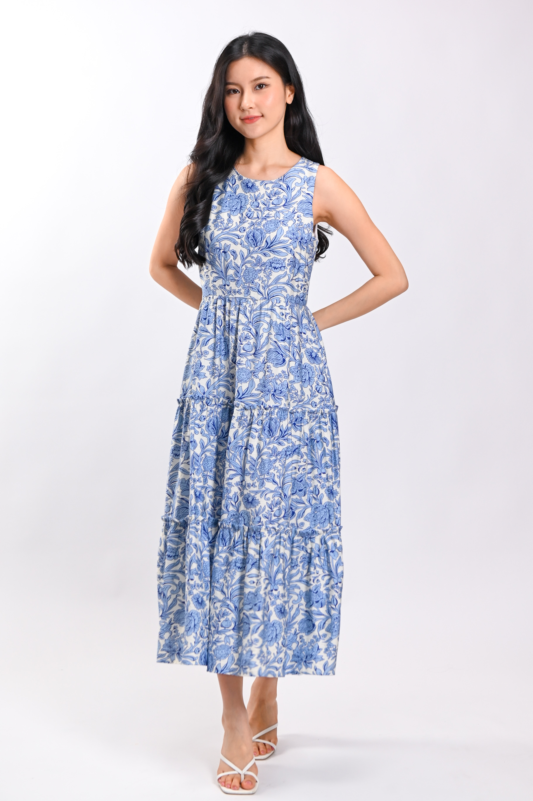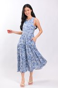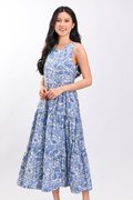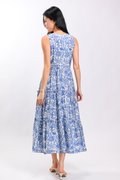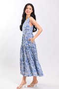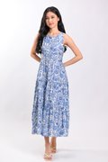 MARGOT SLEEVELESS TIERED DRESS IN BLUE ABSTRACT