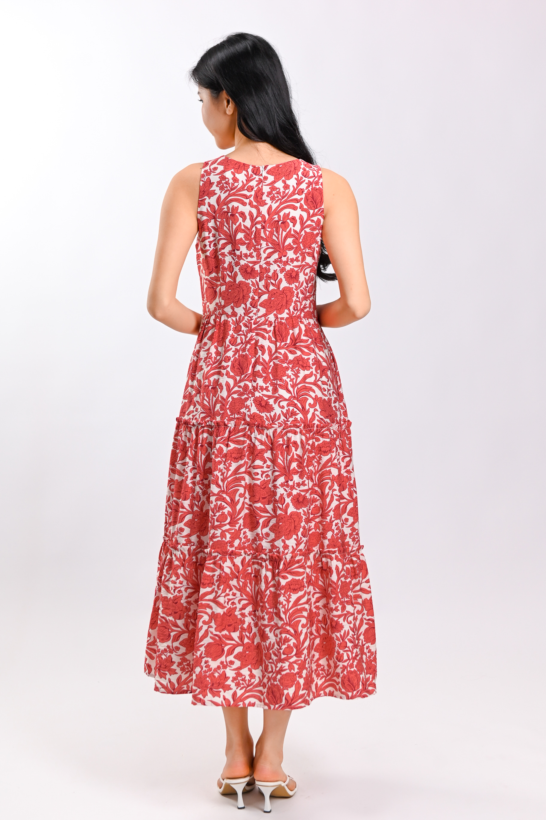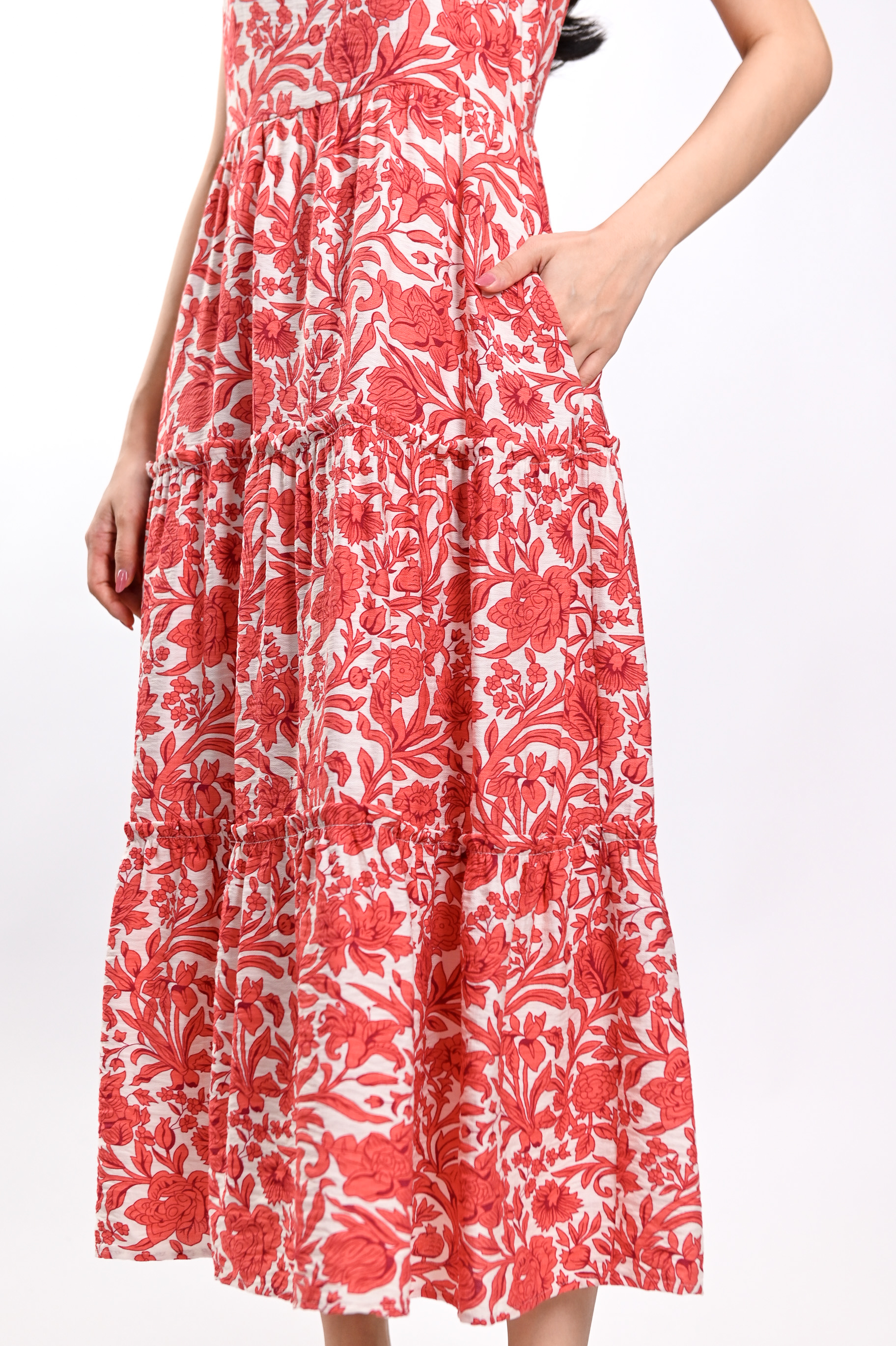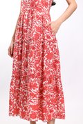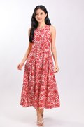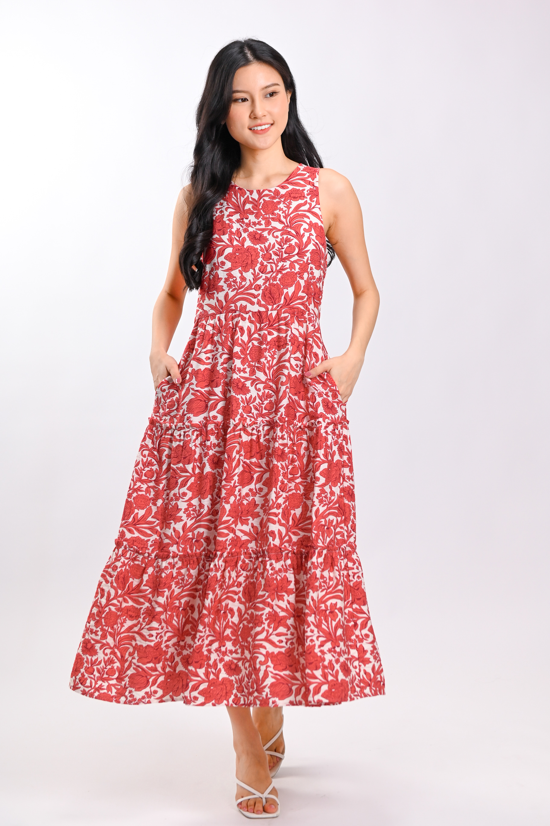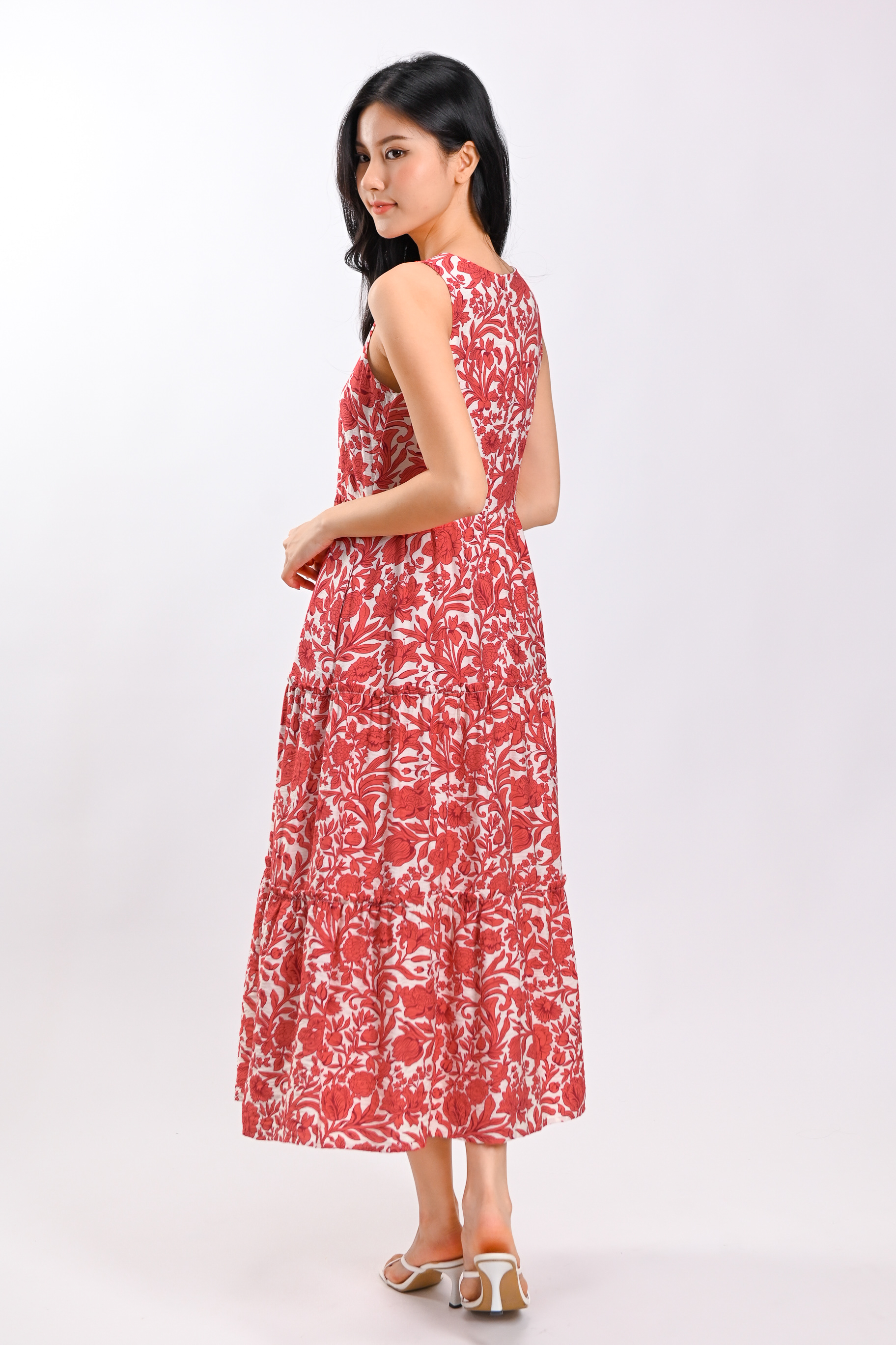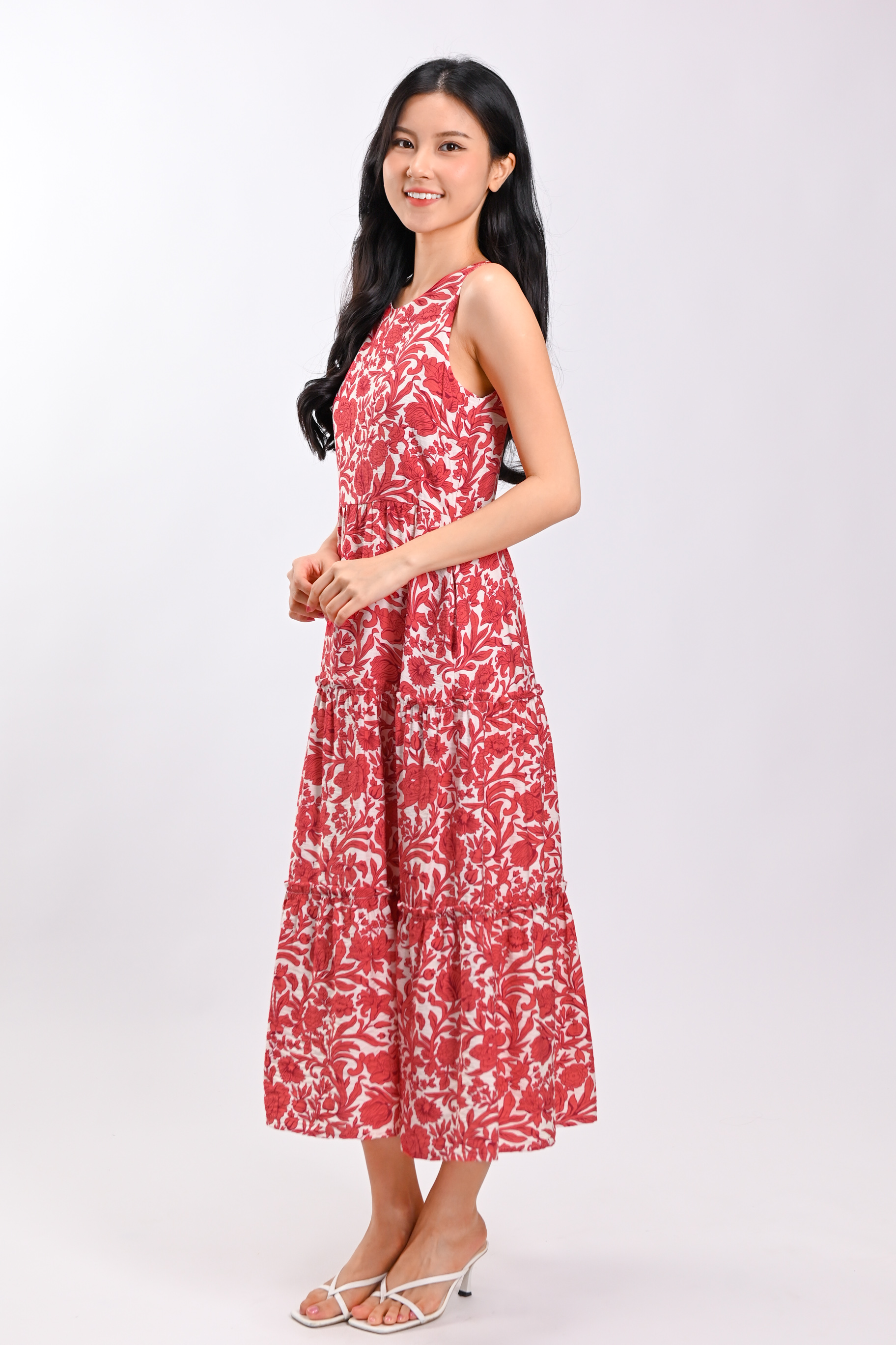 MARGOT SLEEVELESS TIERED DRESS IN RED ABSTRACT
