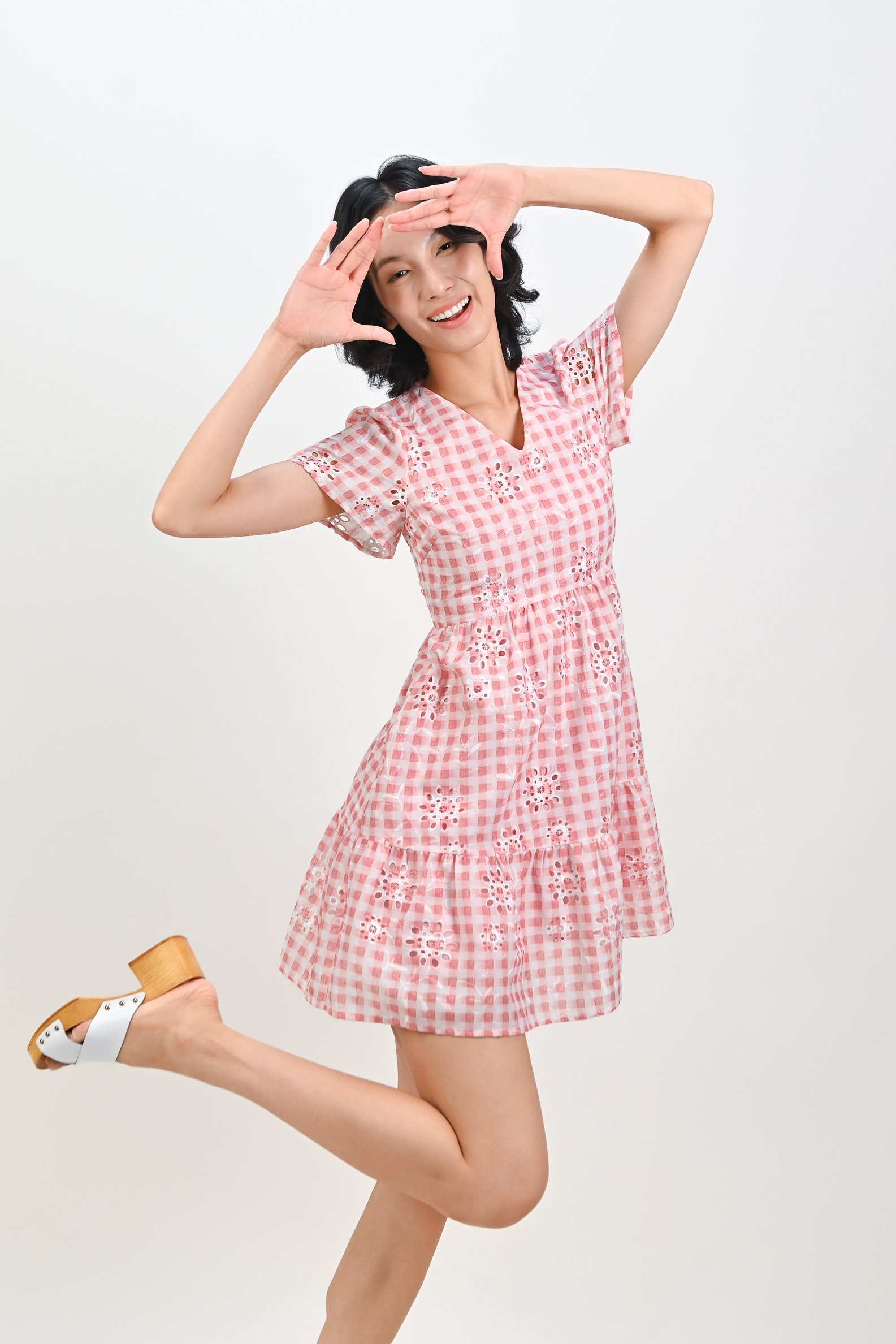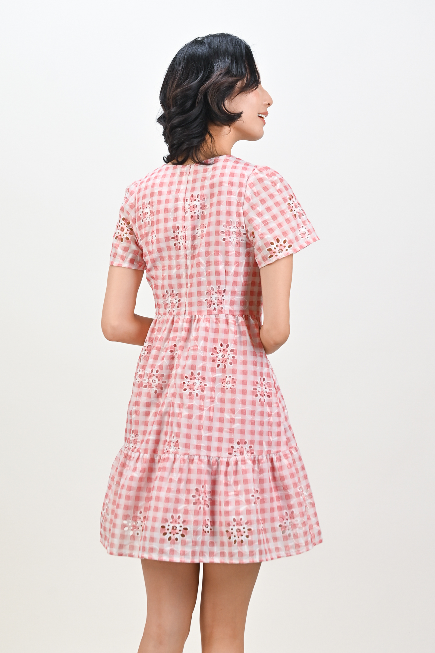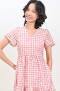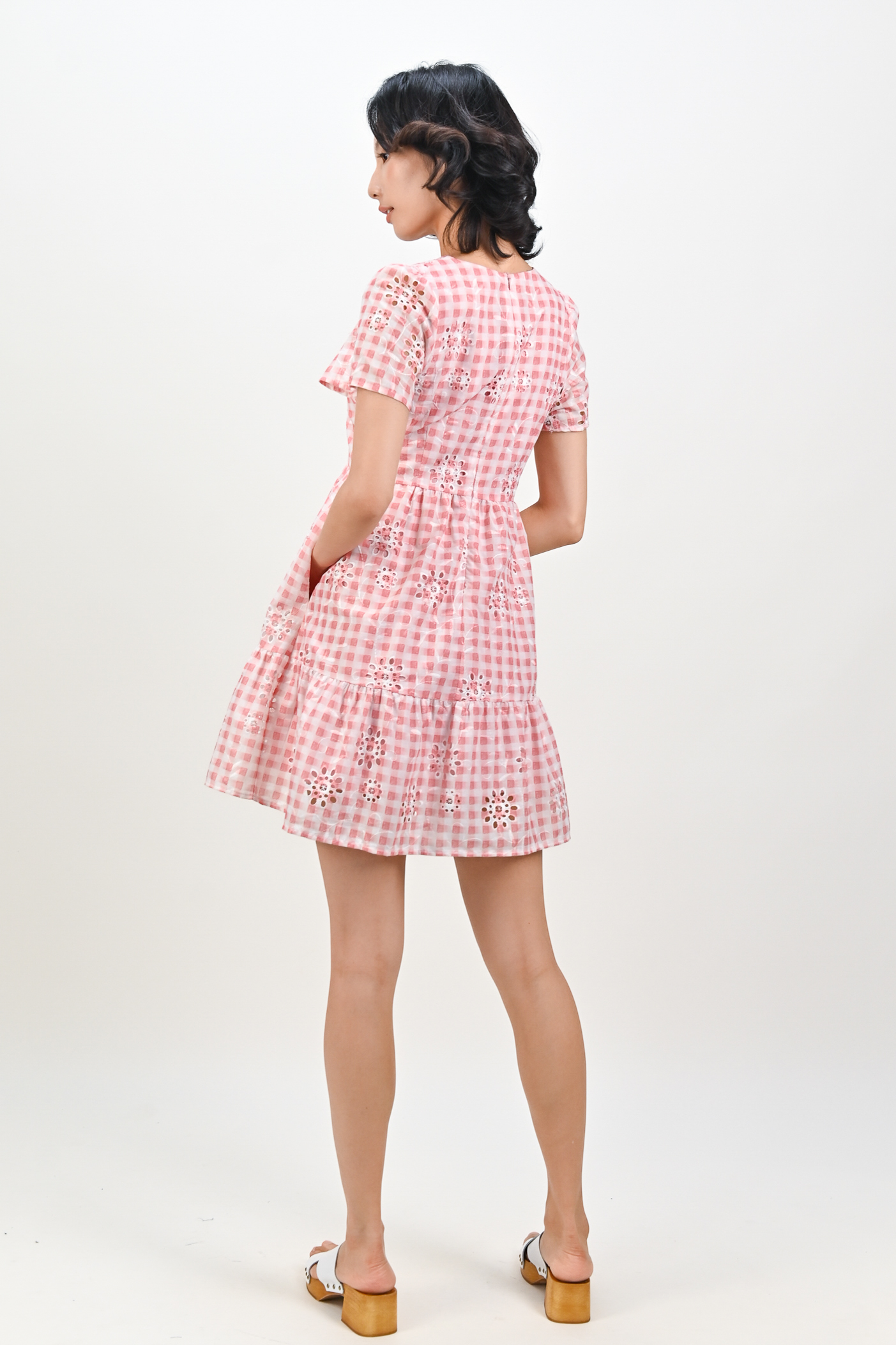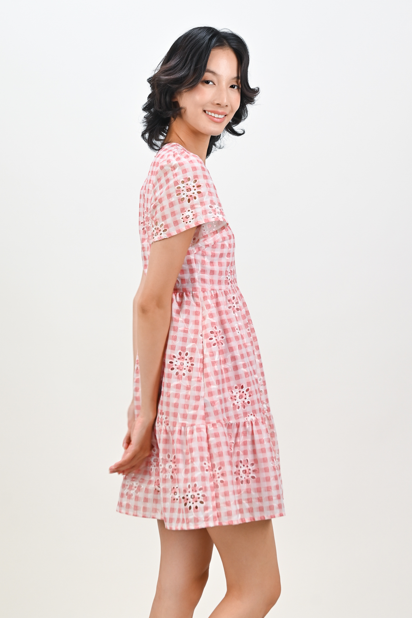 MAVELLE GINGHAM EYELET SLEEVED FLOUNCE DRESS IN PINK