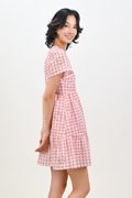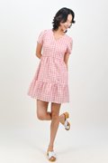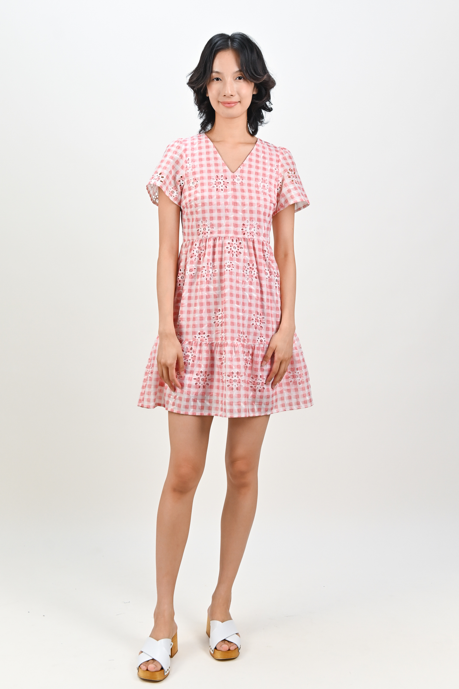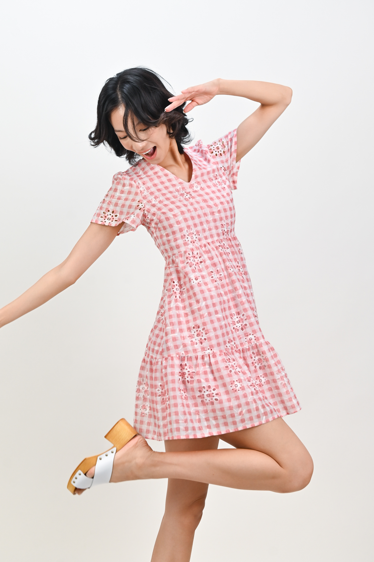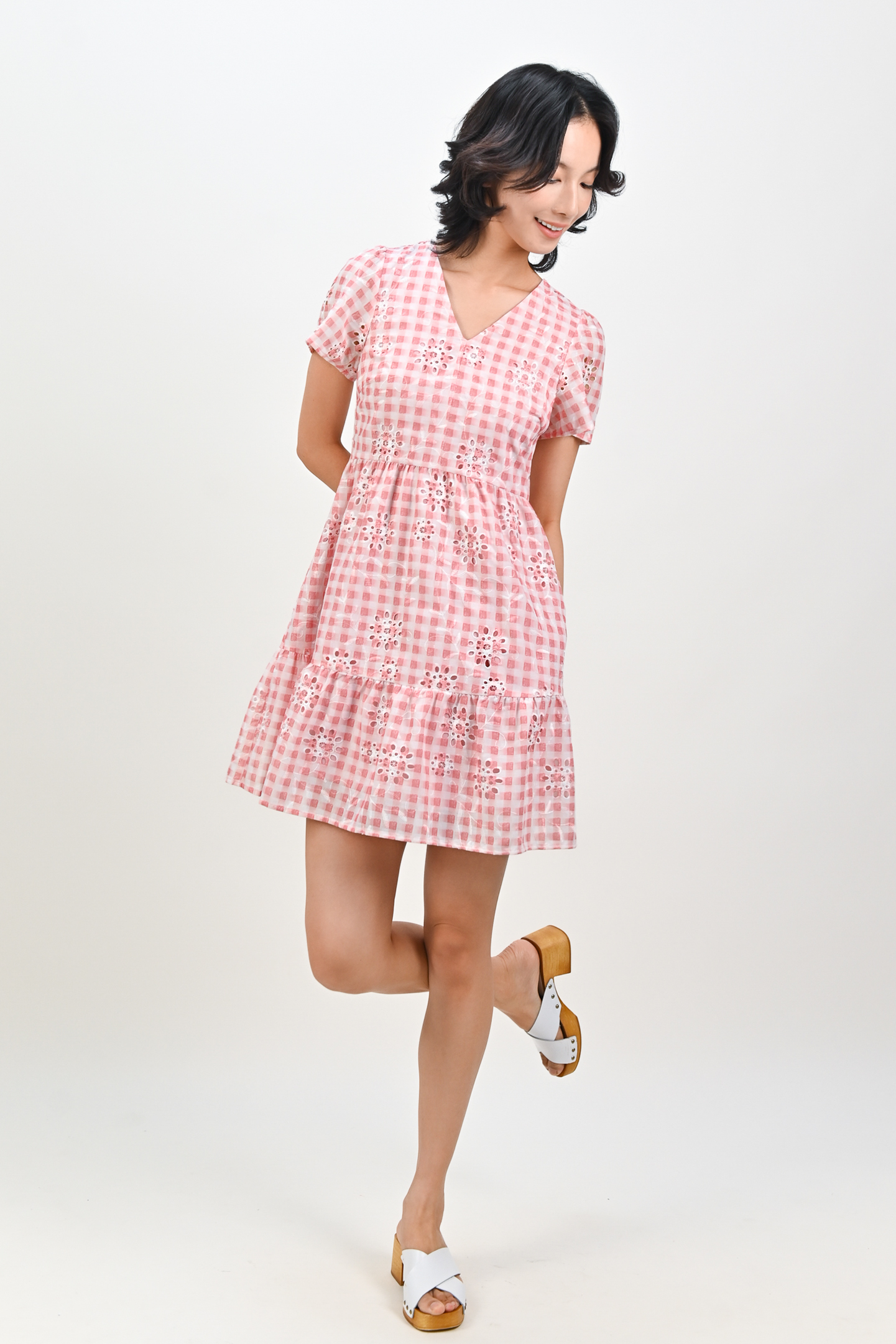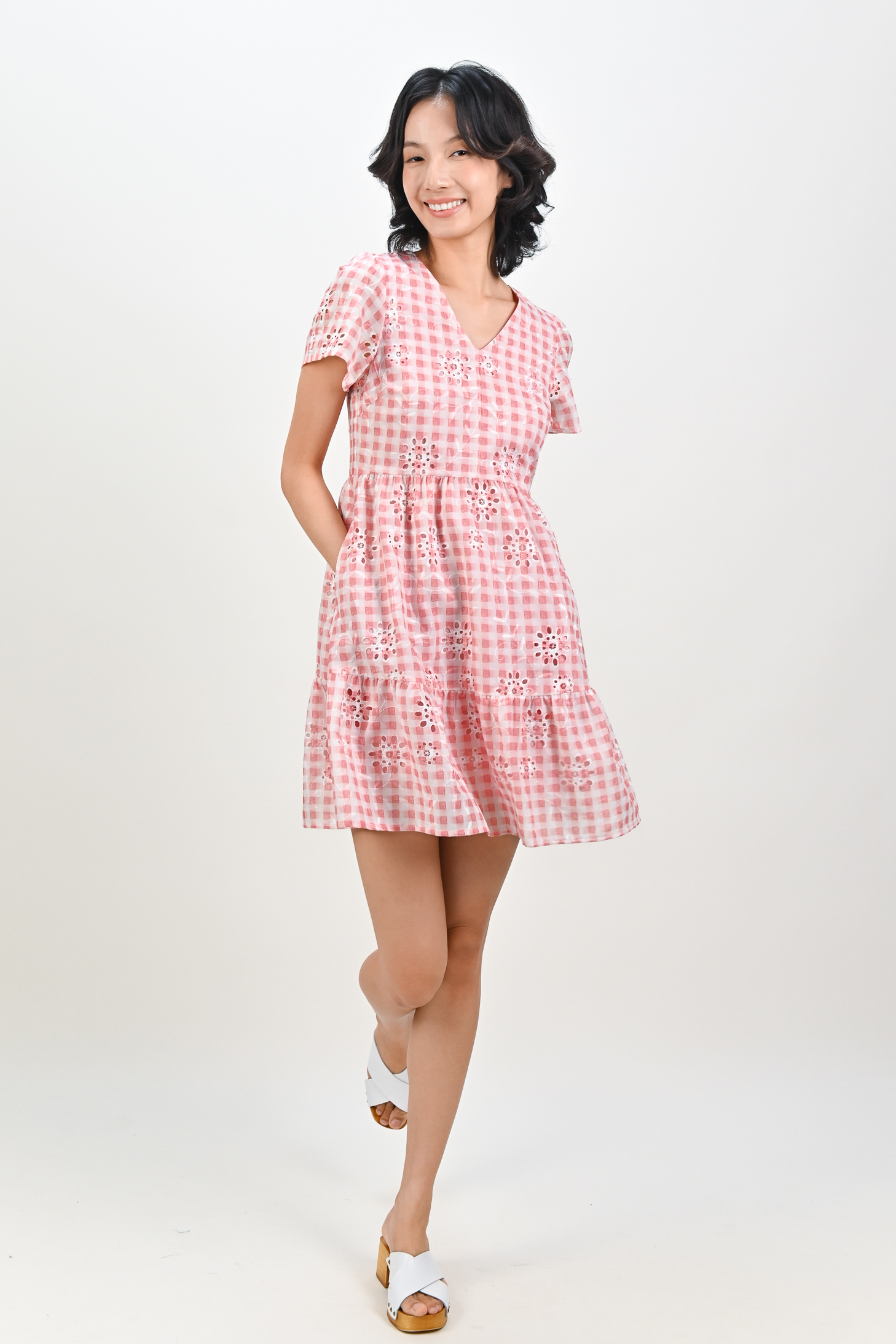 MAVELLE GINGHAM EYELET SLEEVED FLOUNCE DRESS IN PINK