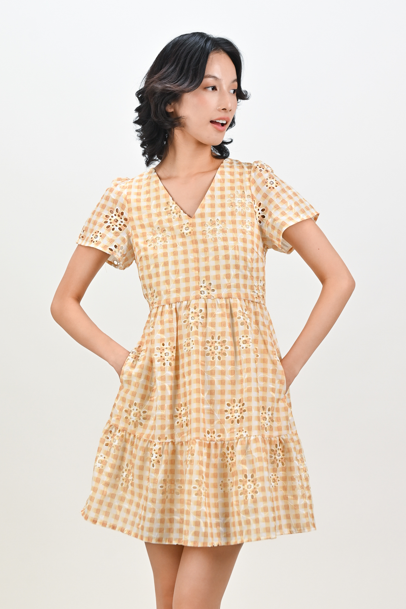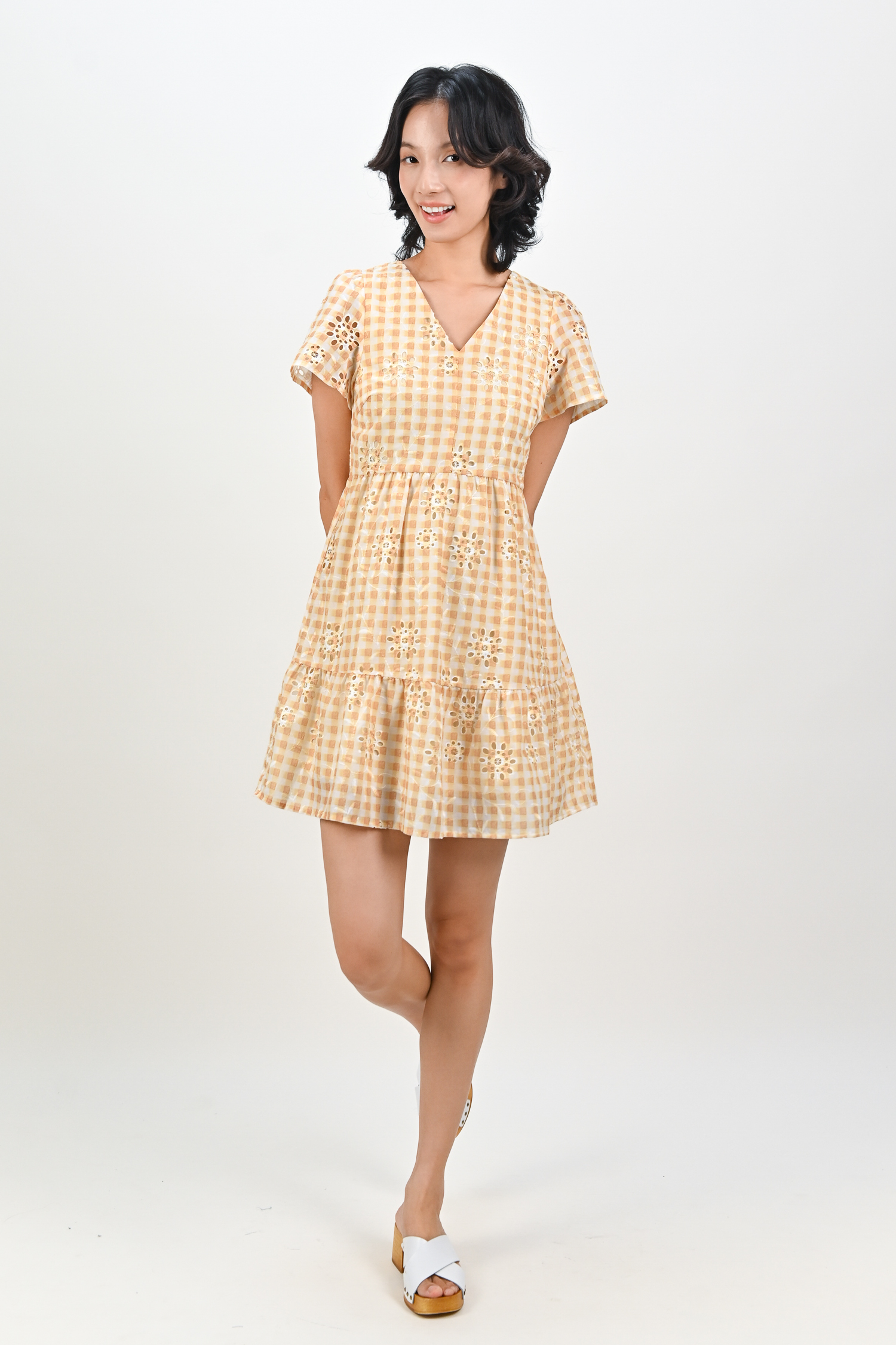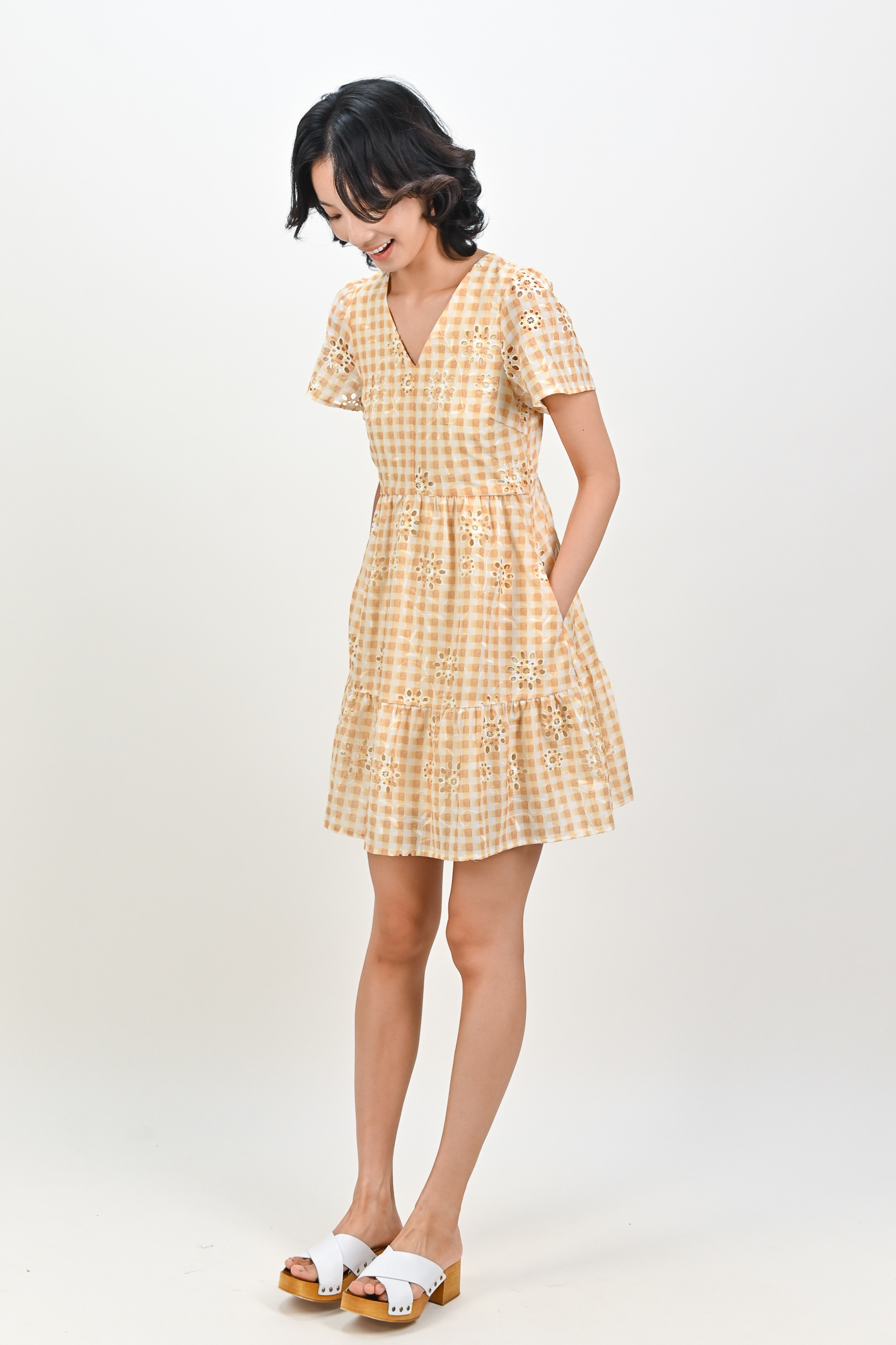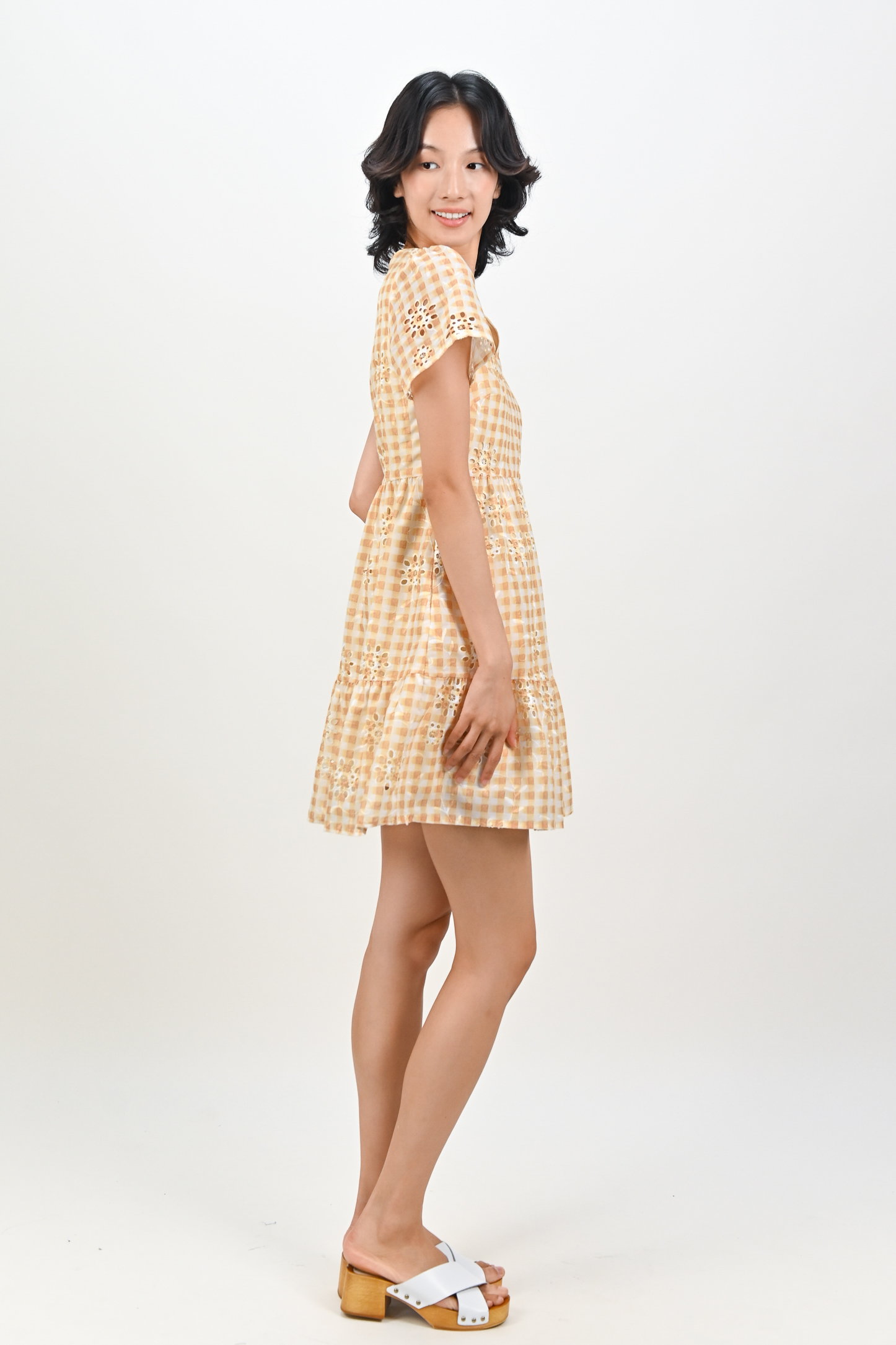 MAVELLE GINGHAM EYELET SLEEVED FLOUNCE DRESS IN YELLOW