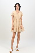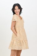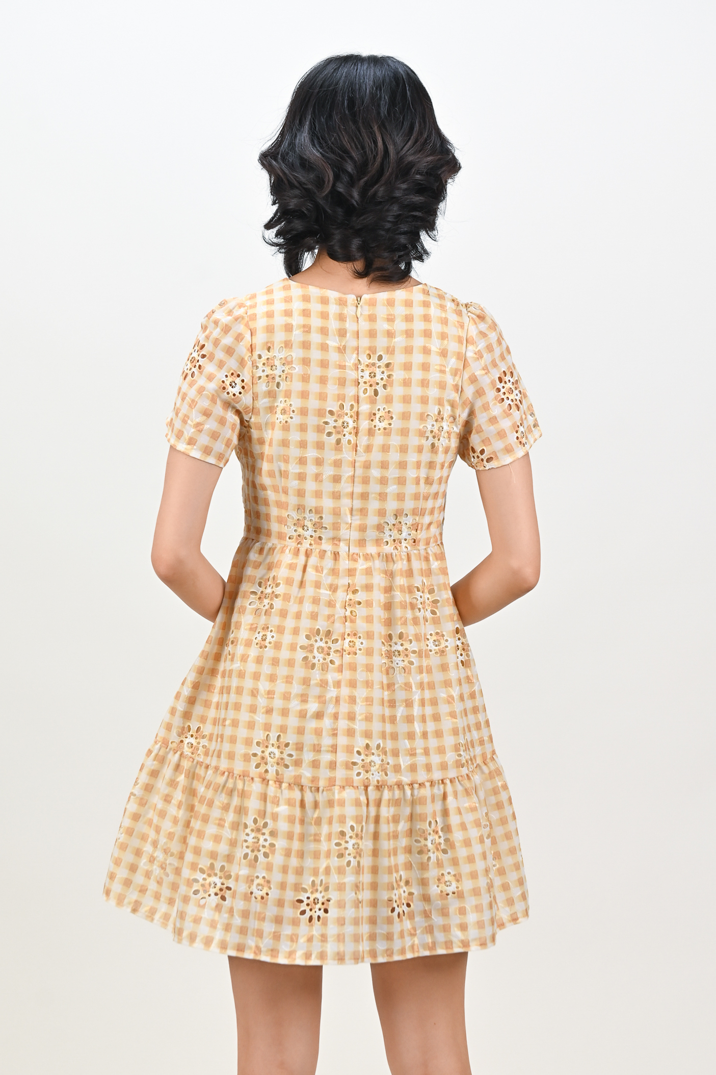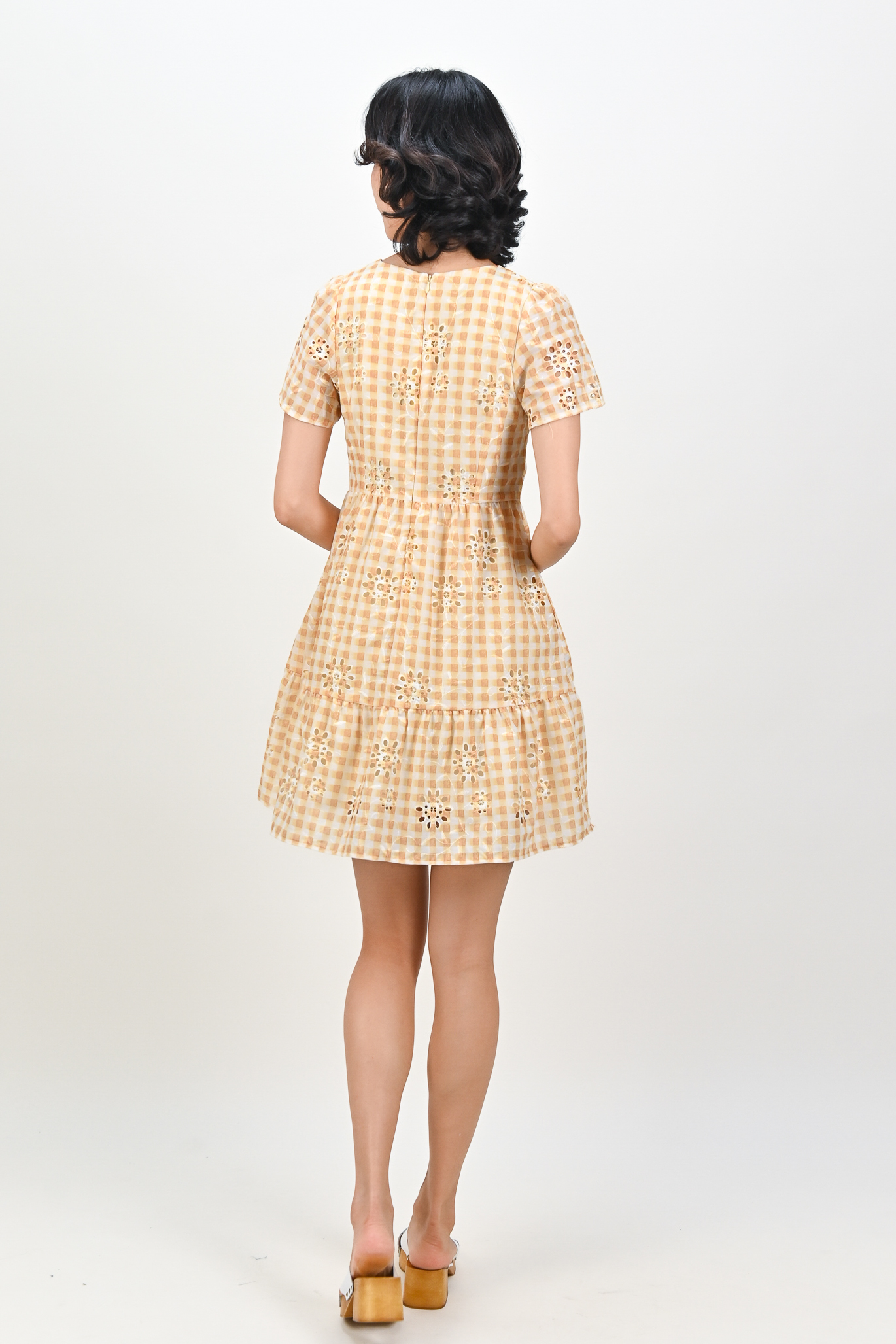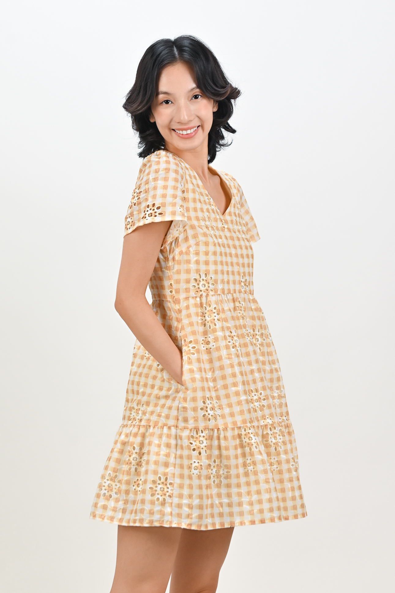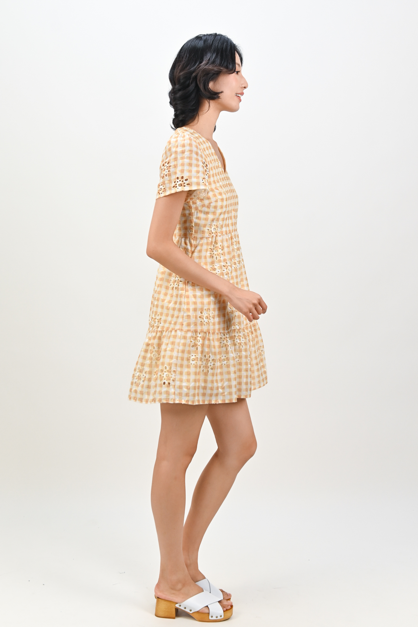 MAVELLE GINGHAM EYELET SLEEVED FLOUNCE DRESS IN YELLOW