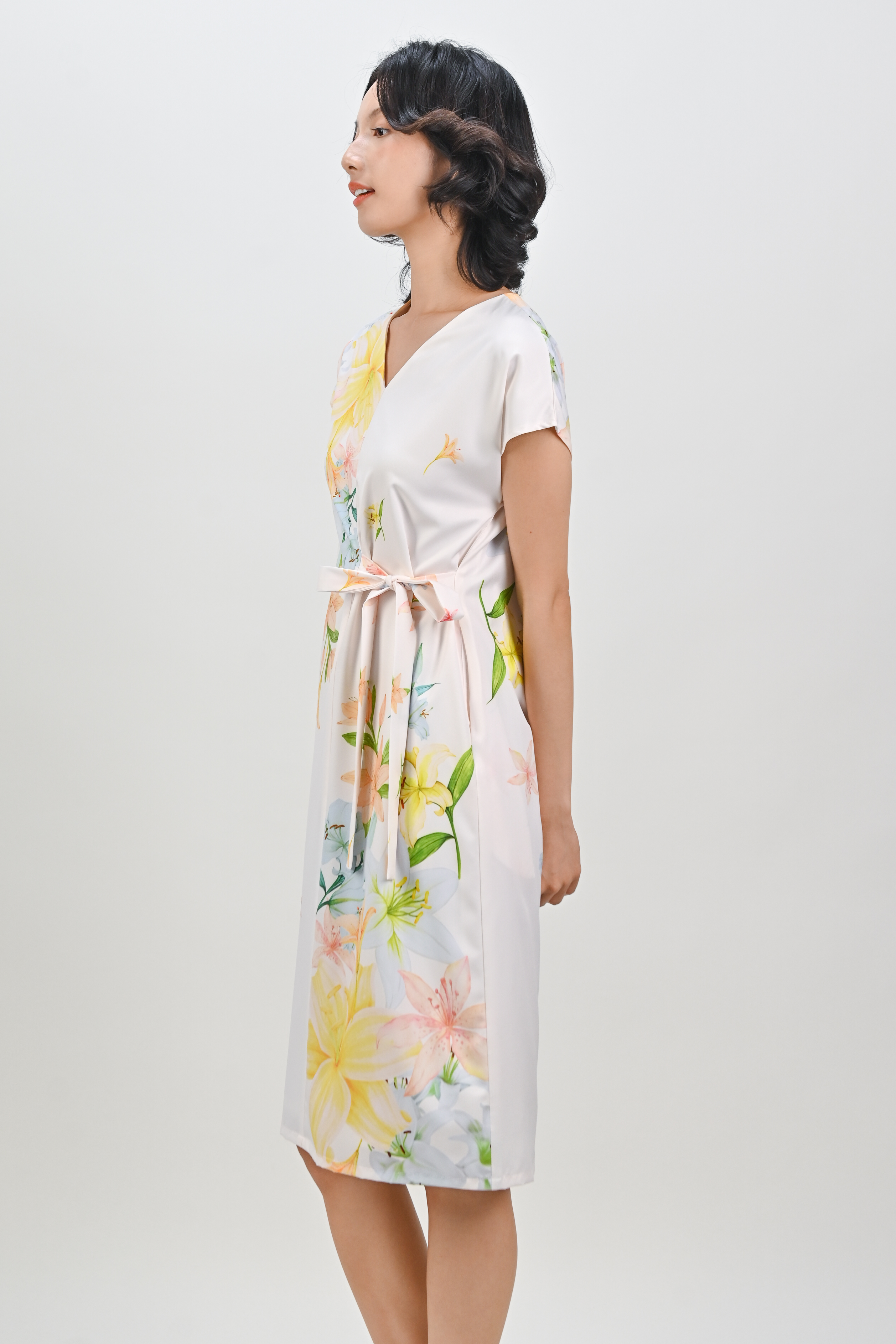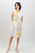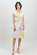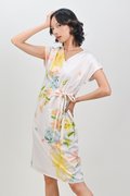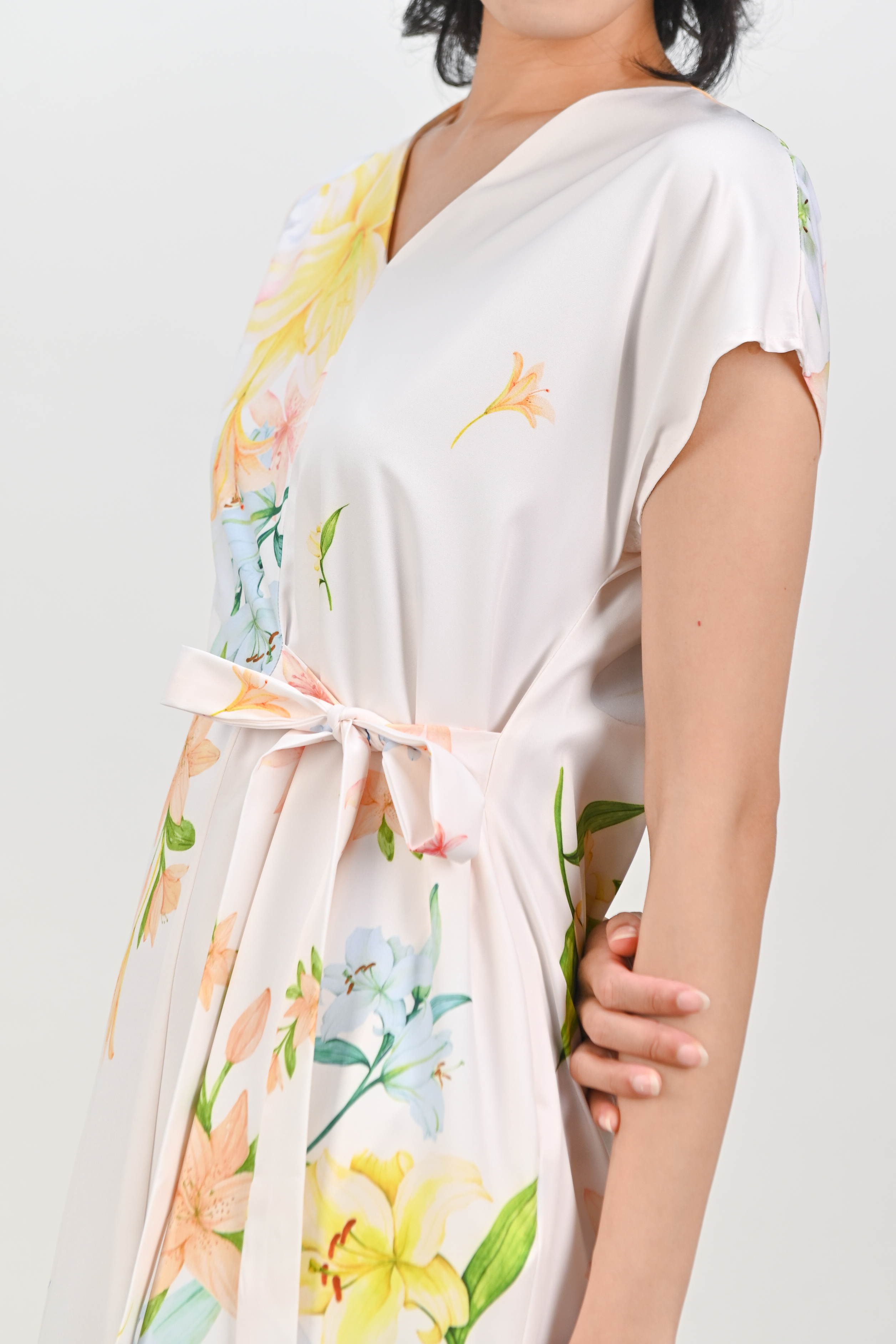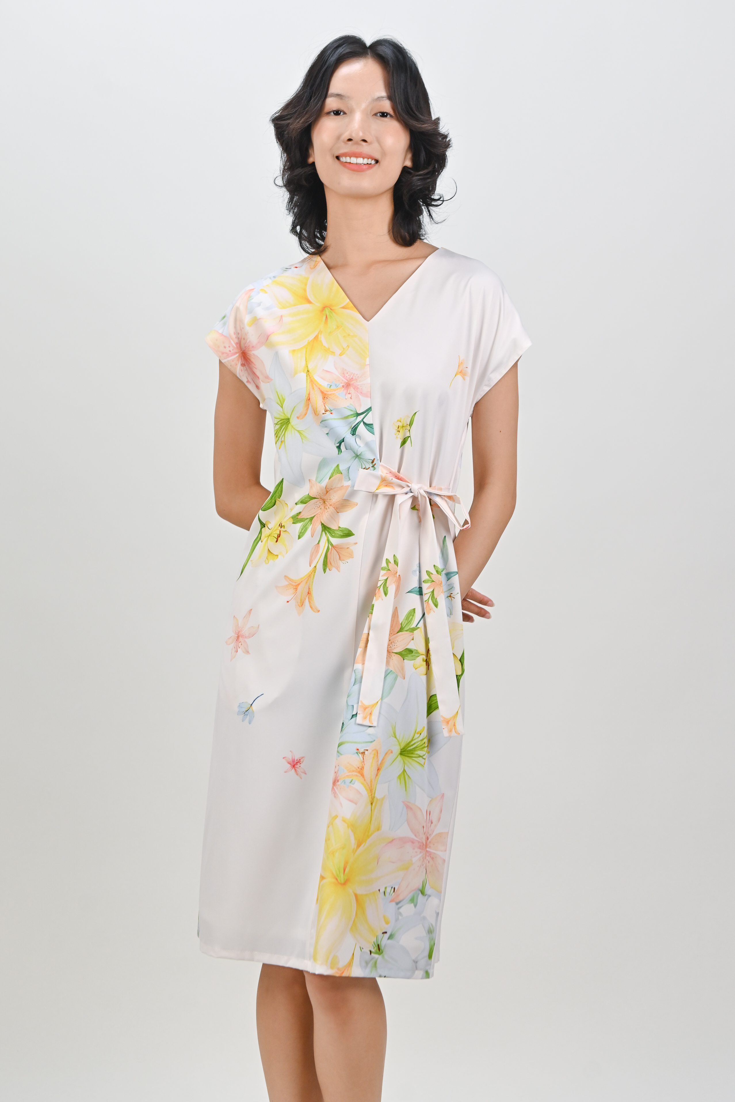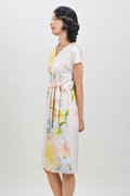 MILEKA CREAM PLACEMENT FLORAL V-NECK DRESS