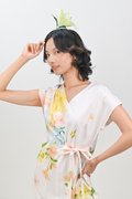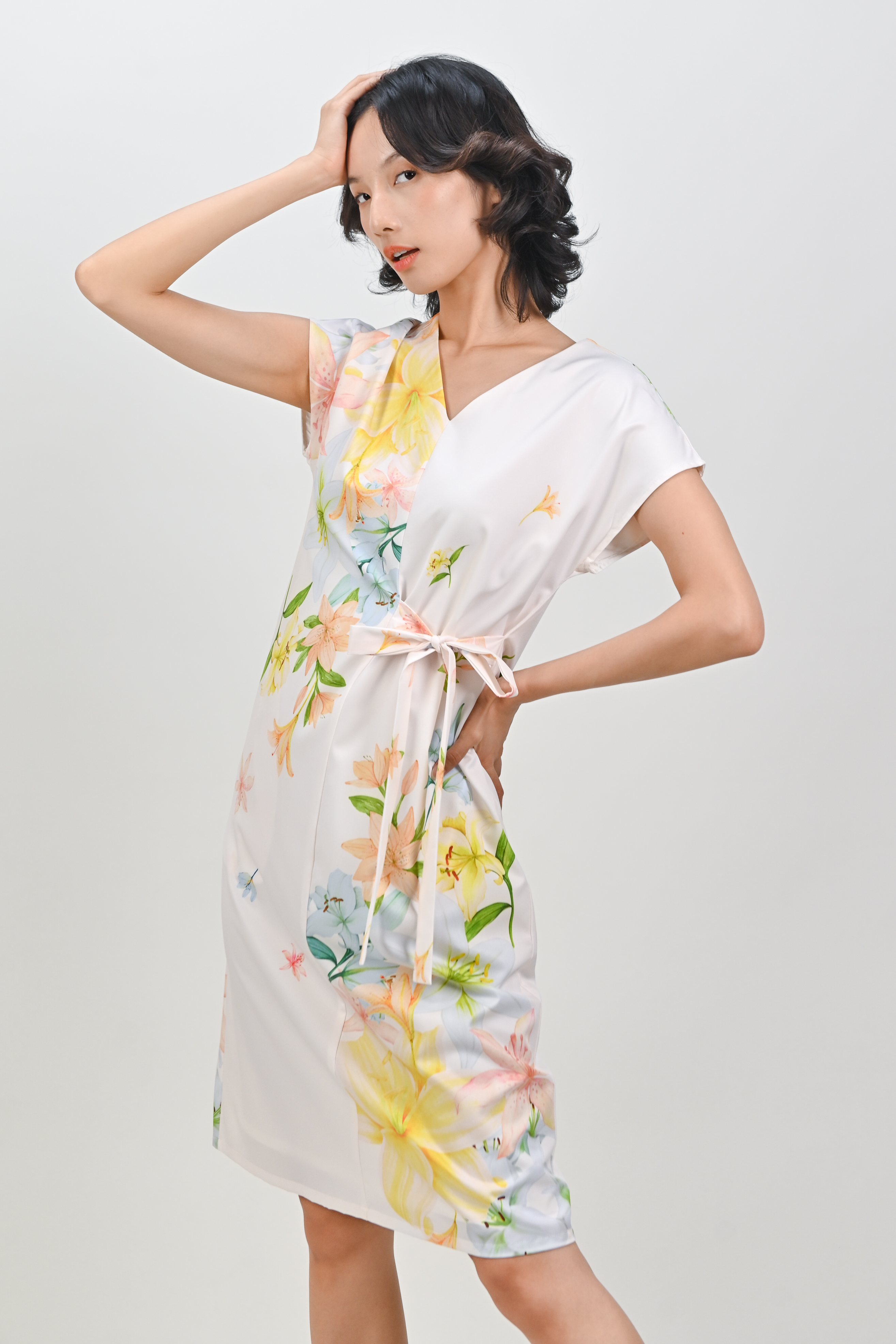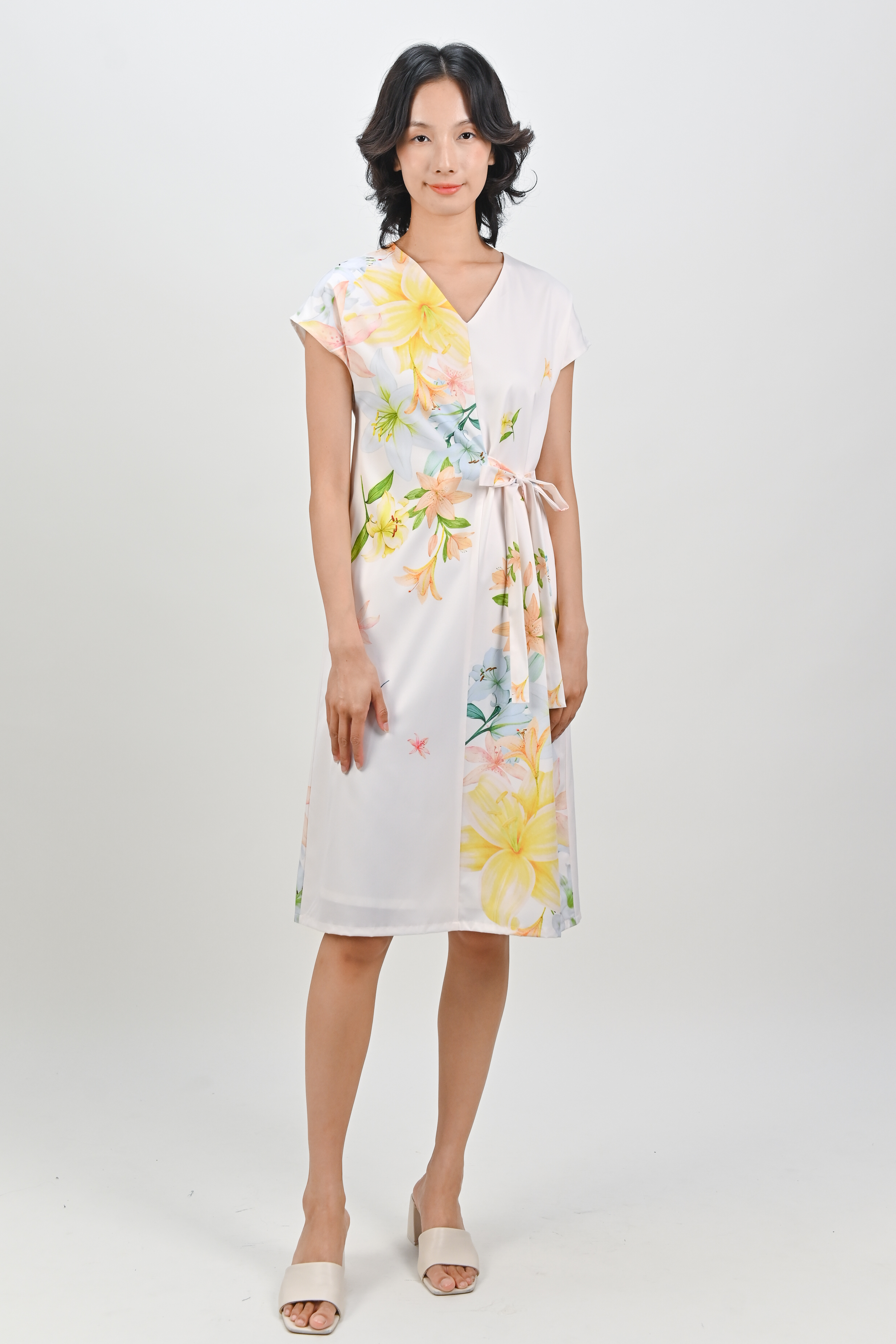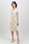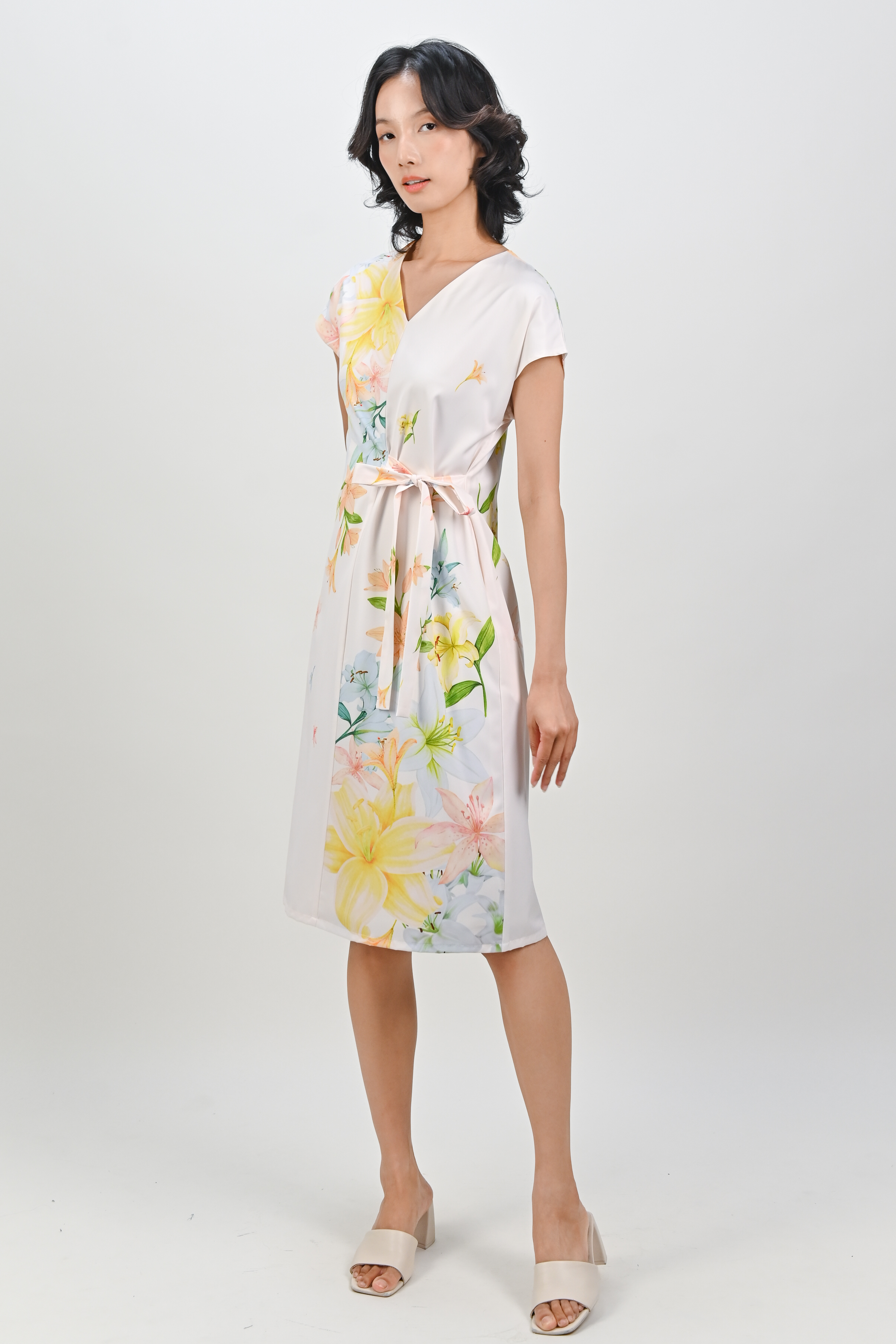 MILEKA CREAM PLACEMENT FLORAL V-NECK DRESS