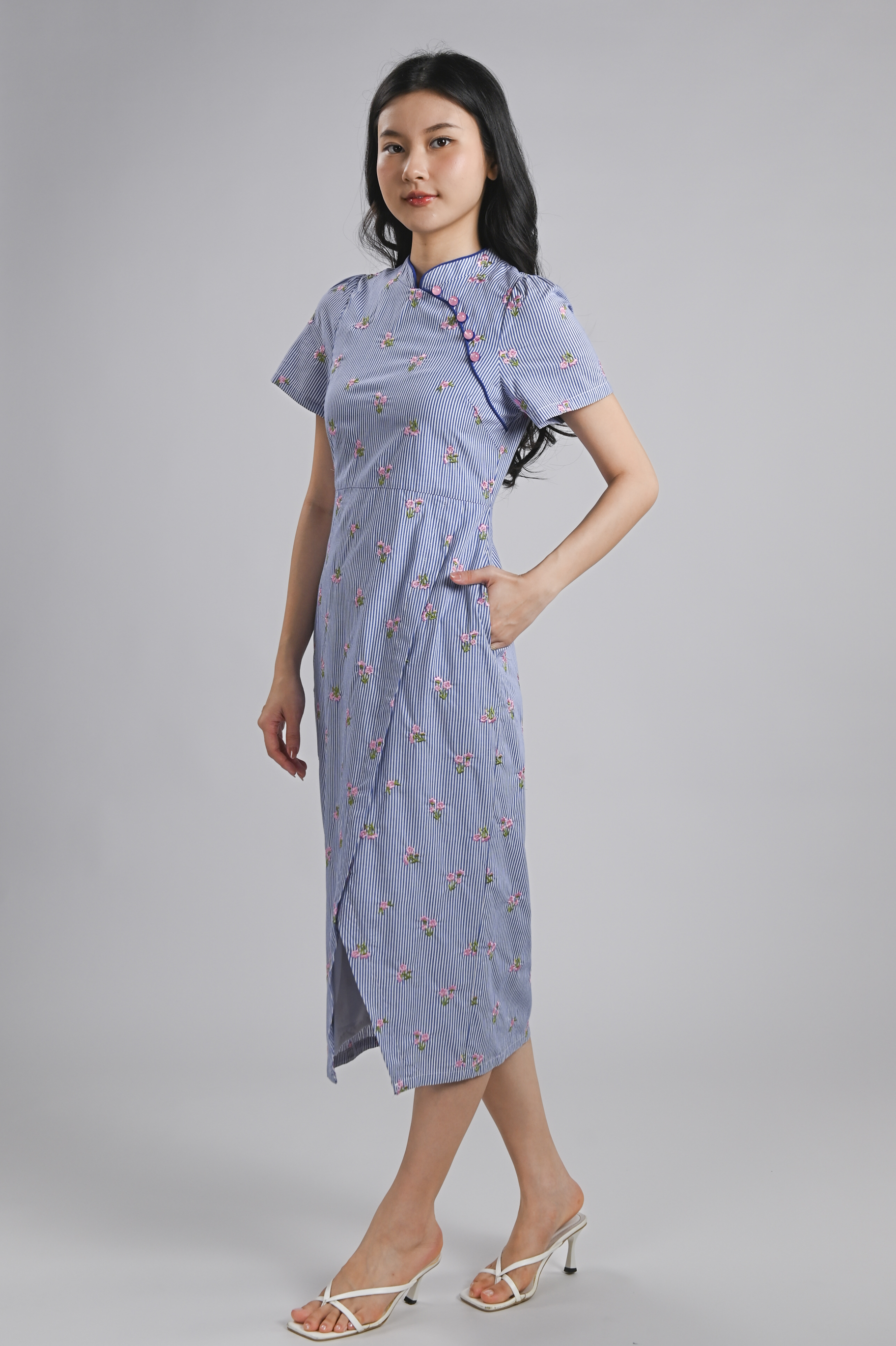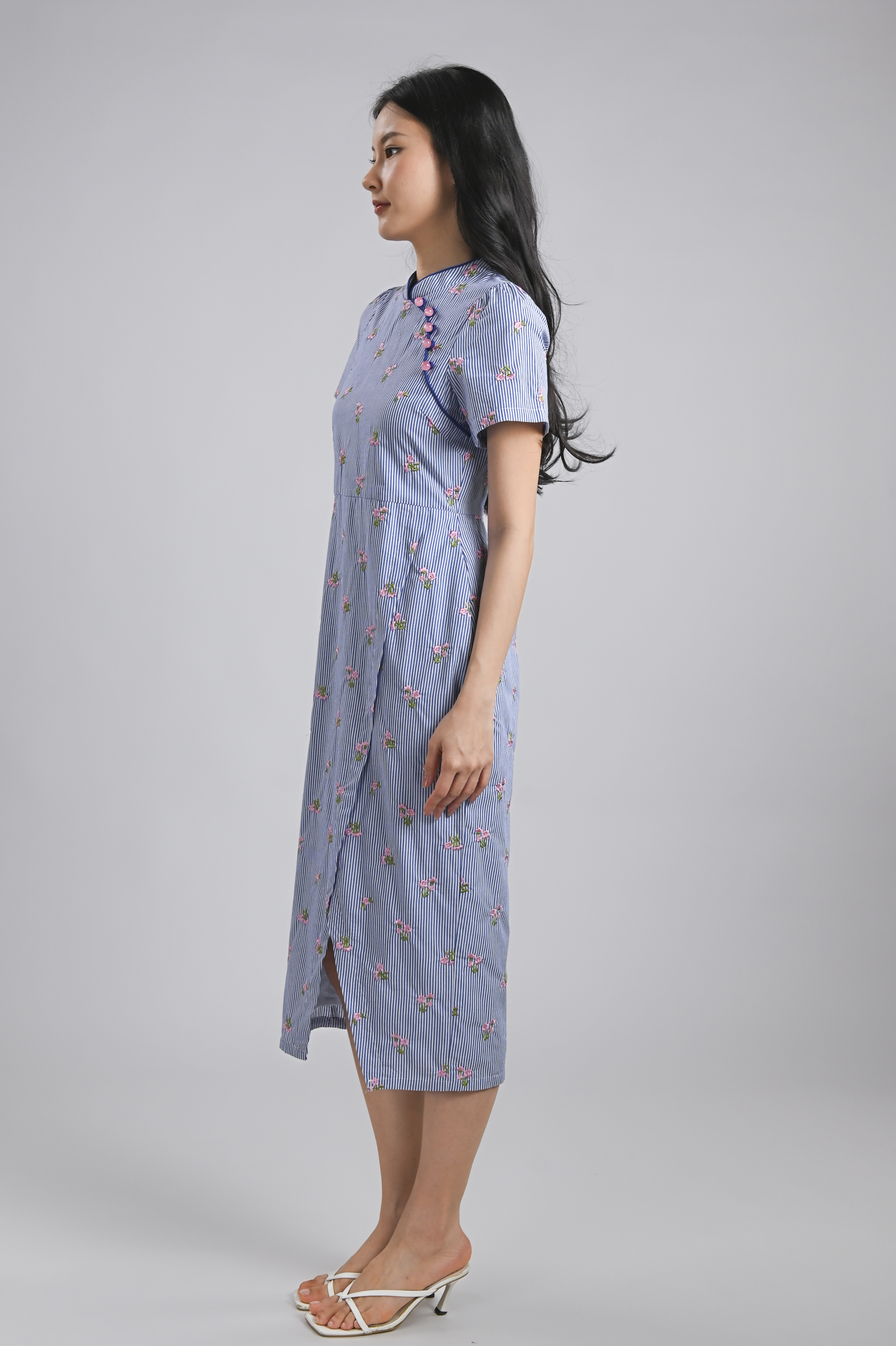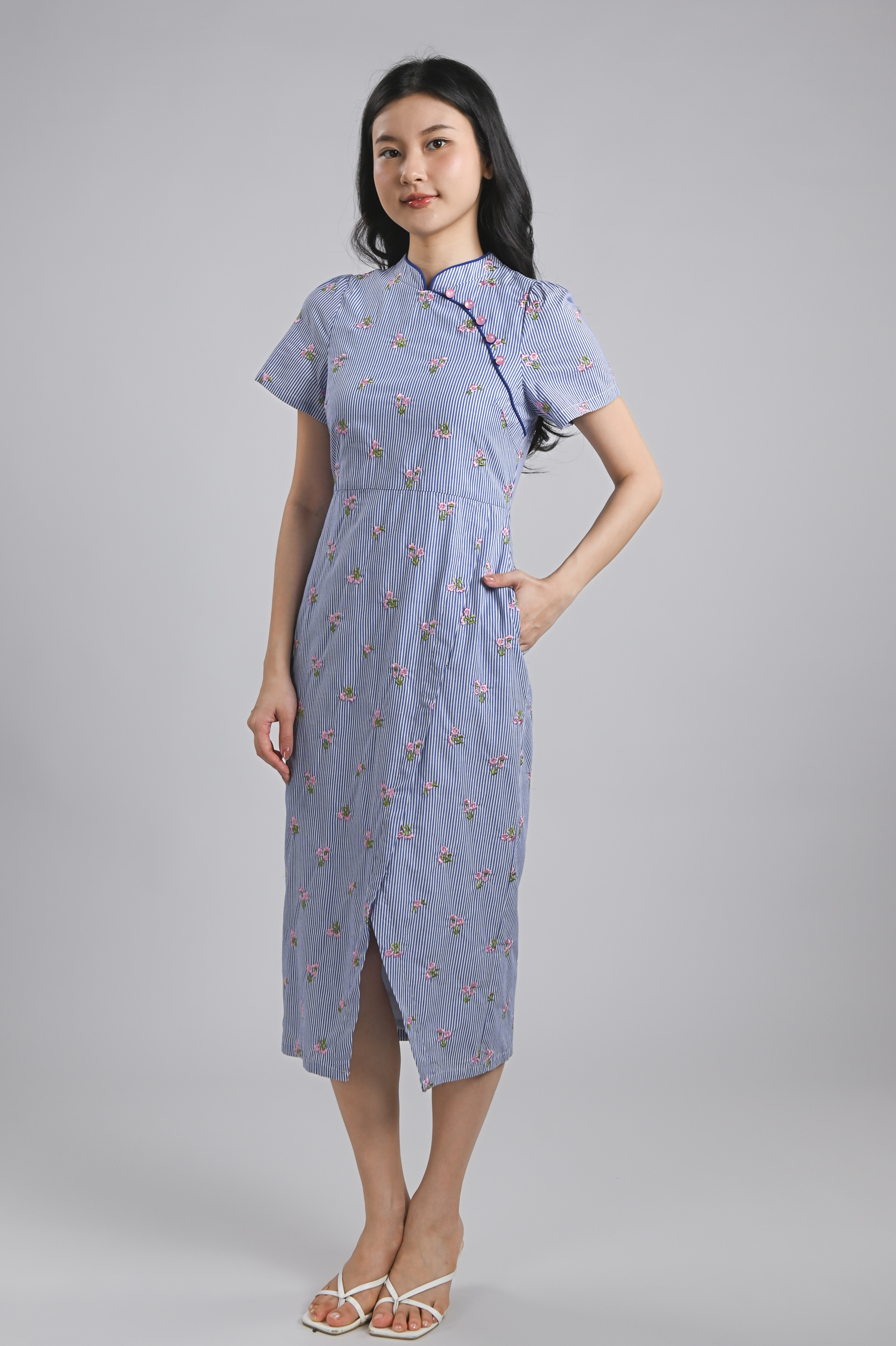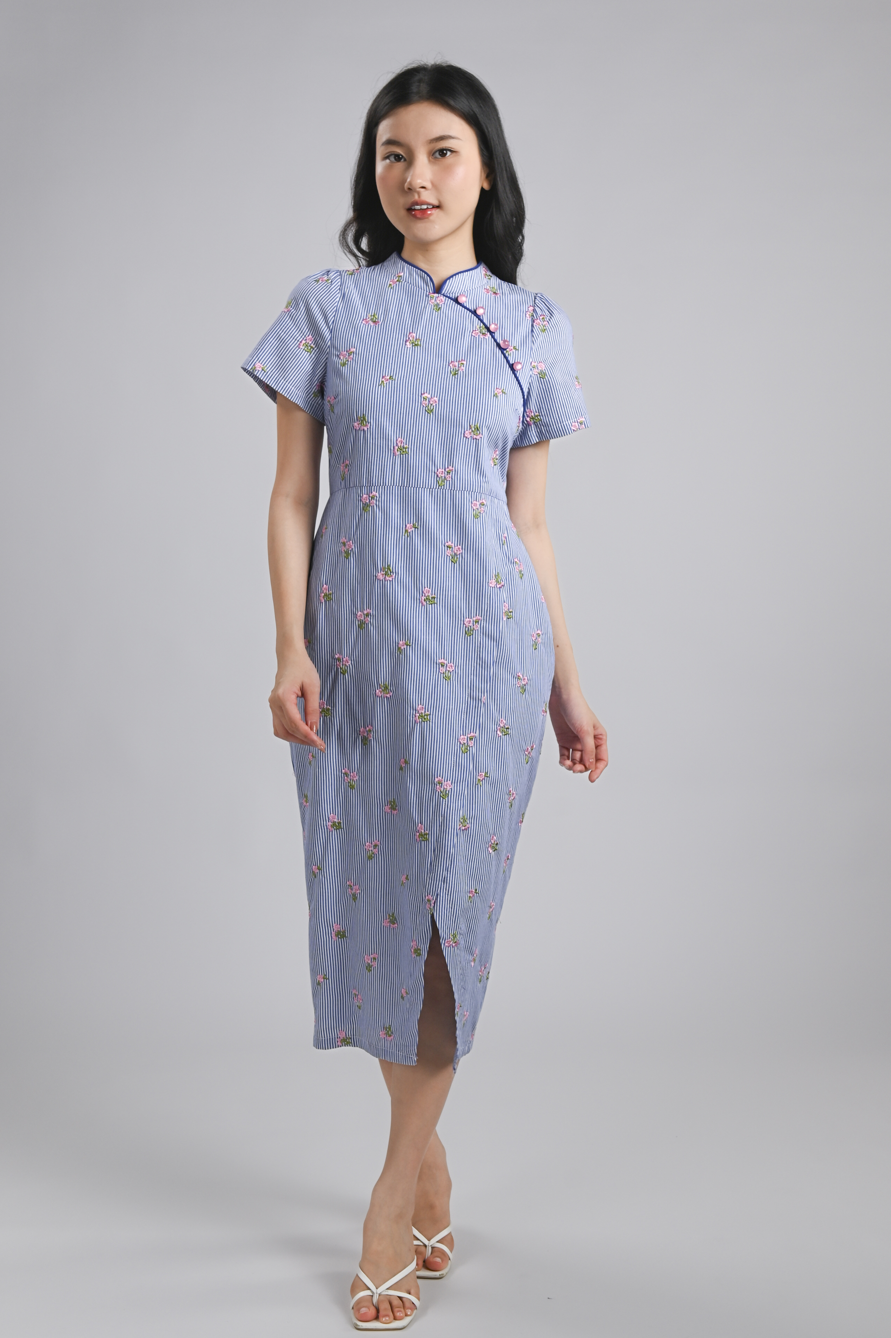 MINXUAN EMB. CHEONGSAM DRESS IN BLUE STRIPES