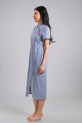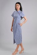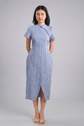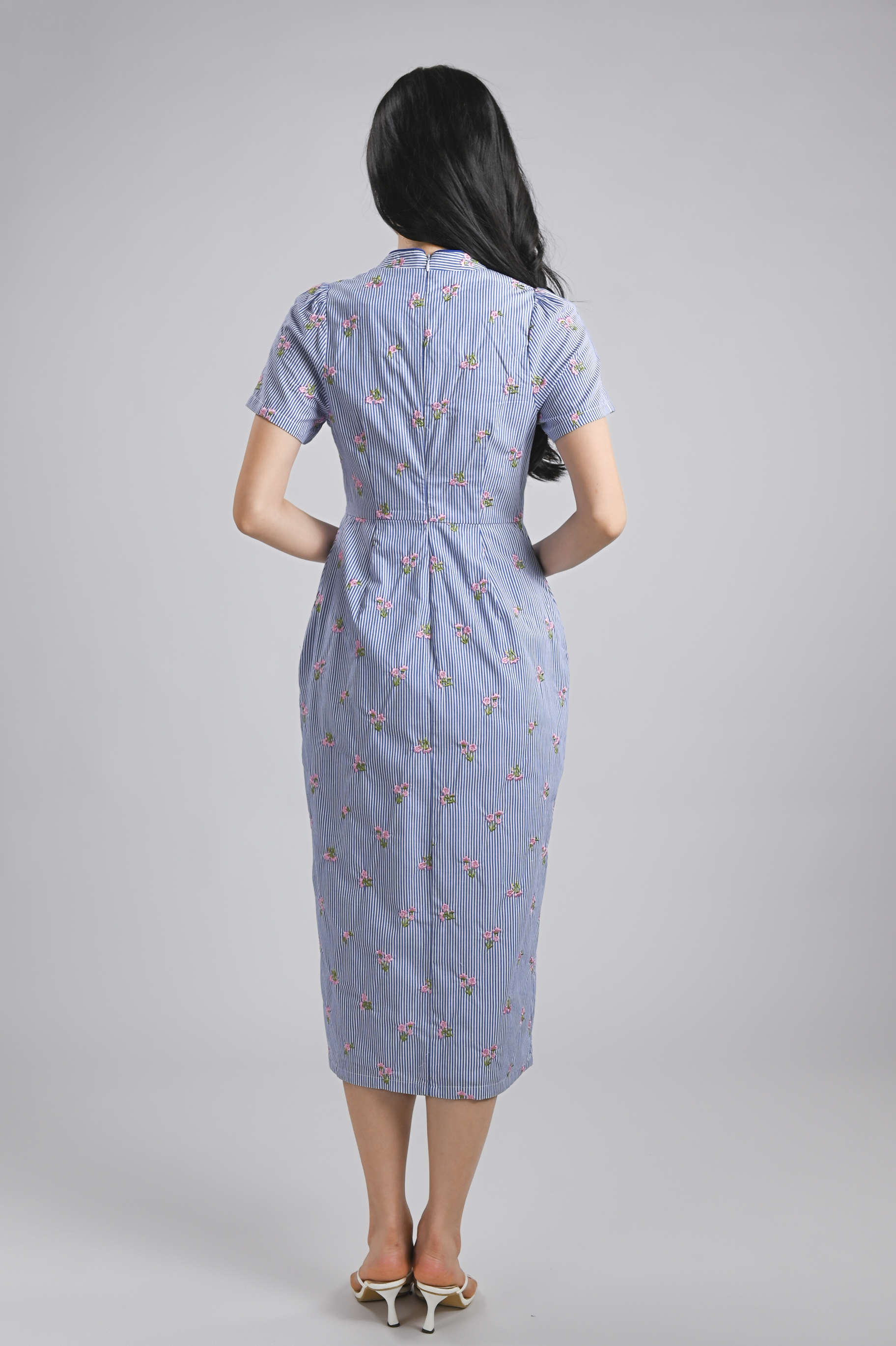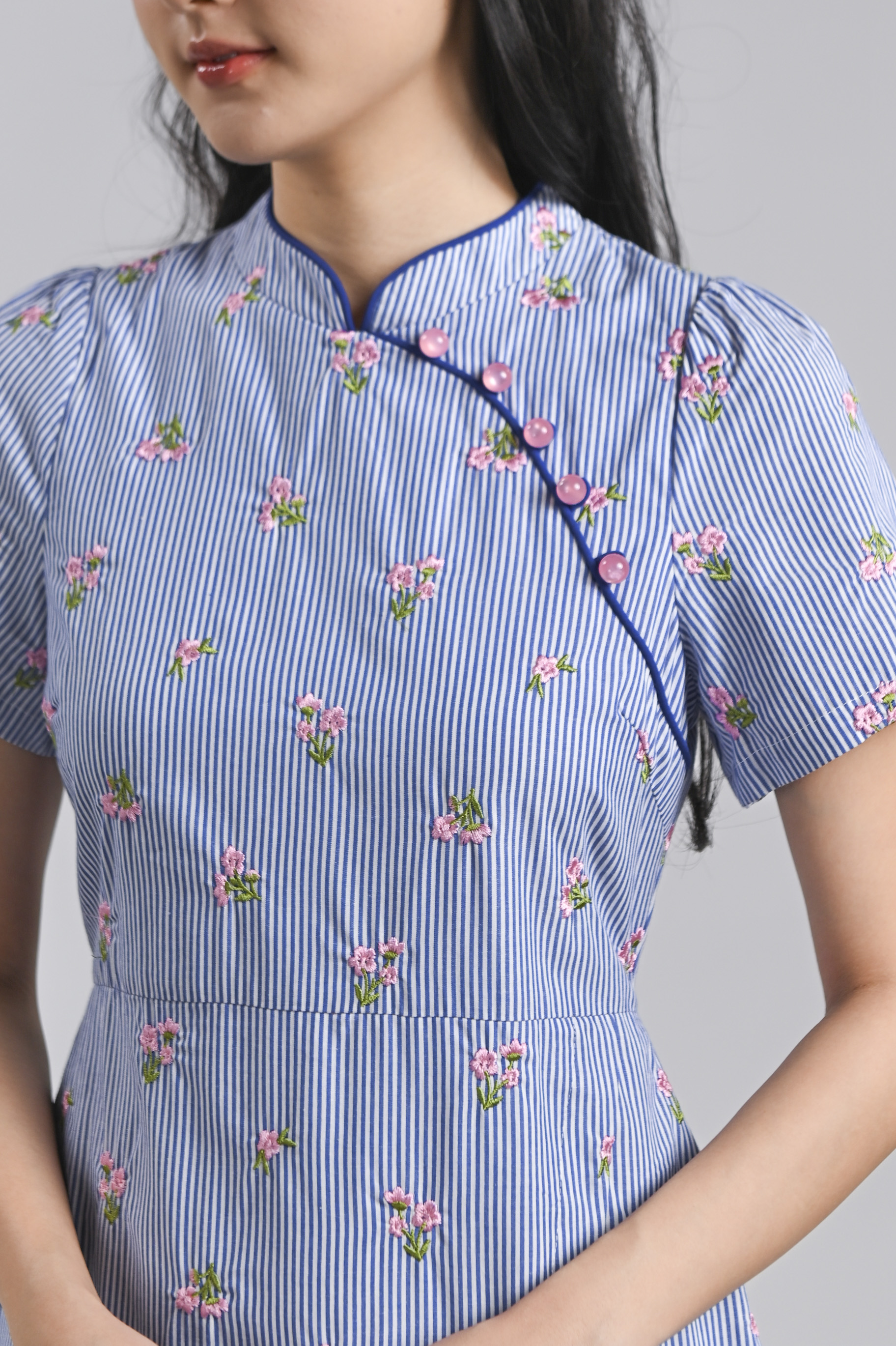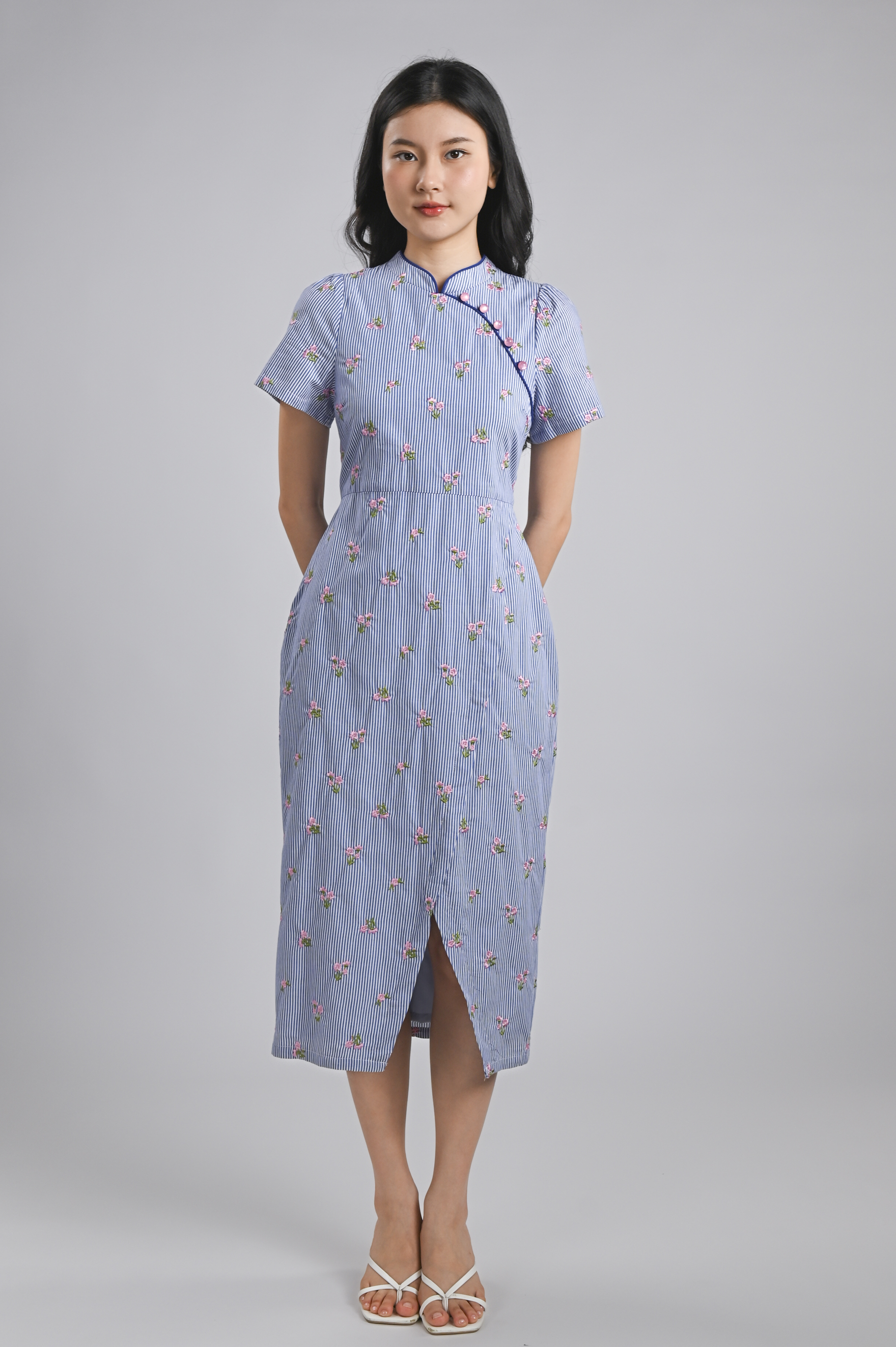 MINXUAN EMB. CHEONGSAM DRESS IN BLUE STRIPES