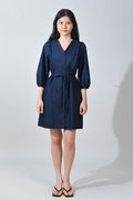 MIO SLEEVED EYELET FRILL BUTTON DRESS IN NAVY