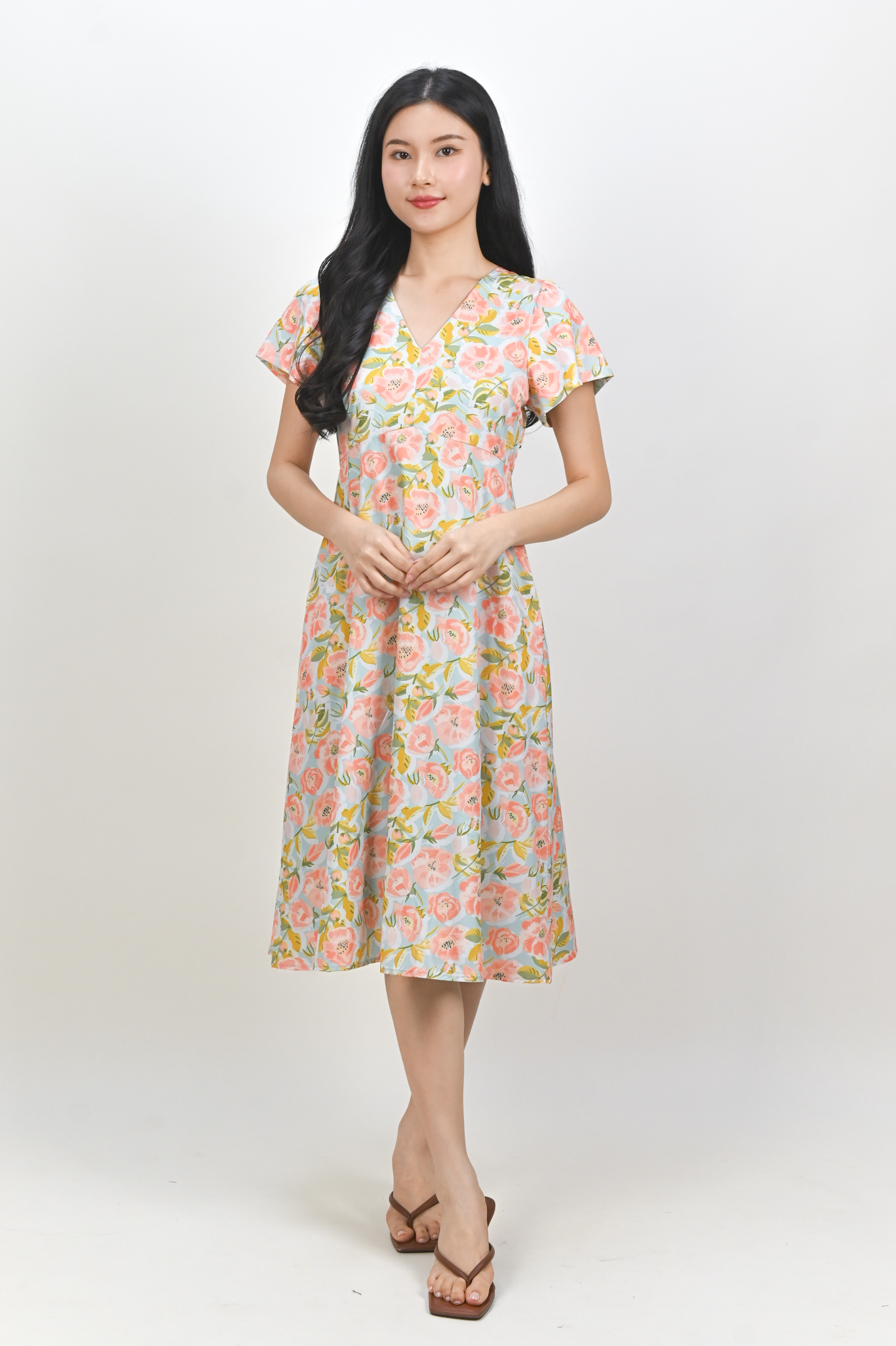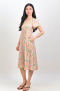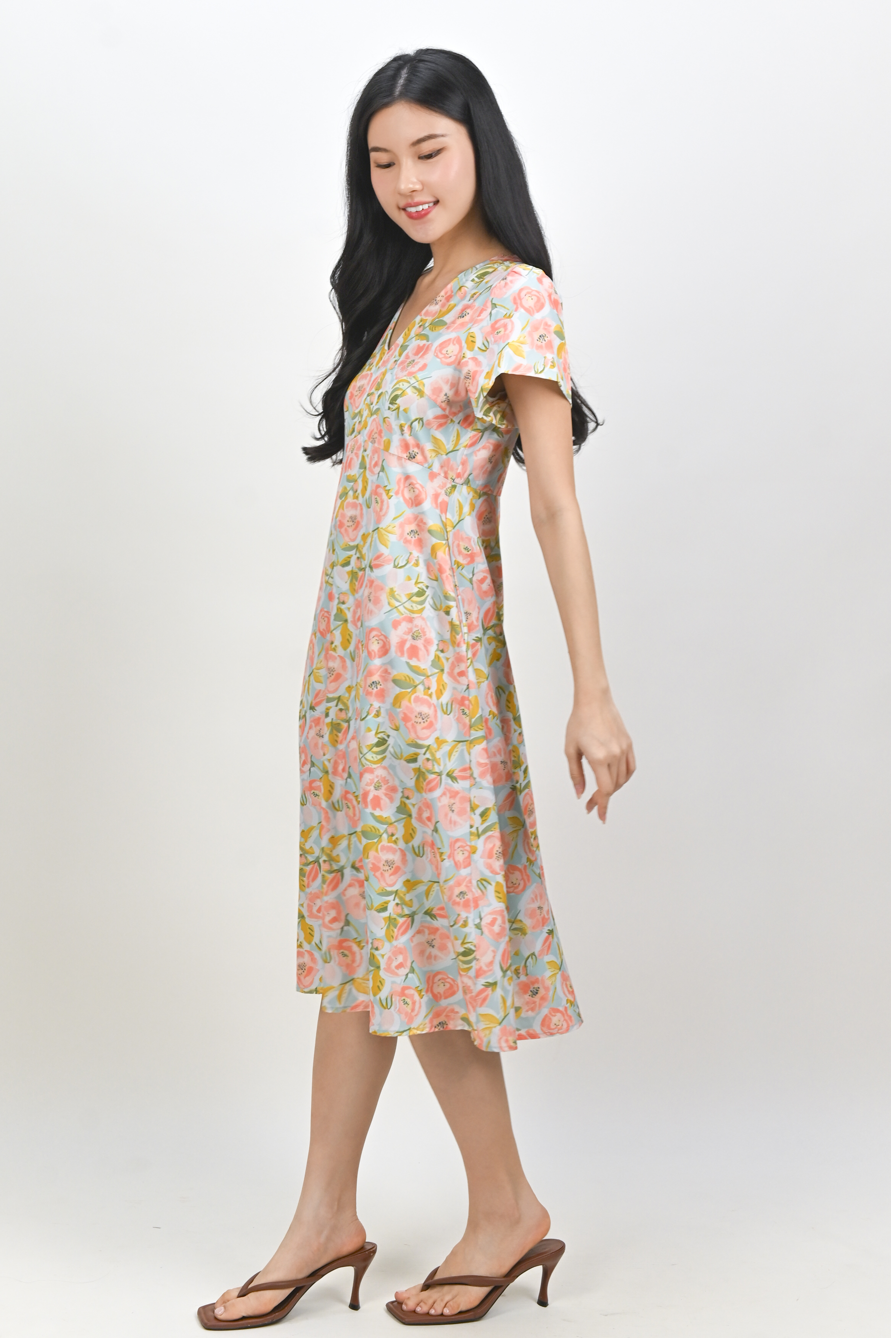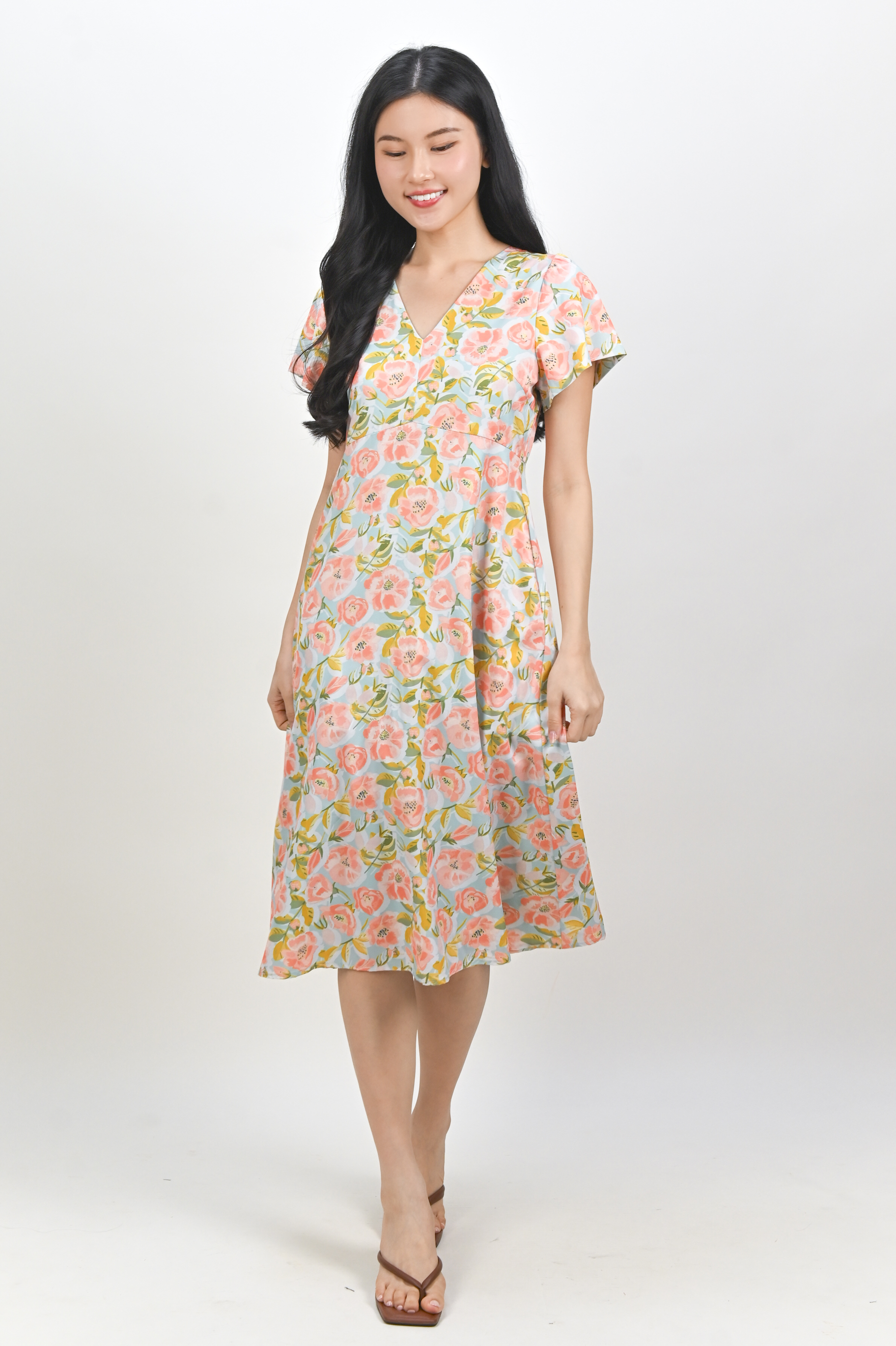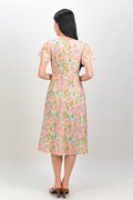 MIRABEL FLORAL V-NECK SLEEVED MIDI DRESS IN MINT