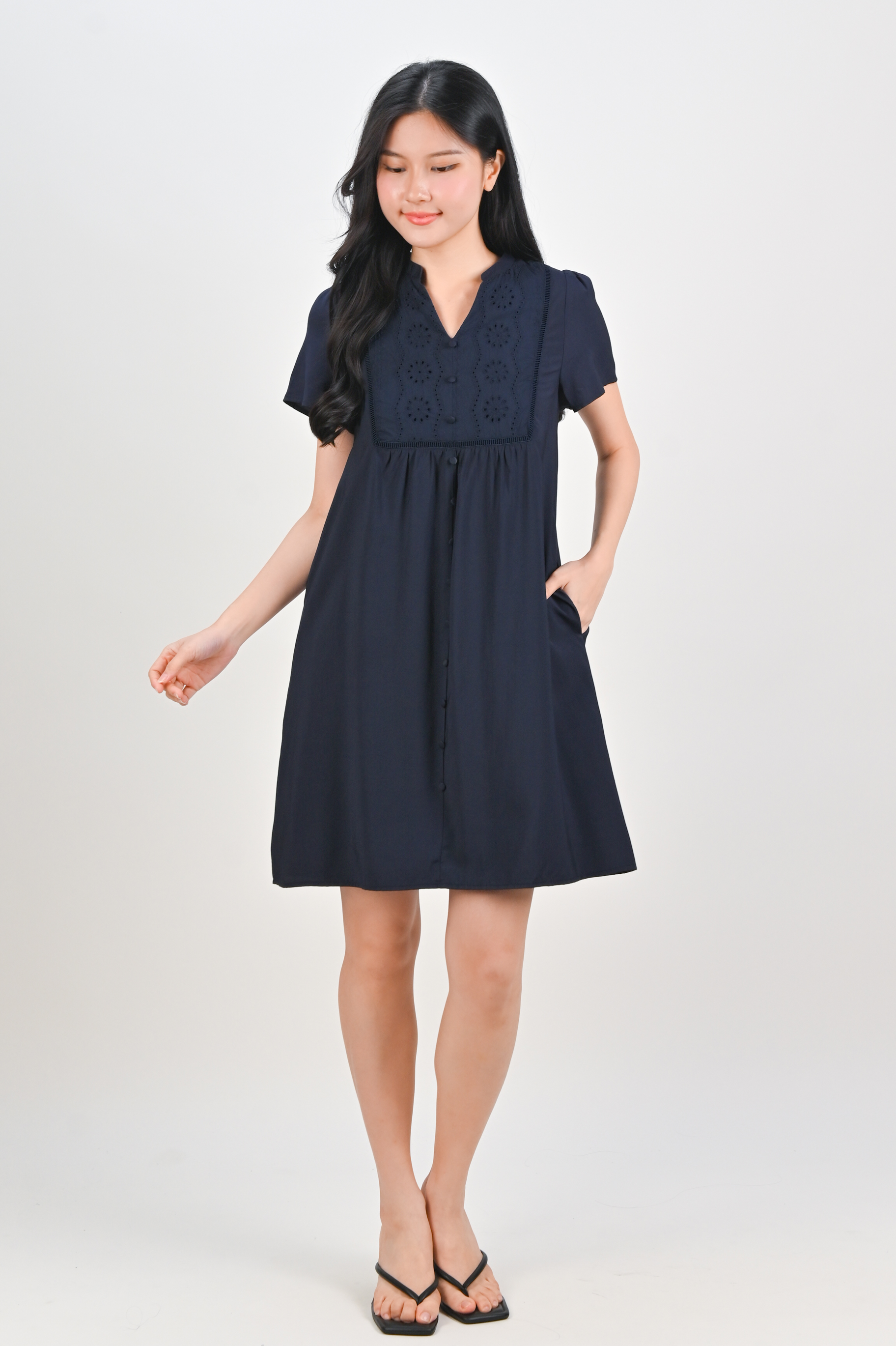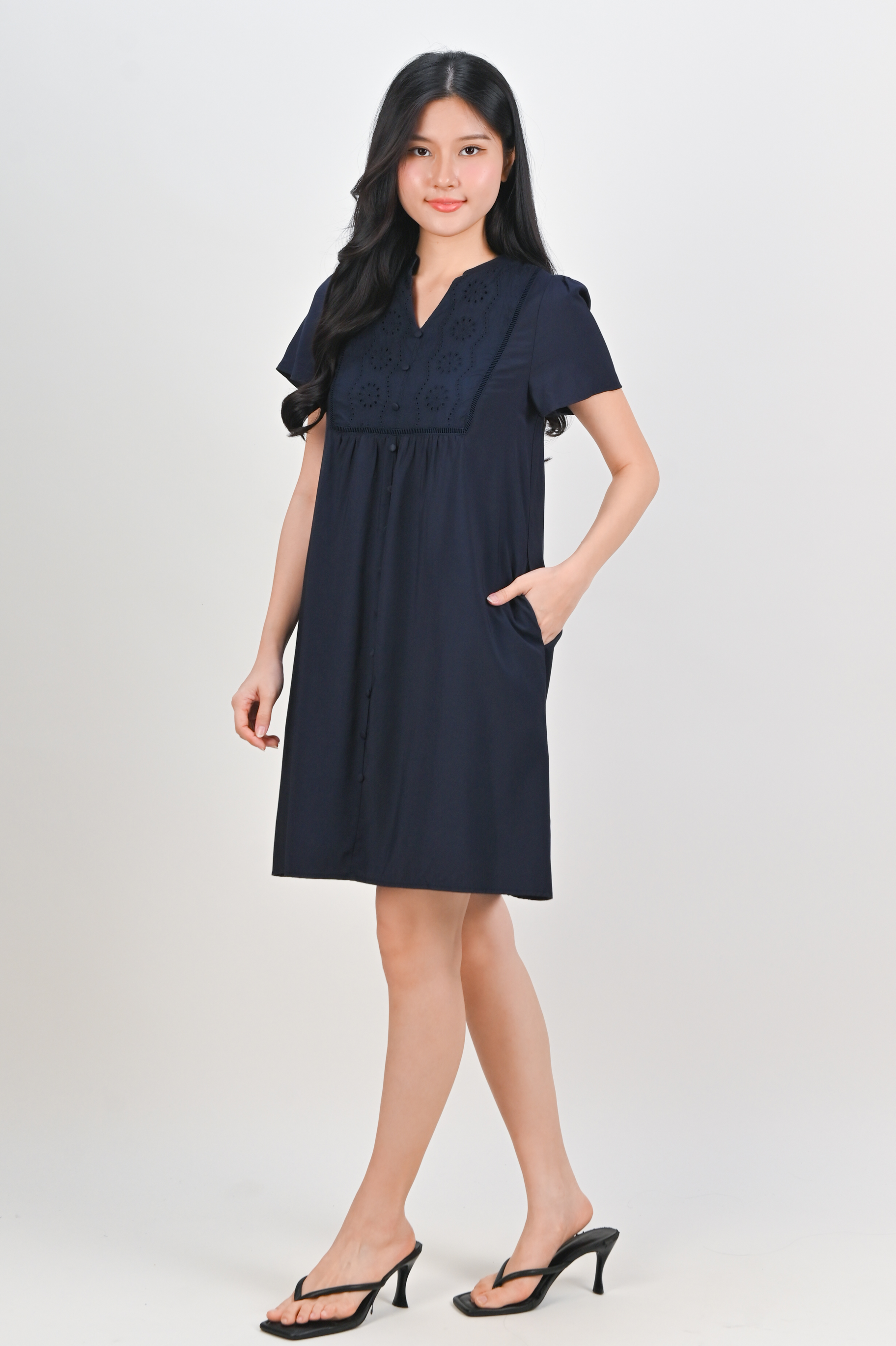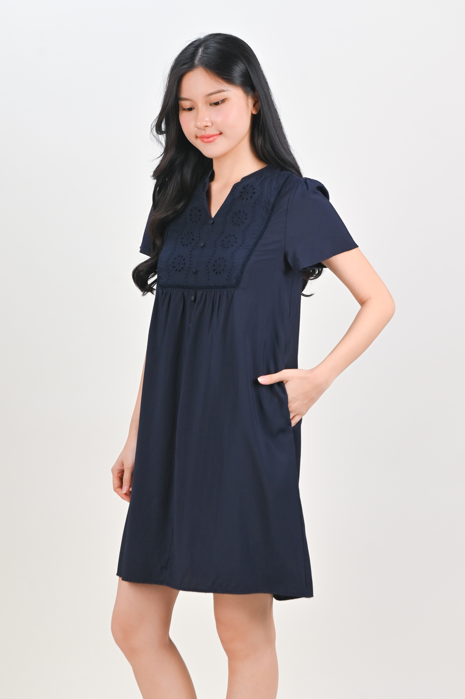 MIREYA EYELET-INSERT SLEEVED DRESS IN NAVY