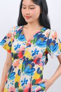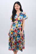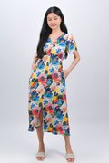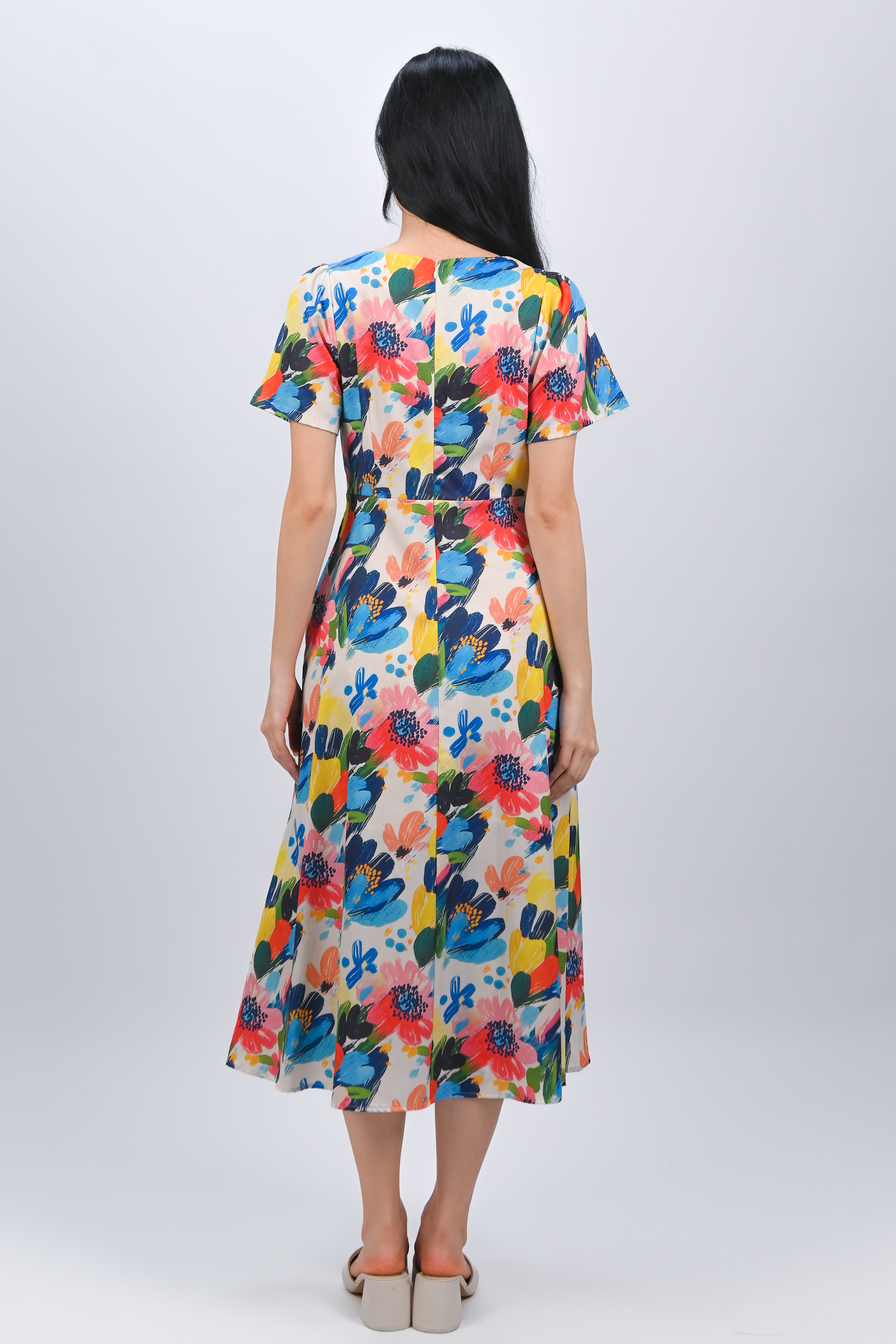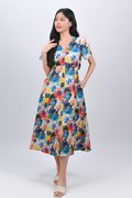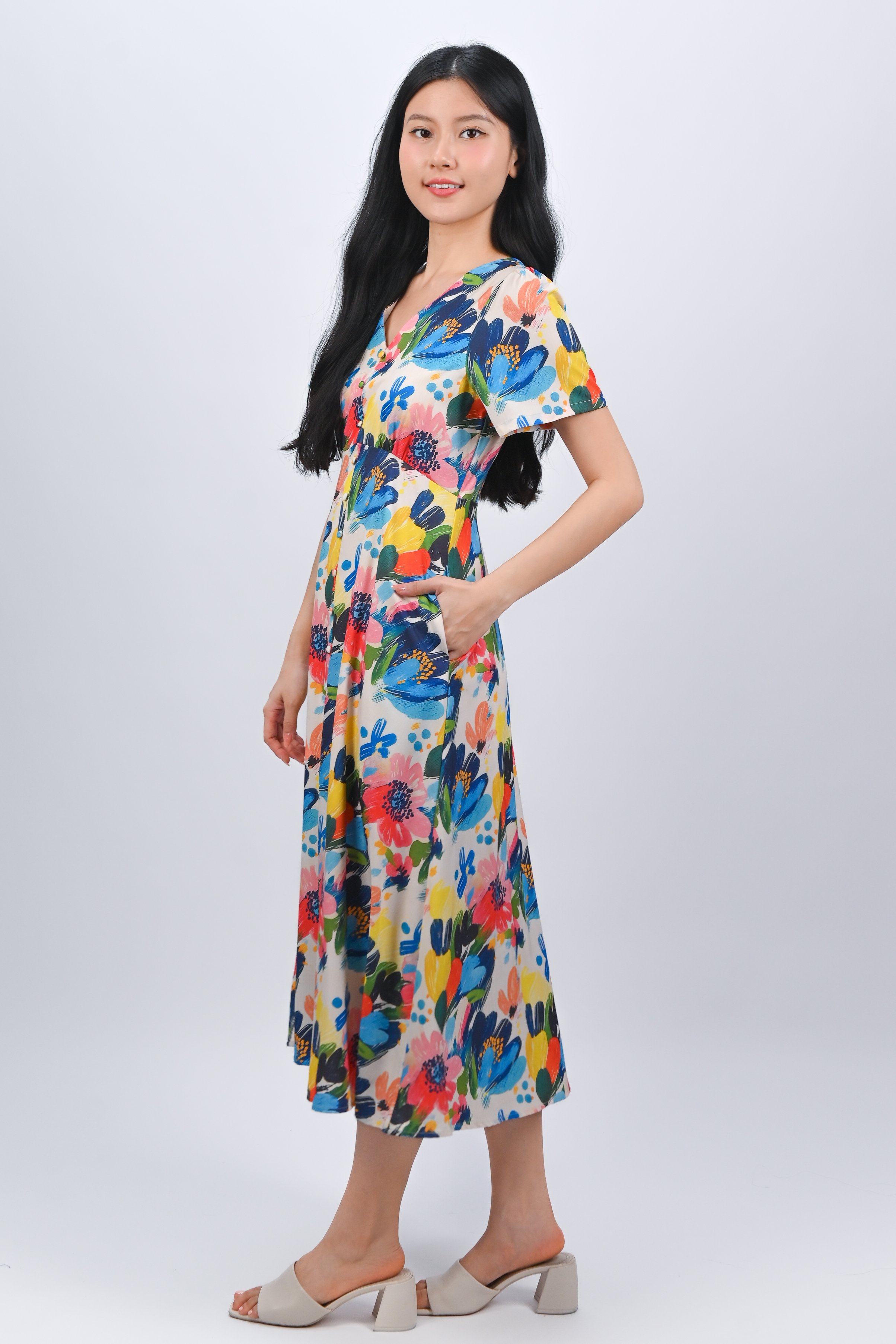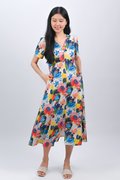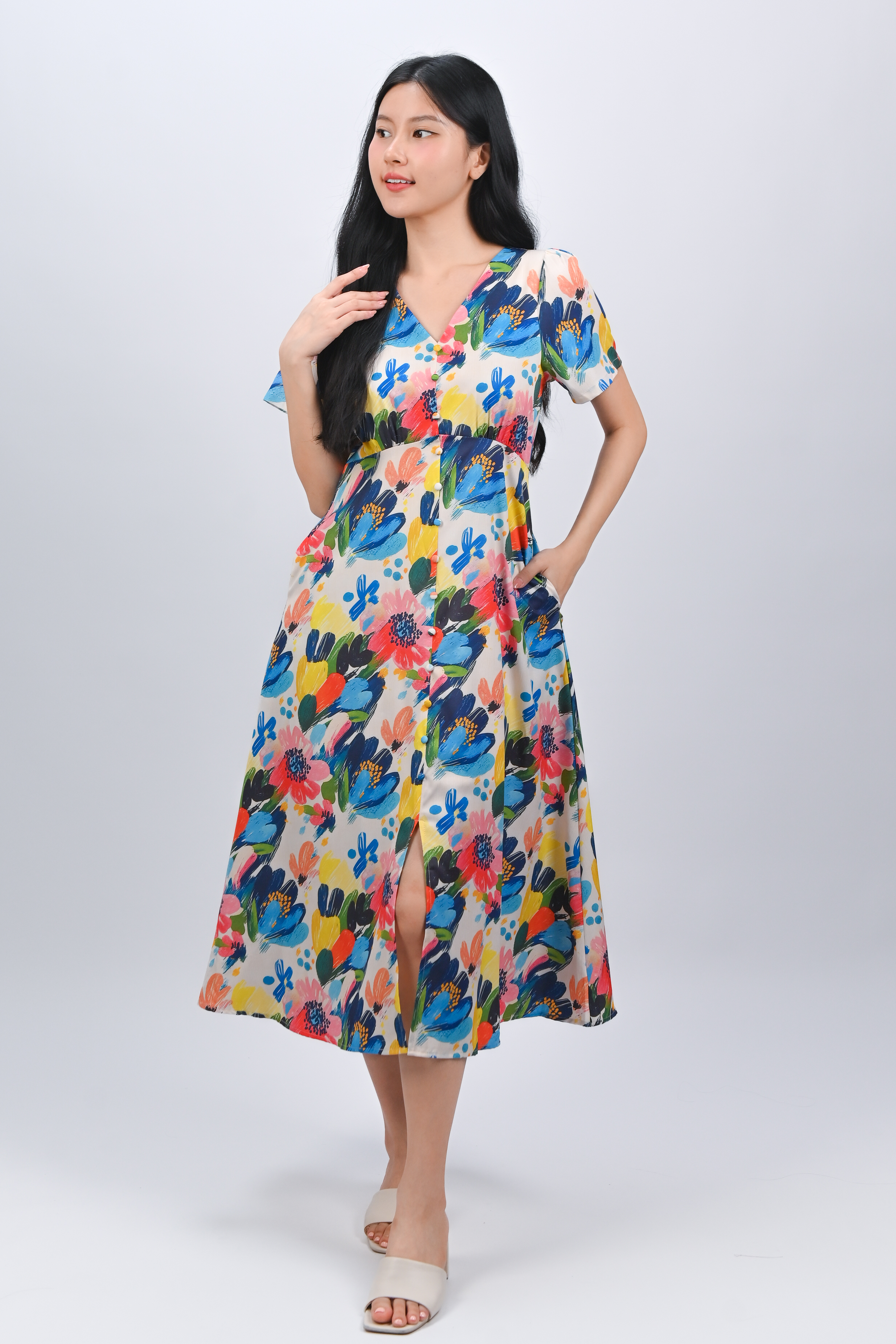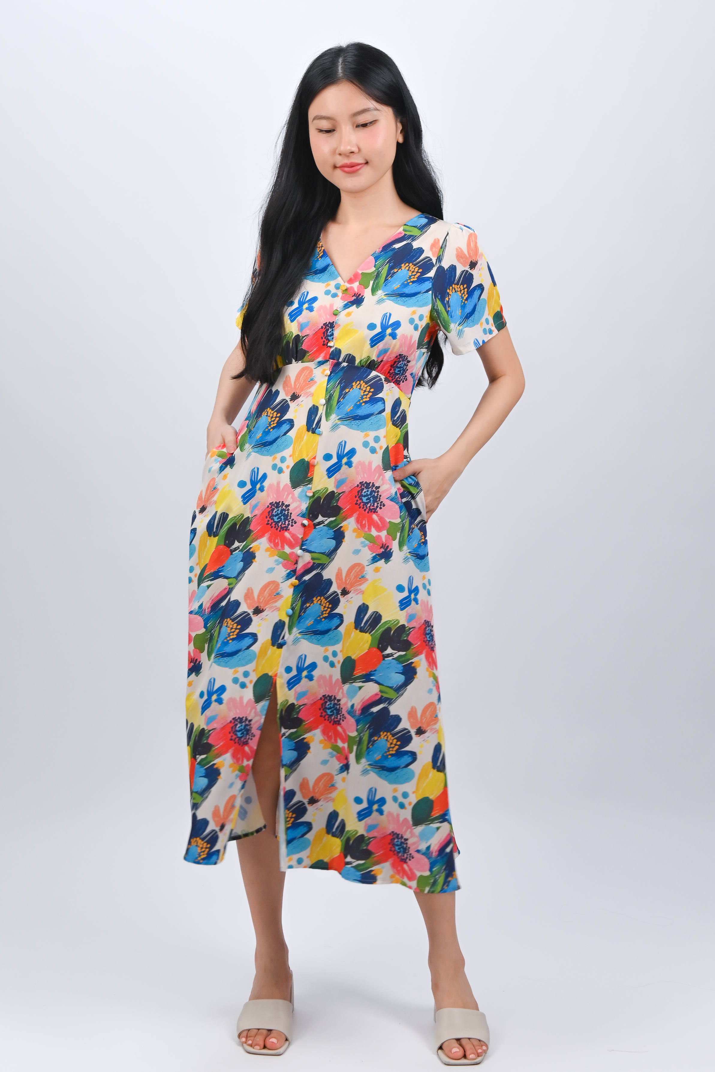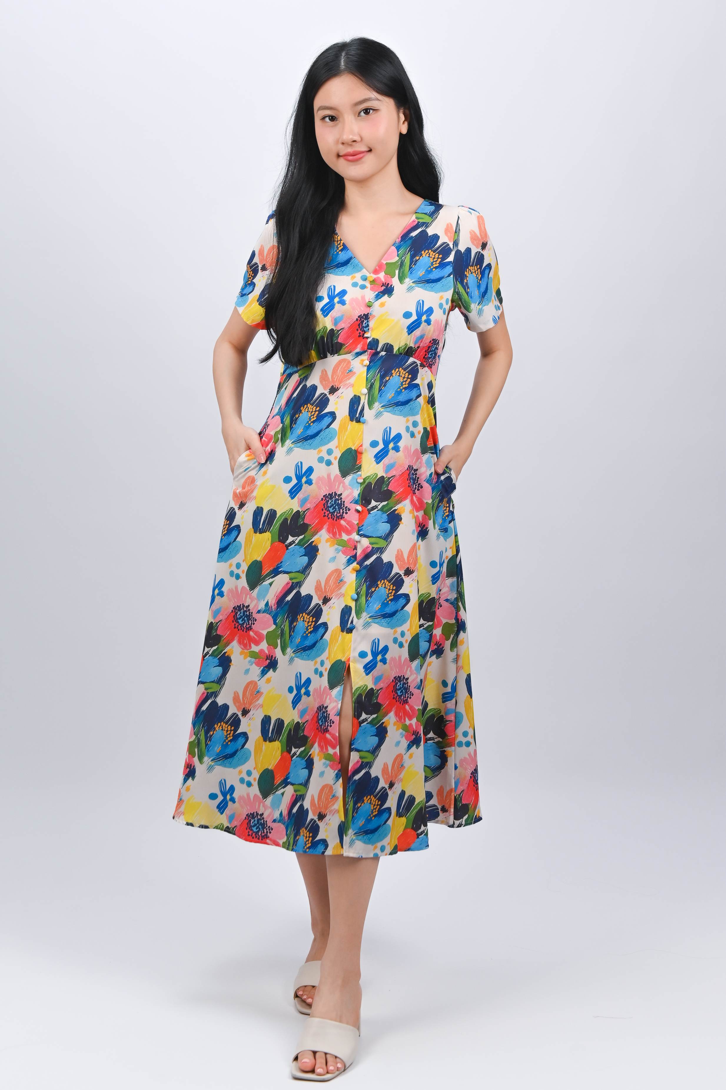 MORWENNA SLEEVED BUTTON MIDI DRESS IN VIBRANT FLORAL