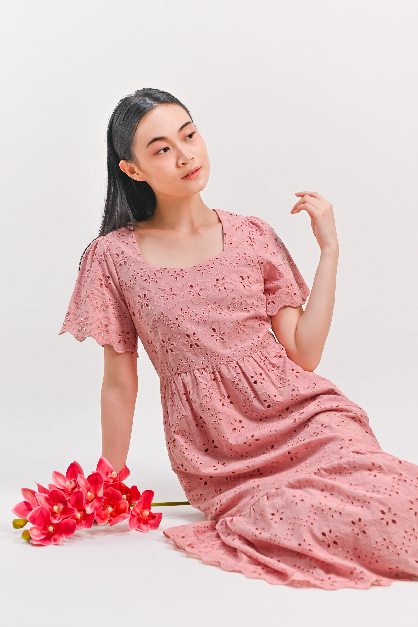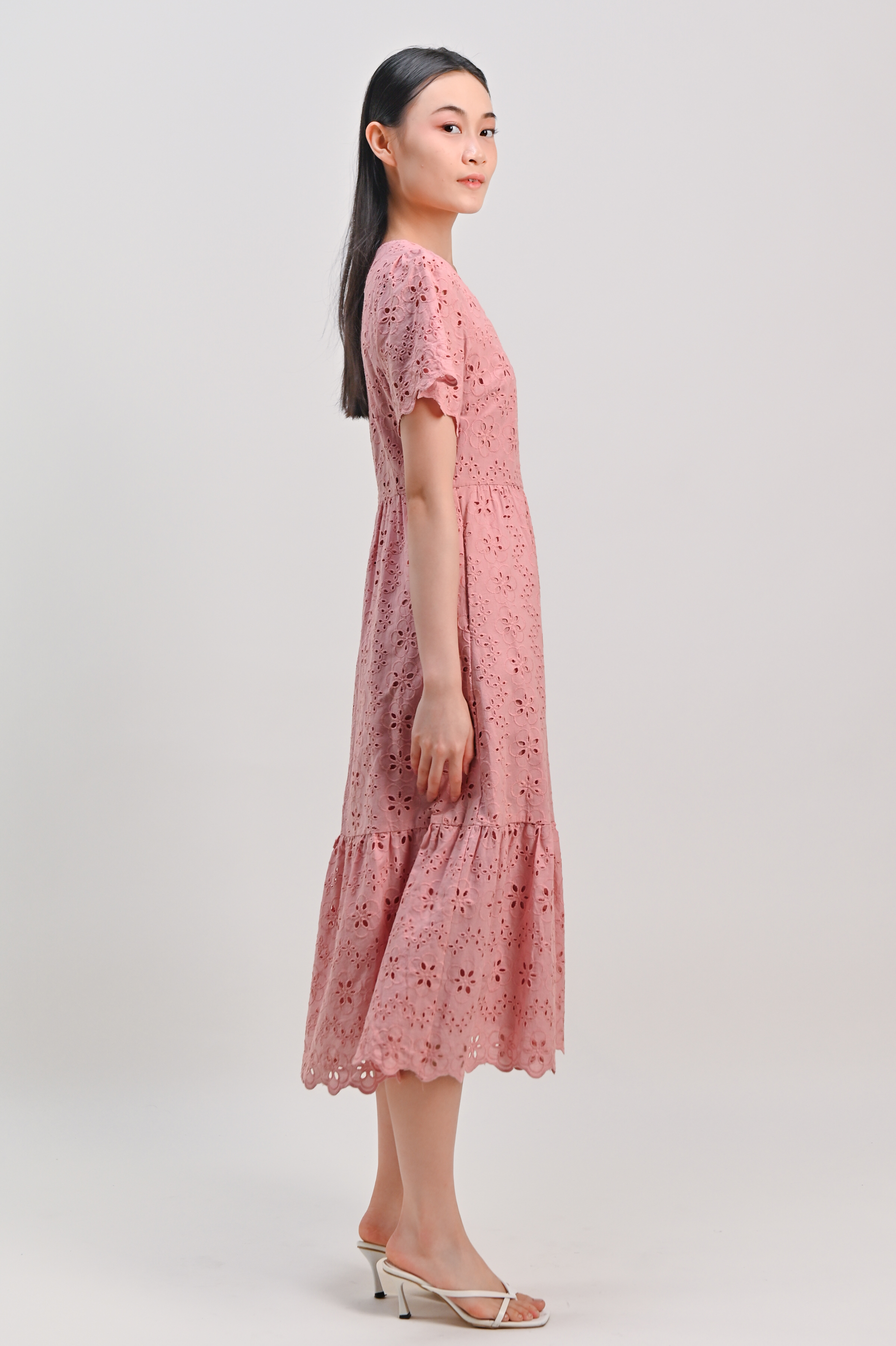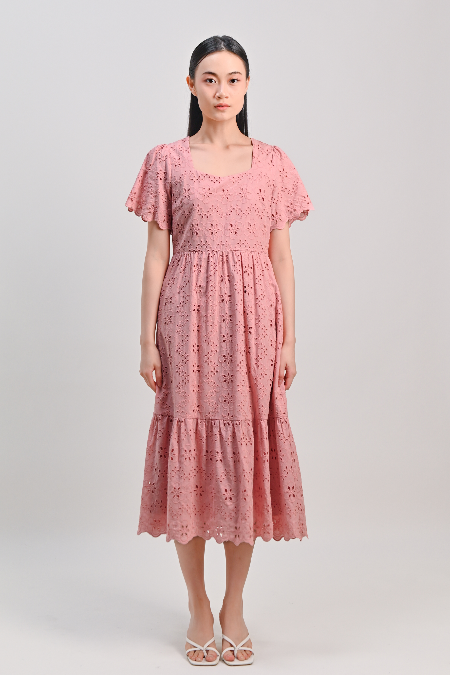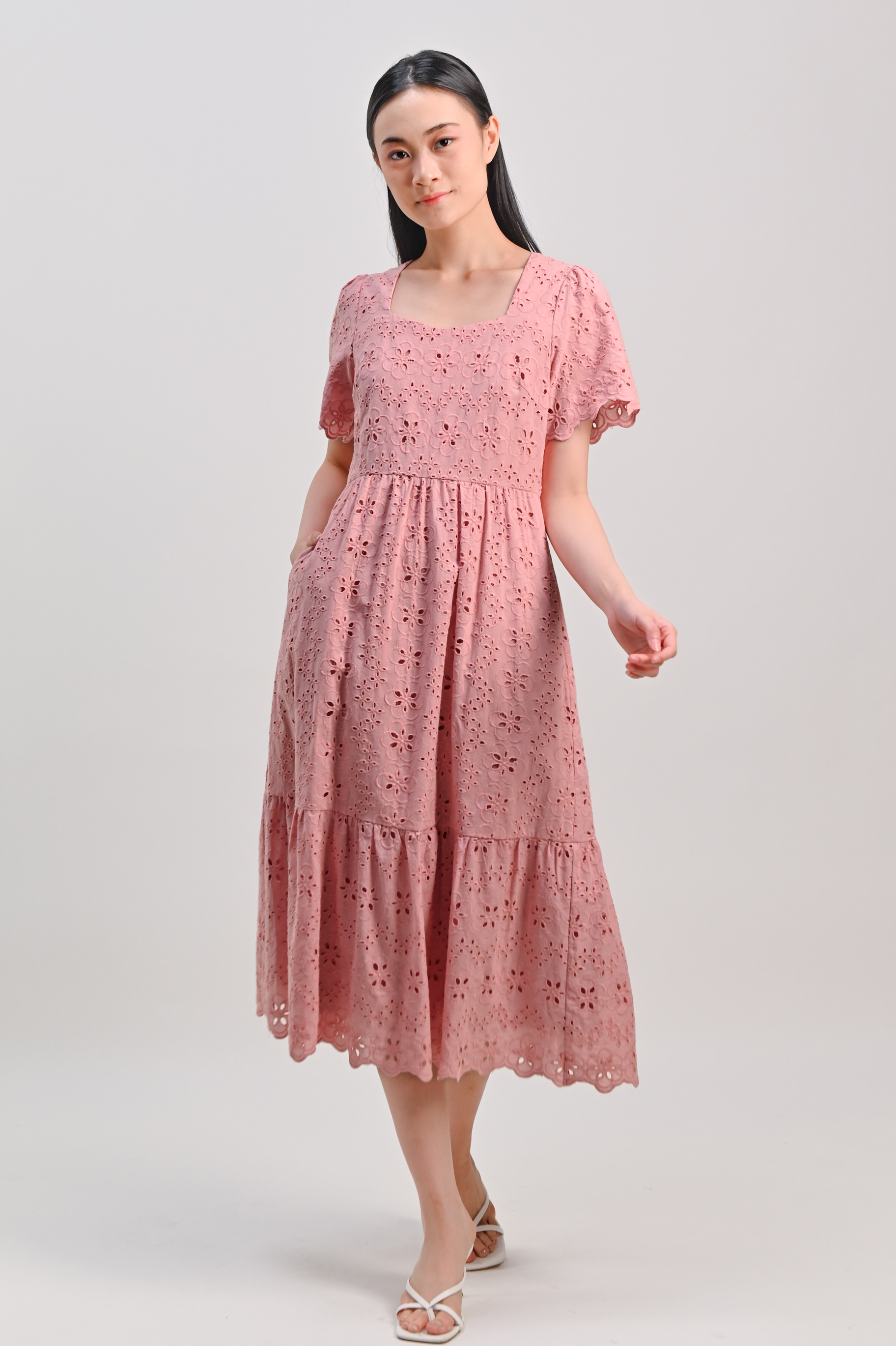NARINA EYELET SLEEVED MIDI DRESS IN PINK