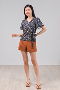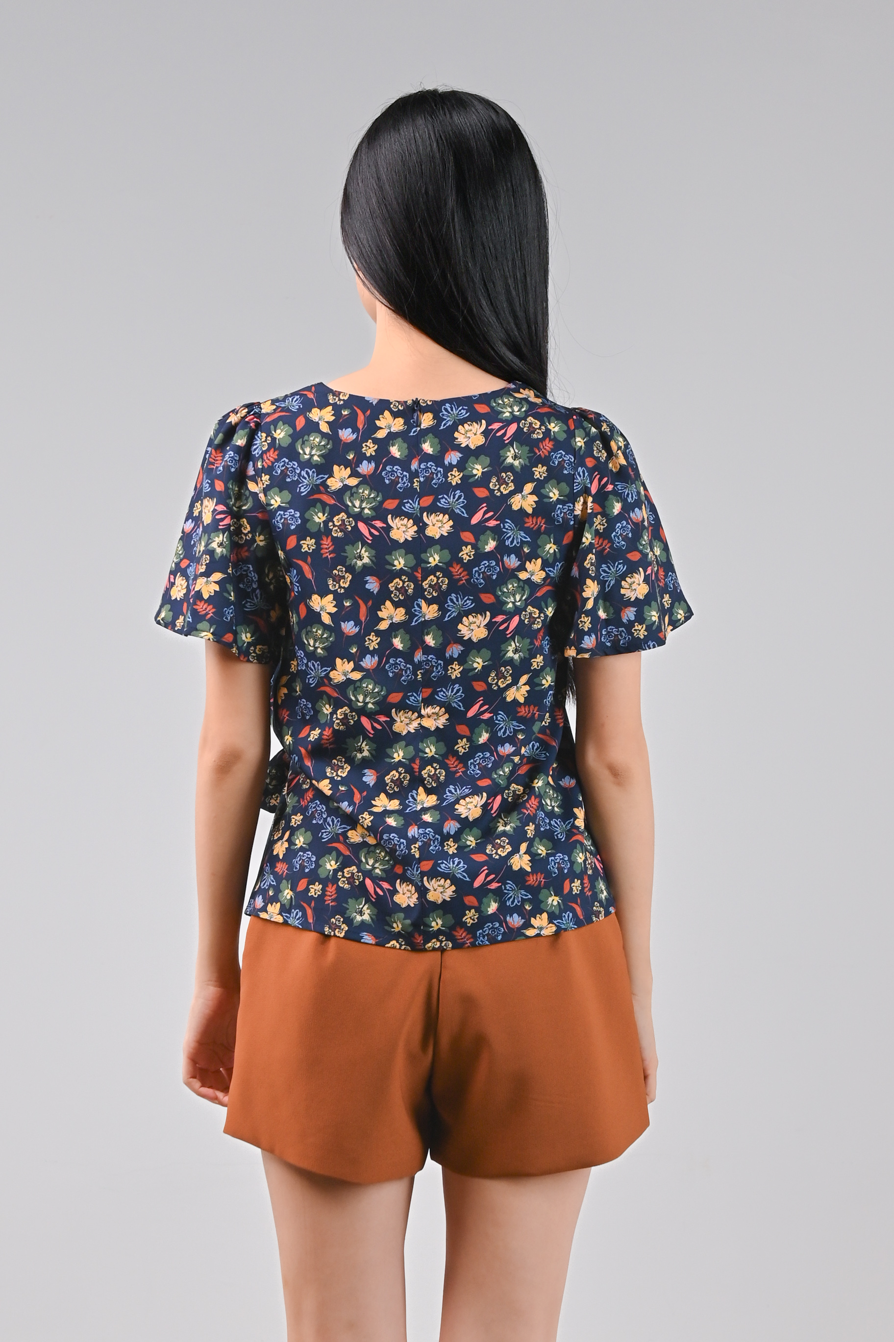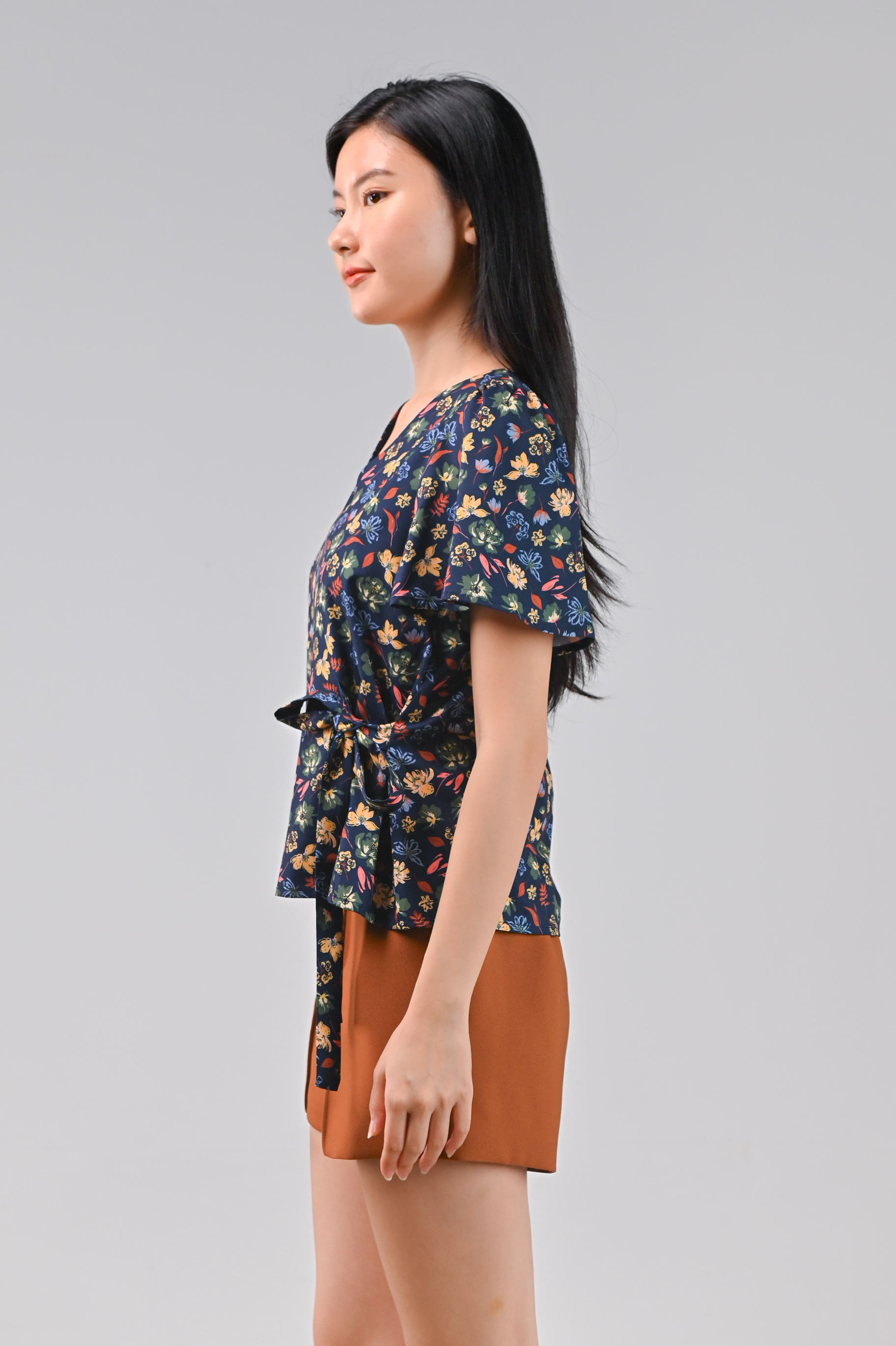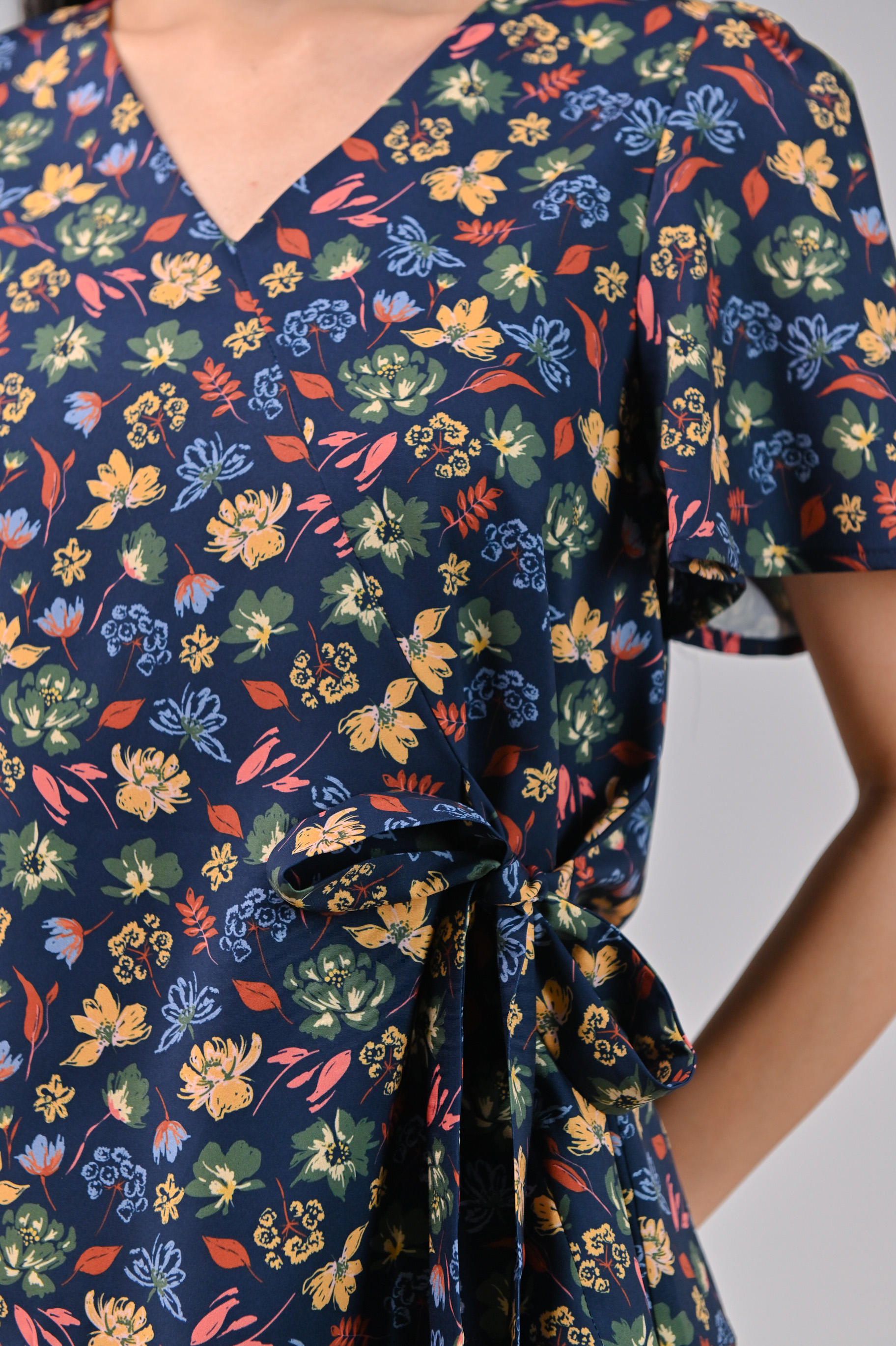 NAVY CRAYON FLORALS SLEEVED TIE-SASH TOP